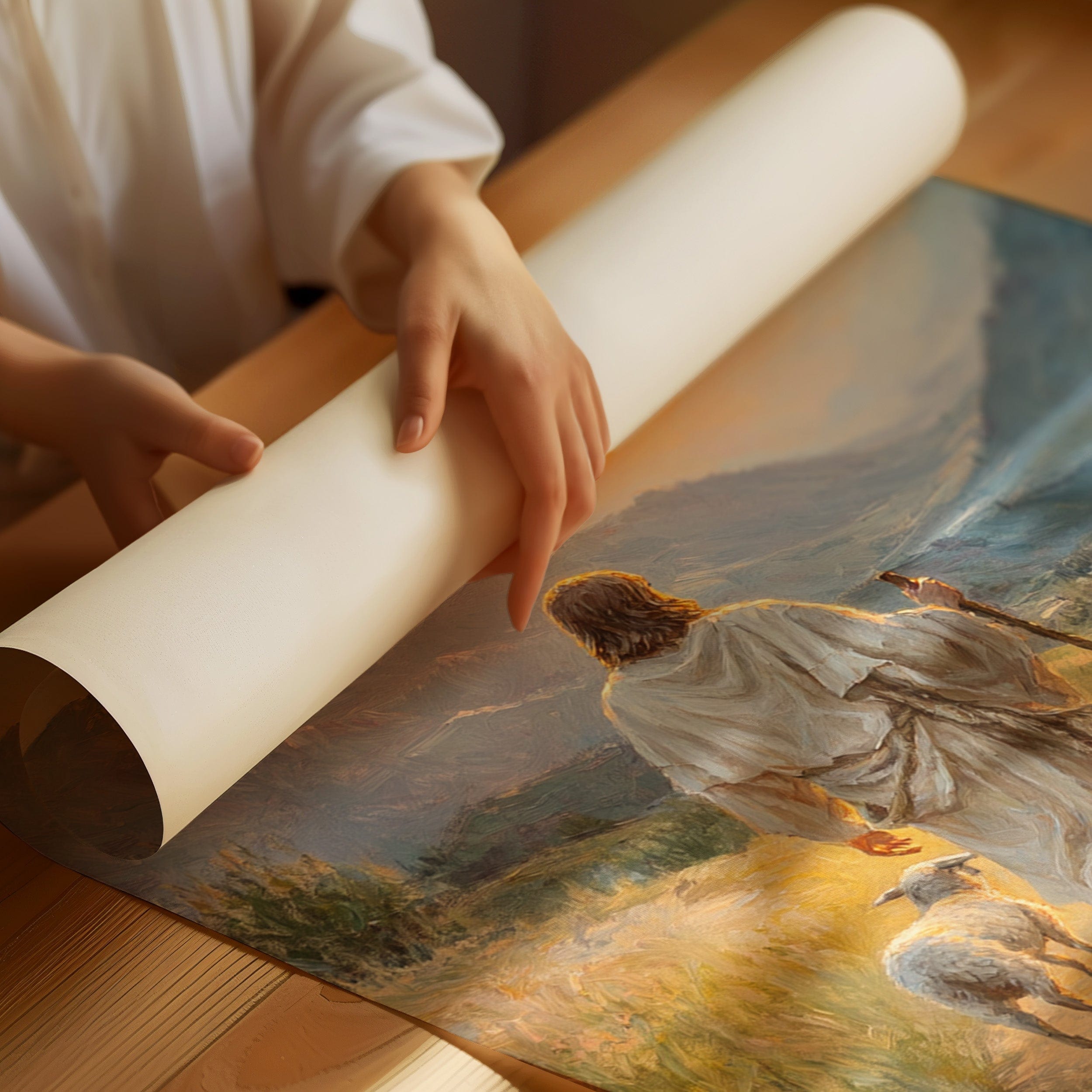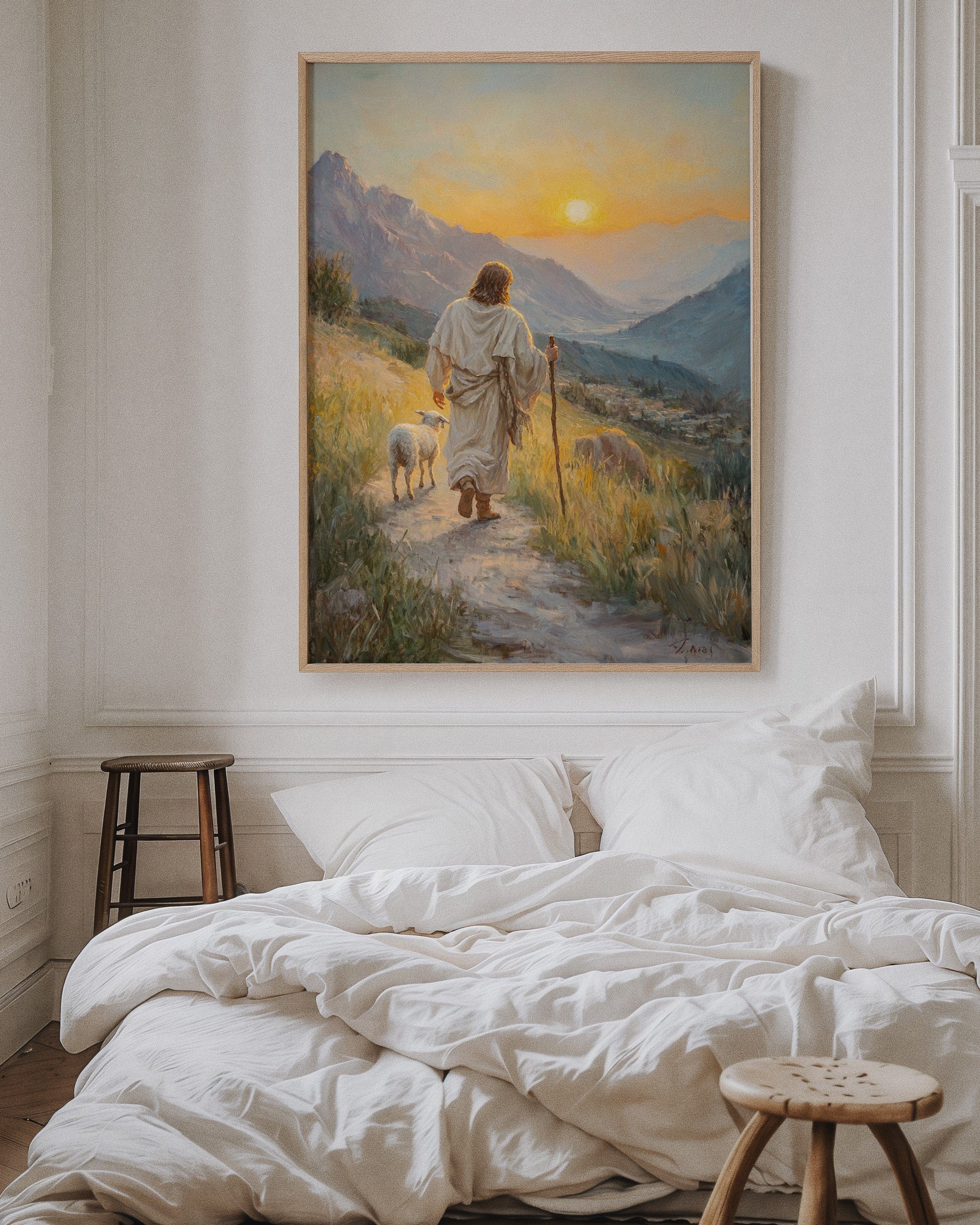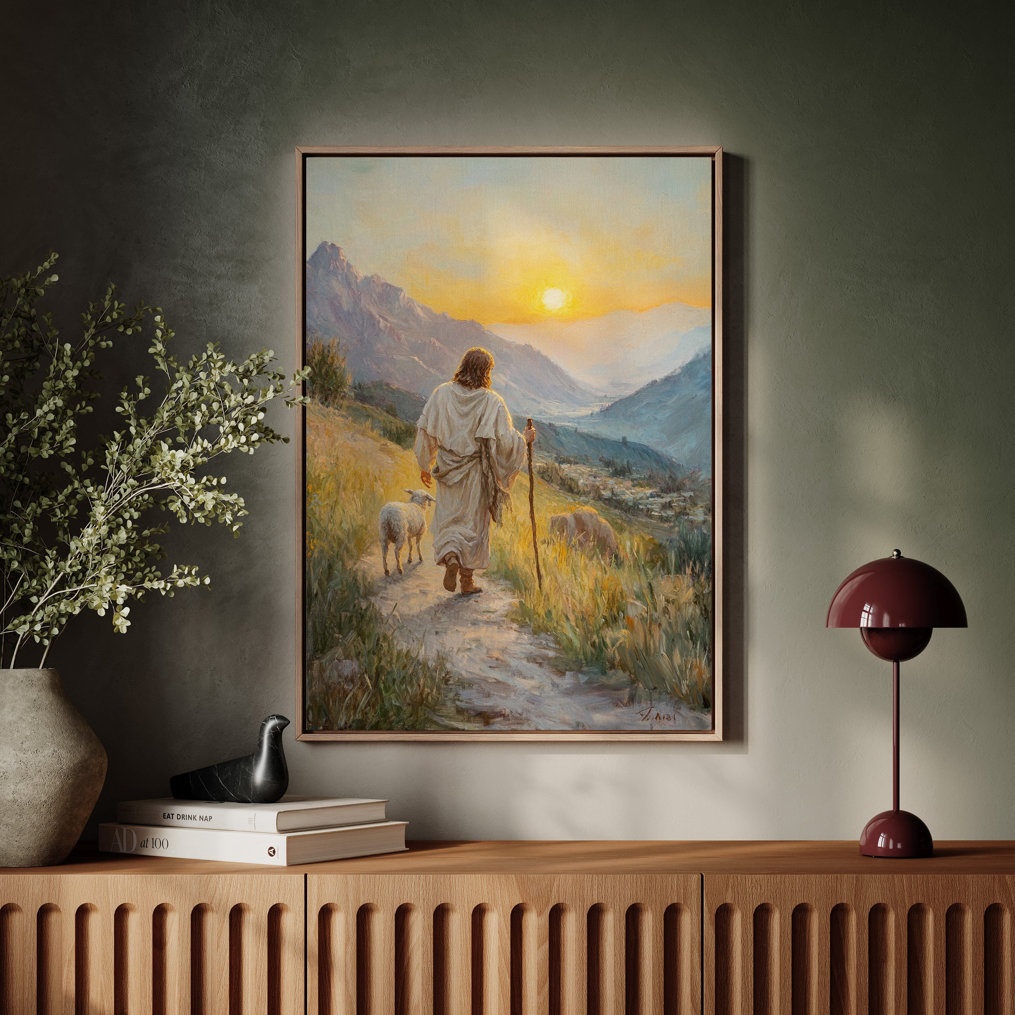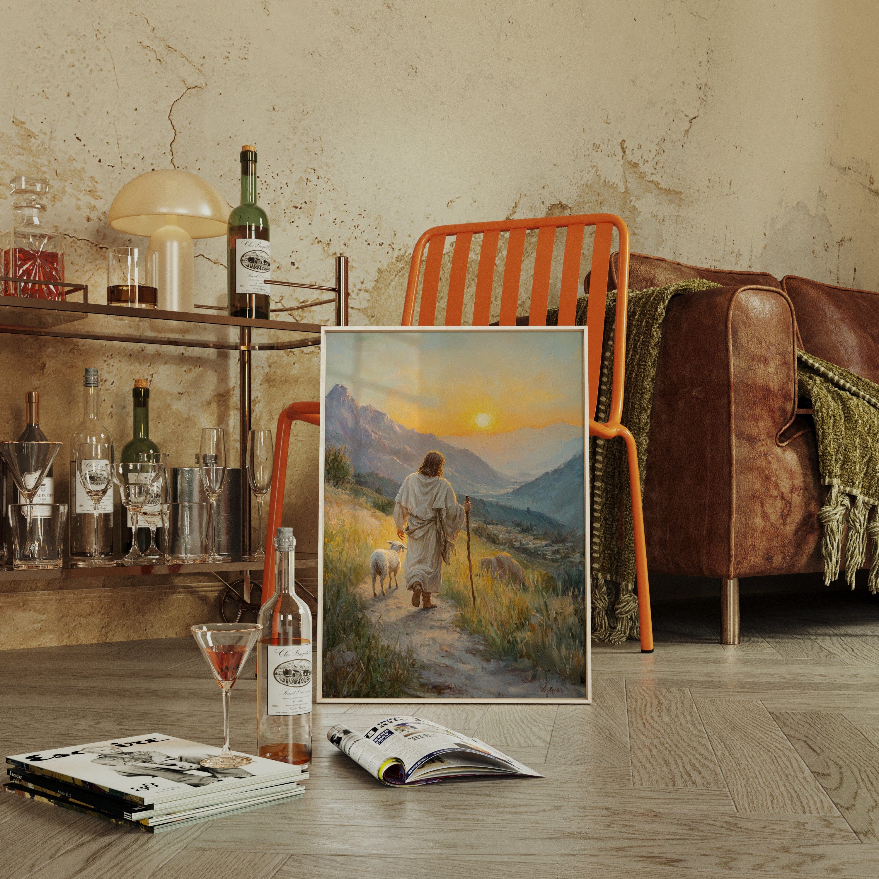 Embrace peace, faith, and divine guidance with this beautifully painted depiction of Jesus as the Good Shepherd. Set against a breathtaking mountain sunset, this artwork symbolizes love, protection, and spiritual grace, making it a perfect addition to any prayer room, church, or home decor.