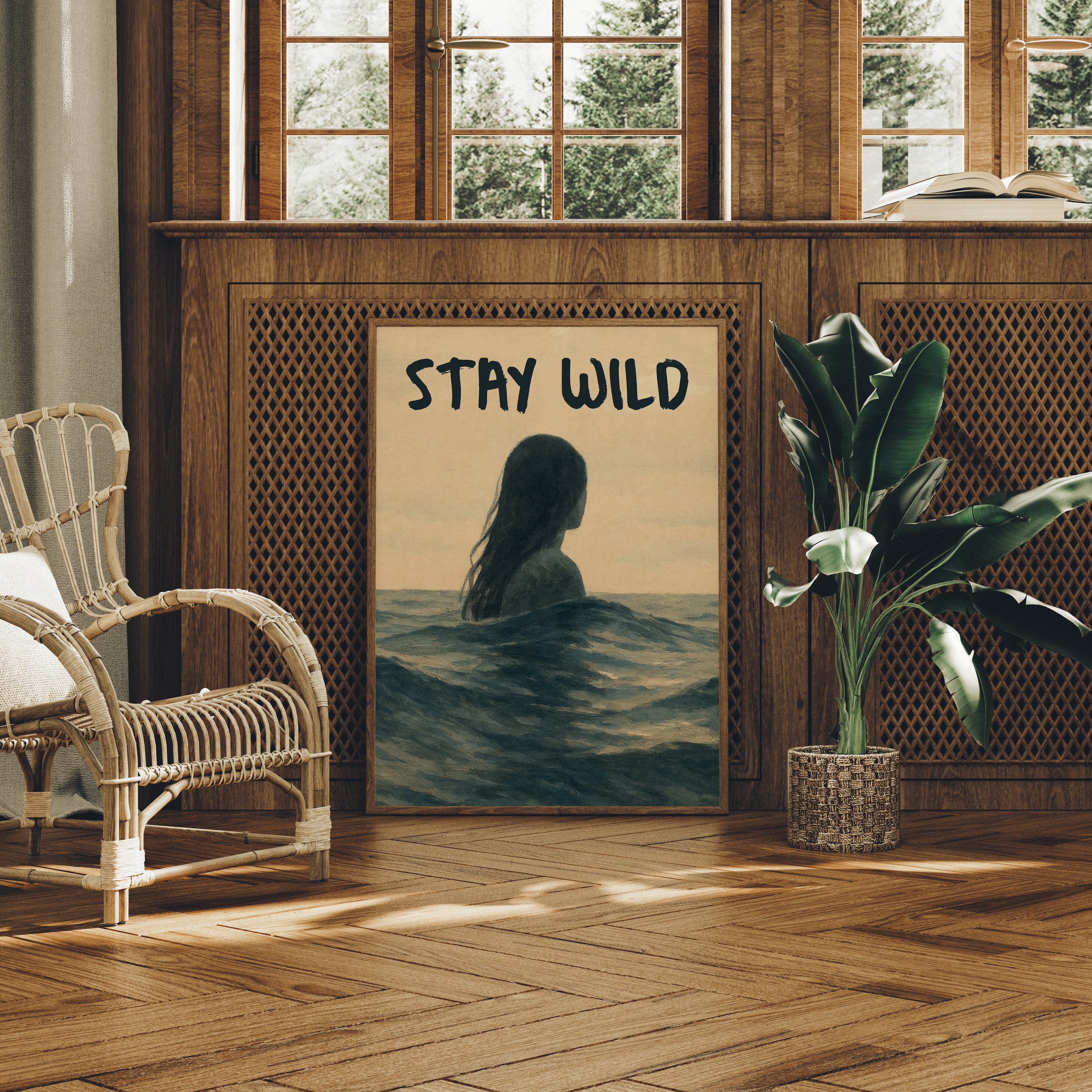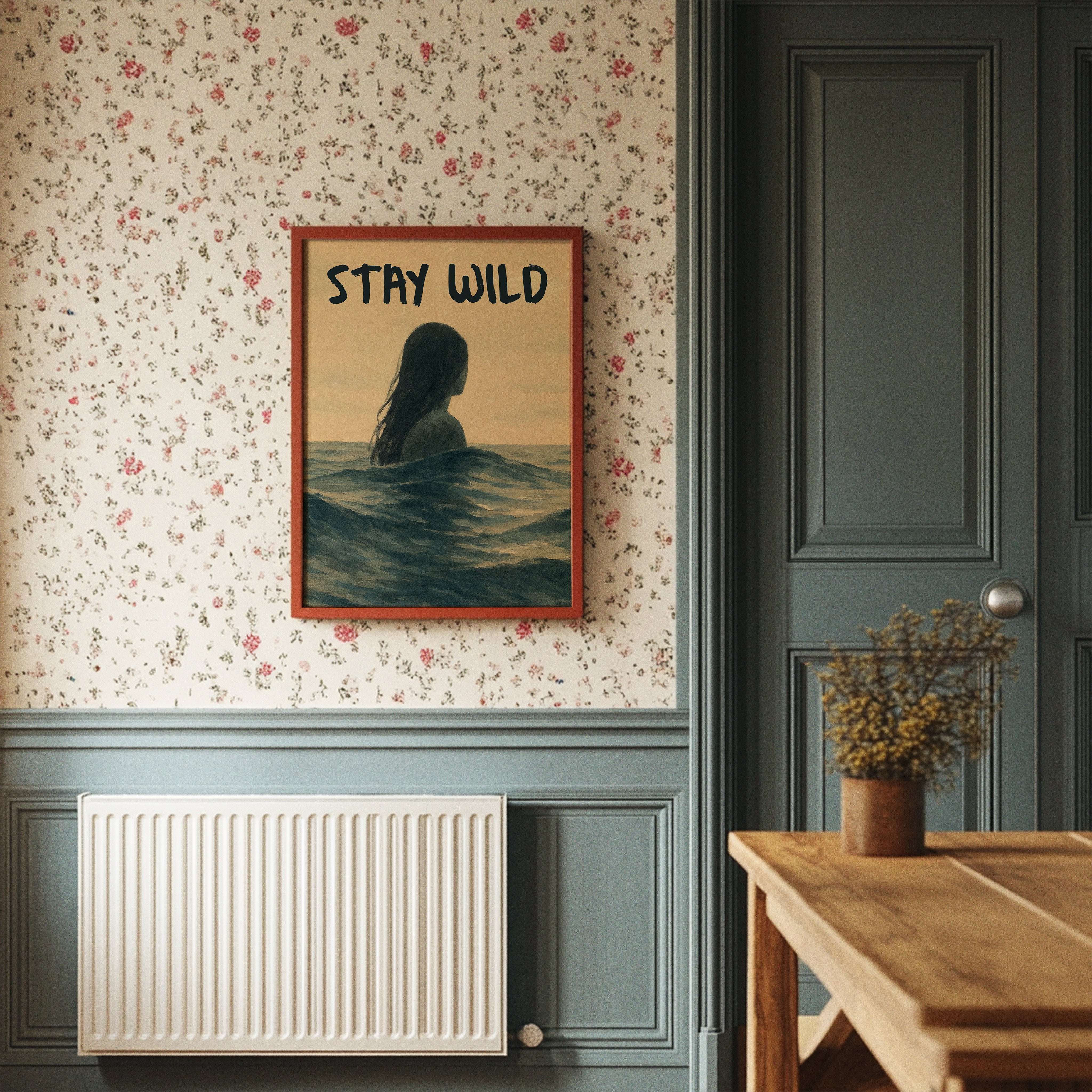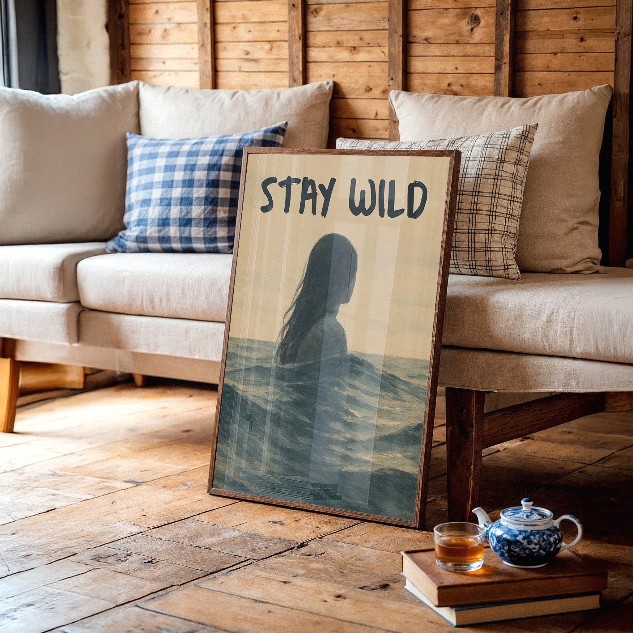The sea holds her secrets as a silhouette merges with rolling waves at dusk. Dark brushstrokes create a haunting seascape where human form and ocean become one, beneath bold lettering that commands defiance against conformity. The muted palette of cream and deep blues evokes a melancholic freedom, where surrender to natural forces becomes an act of rebellion. This piece speaks to those seeking courage in life's uncertain tides.