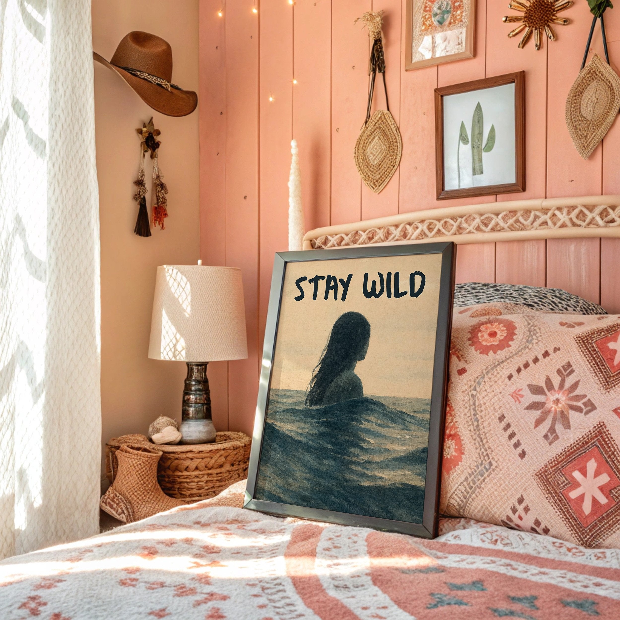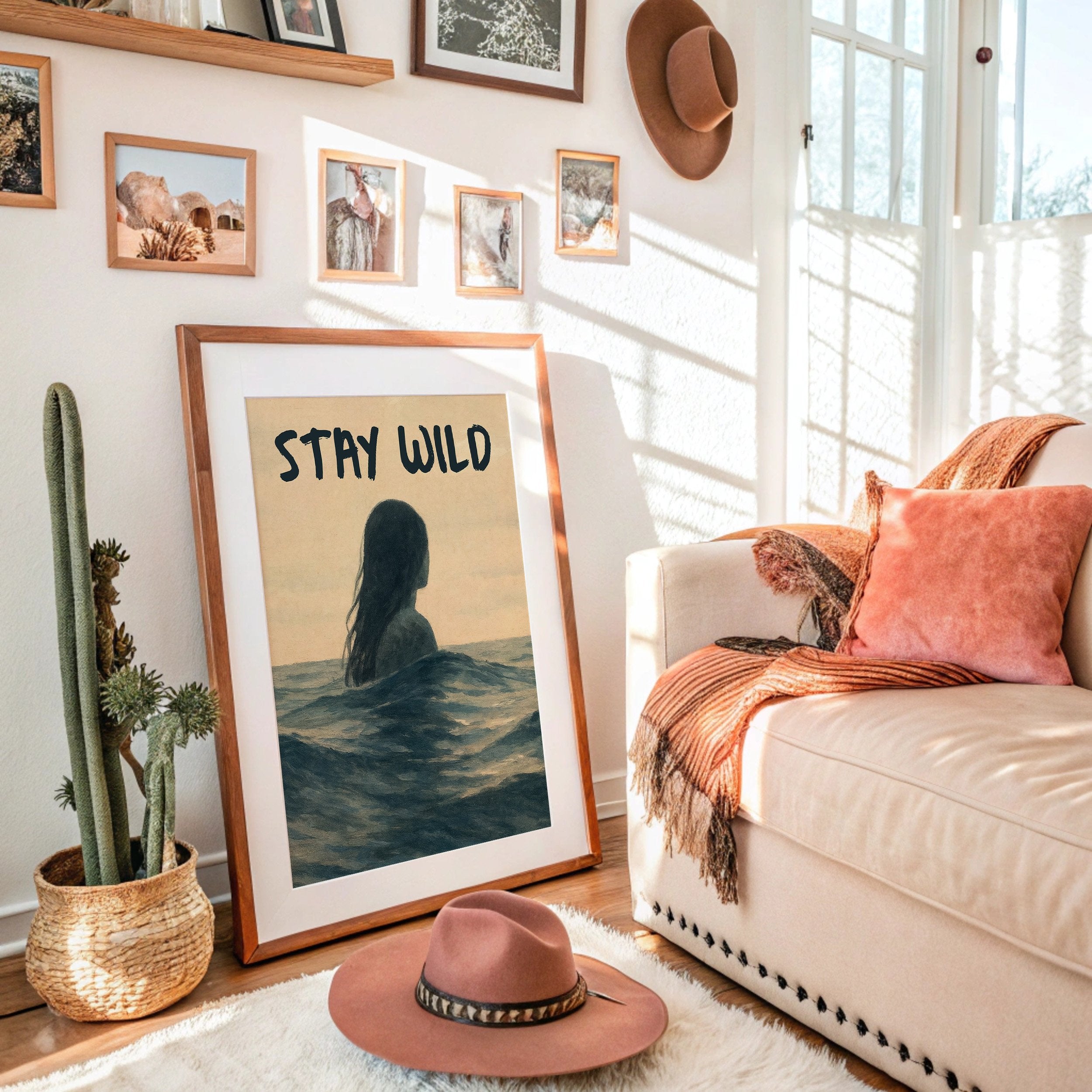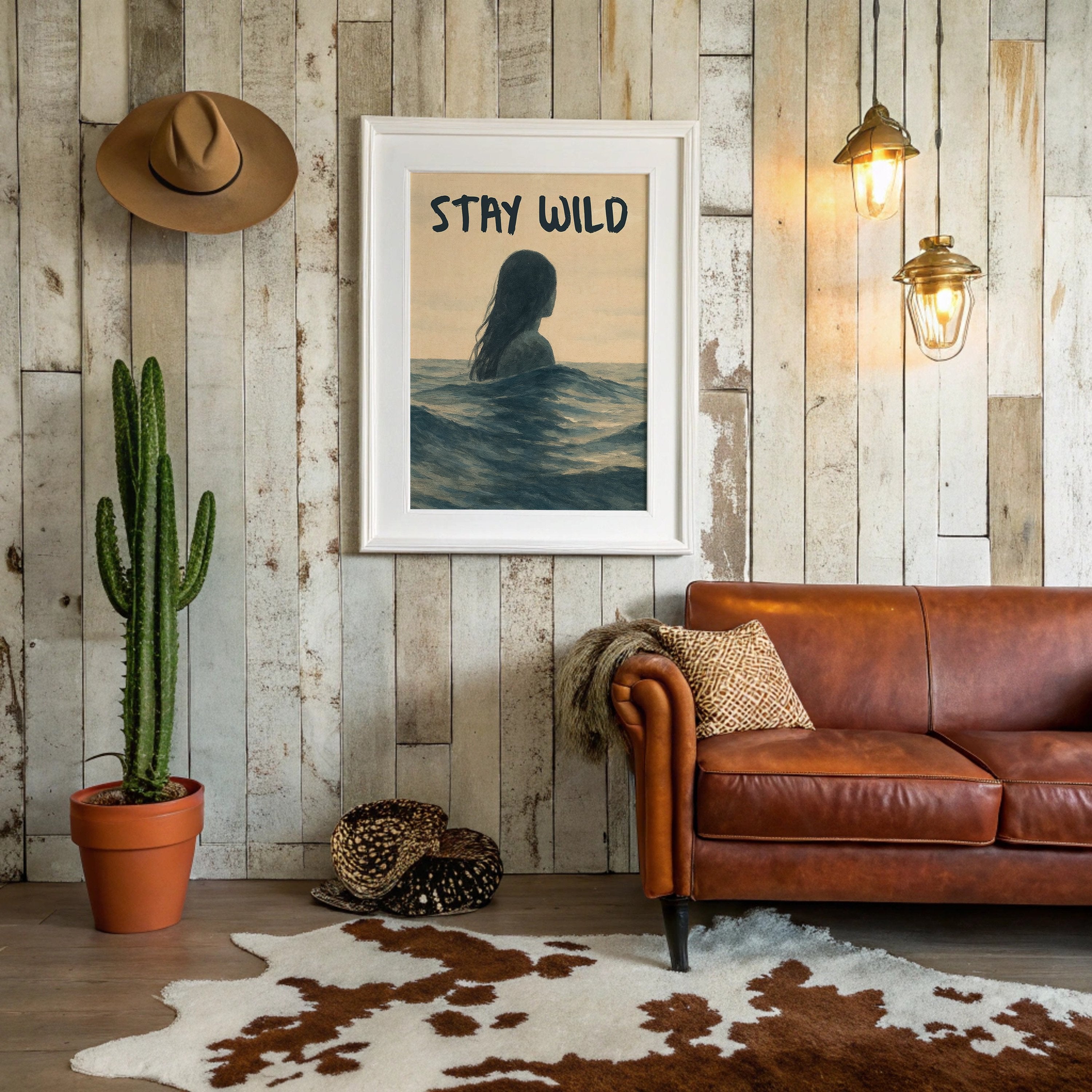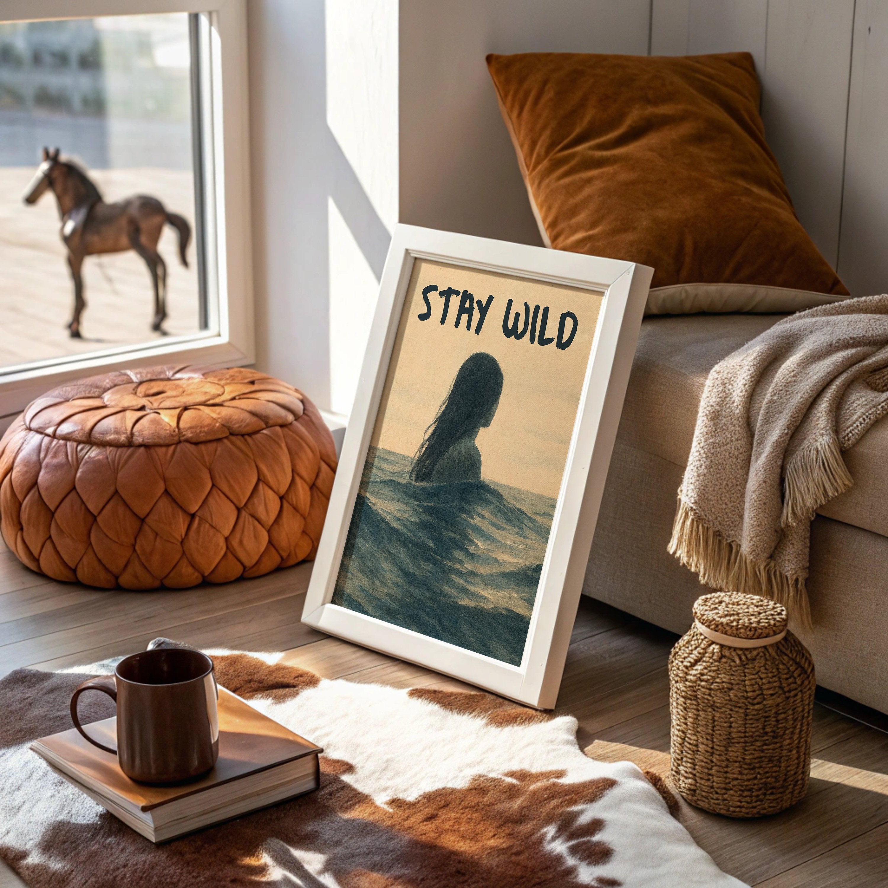 The sea holds her secrets as a silhouette merges with rolling waves at dusk. Dark brushstrokes create a haunting seascape where human form and ocean become one, beneath bold lettering that commands defiance against conformity. The muted palette of cream and deep blues evokes a melancholic freedom, where surrender to natural forces becomes an act of rebellion. This piece speaks to those seeking courage in life's uncertain tides.