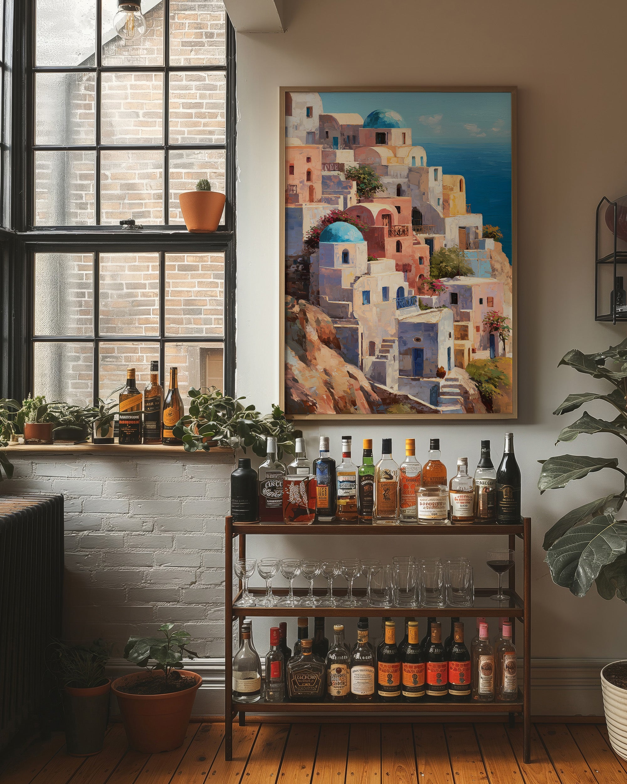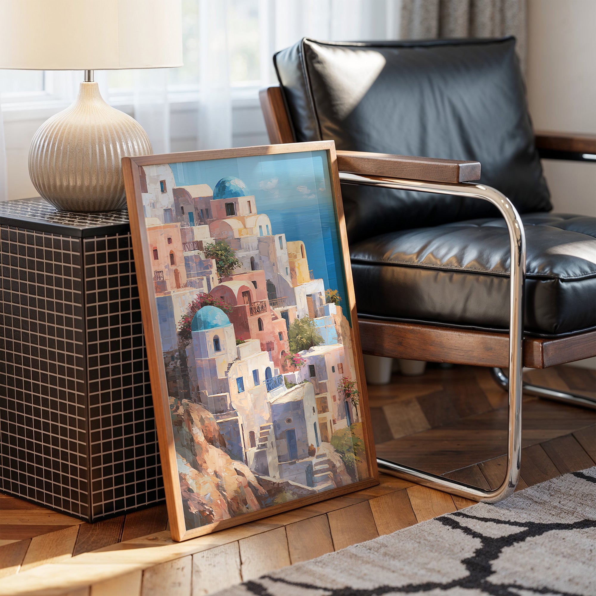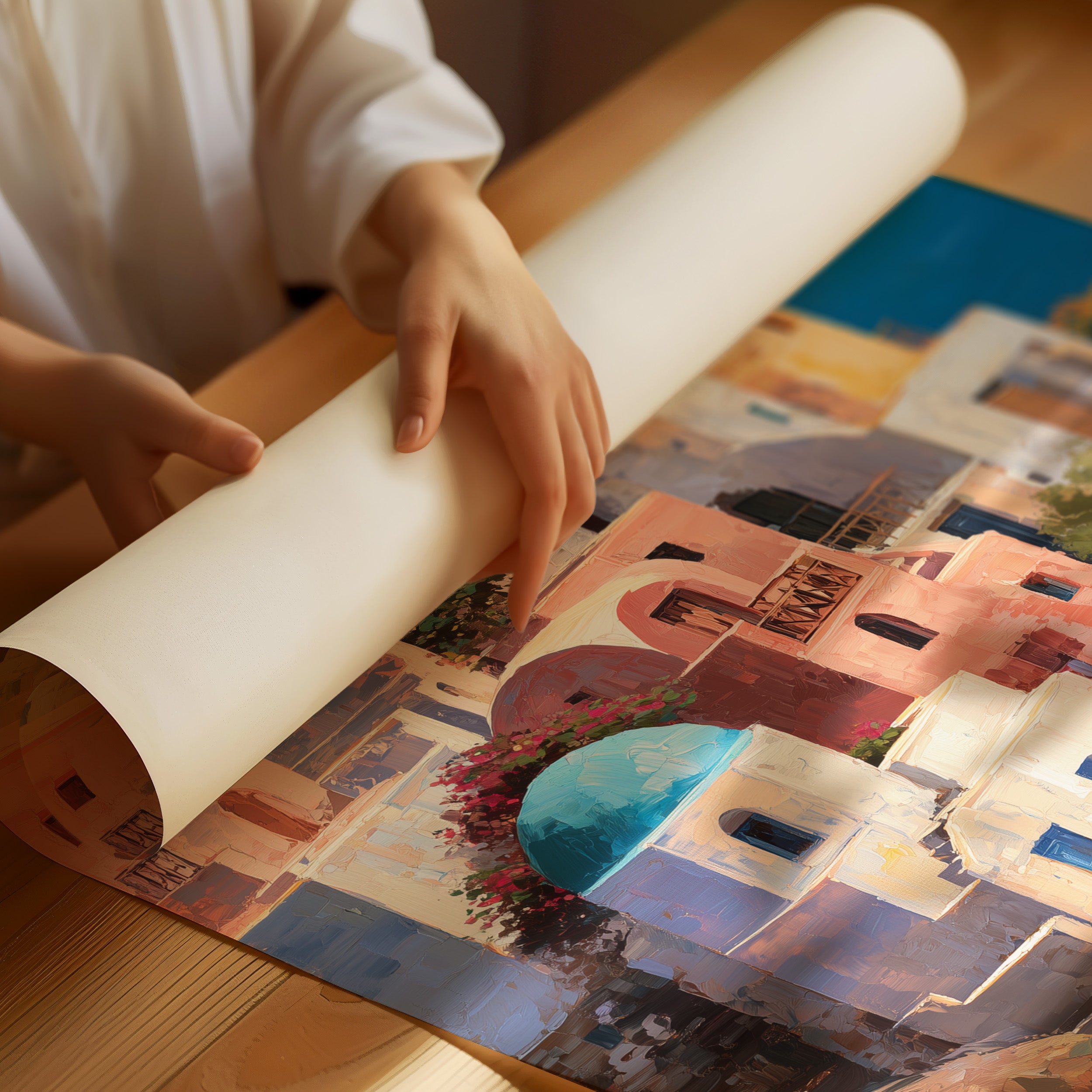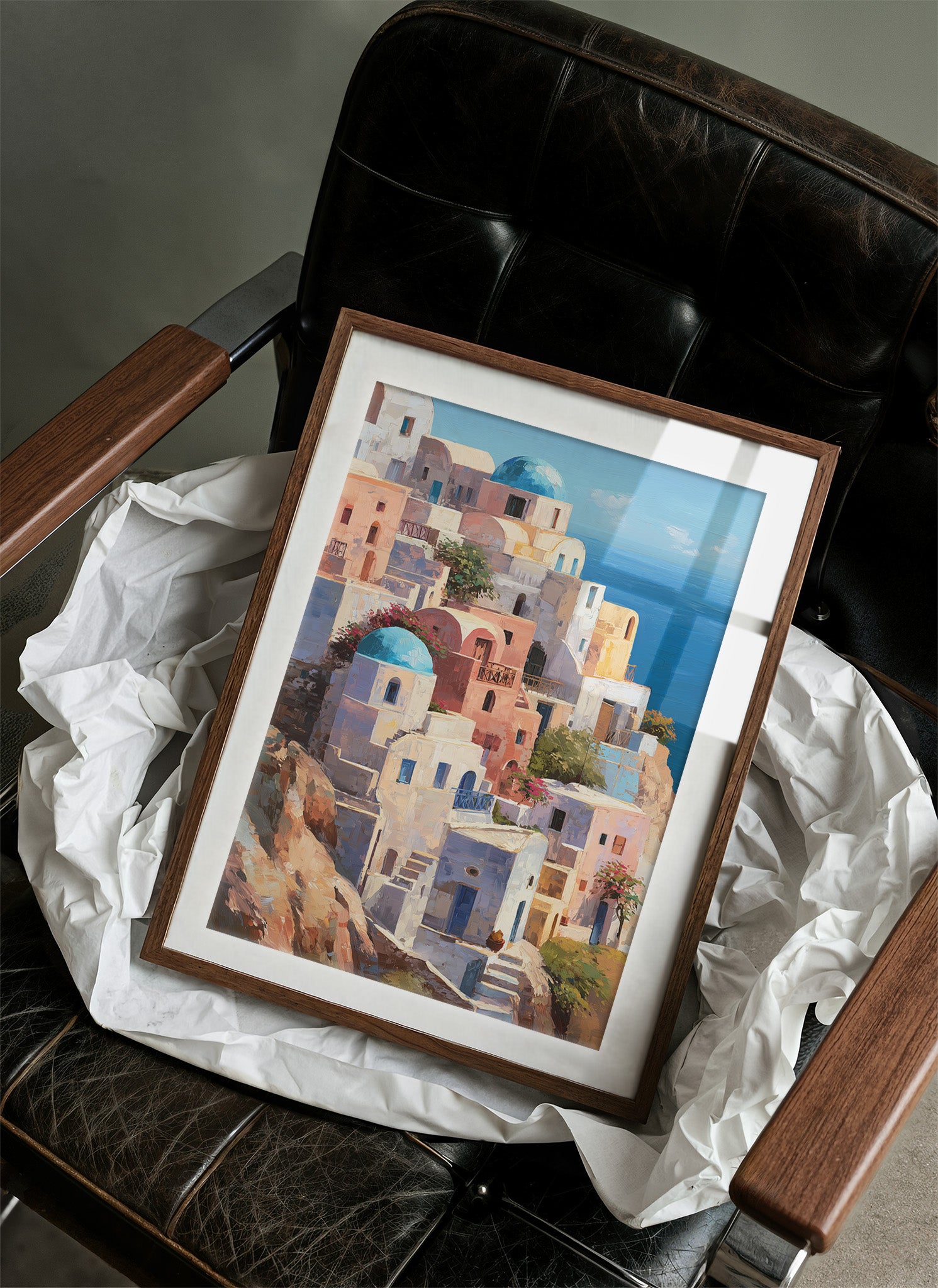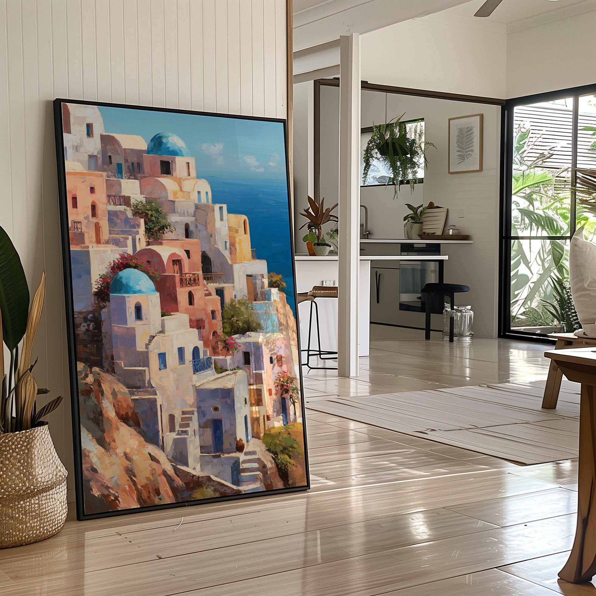 A vibrant a Mediterranean coastal village, likely inspired by Santorini, Greece. The deep azure sea stretches to the horizon under a clear blue sky, creating a striking contrast with the whitewashed structures. The painting captures the idyllic, sun-drenched atmosphere of a Greek island paradise in a impressionistic yet detailed style.