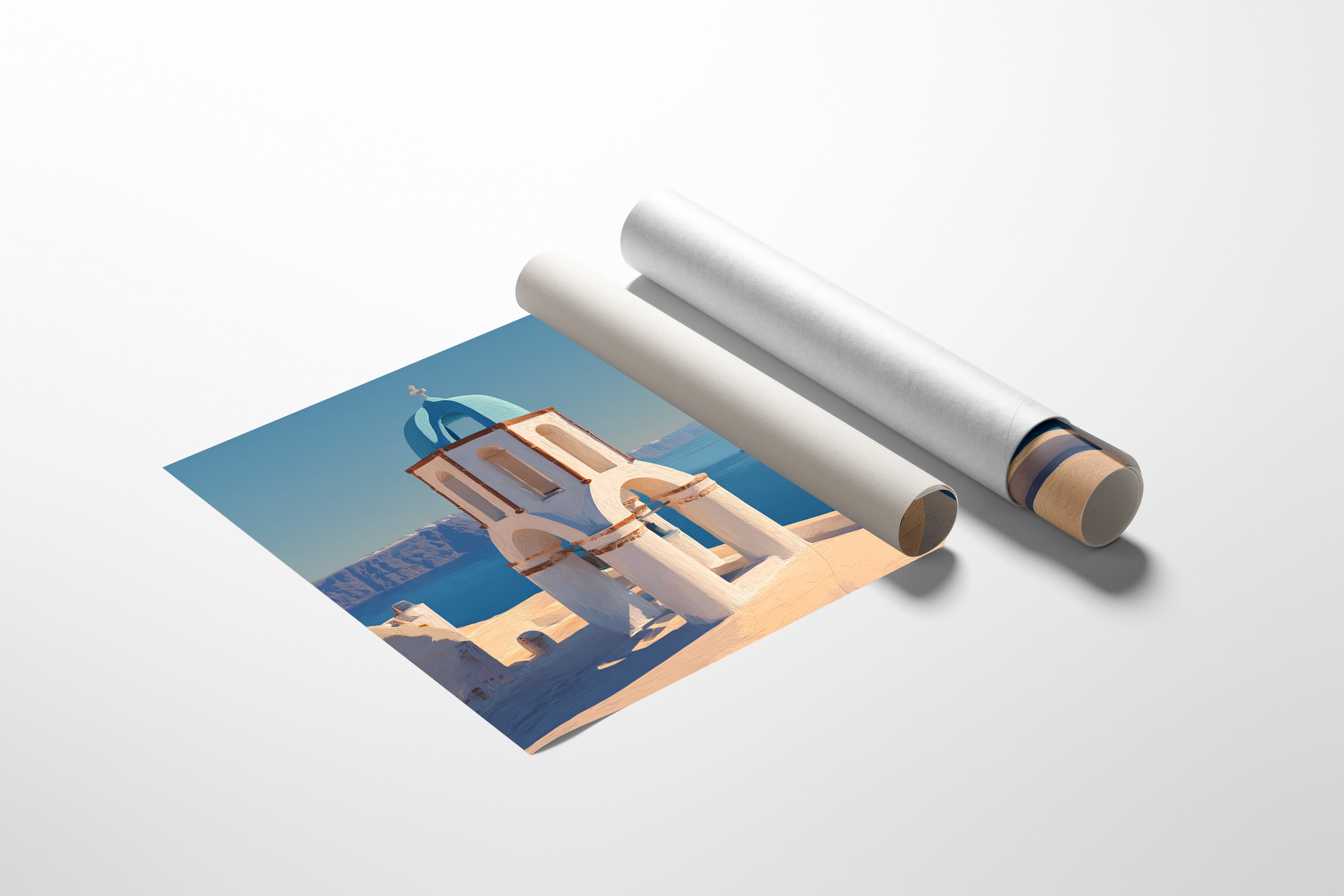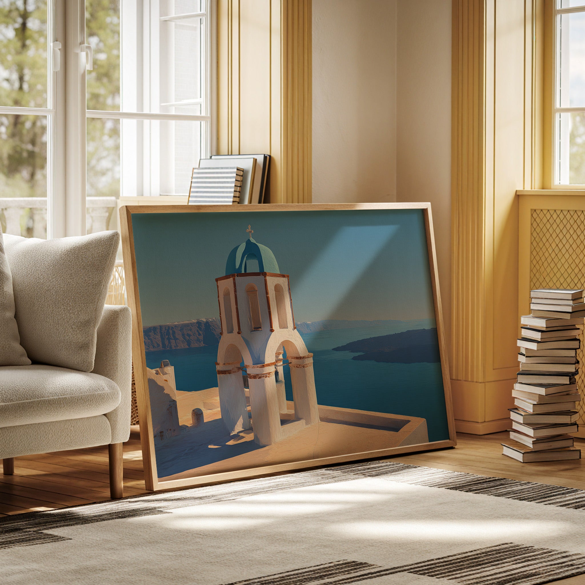 Sunlight caresses white-washed walls against an endless azure horizon, creating a moment of transcendent serenity. The iconic bell tower stands as a pristine sentinel, its blue dome mirroring the depths of the Mediterranean waters below. Classical arches frame glimpses of the caldera's dramatic coastline, while copper accents catch the warm Mediterranean light, creating a harmonious dance between architecture and nature. This piece brings the timeless beauty of Santorini into contemporary spaces, perfect for creating a serene focal point in a sun-filled living room or meditation space.
