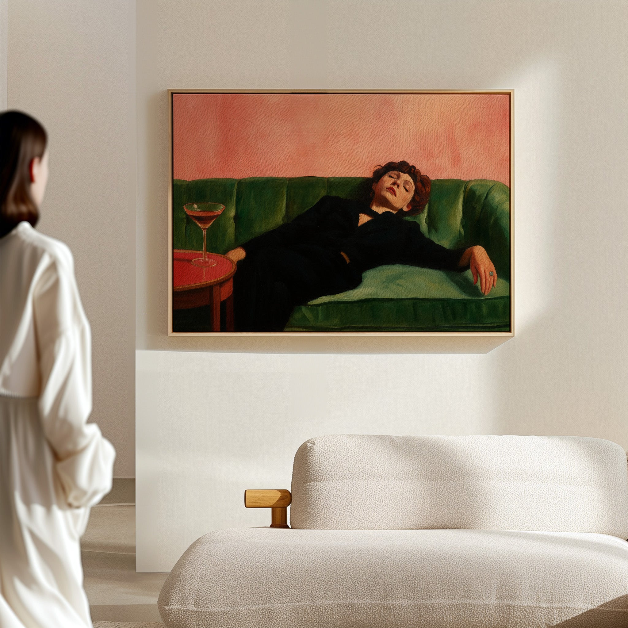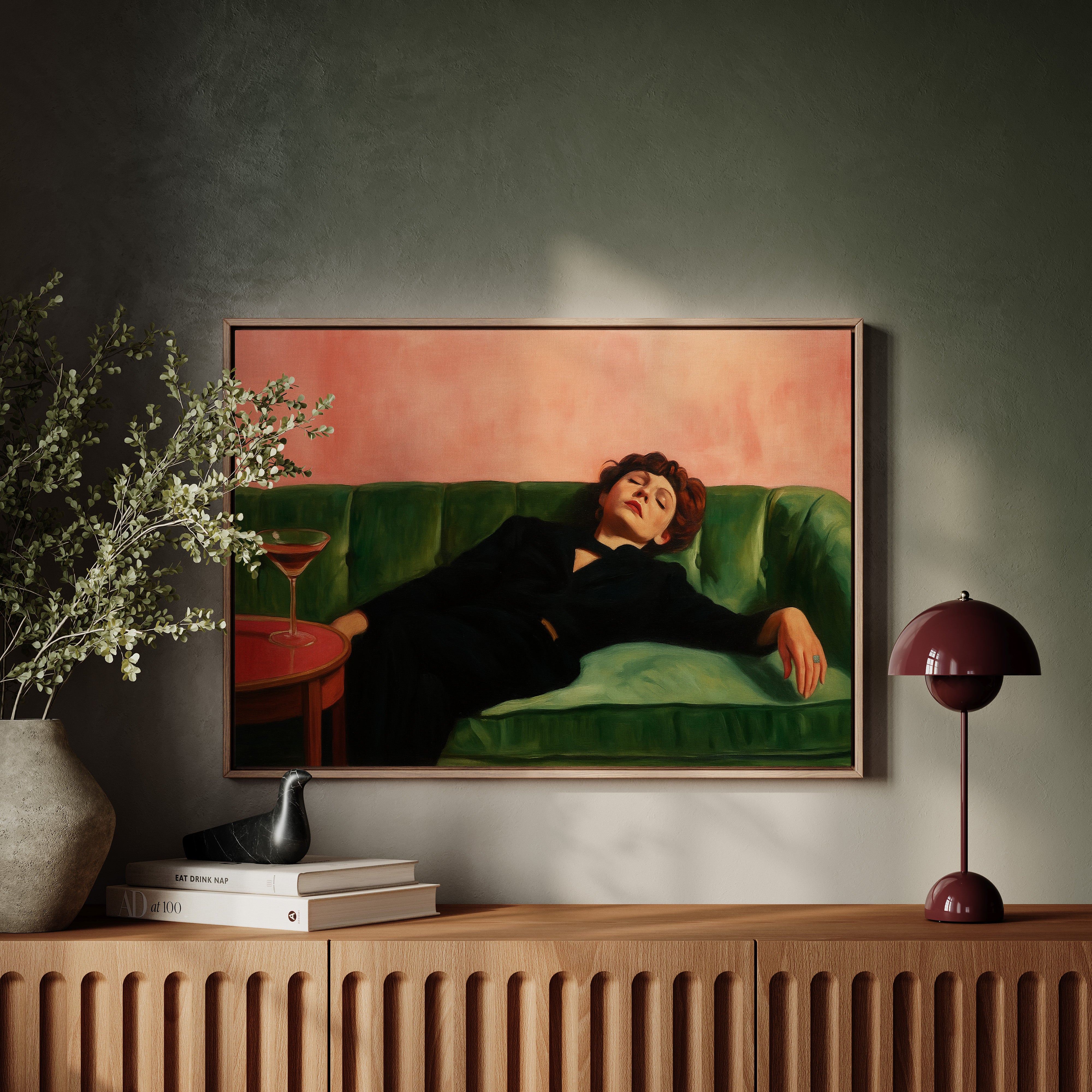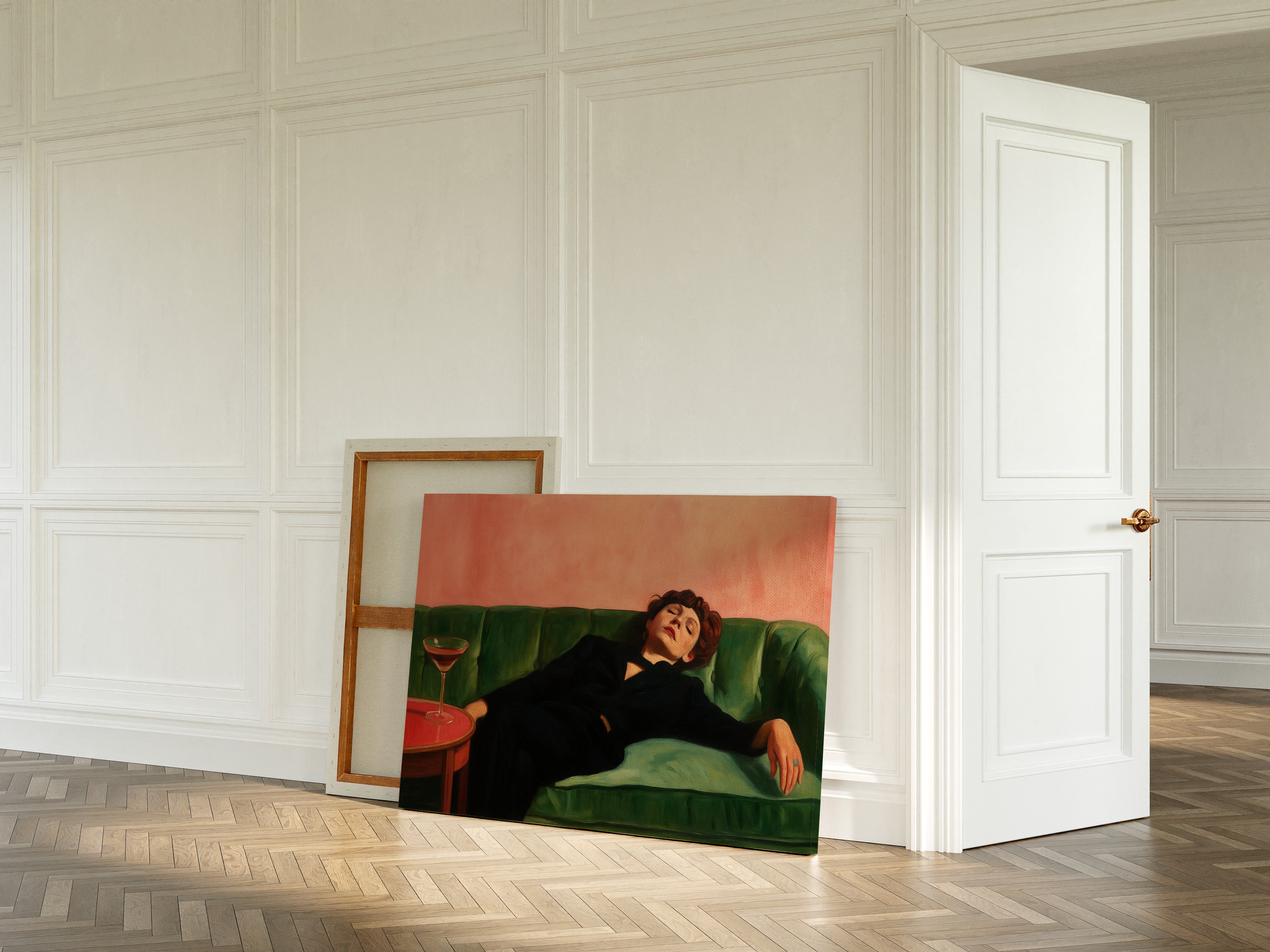 Bathed in midcentury tones, she sinks into silence and saturated stillness. A cinematic oil painting full of mystery, mood, and femme noir allure.