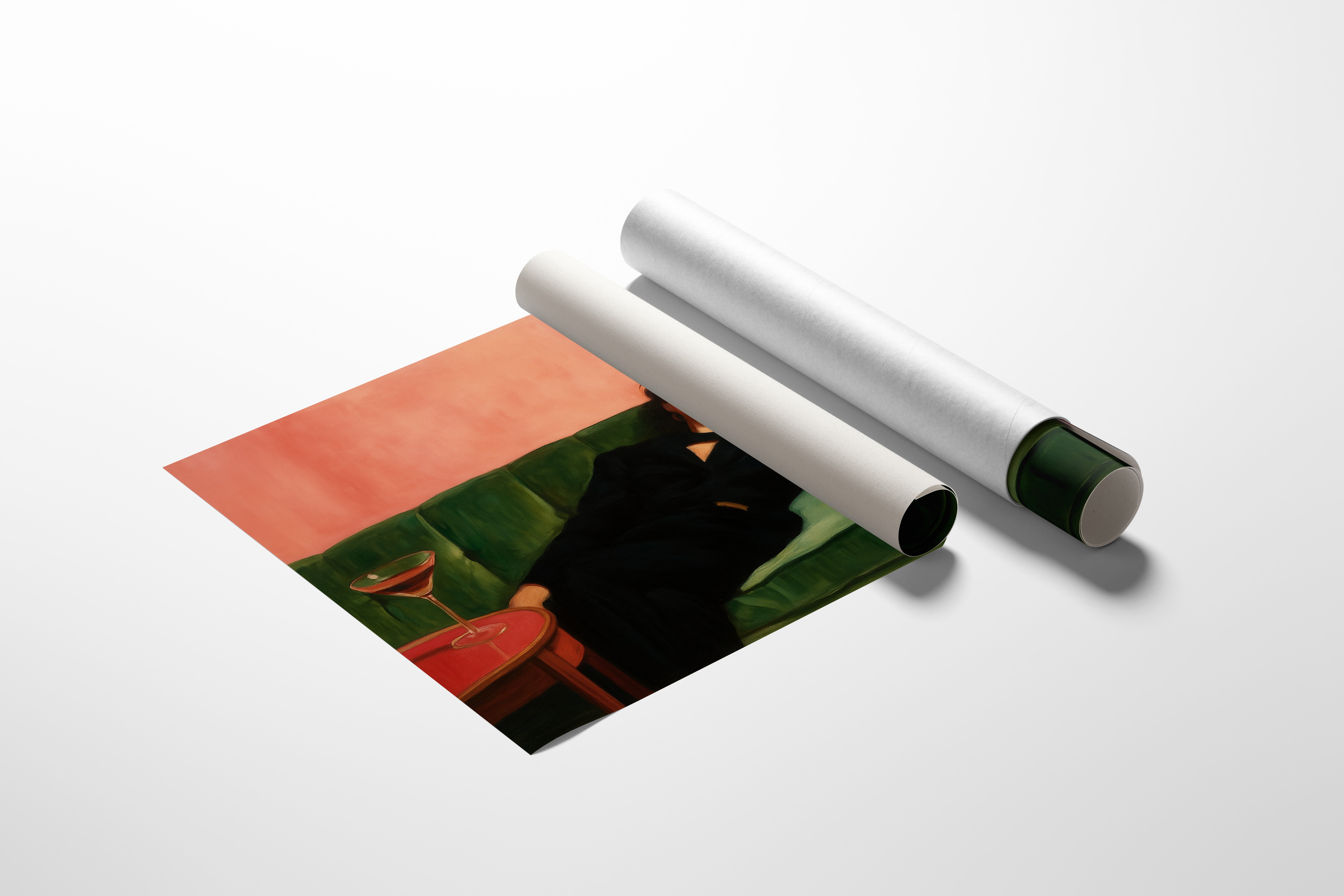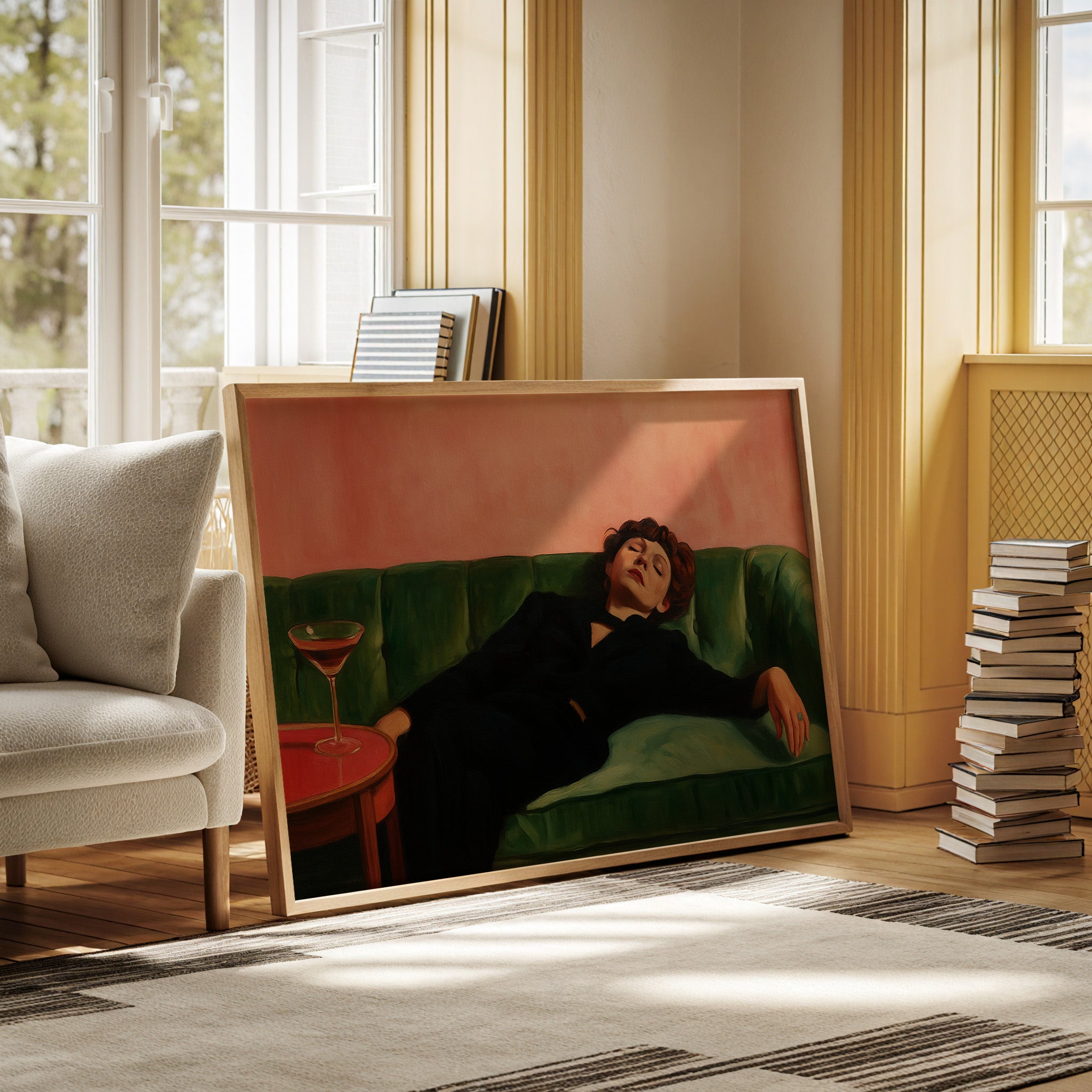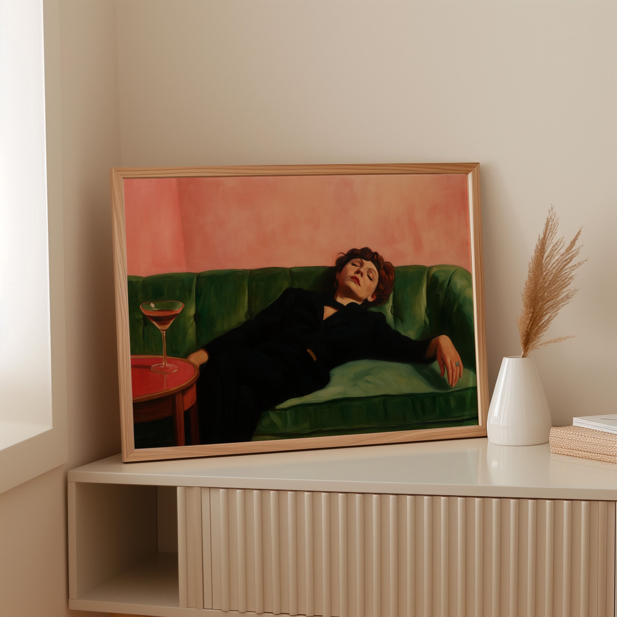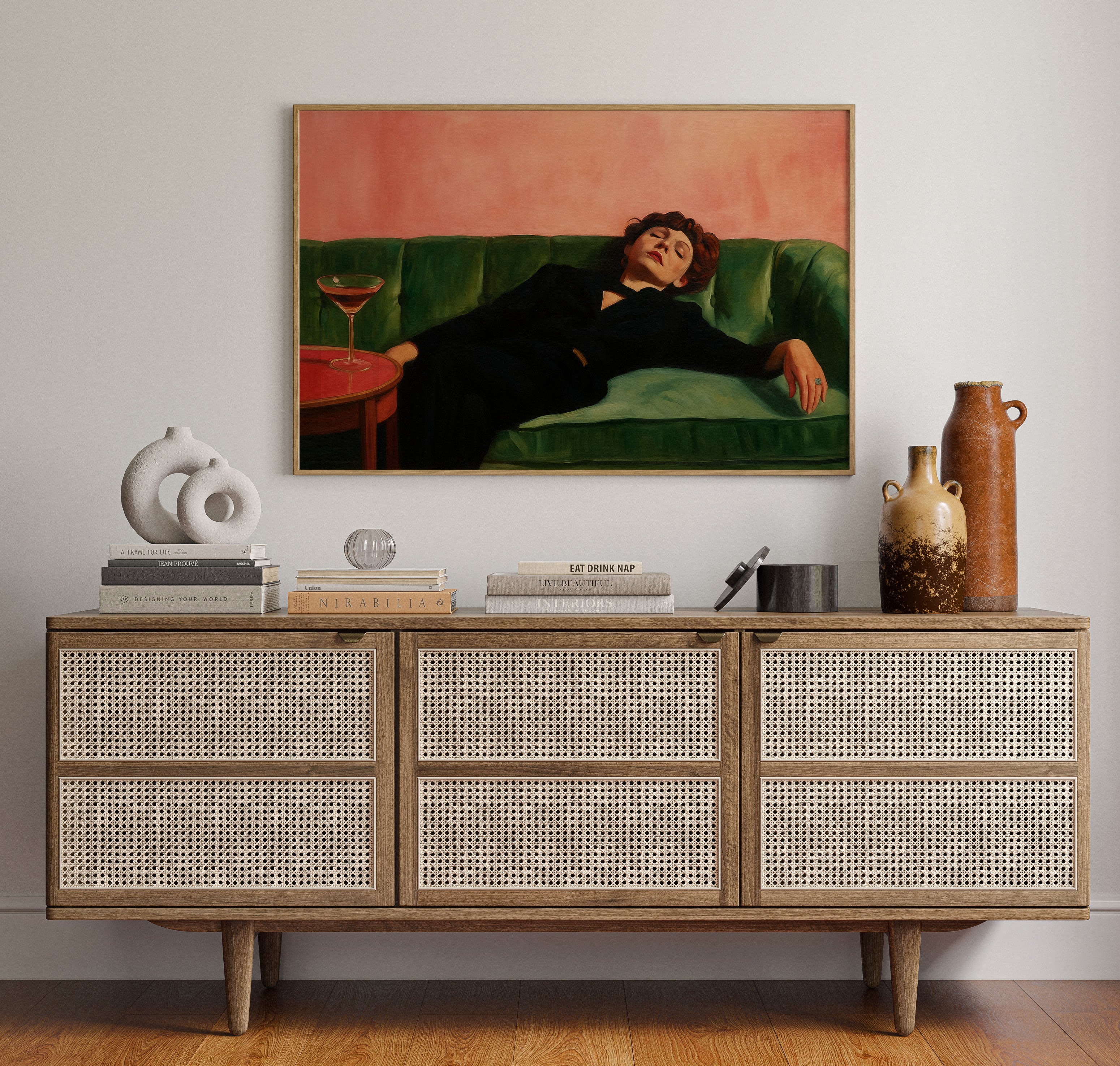 Bathed in midcentury tones, she sinks into silence and saturated stillness. A cinematic oil painting full of mystery, mood, and femme noir allure.