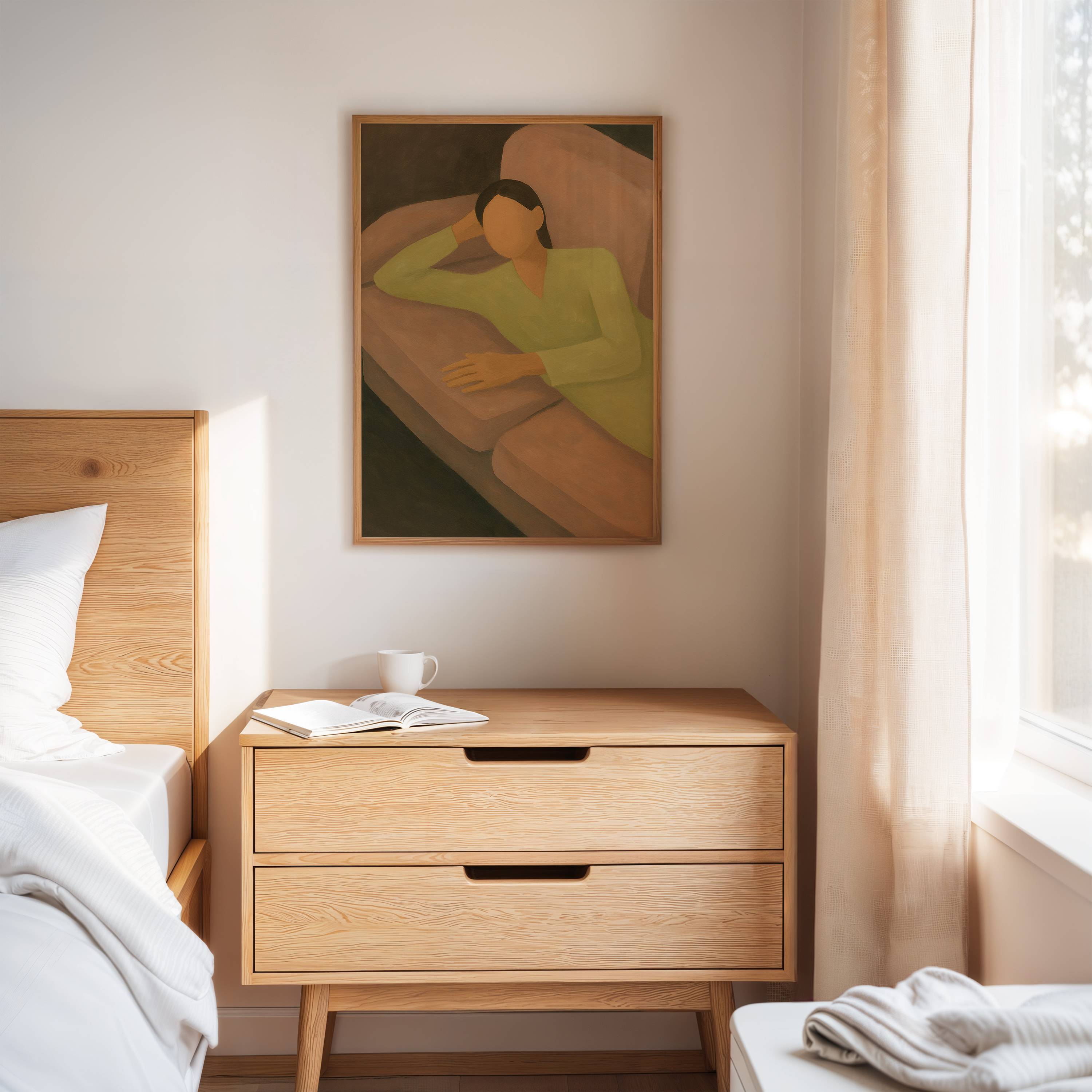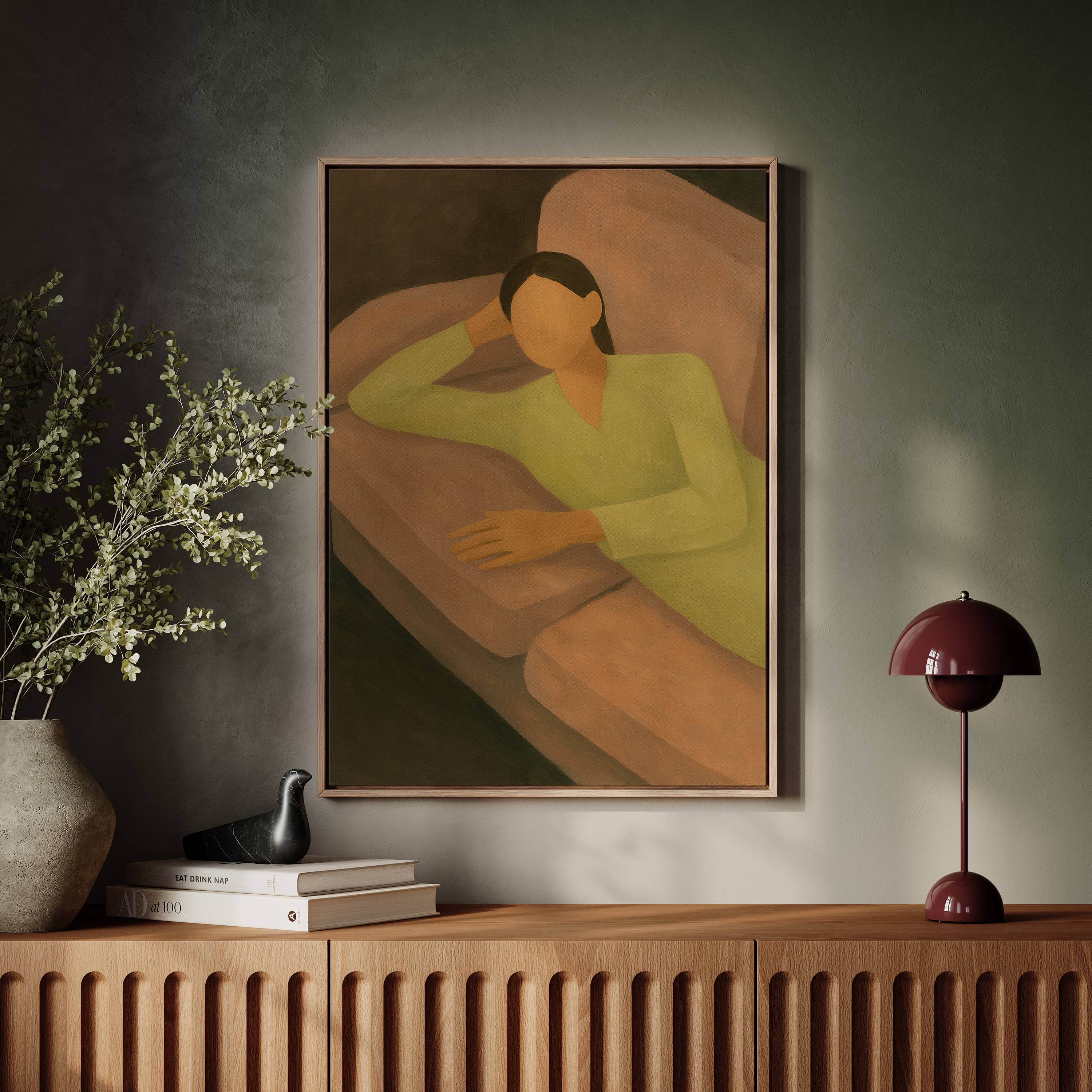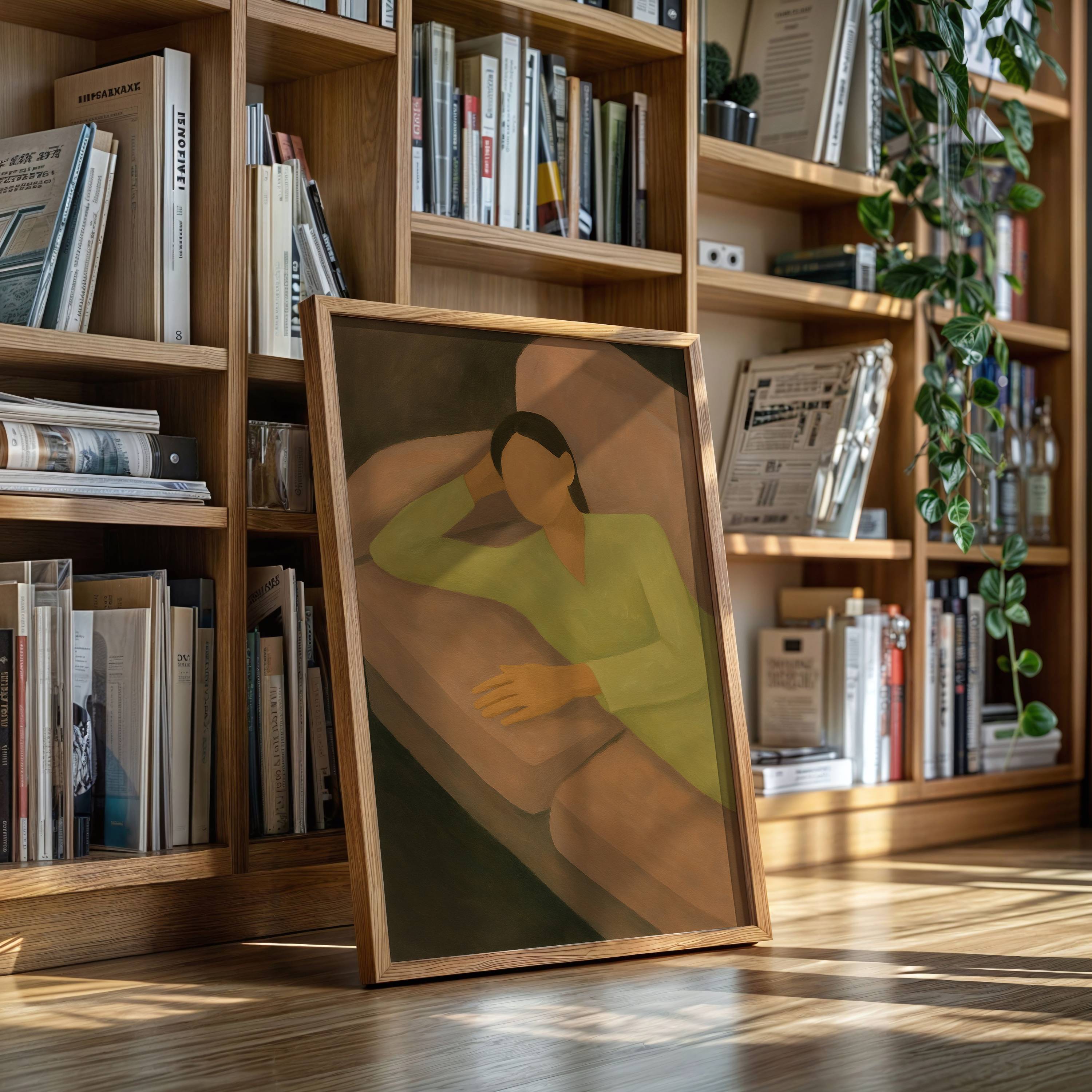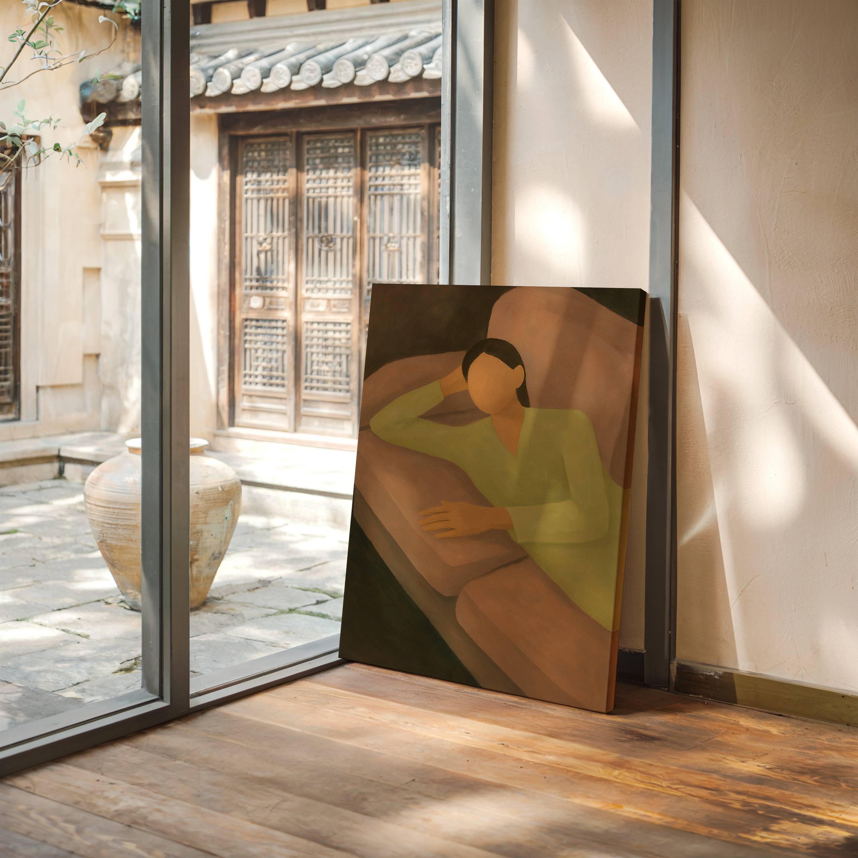 Soft earth tones blend together in a contemplative scene, where chartreuse meets terracotta in gentle harmony. The minimalist composition creates a sense of peaceful solitude, with simplified forms and subtle shadows adding depth to the contemporary narrative. The warm palette evokes the feeling of late afternoon sun filtering through windows, creating an intimate atmosphere of reflection and repose. This piece would bring a sophisticated, calming presence to a modern reading nook or meditation space.