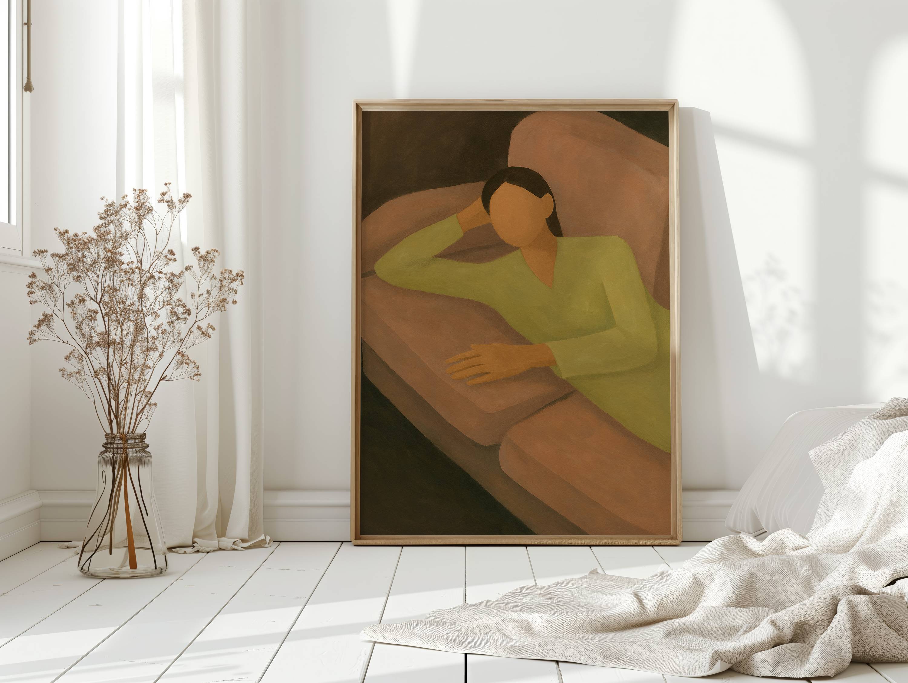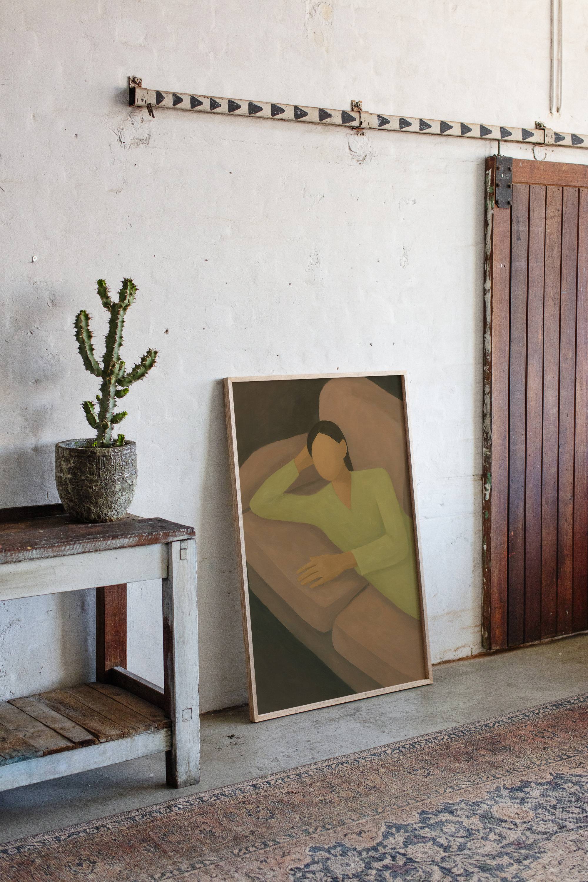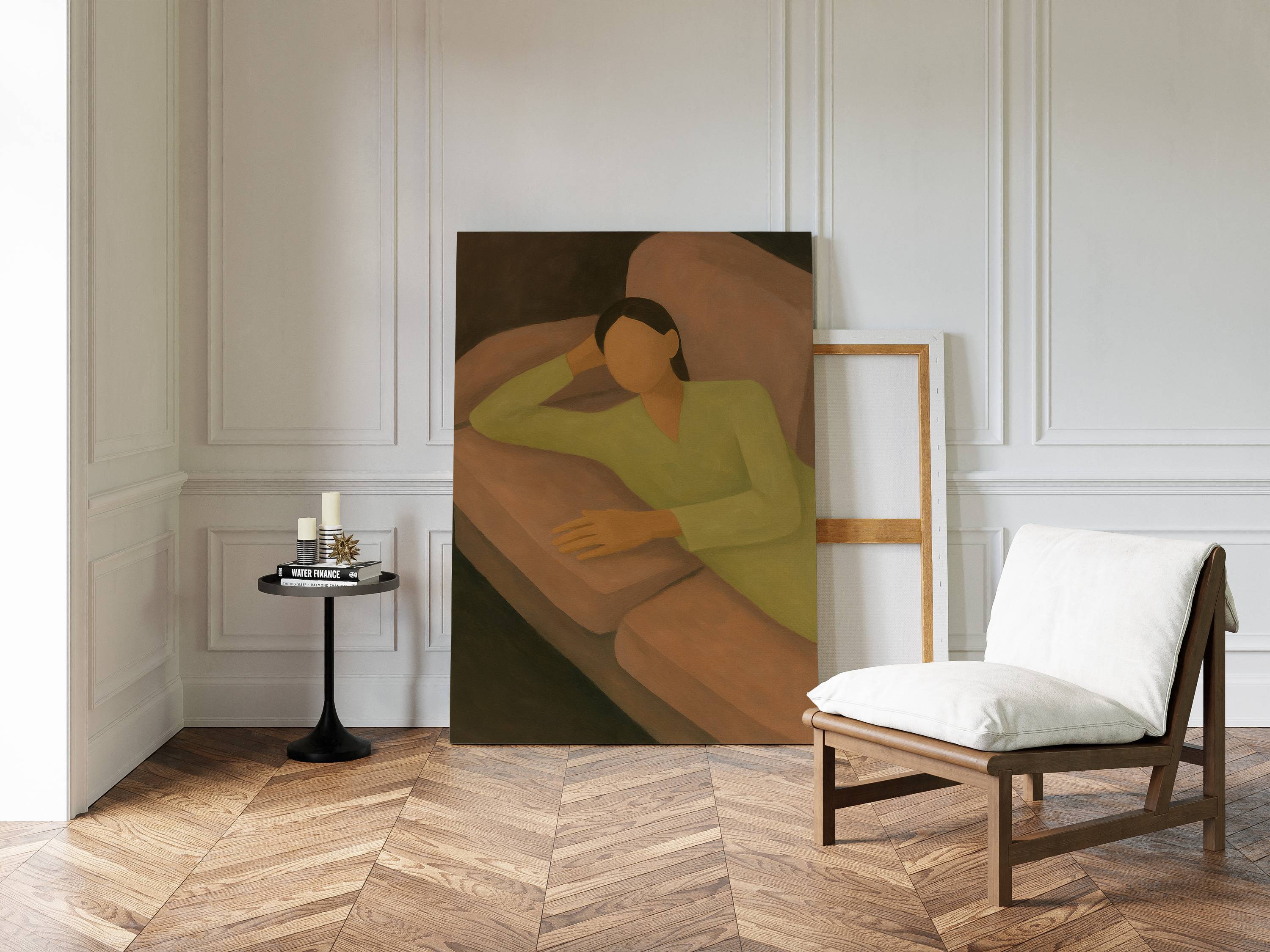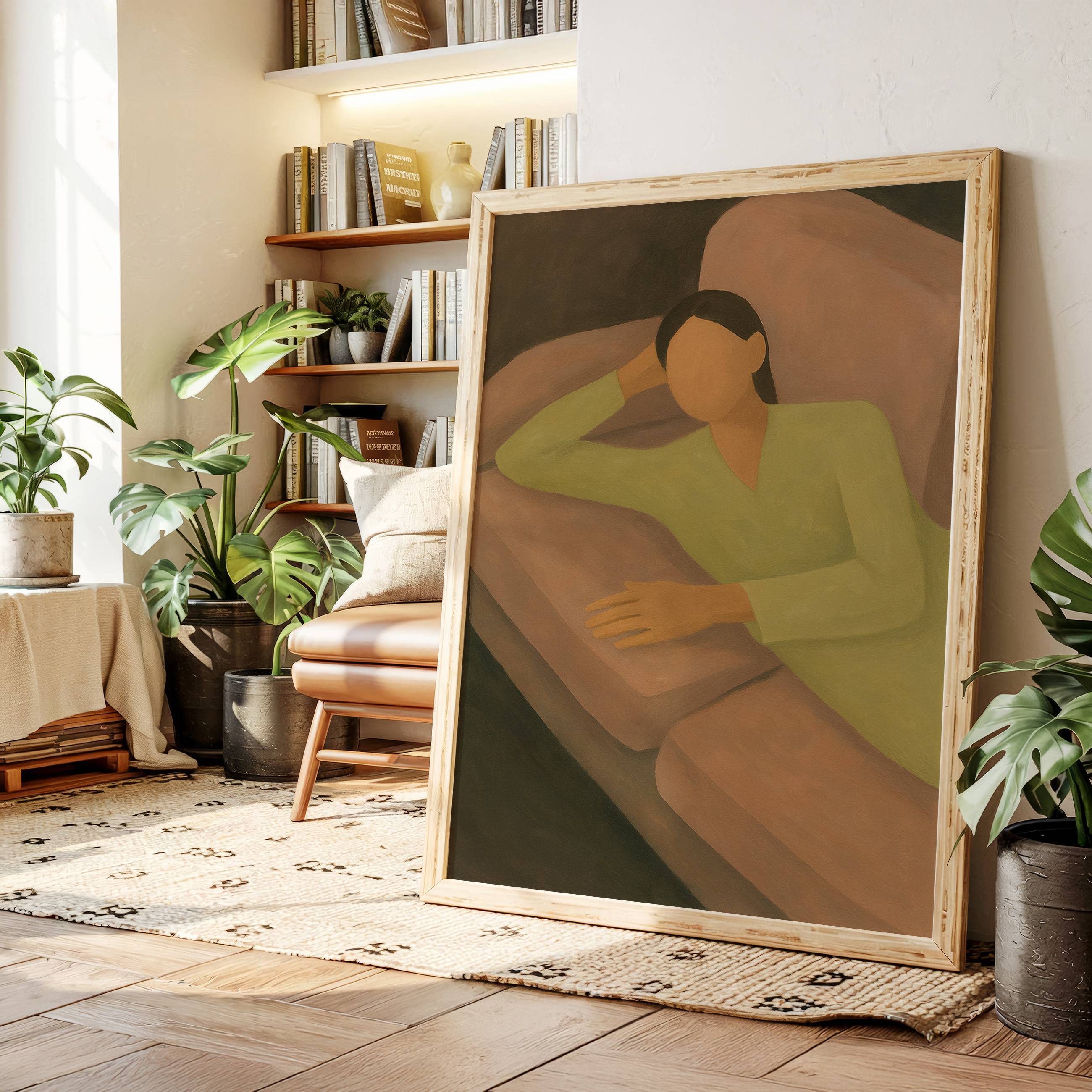 Soft earth tones blend together in a contemplative scene, where chartreuse meets terracotta in gentle harmony. The minimalist composition creates a sense of peaceful solitude, with simplified forms and subtle shadows adding depth to the contemporary narrative. The warm palette evokes the feeling of late afternoon sun filtering through windows, creating an intimate atmosphere of reflection and repose. This piece would bring a sophisticated, calming presence to a modern reading nook or meditation space.