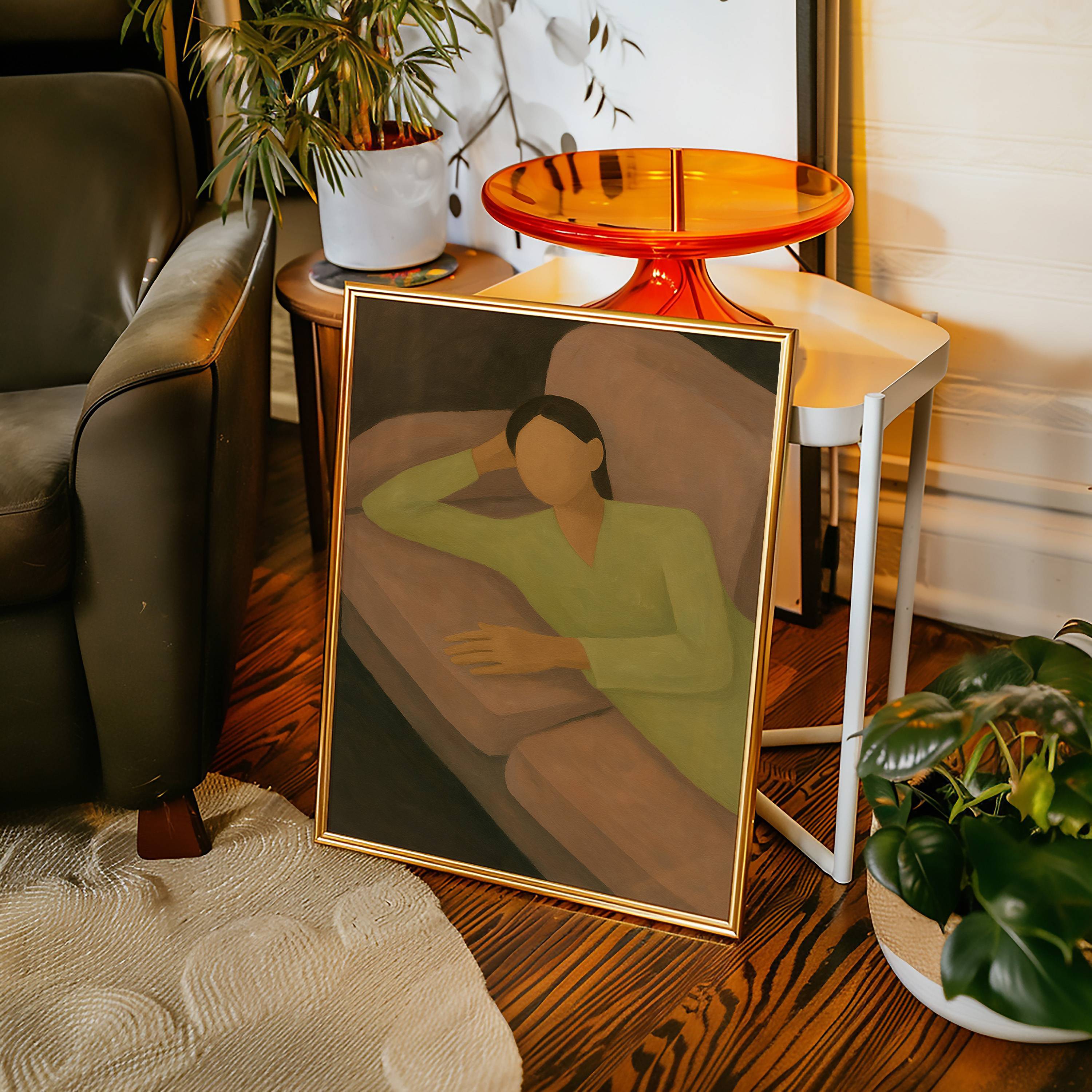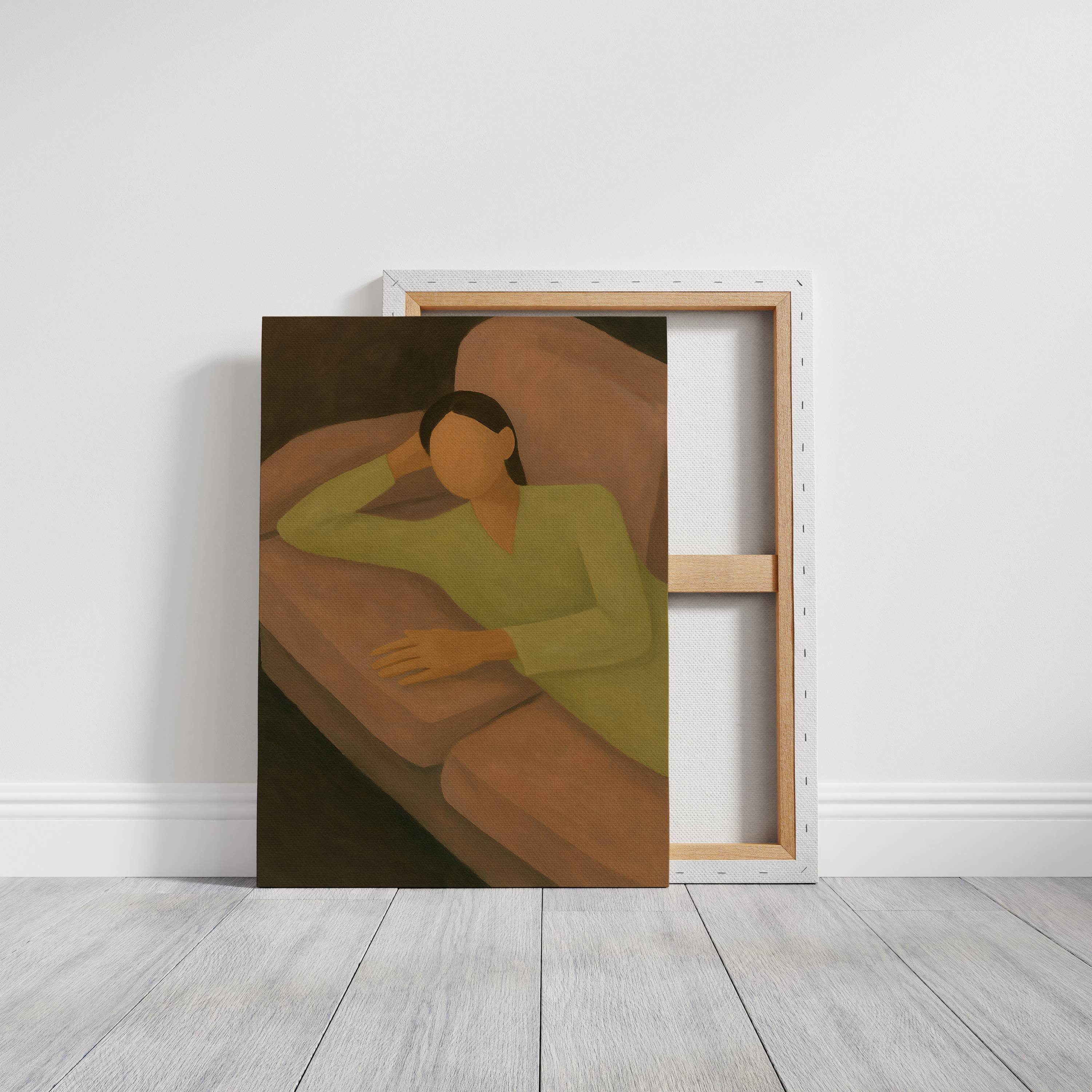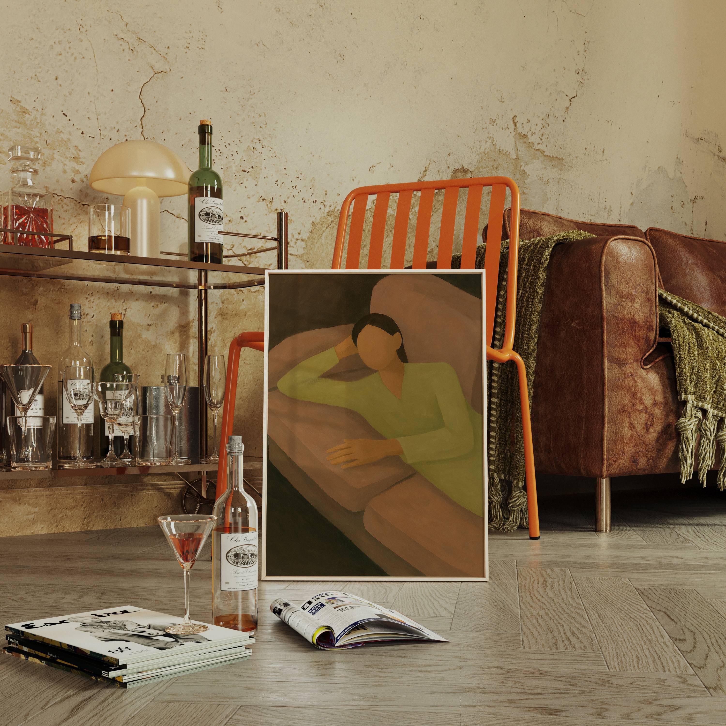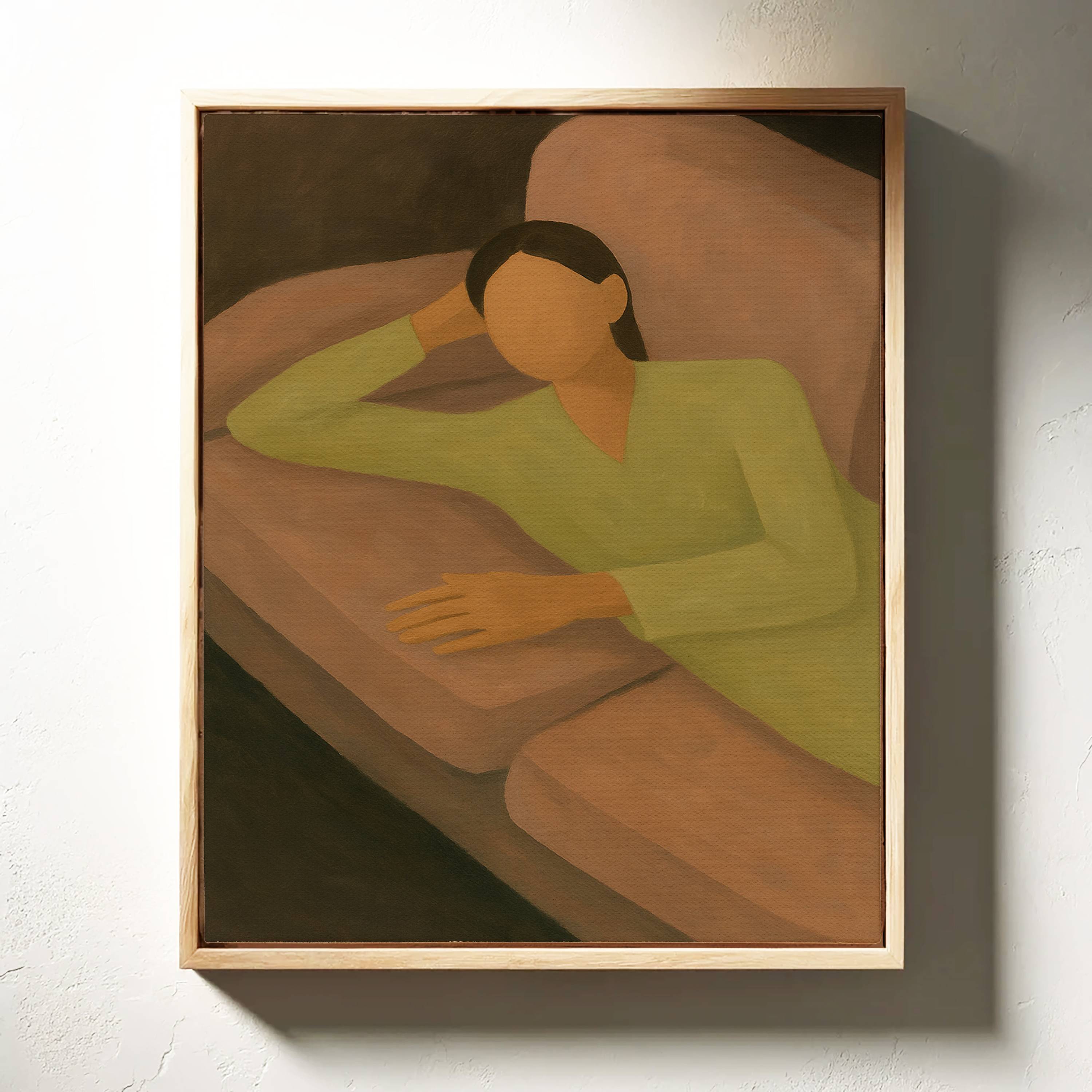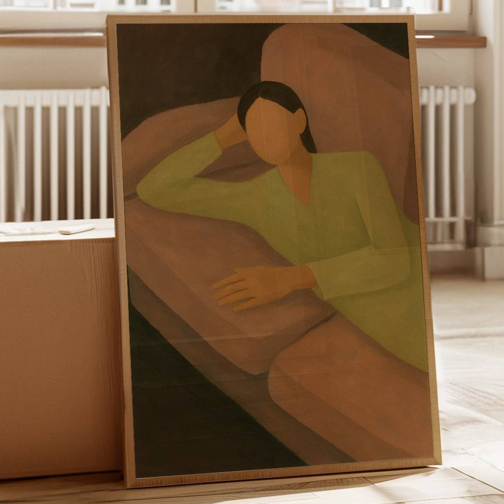 Soft earth tones blend together in a contemplative scene, where chartreuse meets terracotta in gentle harmony. The minimalist composition creates a sense of peaceful solitude, with simplified forms and subtle shadows adding depth to the contemporary narrative. The warm palette evokes the feeling of late afternoon sun filtering through windows, creating an intimate atmosphere of reflection and repose. This piece would bring a sophisticated, calming presence to a modern reading nook or meditation space.
