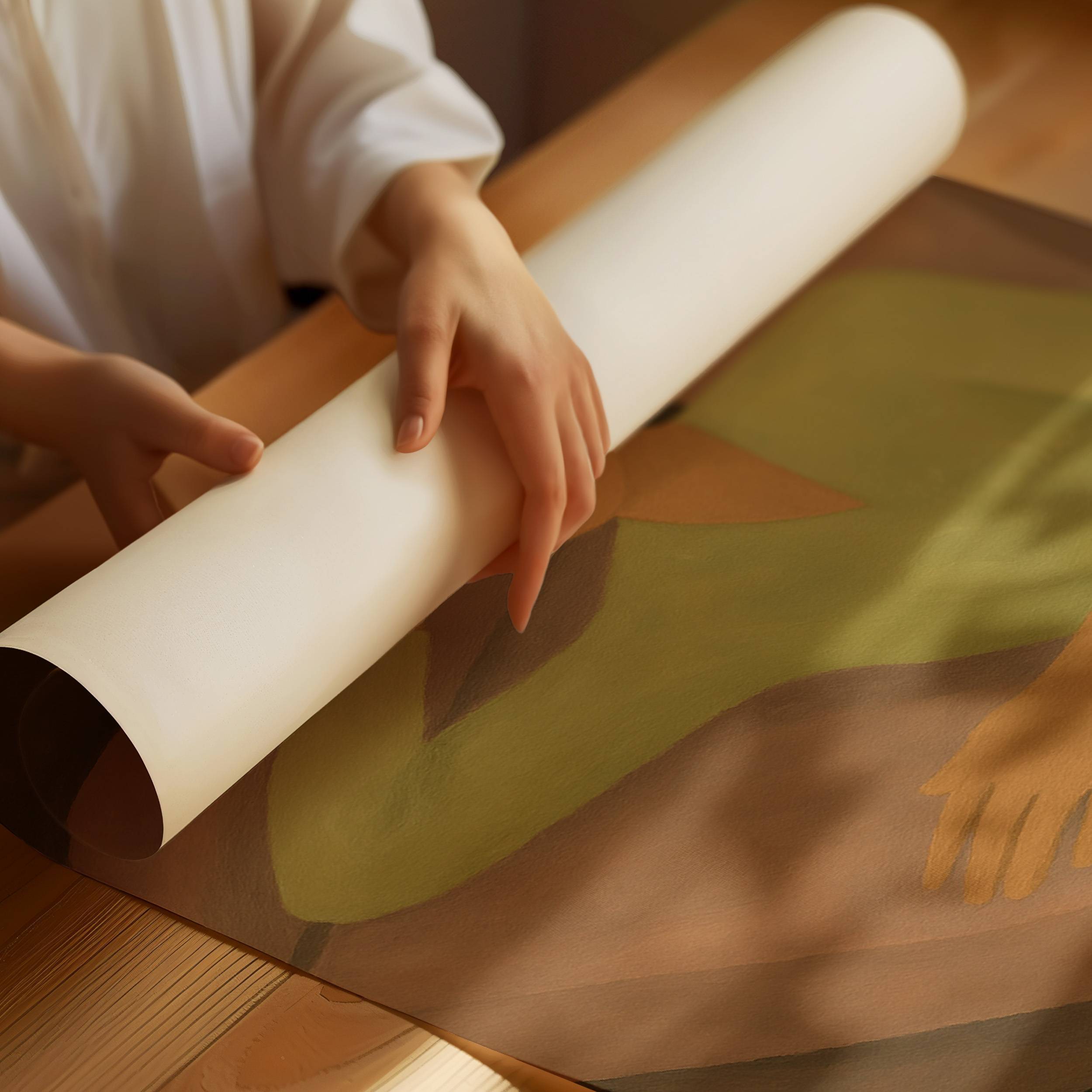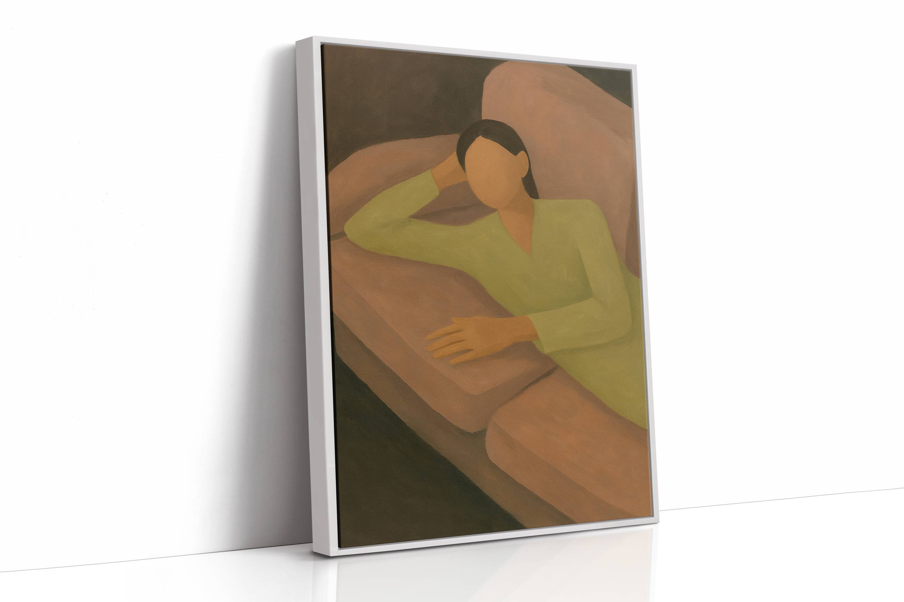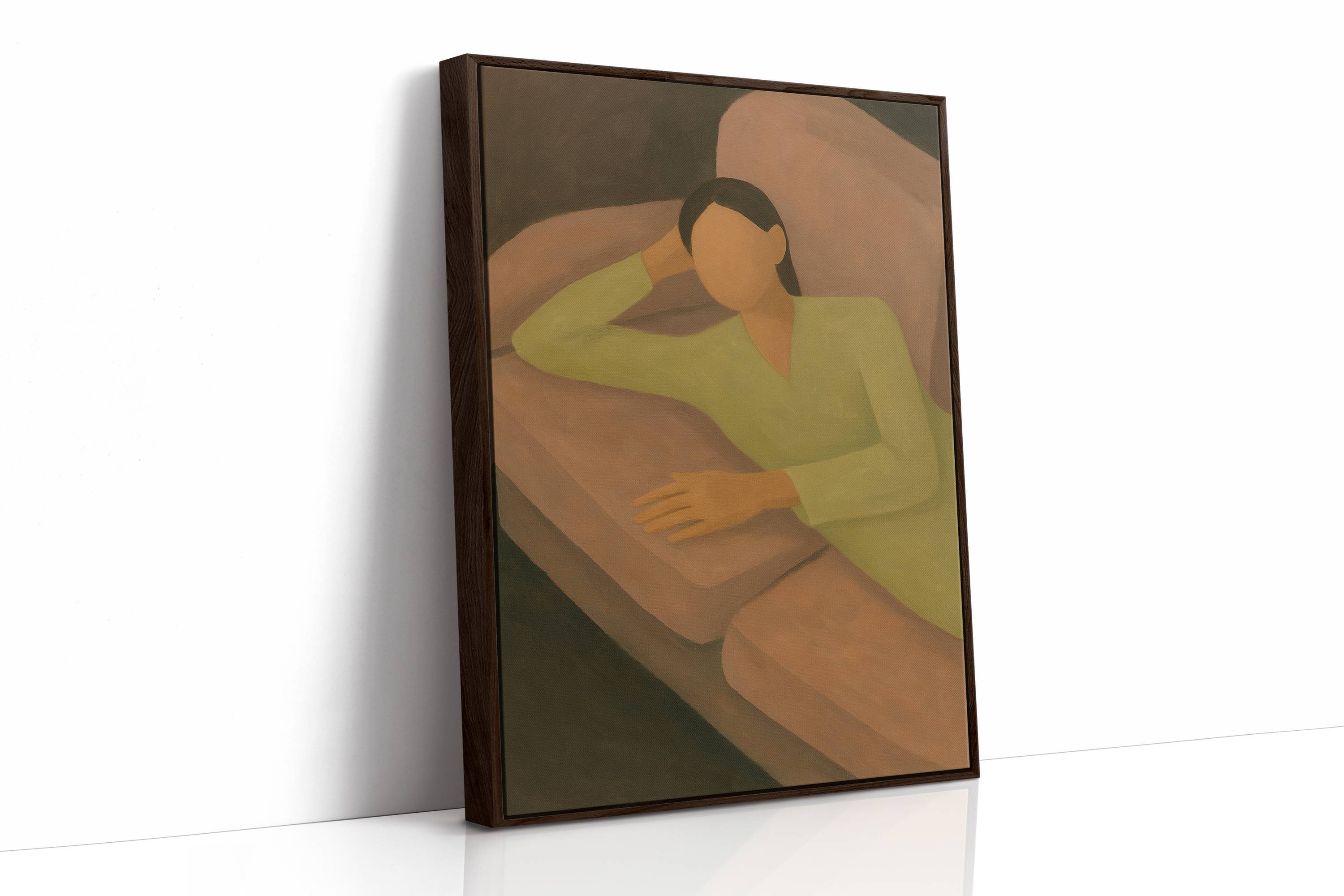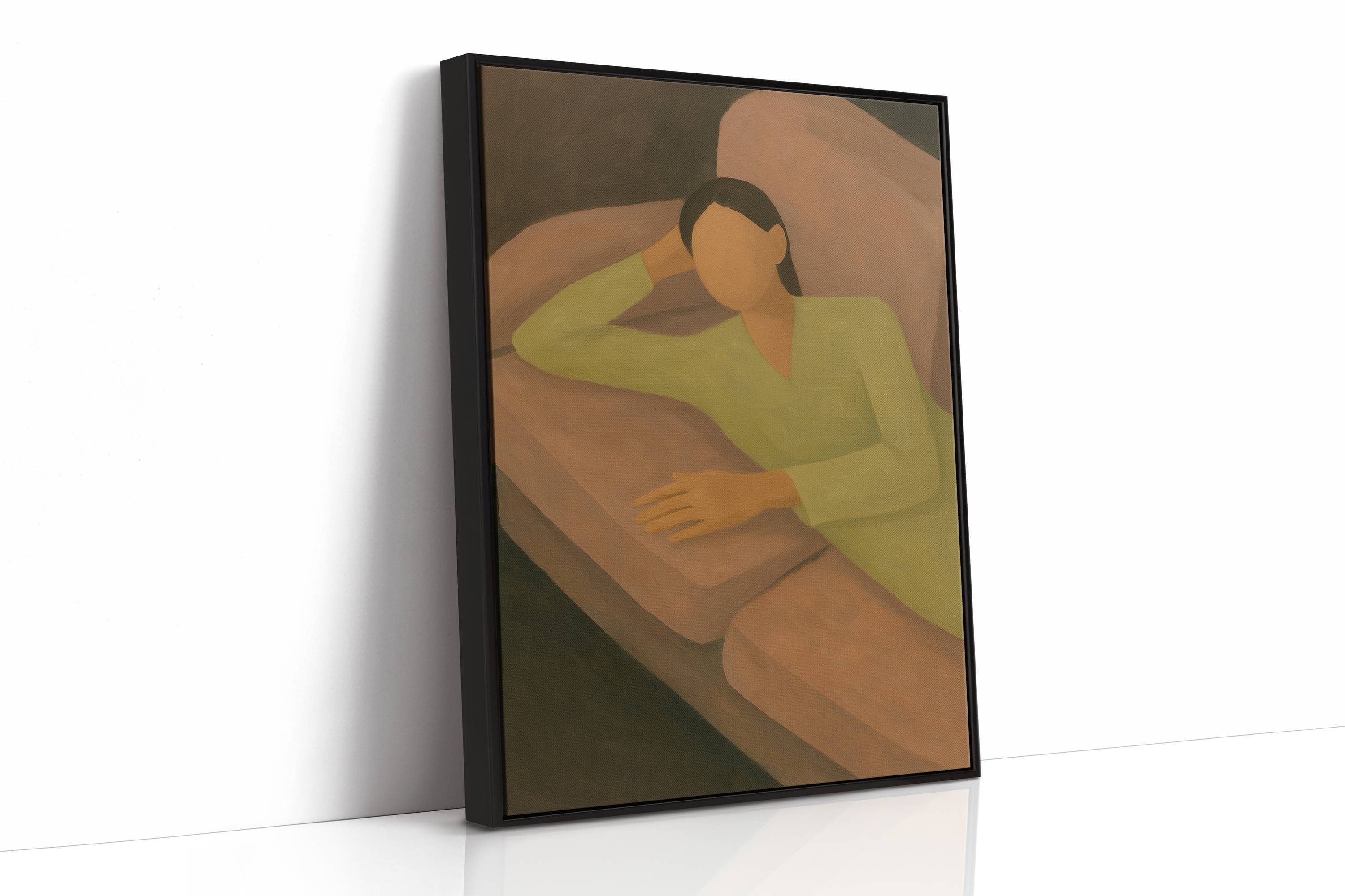 Soft earth tones blend together in a contemplative scene, where chartreuse meets terracotta in gentle harmony. The minimalist composition creates a sense of peaceful solitude, with simplified forms and subtle shadows adding depth to the contemporary narrative. The warm palette evokes the feeling of late afternoon sun filtering through windows, creating an intimate atmosphere of reflection and repose. This piece would bring a sophisticated, calming presence to a modern reading nook or meditation space.