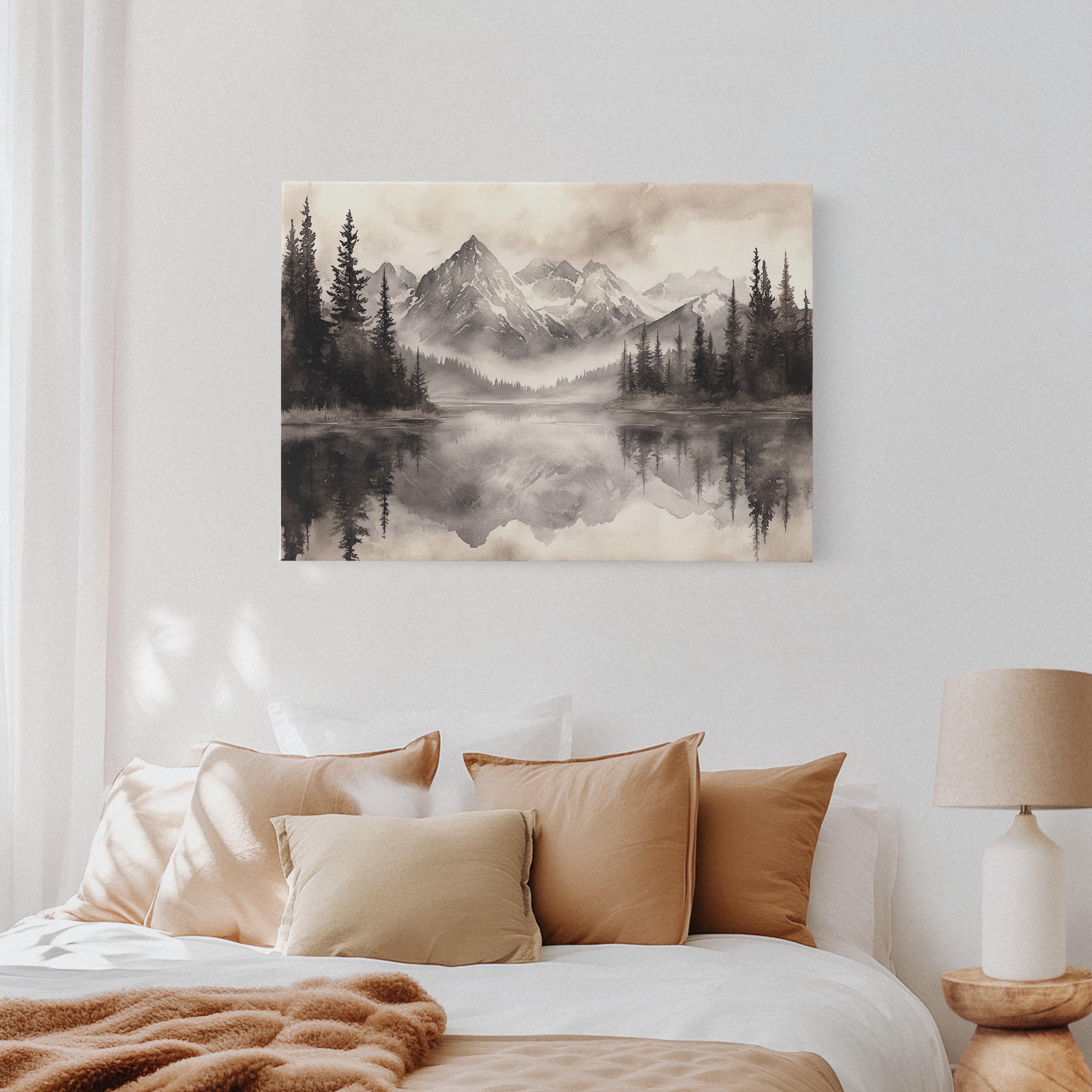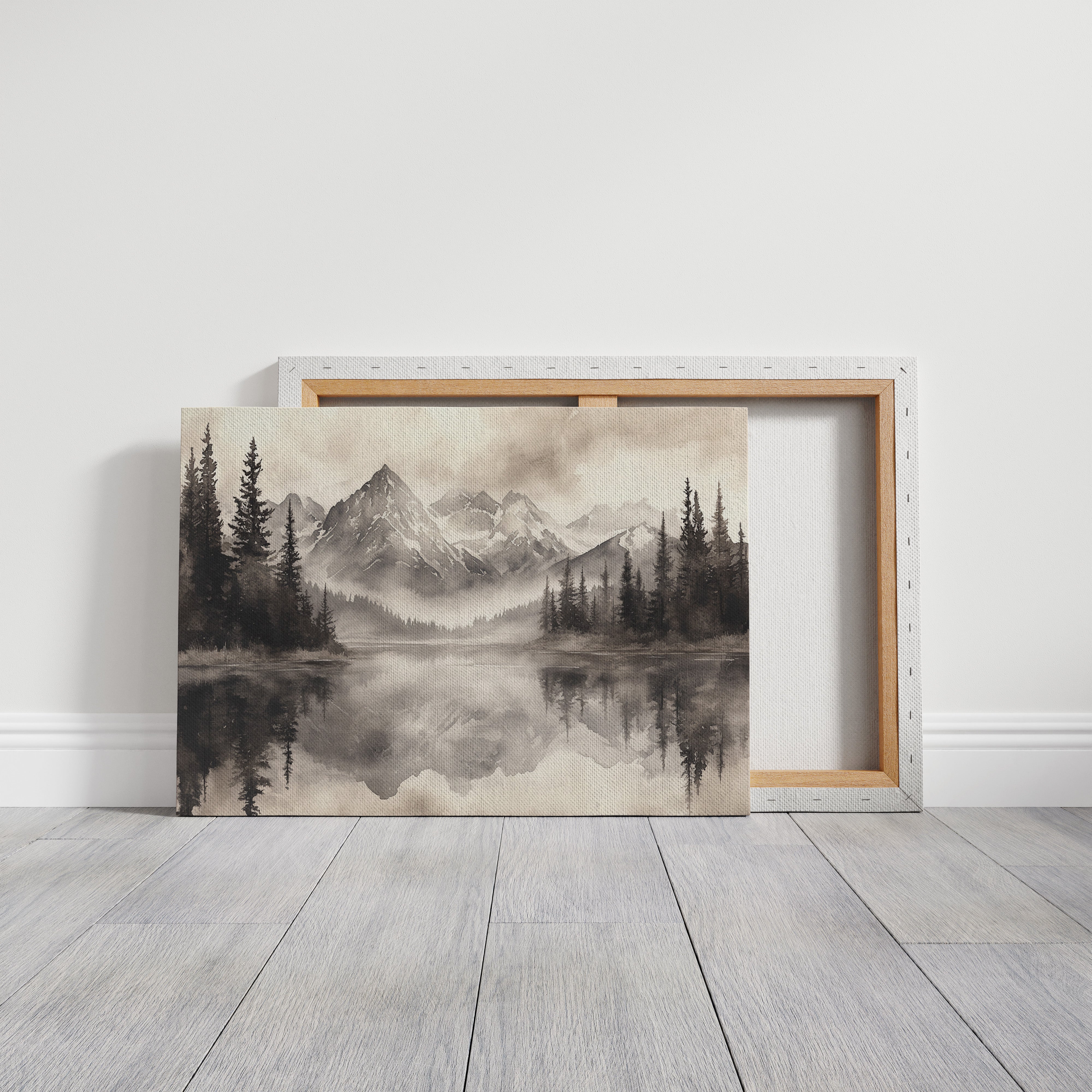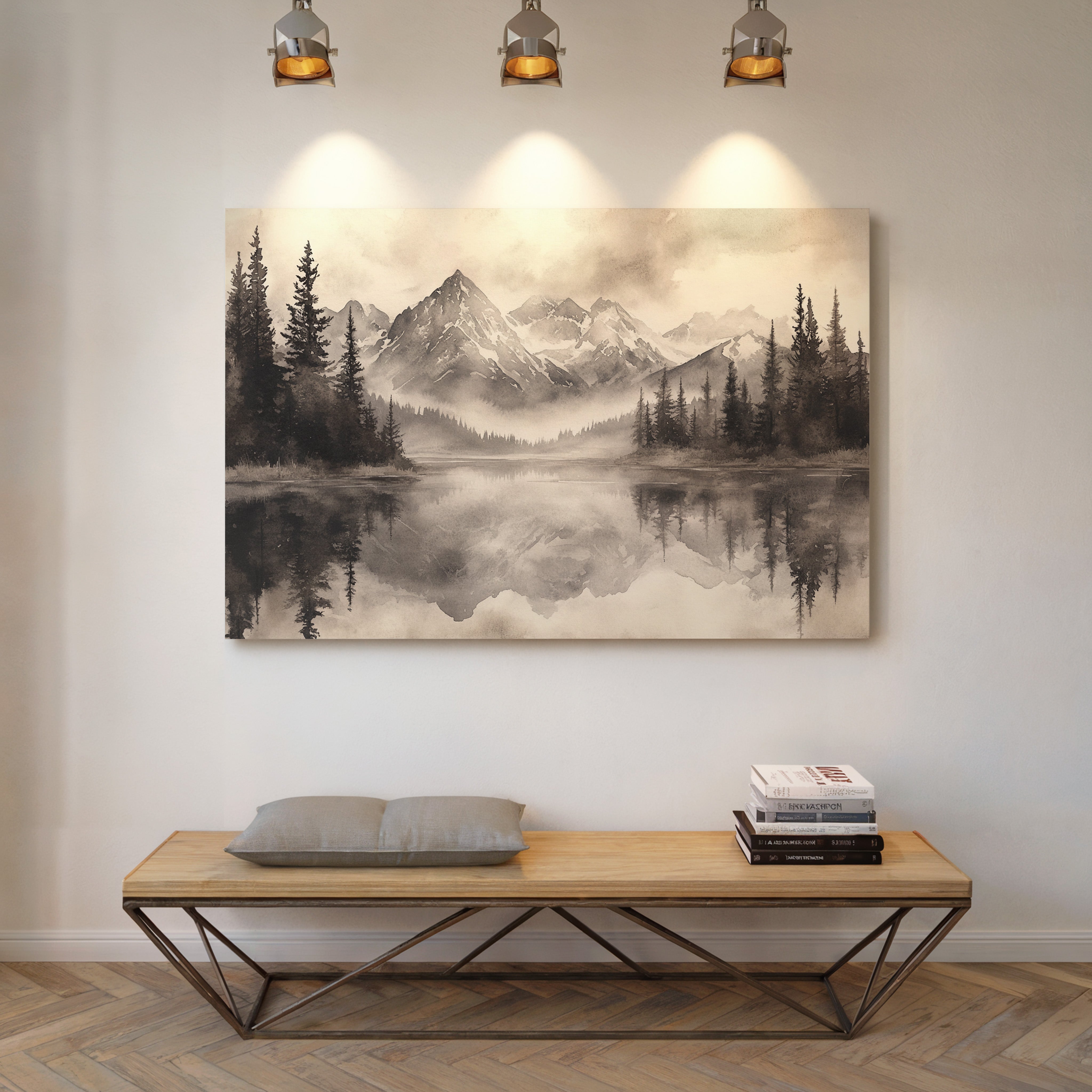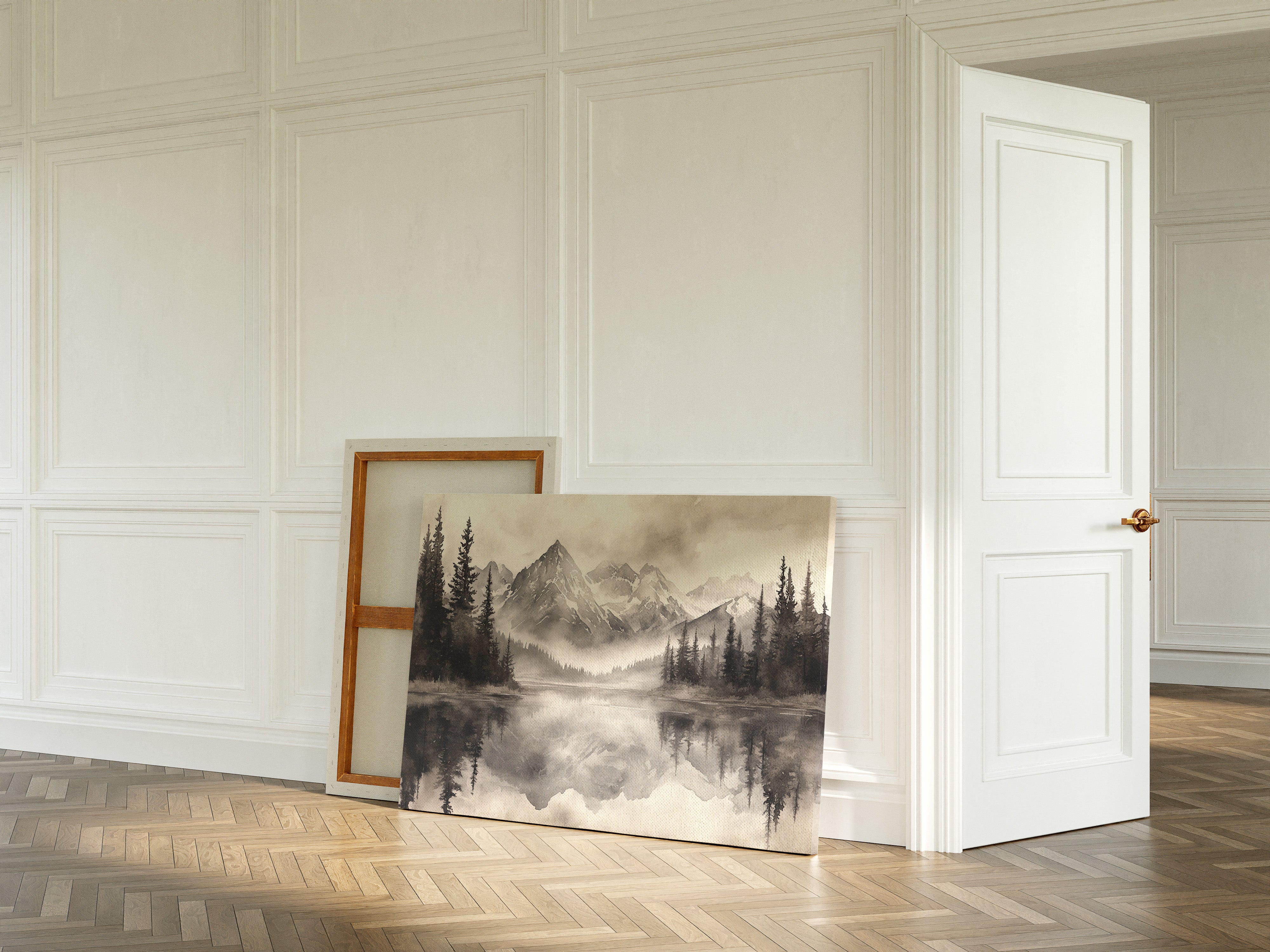 Dawn mist hovers over still waters, creating a ethereal veil between earth and sky. The monochromatic landscape captures a moment of perfect symmetry, where jagged peaks mirror themselves in the glassy lake surface. Evergreen sentinels stand guard along the shoreline, their dark silhouettes providing dramatic contrast against the soft, misty atmosphere that embraces the mountain range. This contemplative scene speaks to the timeless dialogue between wilderness and water, peaks and reflection. Perfect for a master bedroom or meditation space where its serene energy can inspire moments of quiet reflection.