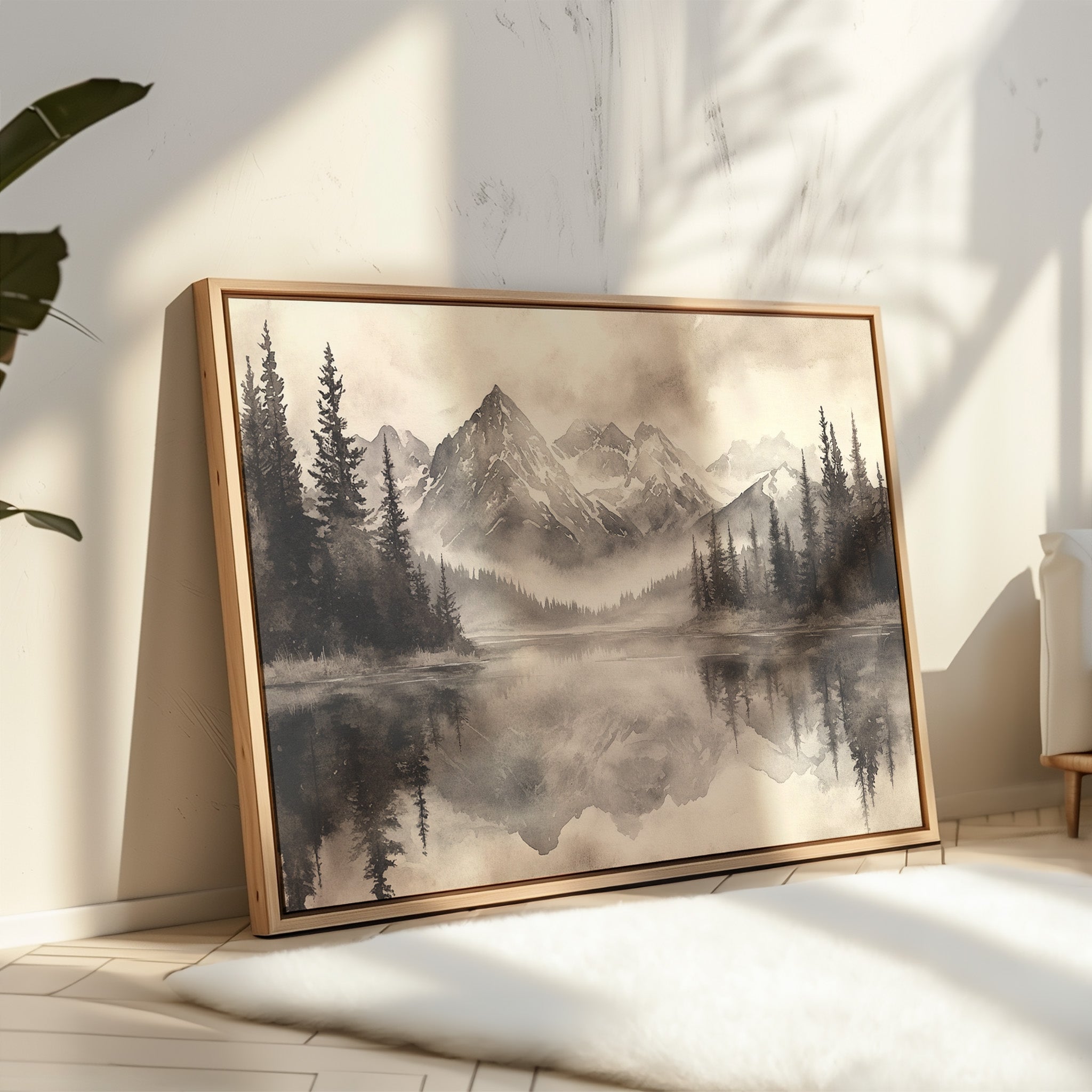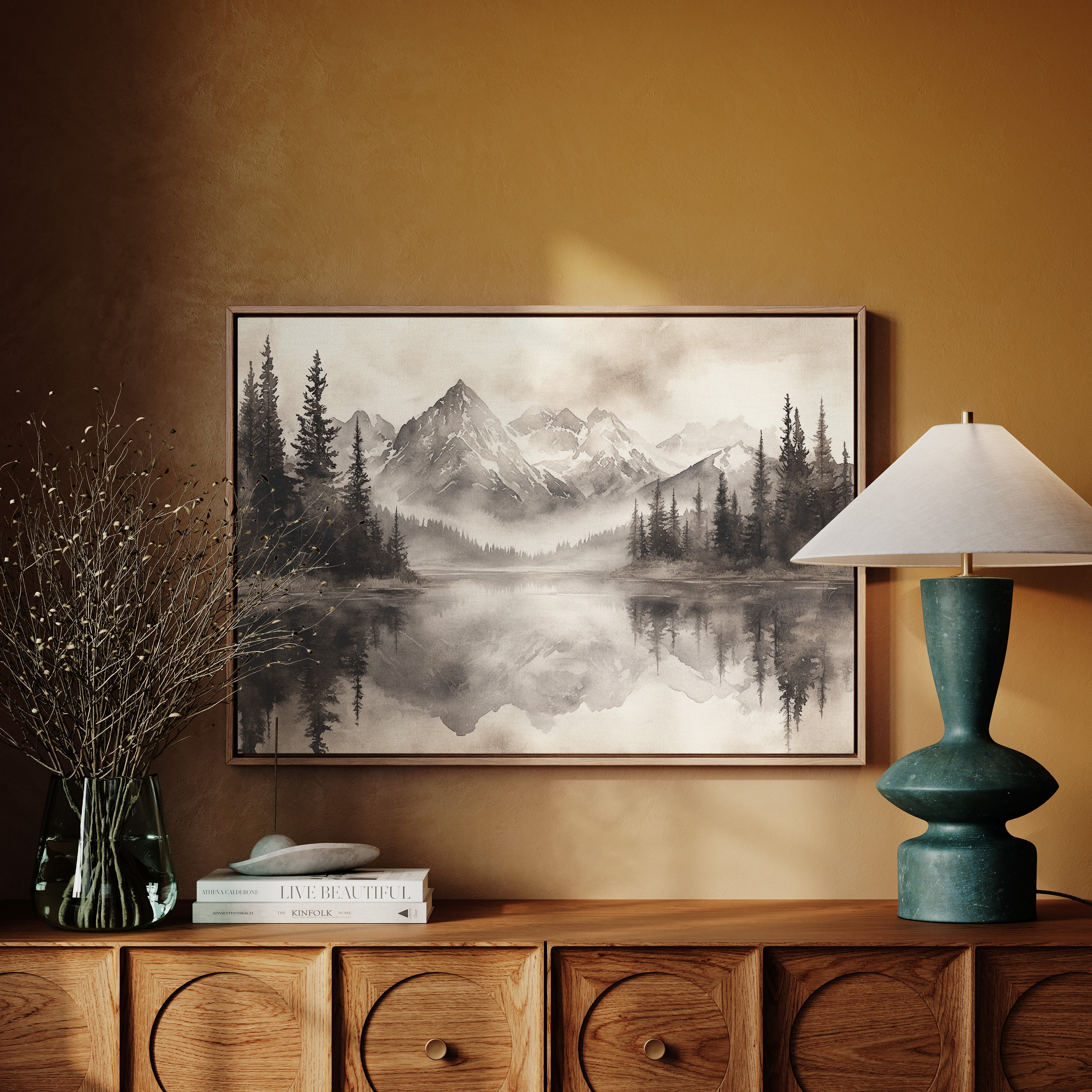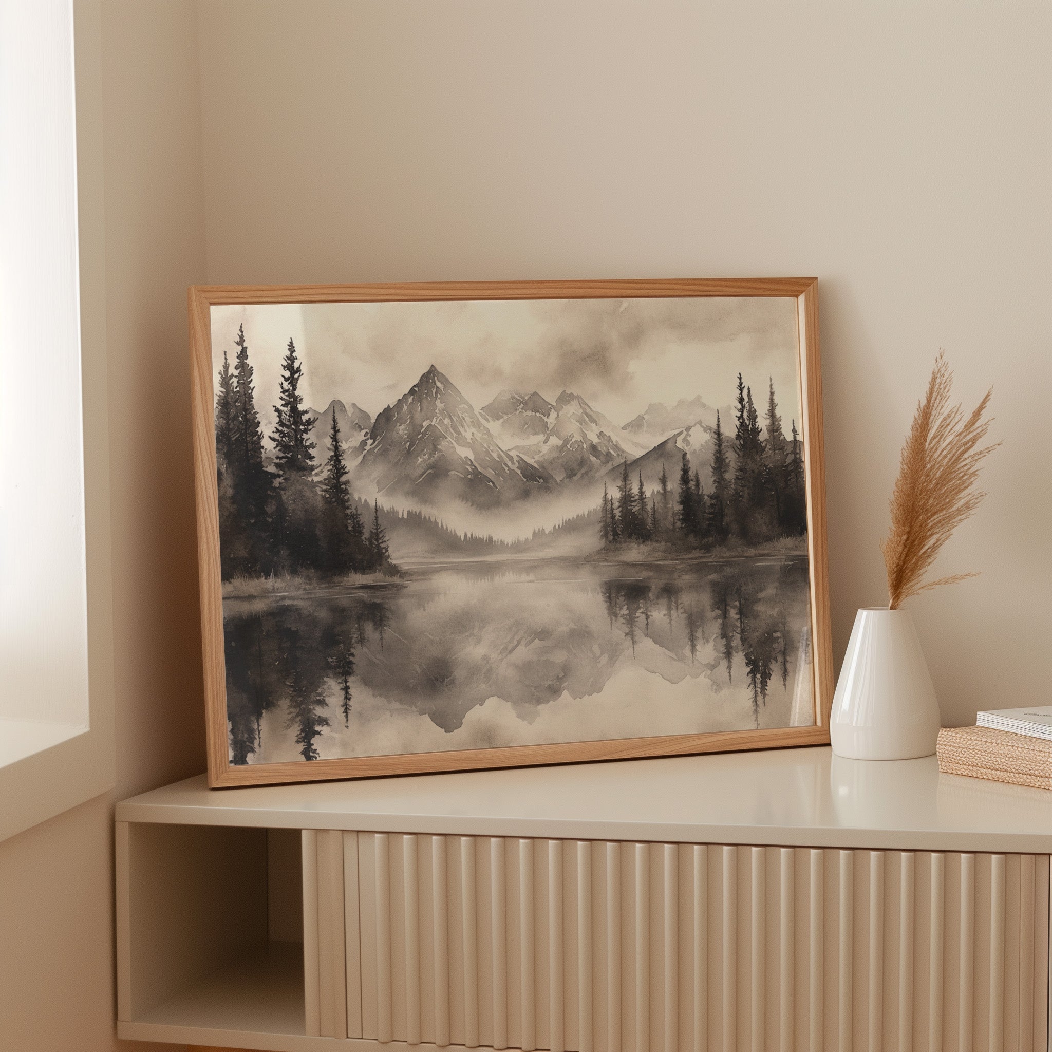 Dawn mist hovers over still waters, creating a ethereal veil between earth and sky. The monochromatic landscape captures a moment of perfect symmetry, where jagged peaks mirror themselves in the glassy lake surface. Evergreen sentinels stand guard along the shoreline, their dark silhouettes providing dramatic contrast against the soft, misty atmosphere that embraces the mountain range. This contemplative scene speaks to the timeless dialogue between wilderness and water, peaks and reflection. Perfect for a master bedroom or meditation space where its serene energy can inspire moments of quiet reflection.