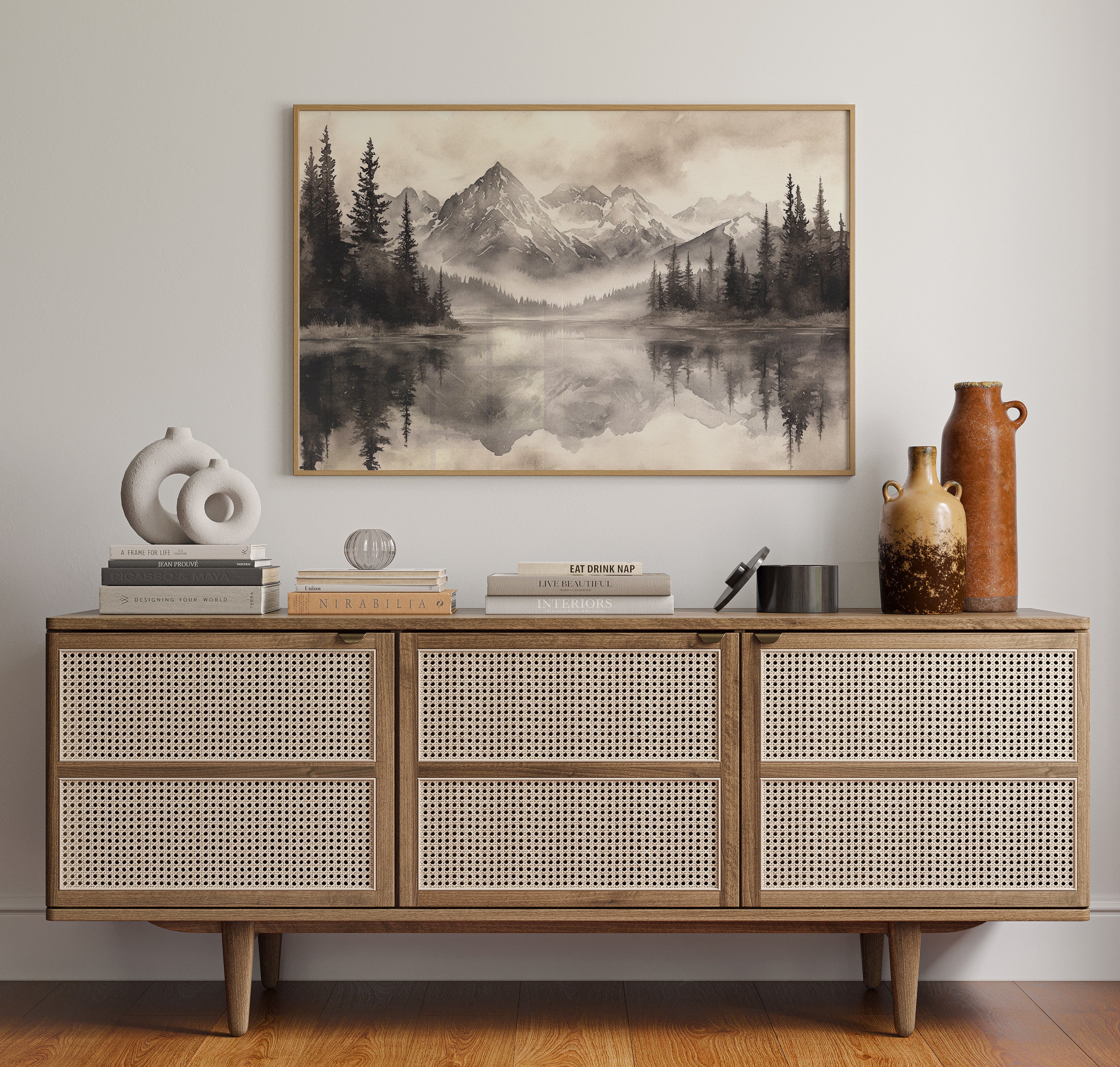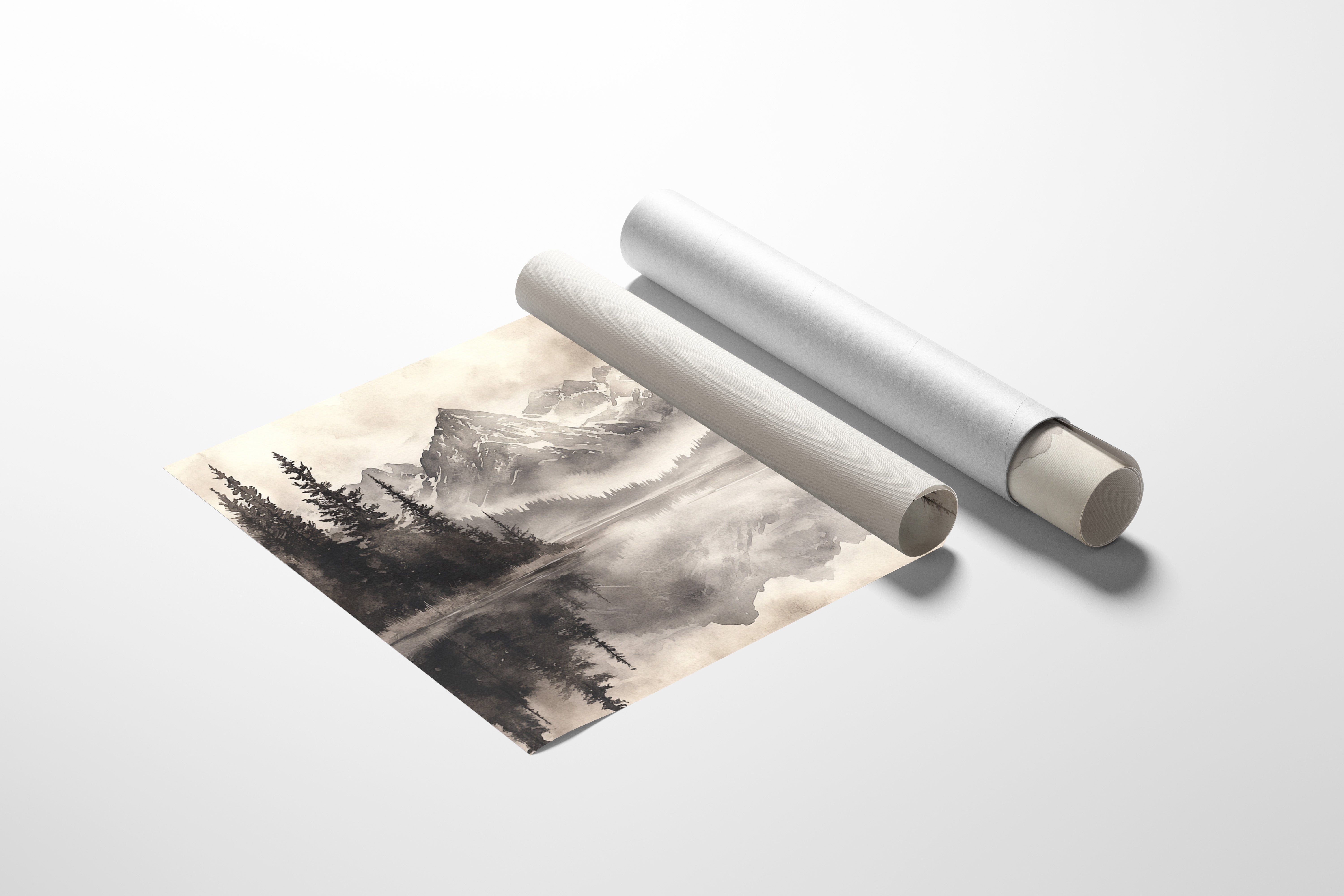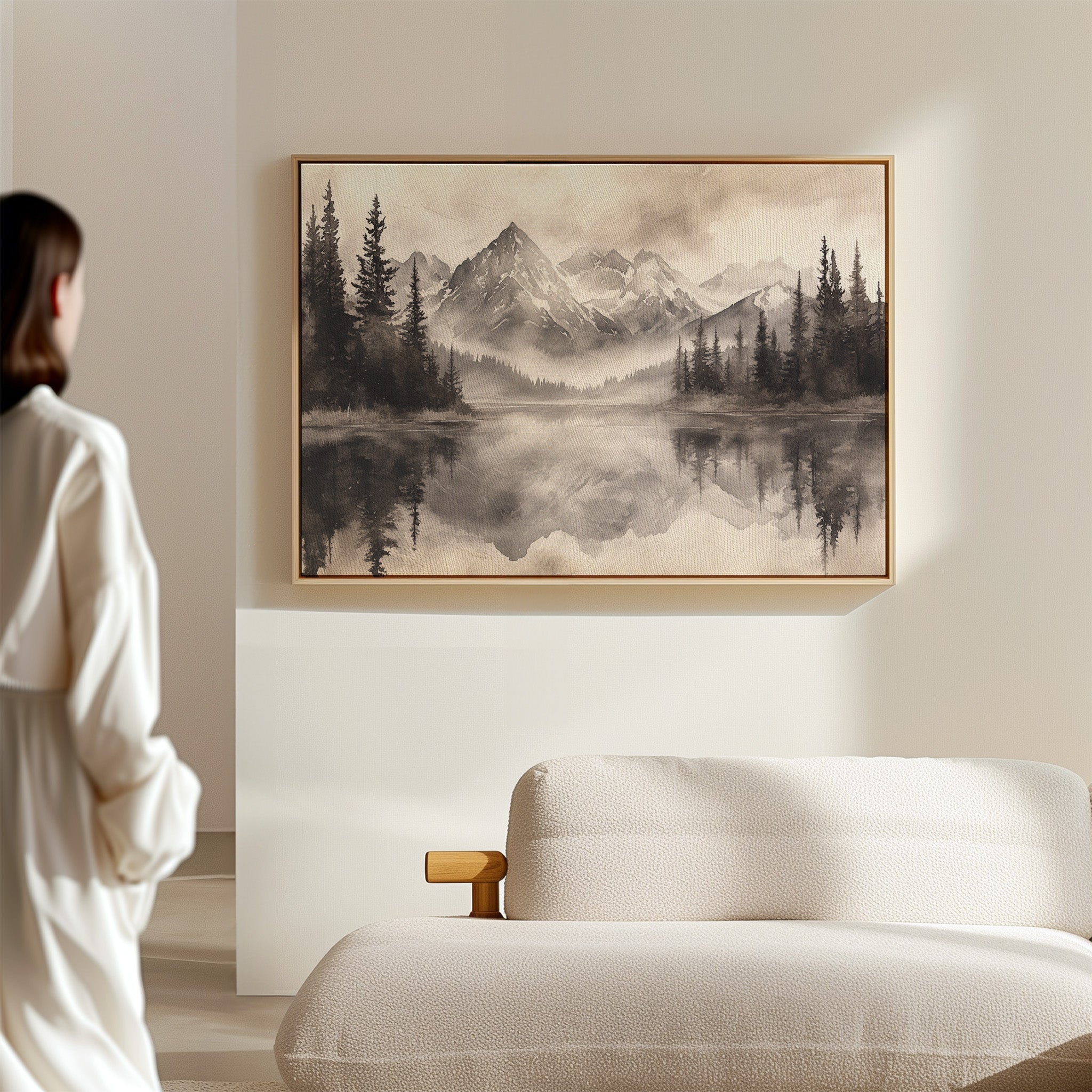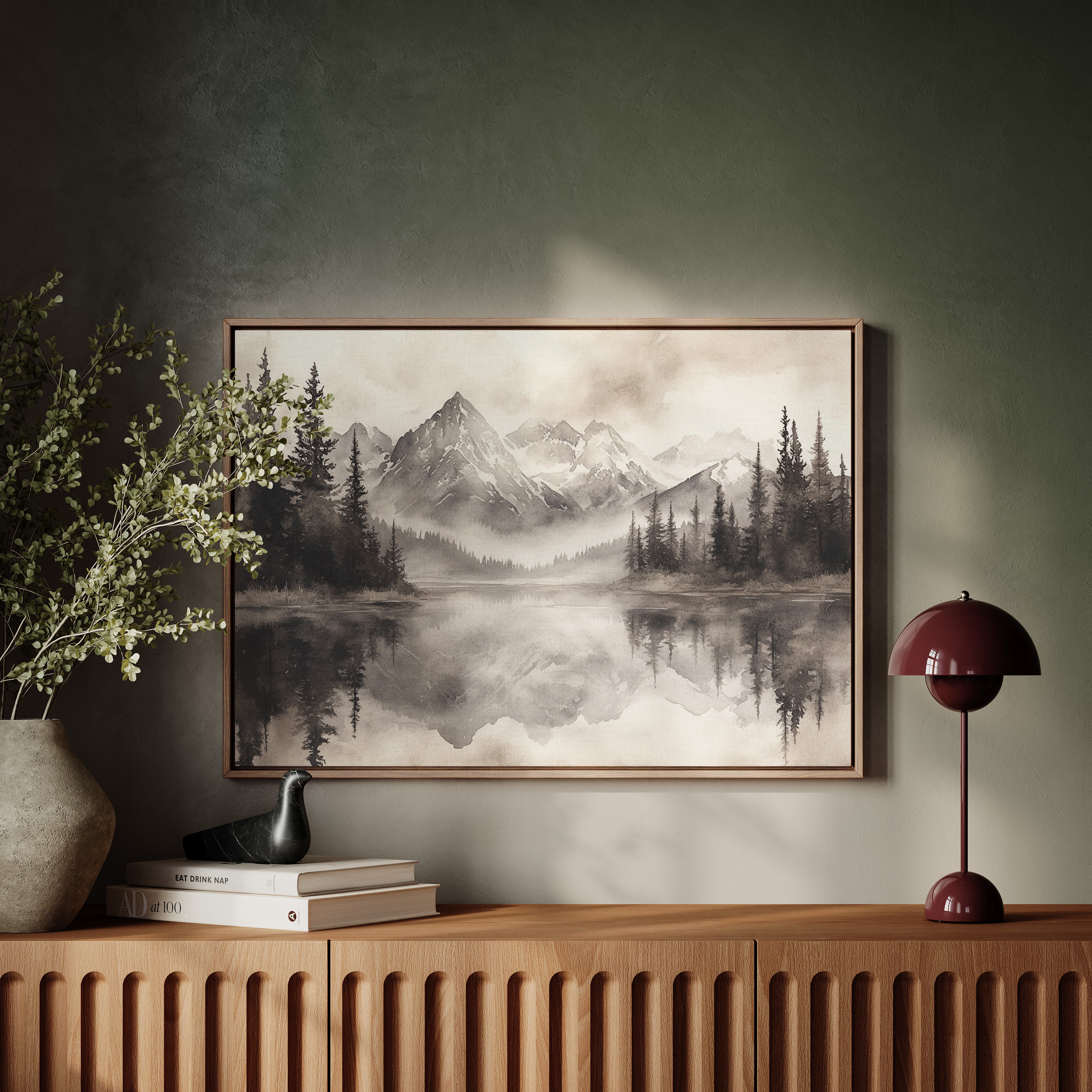 Dawn mist hovers over still waters, creating a ethereal veil between earth and sky. The monochromatic landscape captures a moment of perfect symmetry, where jagged peaks mirror themselves in the glassy lake surface. Evergreen sentinels stand guard along the shoreline, their dark silhouettes providing dramatic contrast against the soft, misty atmosphere that embraces the mountain range. This contemplative scene speaks to the timeless dialogue between wilderness and water, peaks and reflection. Perfect for a master bedroom or meditation space where its serene energy can inspire moments of quiet reflection.