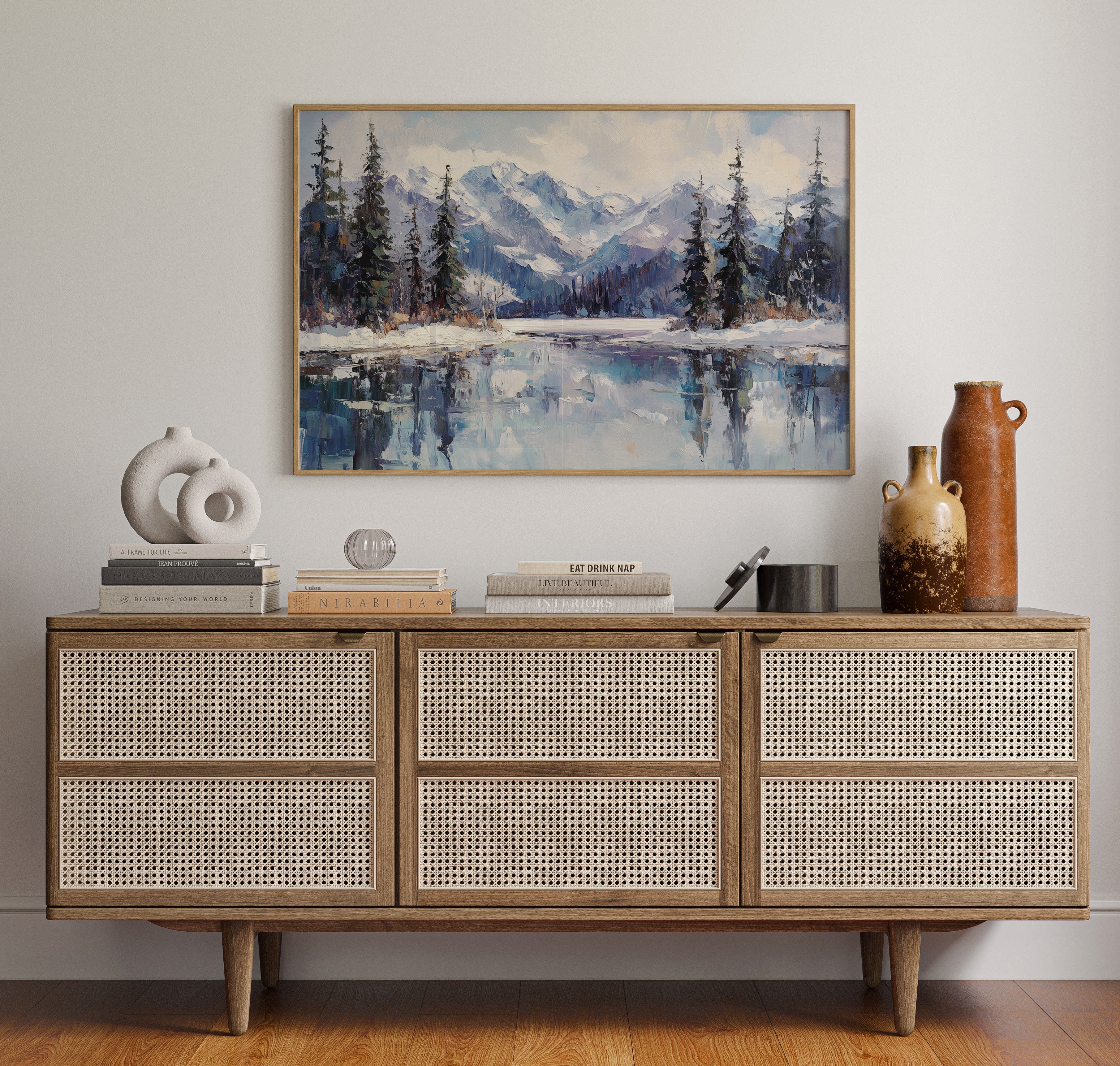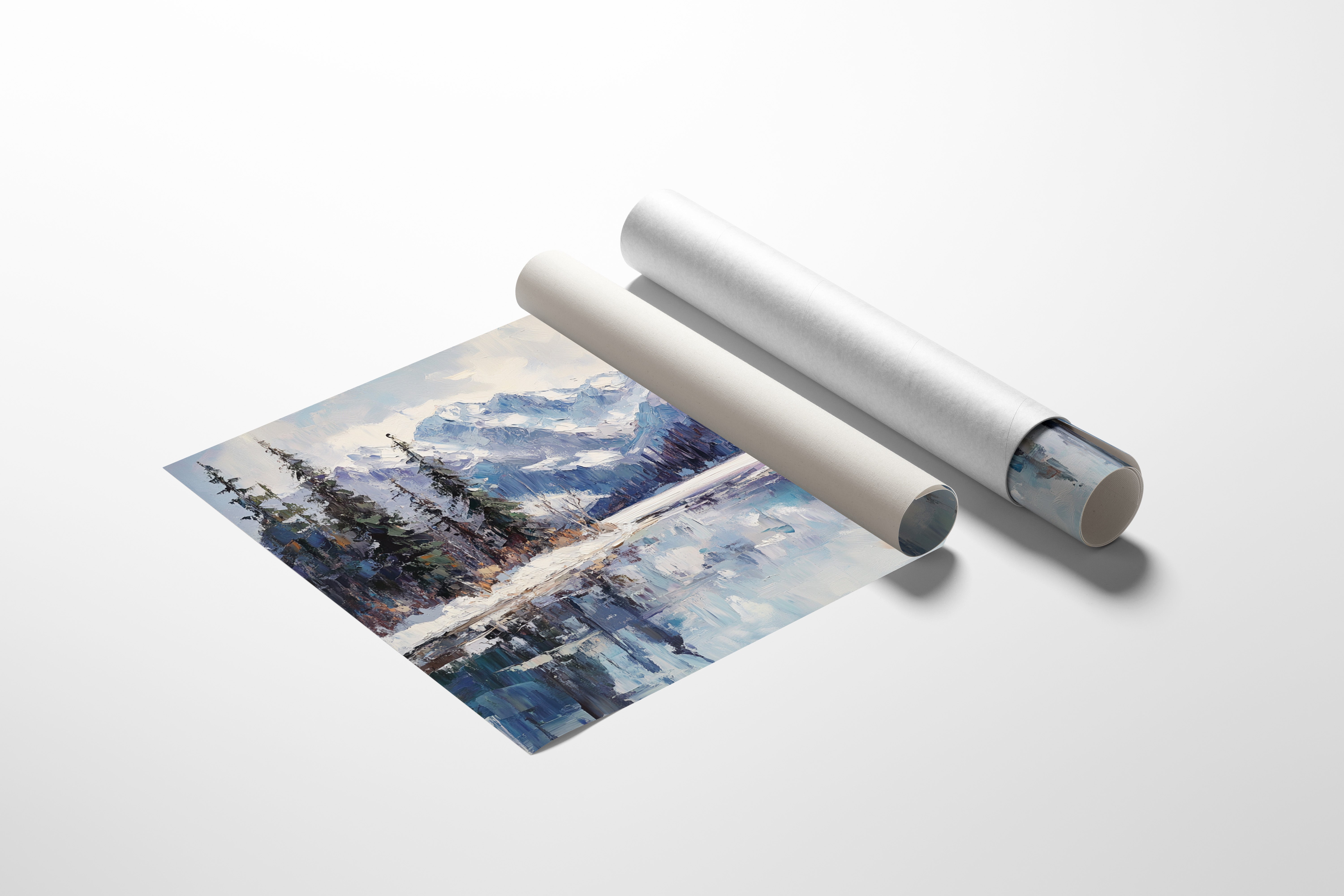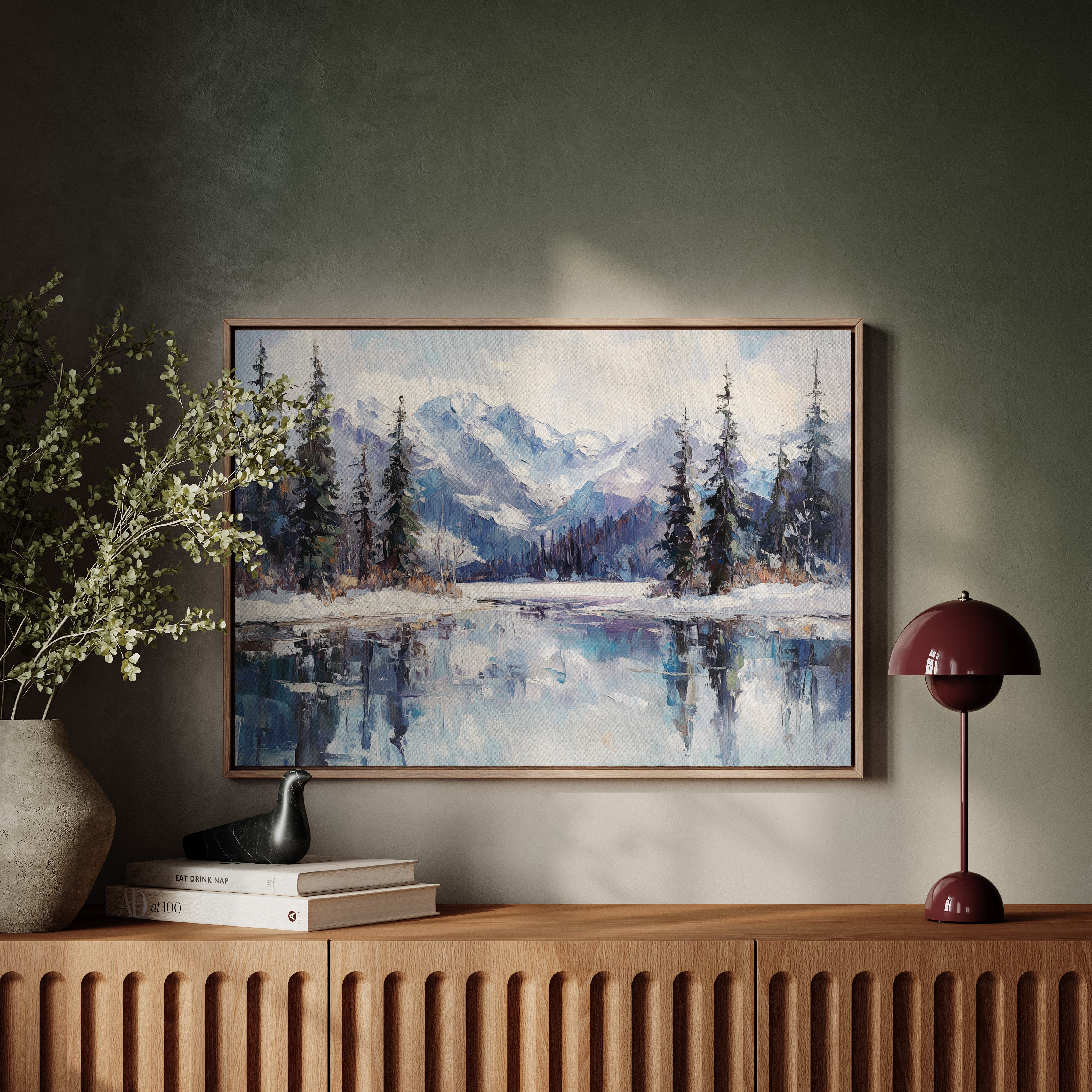 Crystalline waters hold perfect reflections of snow-capped peaks, creating a mirror world where sky meets earth. The rugged mountain range stands sentinel, draped in winter white, while evergreen sentinels frame the scene in deep forest green. Bold brushstrokes capture the raw beauty of nature's palette - rich blues, crisp whites, and subtle purples dancing across both water and sky. This peaceful alpine moment speaks to the quiet majesty of wilderness untouched.