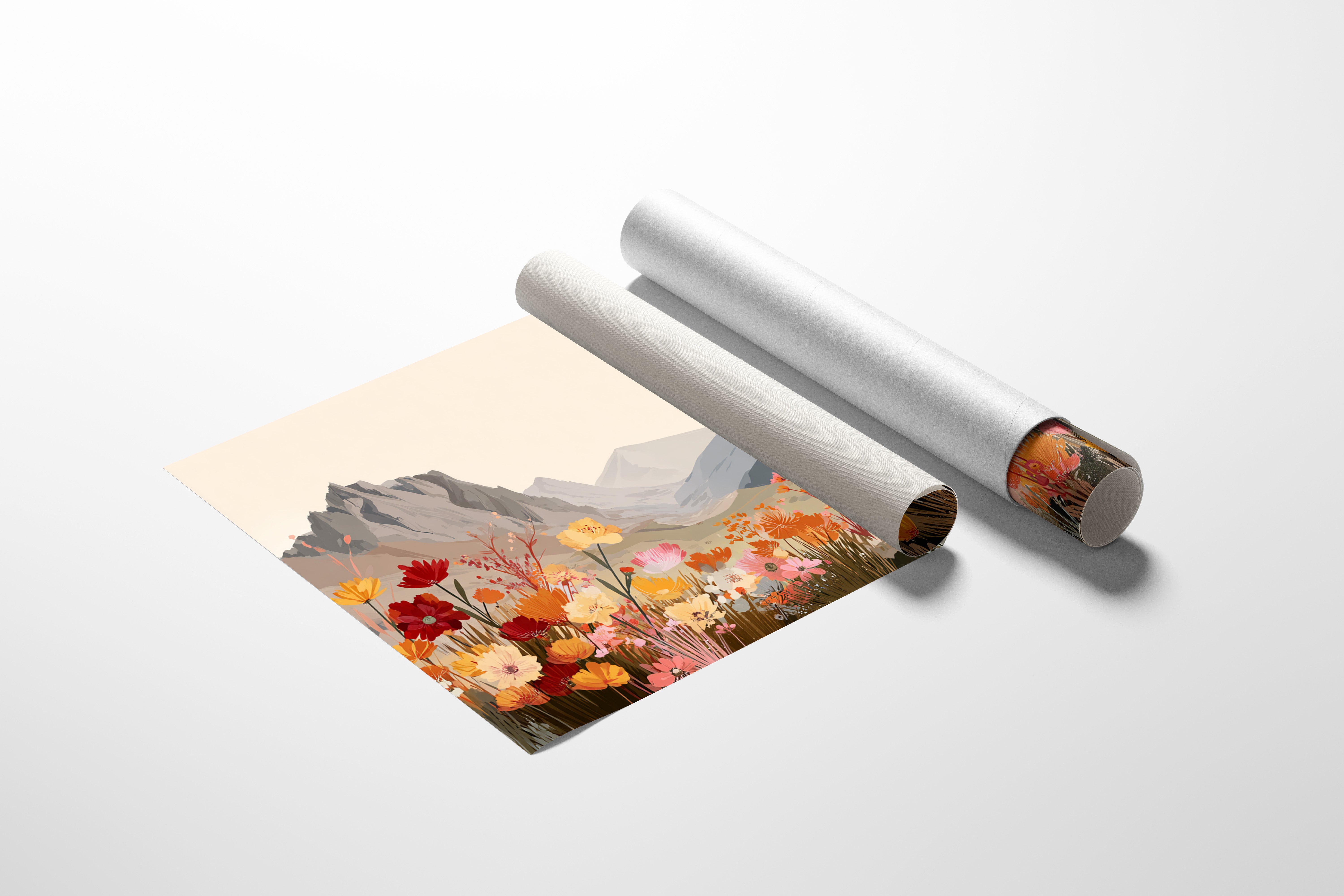 Delicate wildflowers dance against rugged mountain peaks, creating a stunning contrast of soft and strong. The palette unfolds like a dreamy sunrise - coral poppies, blush cosmos, and golden blooms paint the foreground in warm, inviting hues. Jagged granite peaks rise majestically behind the floral display, their cool grey tones perfectly balancing the warm meadow below. This piece brings the serenity of a high-altitude summer morning into any space. Perfect for creating a focal point in living areas or bedrooms where its gentle energy can inspire both calm and creativity.
