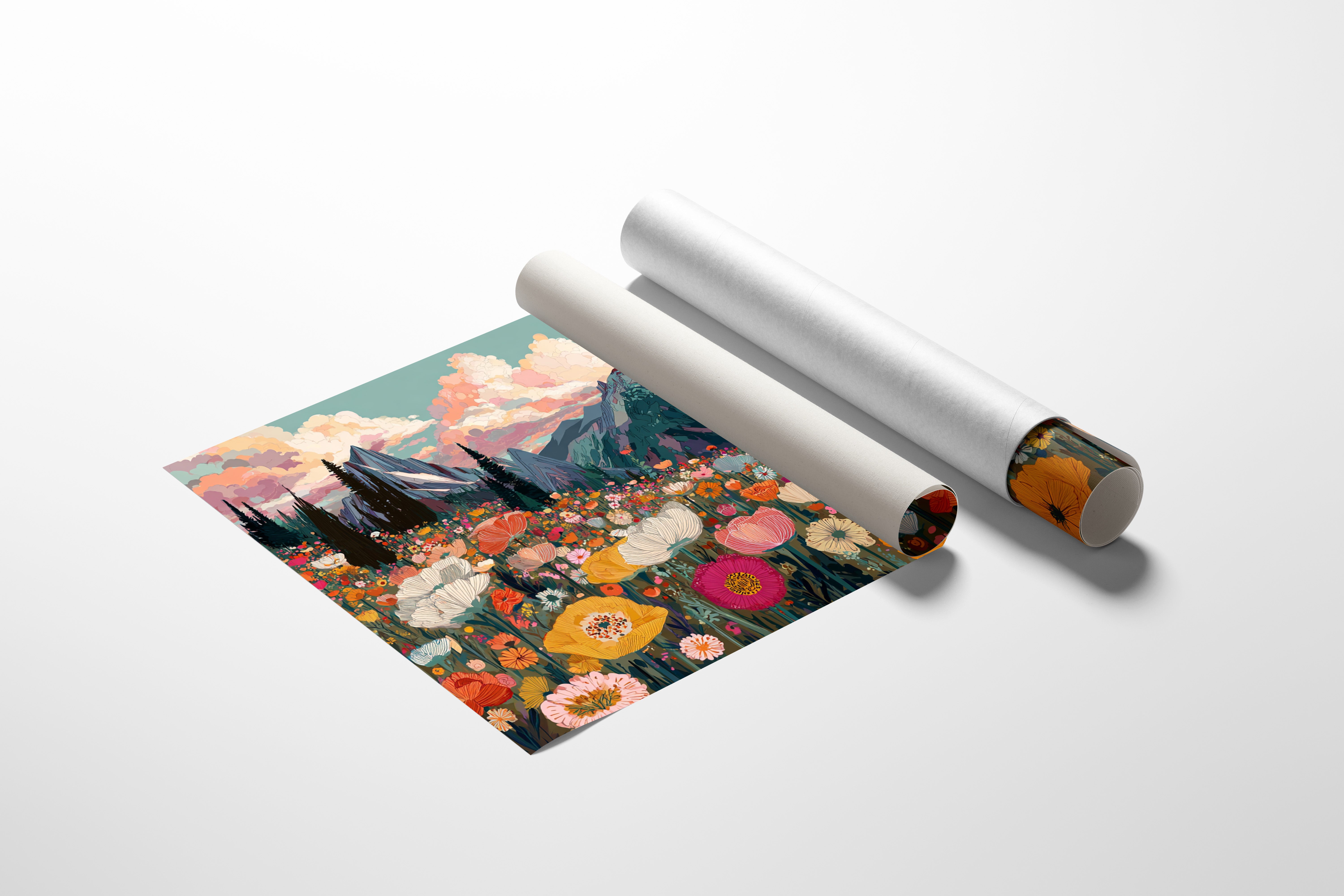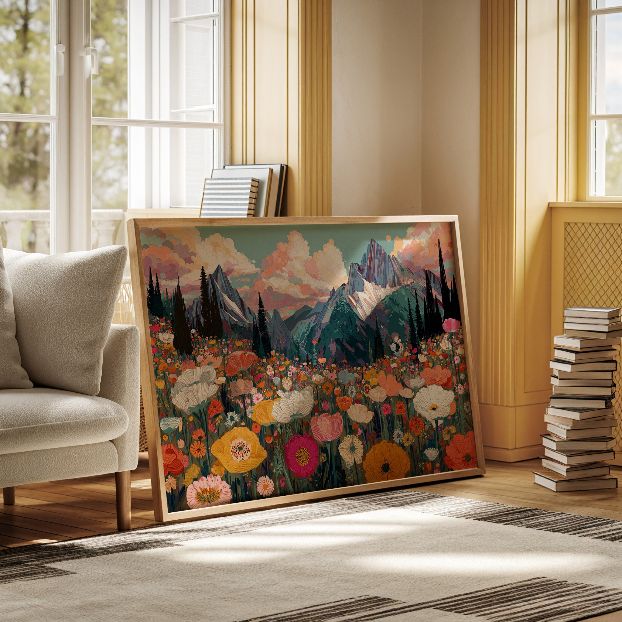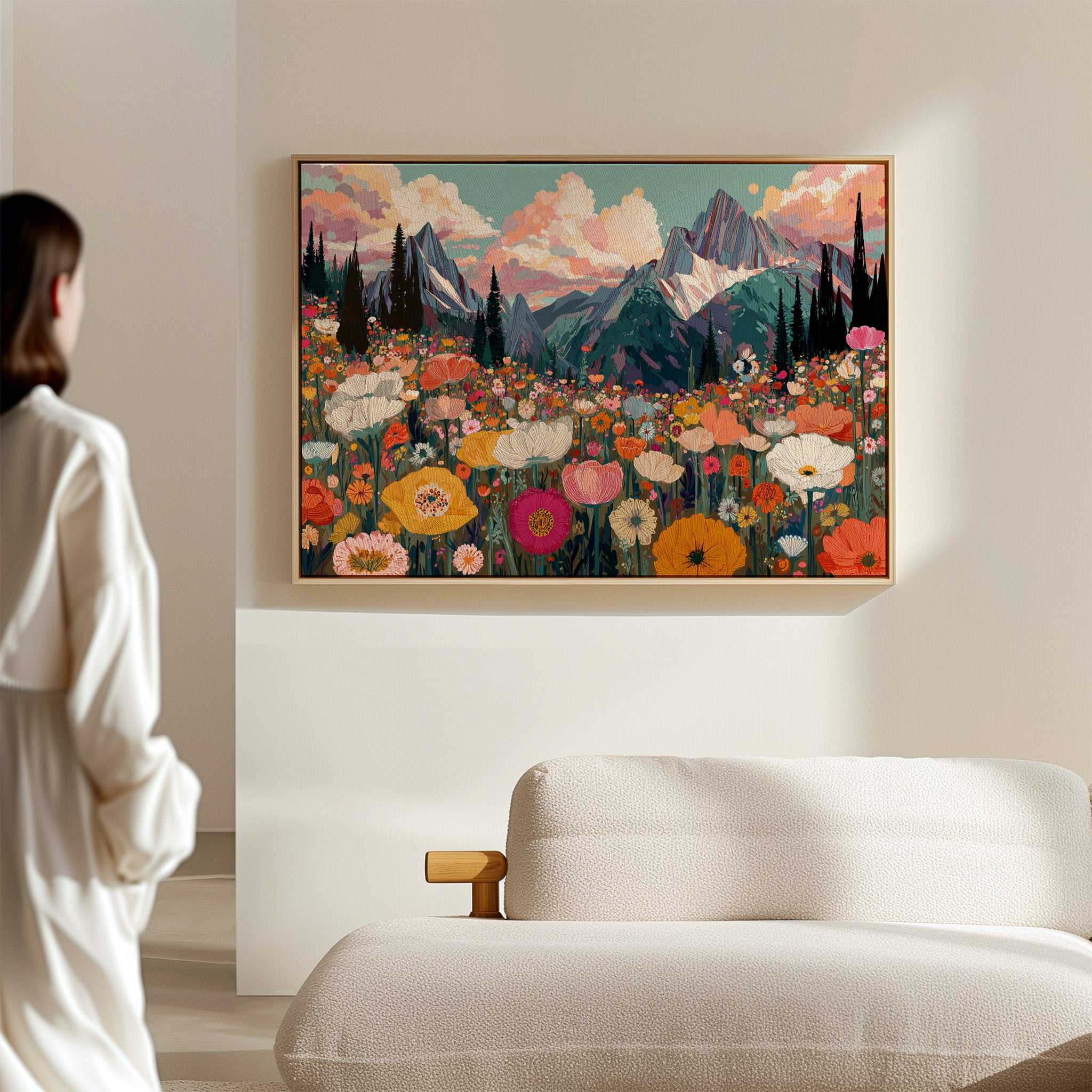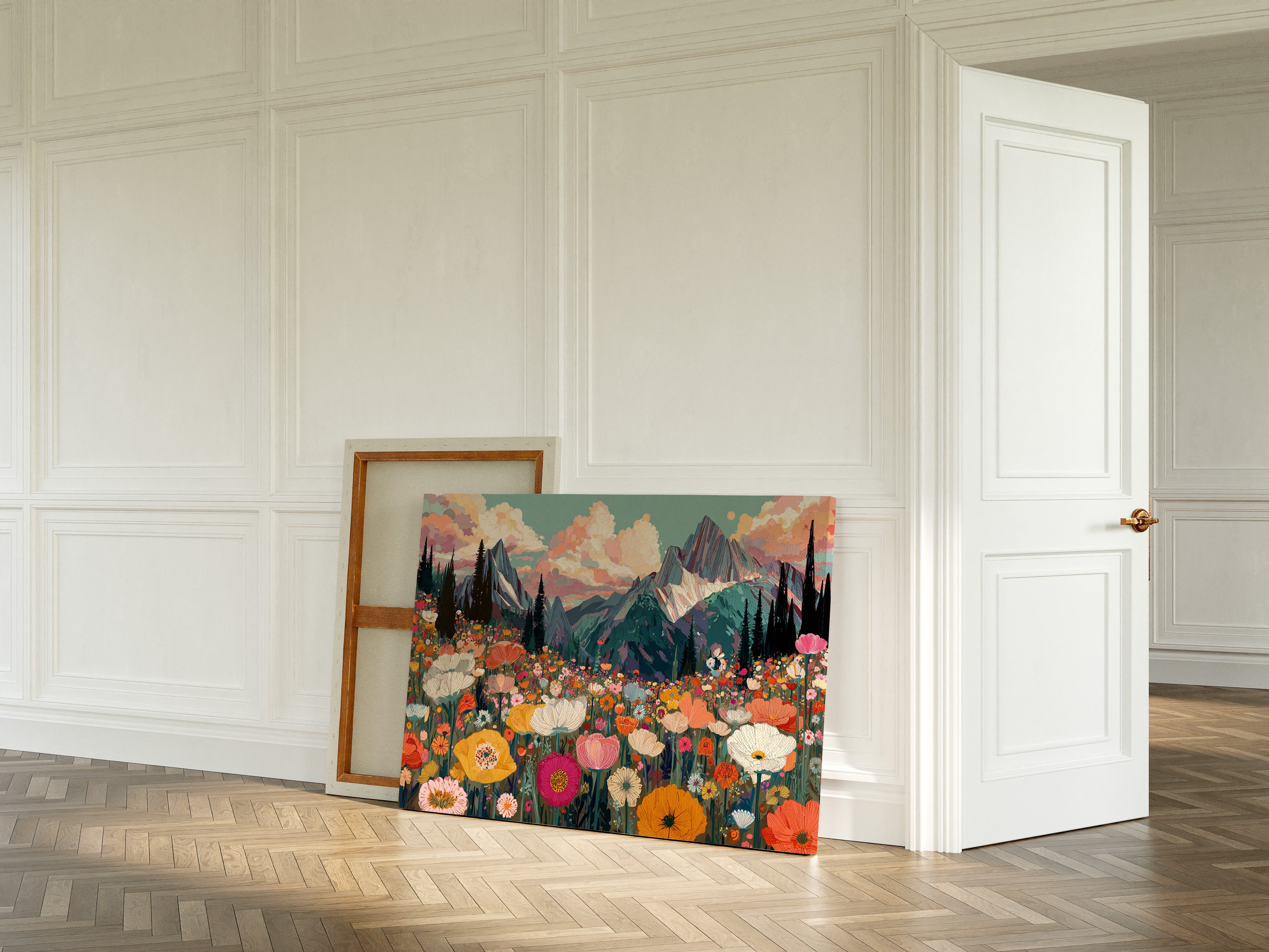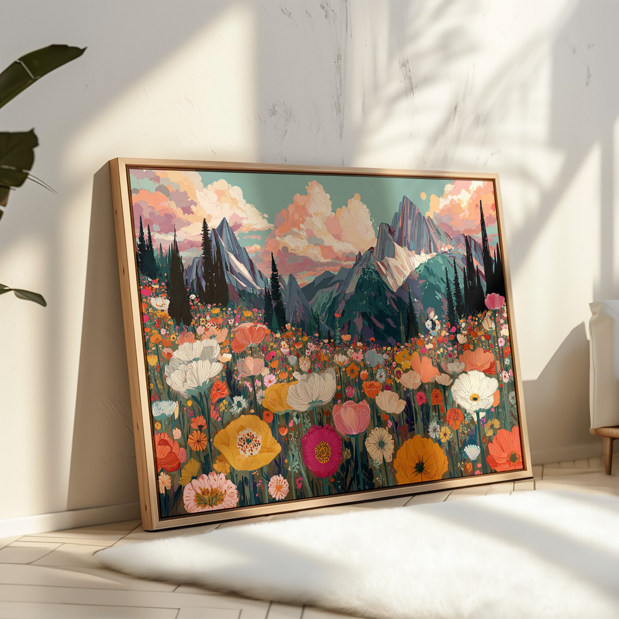 A vibrant wildflower meadow stretches toward jagged mountain peaks, creating a symphony of coral, white, and golden blooms against the dramatic backdrop. The scene captures the fleeting magic of summer in the high country, where delicate poppies and cosmos dance in mountain breezes beneath cotton-candy clouds. Rich emerald evergreens stand sentinel along the slopes, while the rugged peaks wear their snow-touched crowns against a turquoise sky painted with sunset's warmth. This piece brings the majesty of mountain wilderness into any space, perfect for creating a focal point in rooms seeking to capture nature's grand romance.
