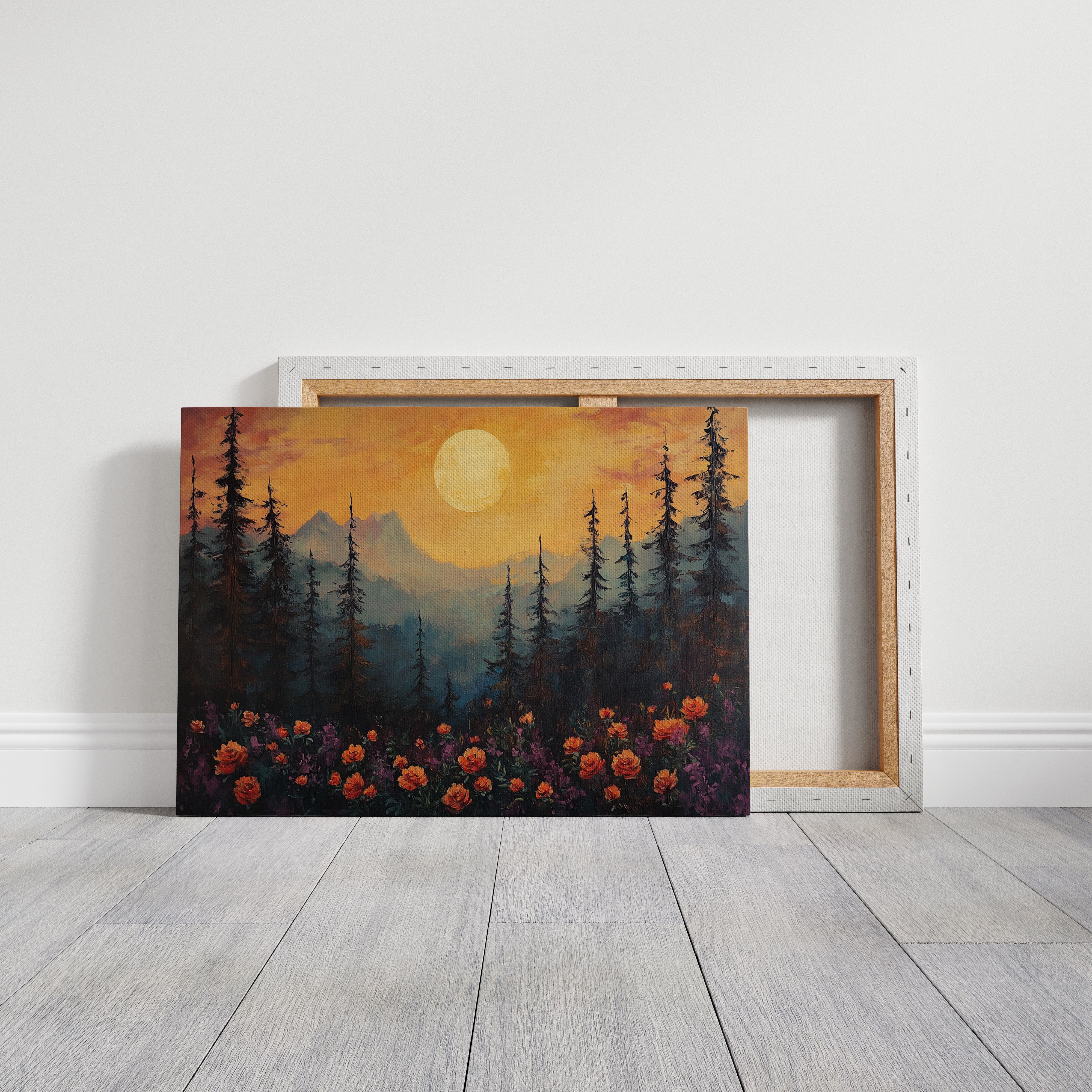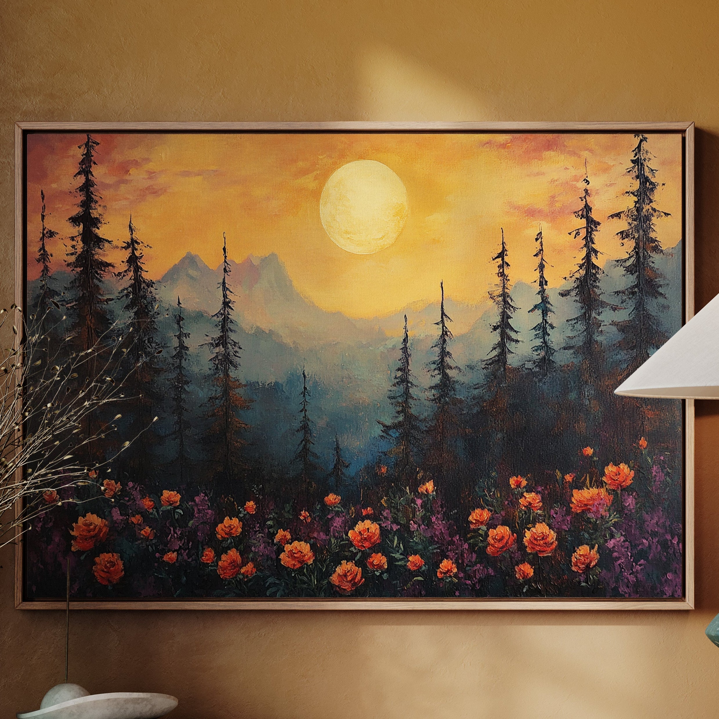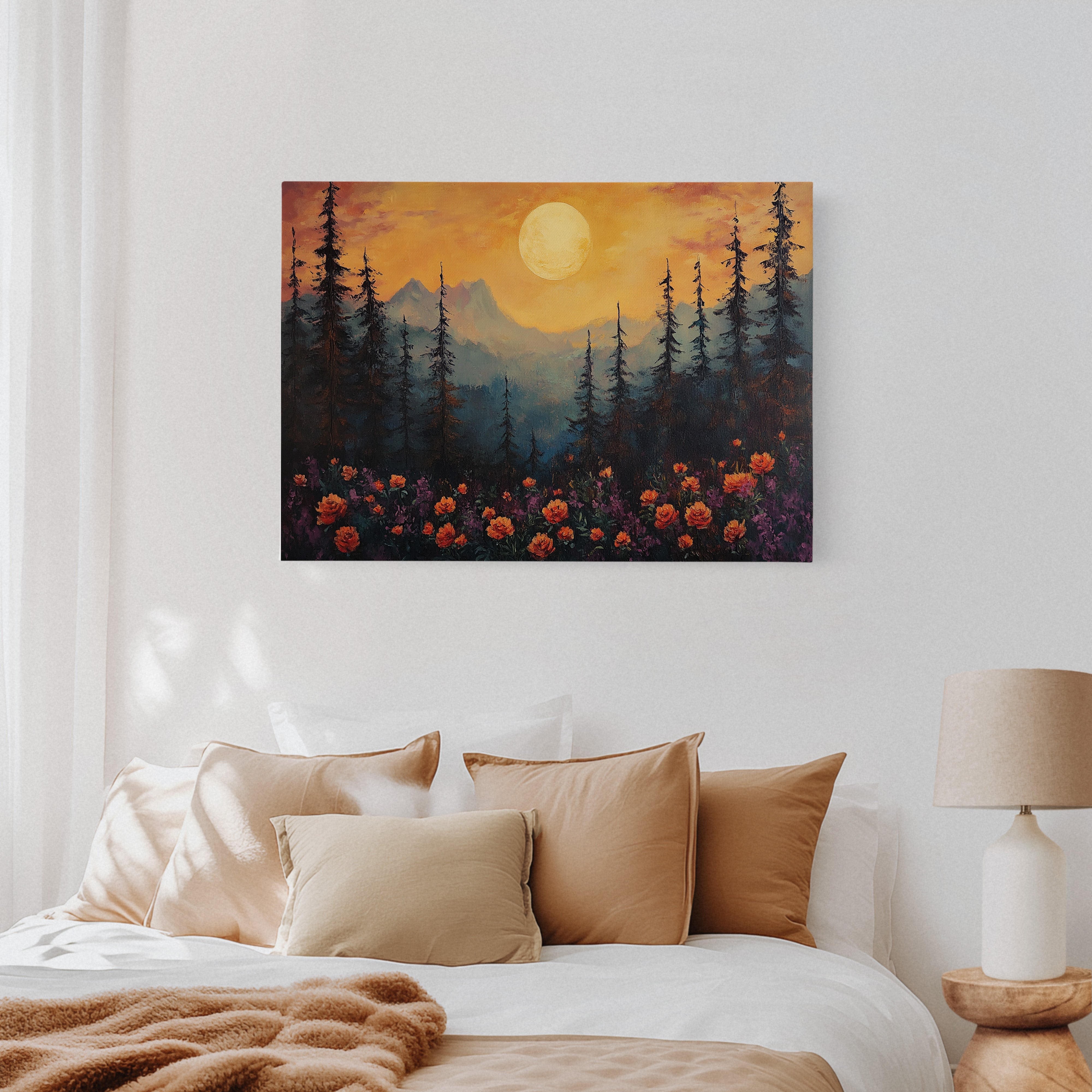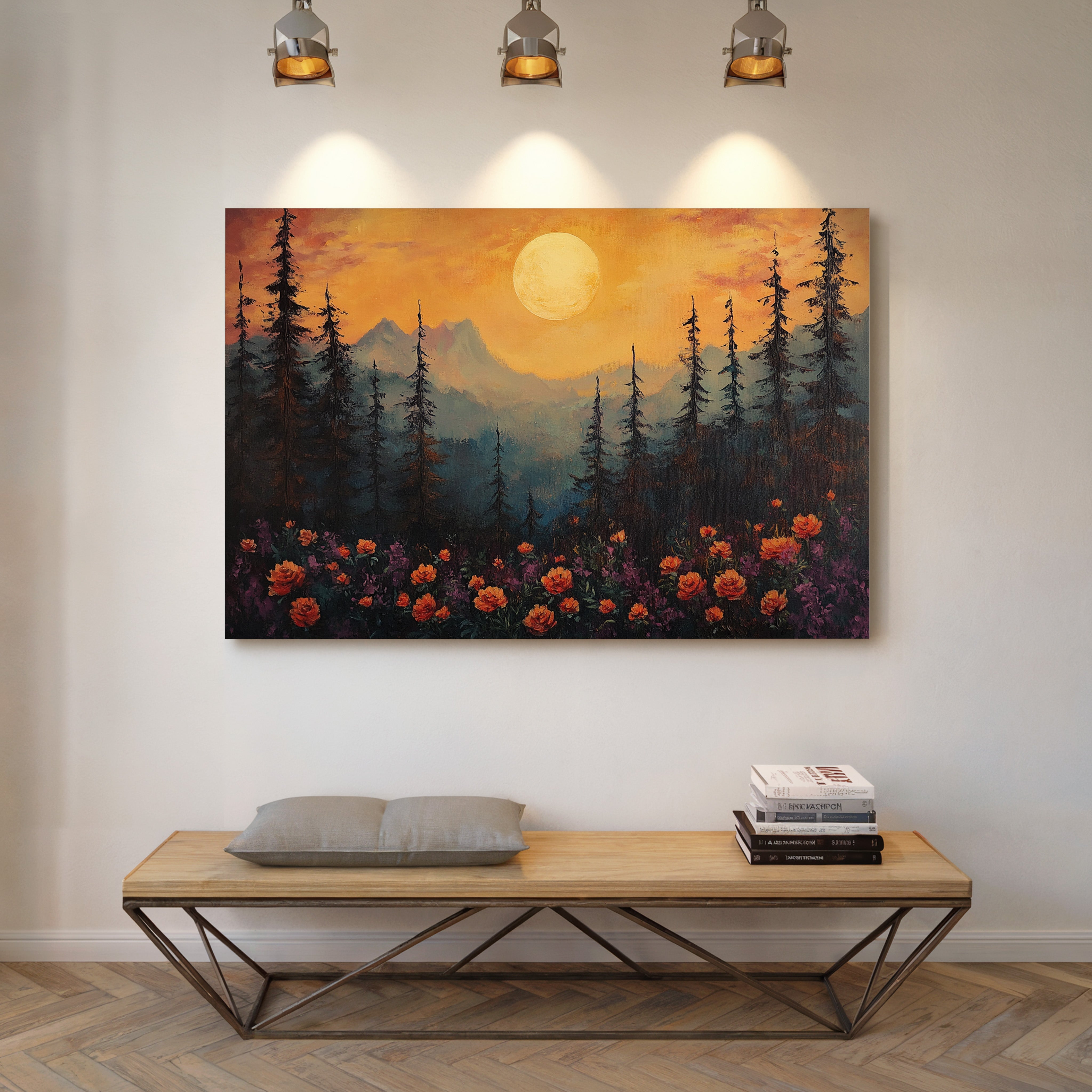 A golden moon hangs like a luminous pearl in an amber sky, casting its ethereal glow across a mountain wilderness. Tall evergreens stand as silent sentinels against misty peaks, their dark silhouettes creating a dramatic contrast with the warm celestial light. In the foreground, vibrant orange roses and purple wildflowers bloom in wild abundance, their petals catching the last rays of dusk. The scene captures that magical moment when day surrenders to night, where mountain air meets garden dreams. This piece would bring a touch of wilderness romance to a reading nook or create a captivating focal point in a cozy bedroom retreat.
