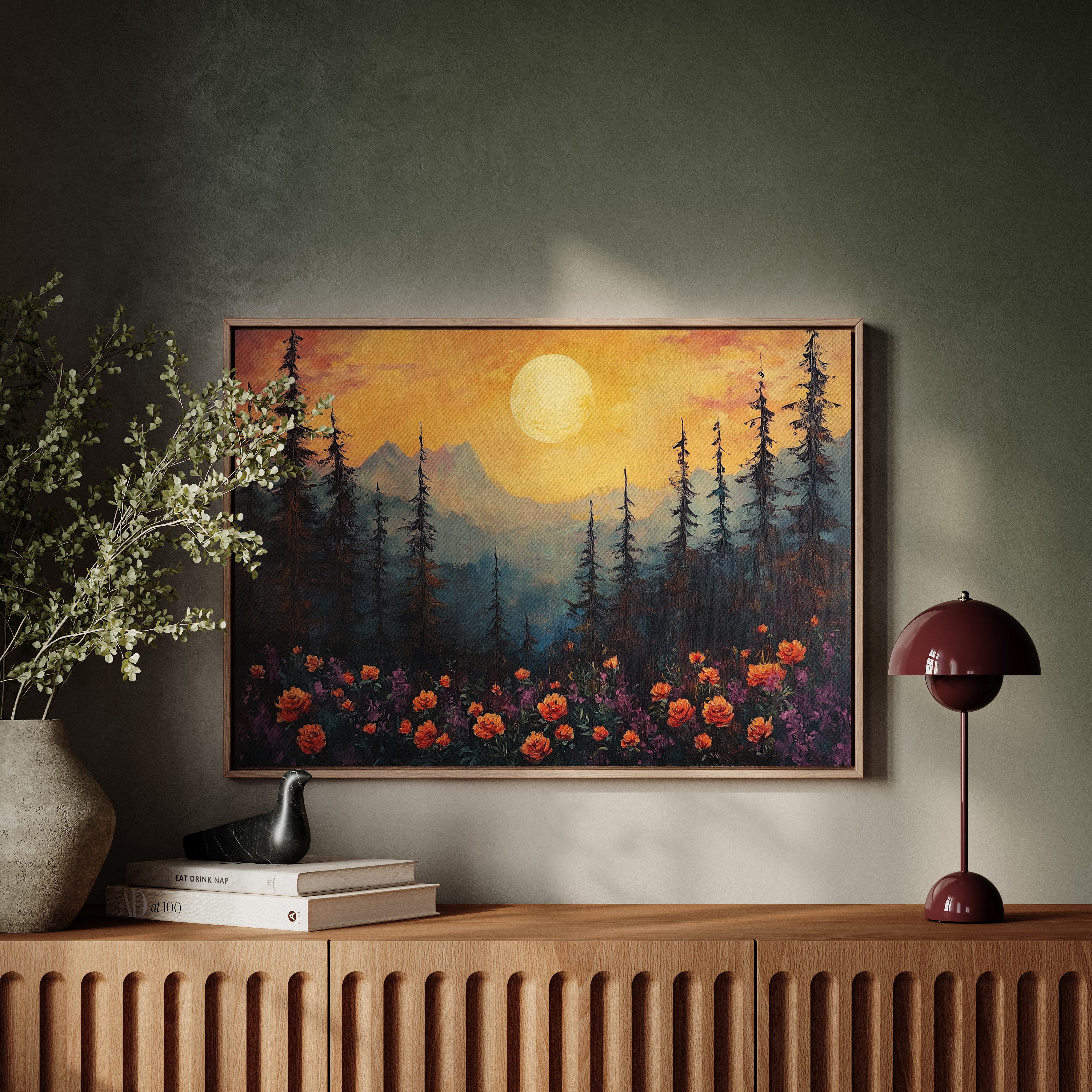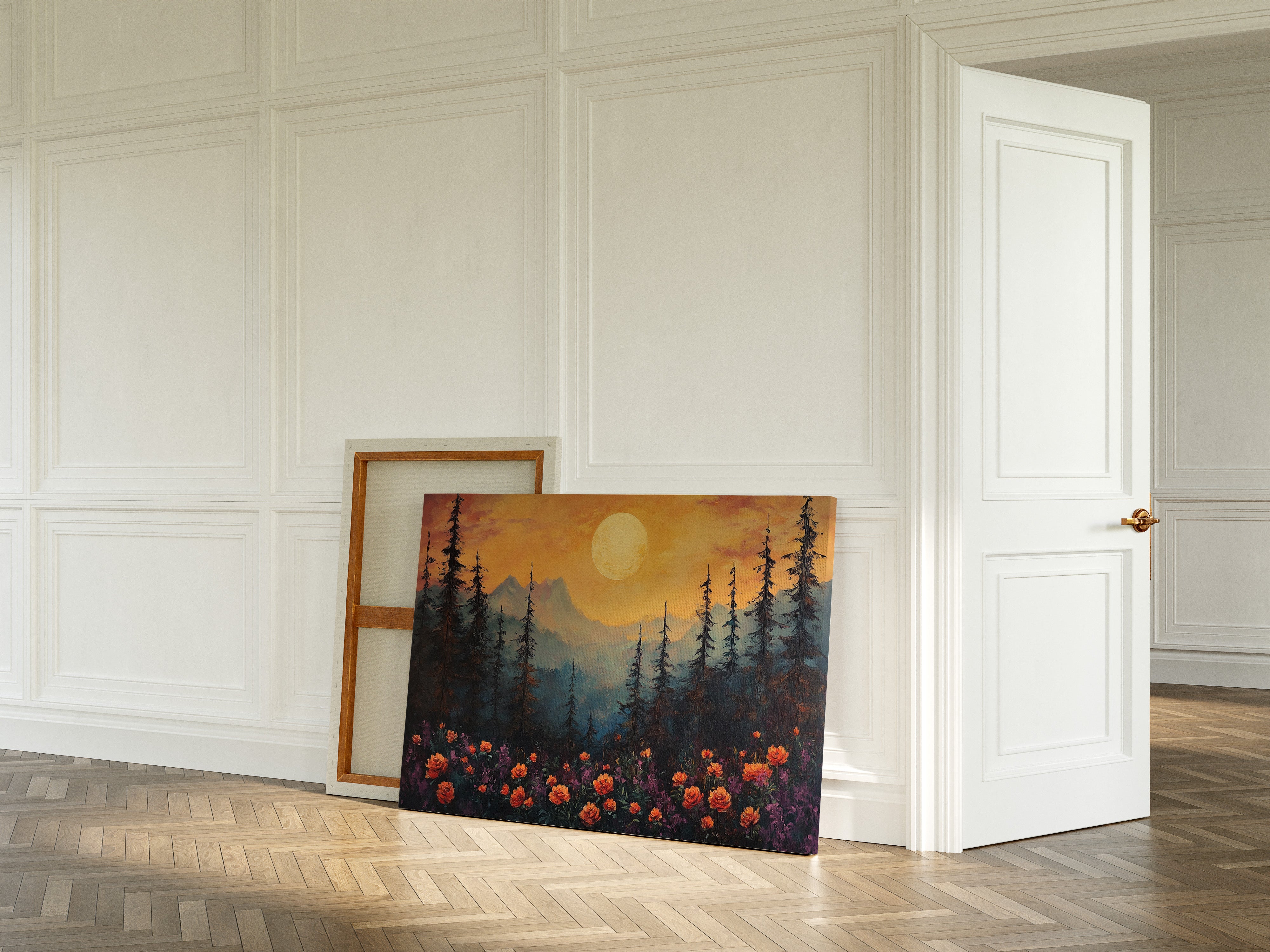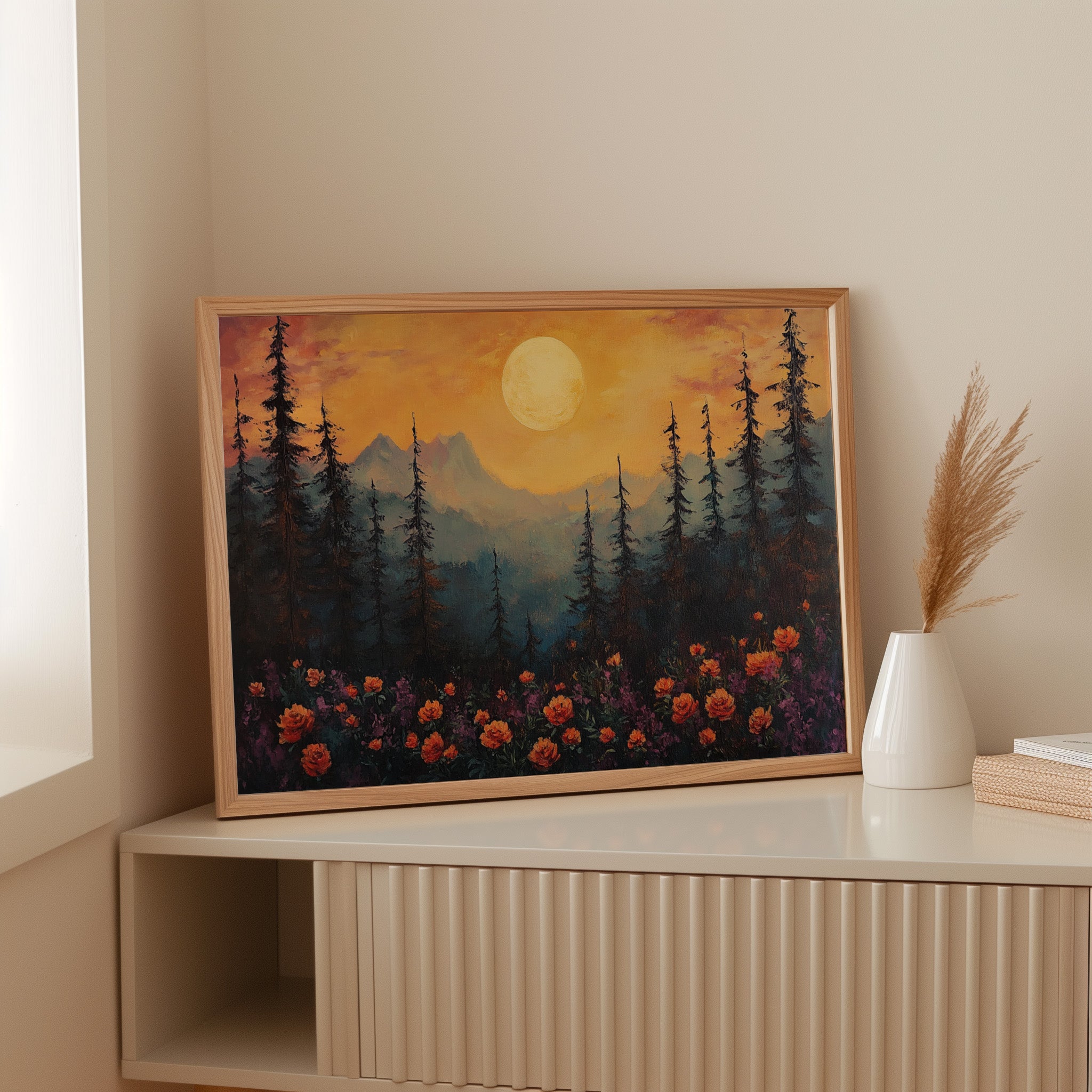A golden moon hangs like a luminous pearl in an amber sky, casting its ethereal glow across a mountain wilderness. Tall evergreens stand as silent sentinels against misty peaks, their dark silhouettes creating a dramatic contrast with the warm celestial light. In the foreground, vibrant orange roses and purple wildflowers bloom in wild abundance, their petals catching the last rays of dusk. The scene captures that magical moment when day surrenders to night, where mountain air meets garden dreams. This piece would bring a touch of wilderness romance to a reading nook or create a captivating focal point in a cozy bedroom retreat.