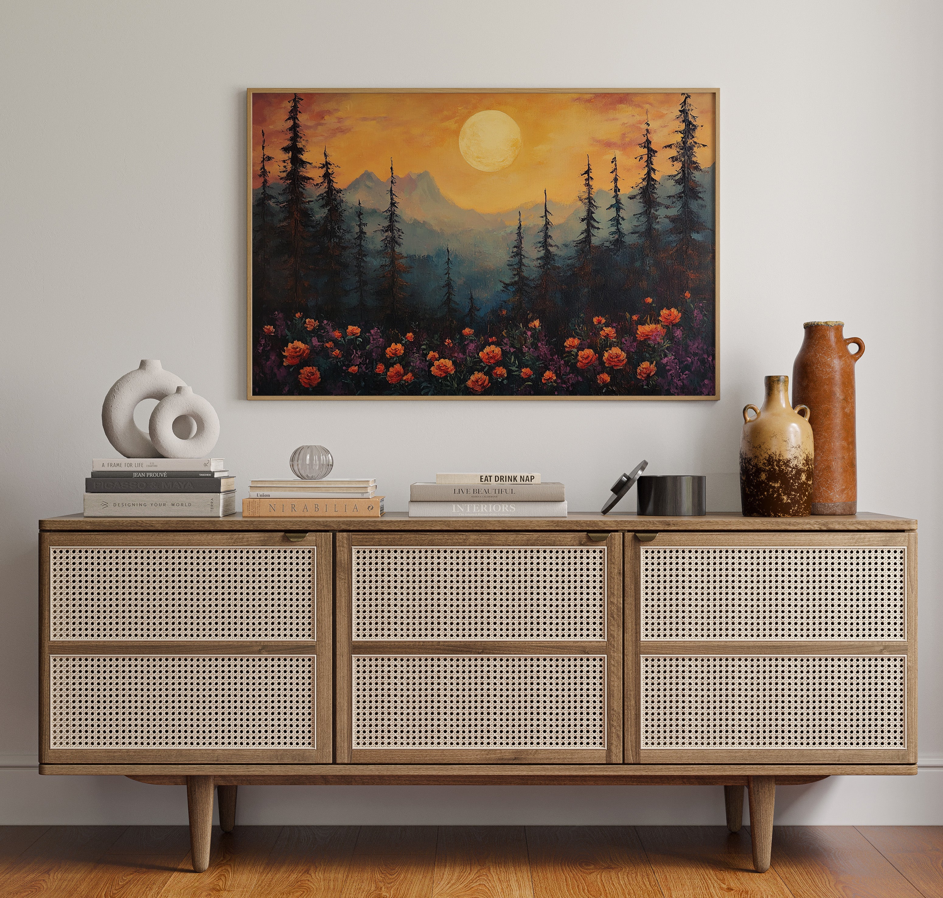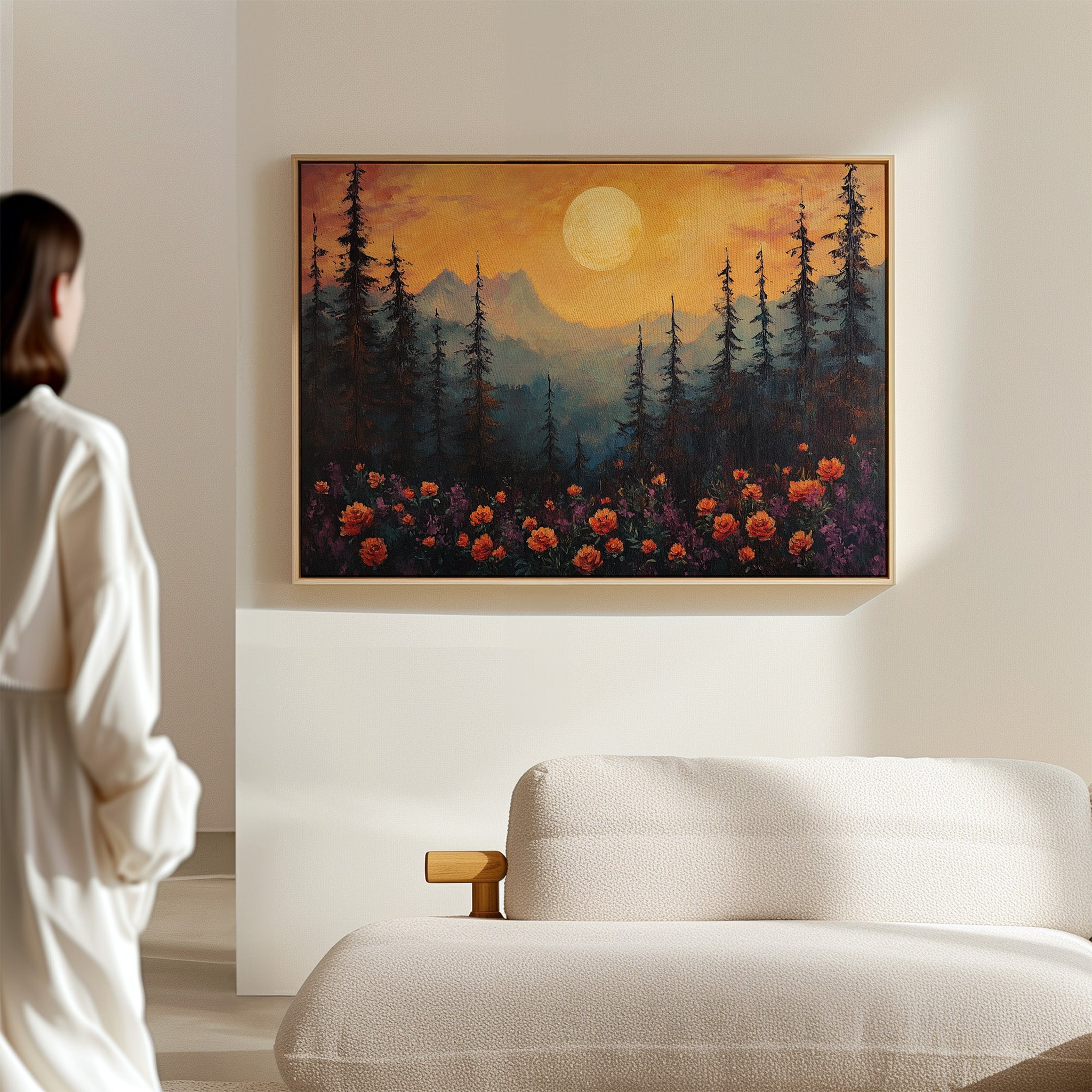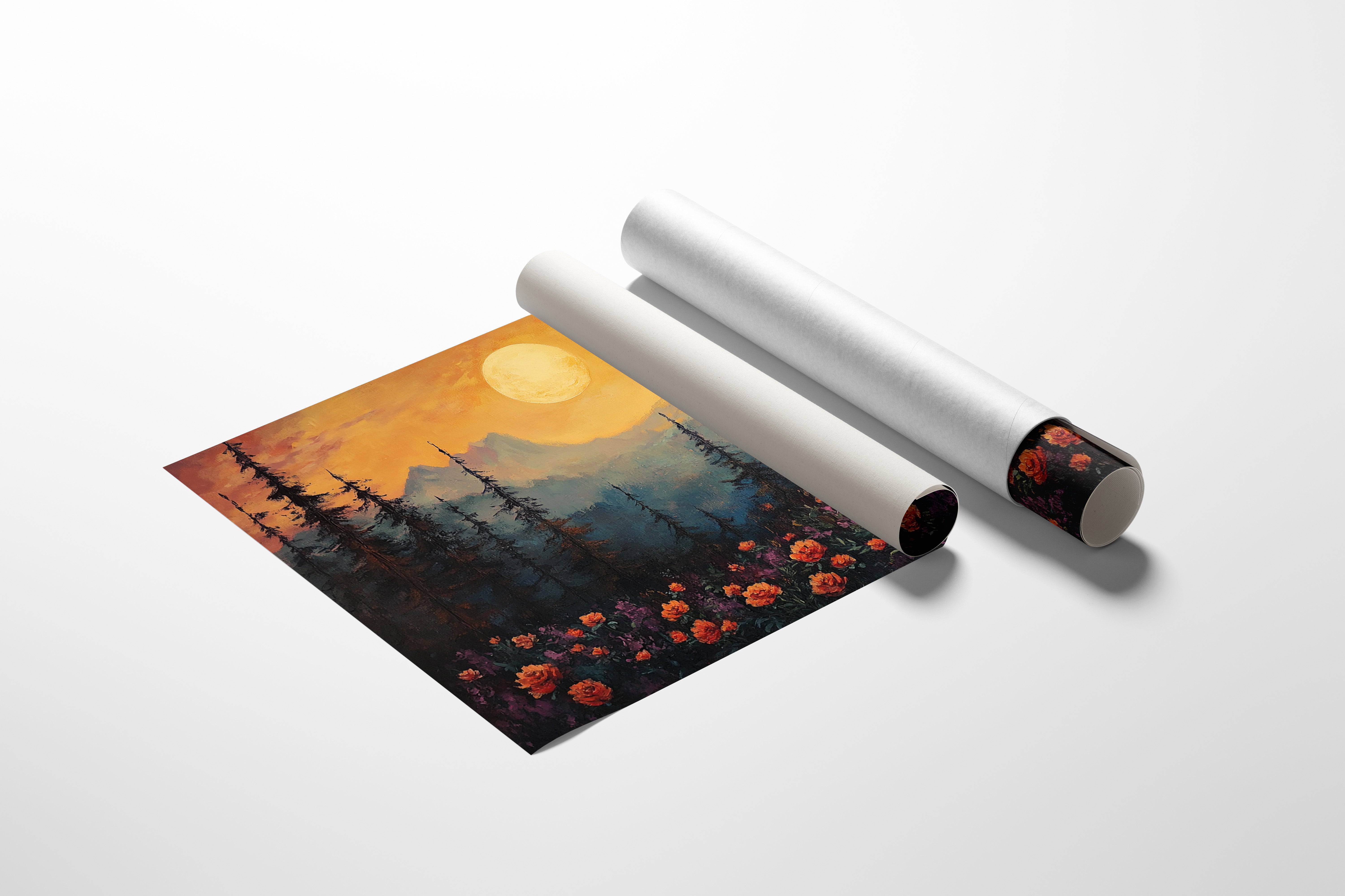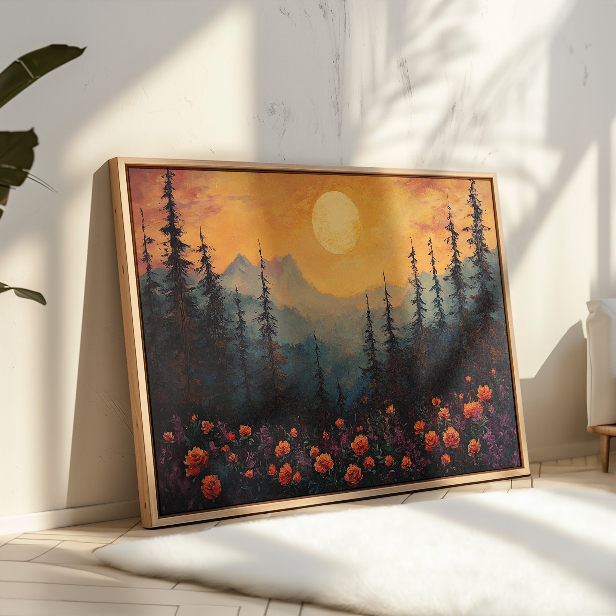 A golden moon hangs like a luminous pearl in an amber sky, casting its ethereal glow across a mountain wilderness. Tall evergreens stand as silent sentinels against misty peaks, their dark silhouettes creating a dramatic contrast with the warm celestial light. In the foreground, vibrant orange roses and purple wildflowers bloom in wild abundance, their petals catching the last rays of dusk. The scene captures that magical moment when day surrenders to night, where mountain air meets garden dreams. This piece would bring a touch of wilderness romance to a reading nook or create a captivating focal point in a cozy bedroom retreat.