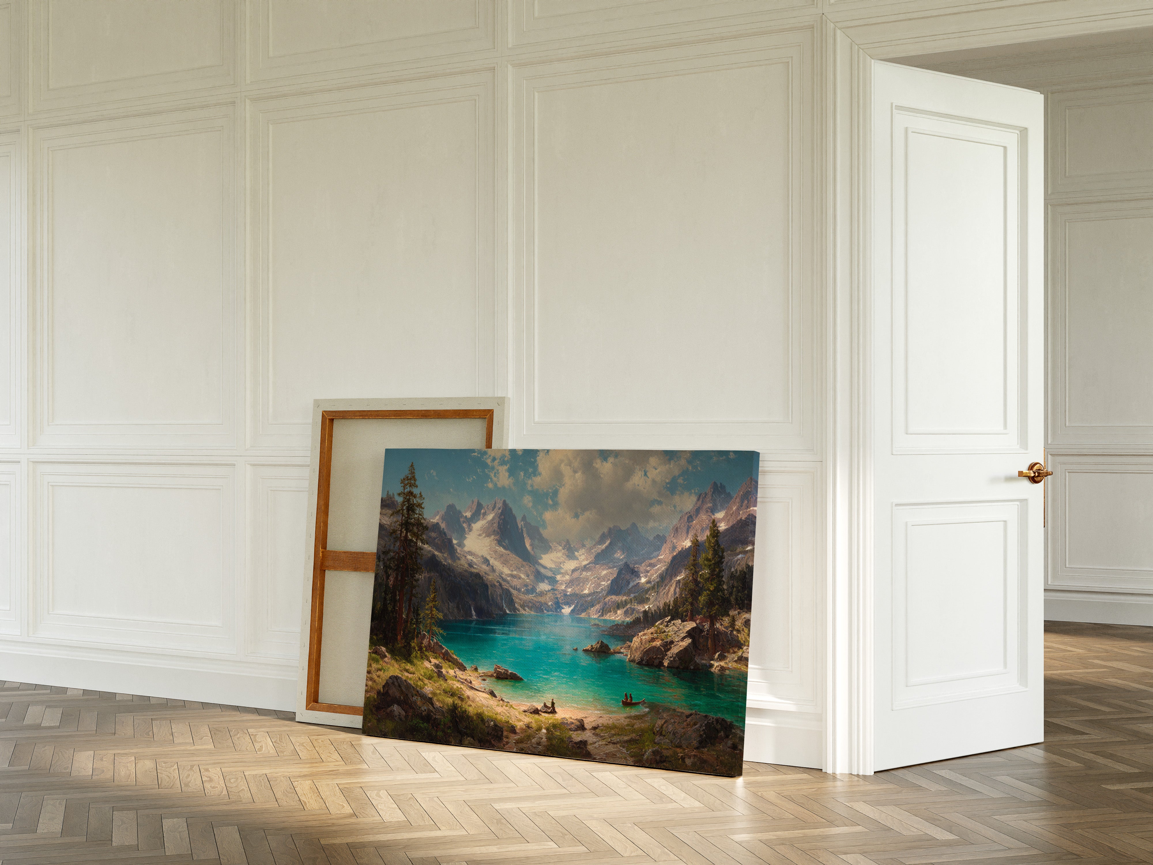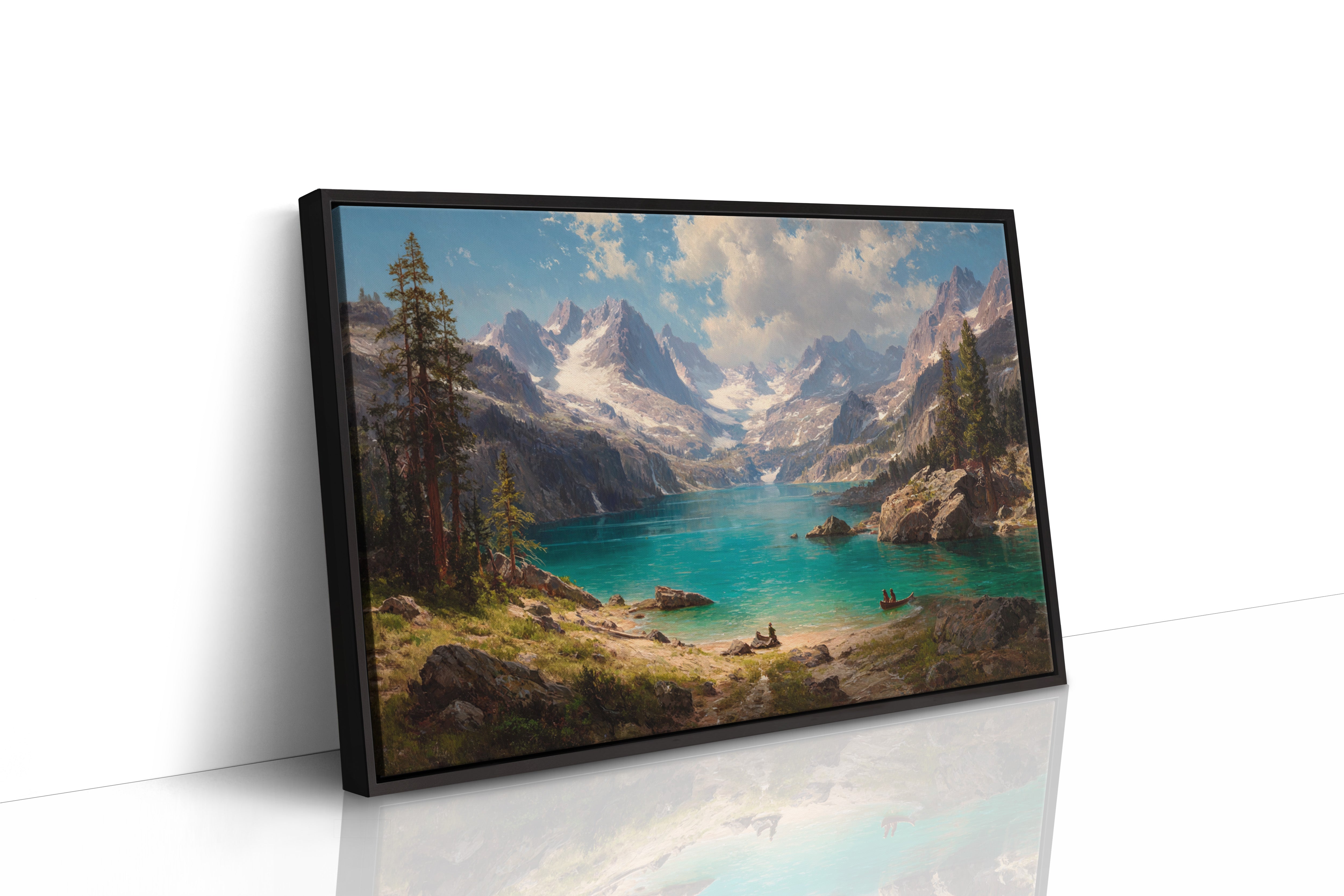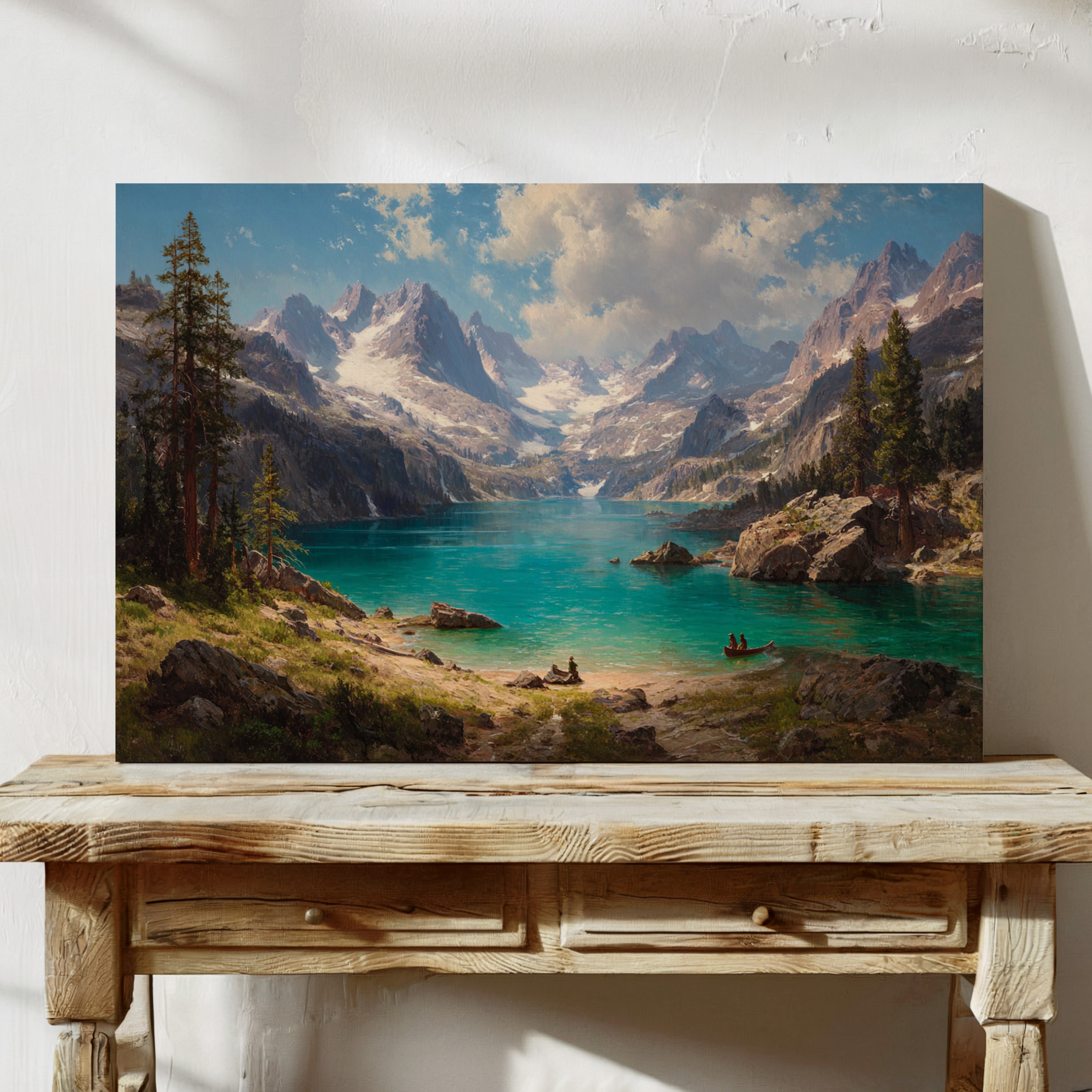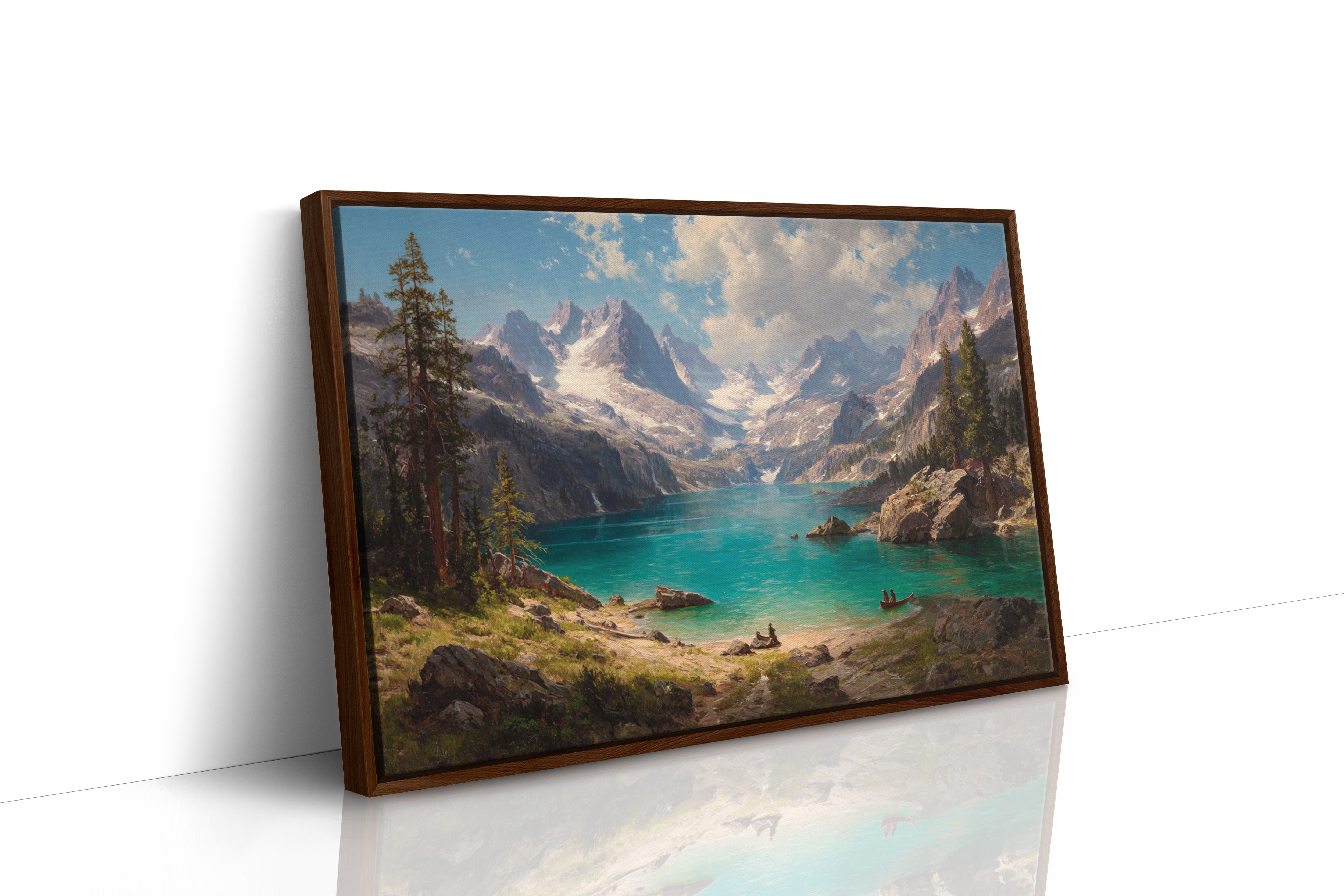 "Turquoise waters mirror the vastness of mountain peaks, creating a moment where time seems to pause in pure wonder. Jagged snow-capped summits pierce through billowing clouds, while ancient pines stand sentinel along rocky shores. The pristine alpine lake captures the raw majesty of wilderness, its crystal-clear waters inviting exploration by tiny boats that drift across its surface. Perfect for spaces seeking to capture the grandeur of untamed landscapes, this piece brings the transformative power of mountain solitude into any room.
