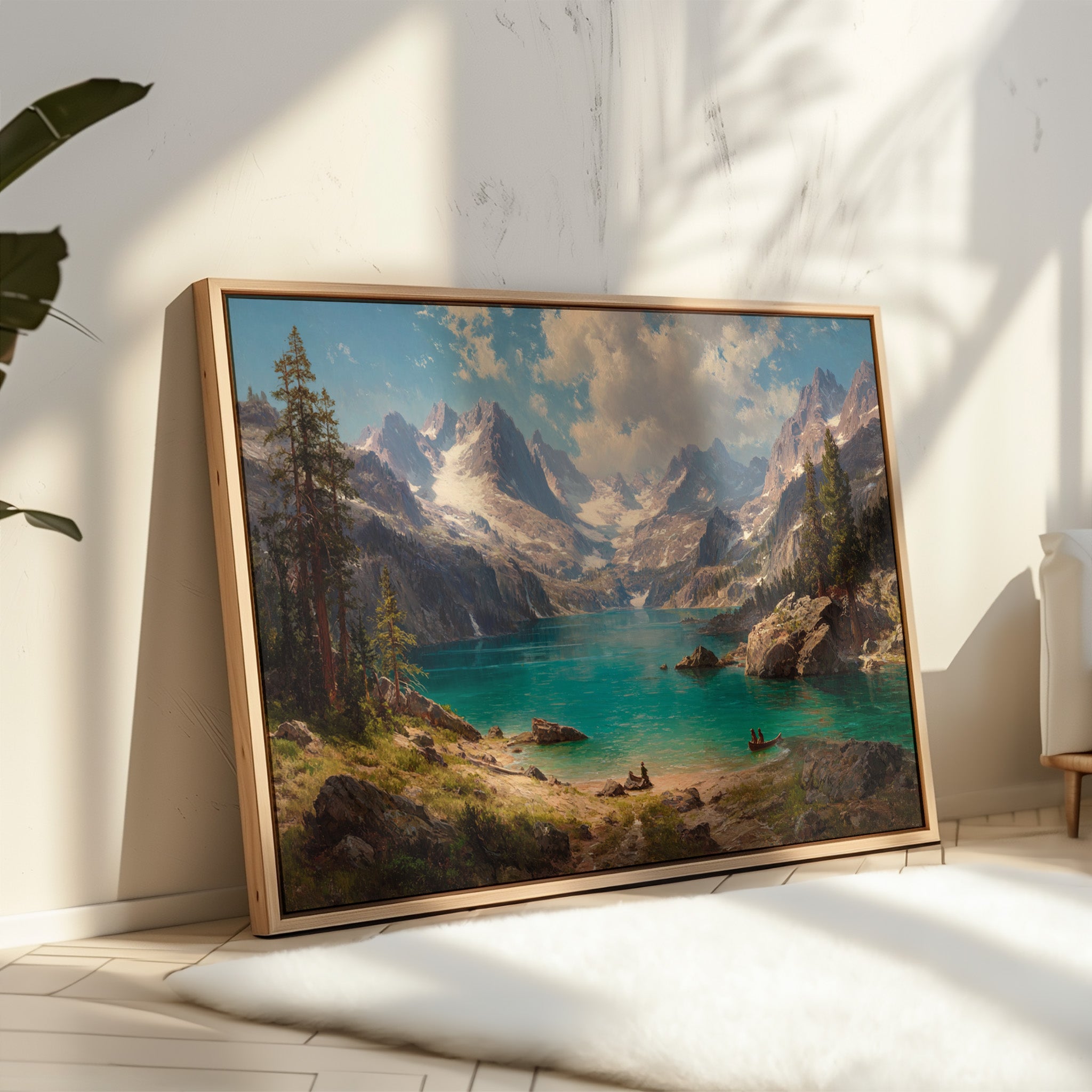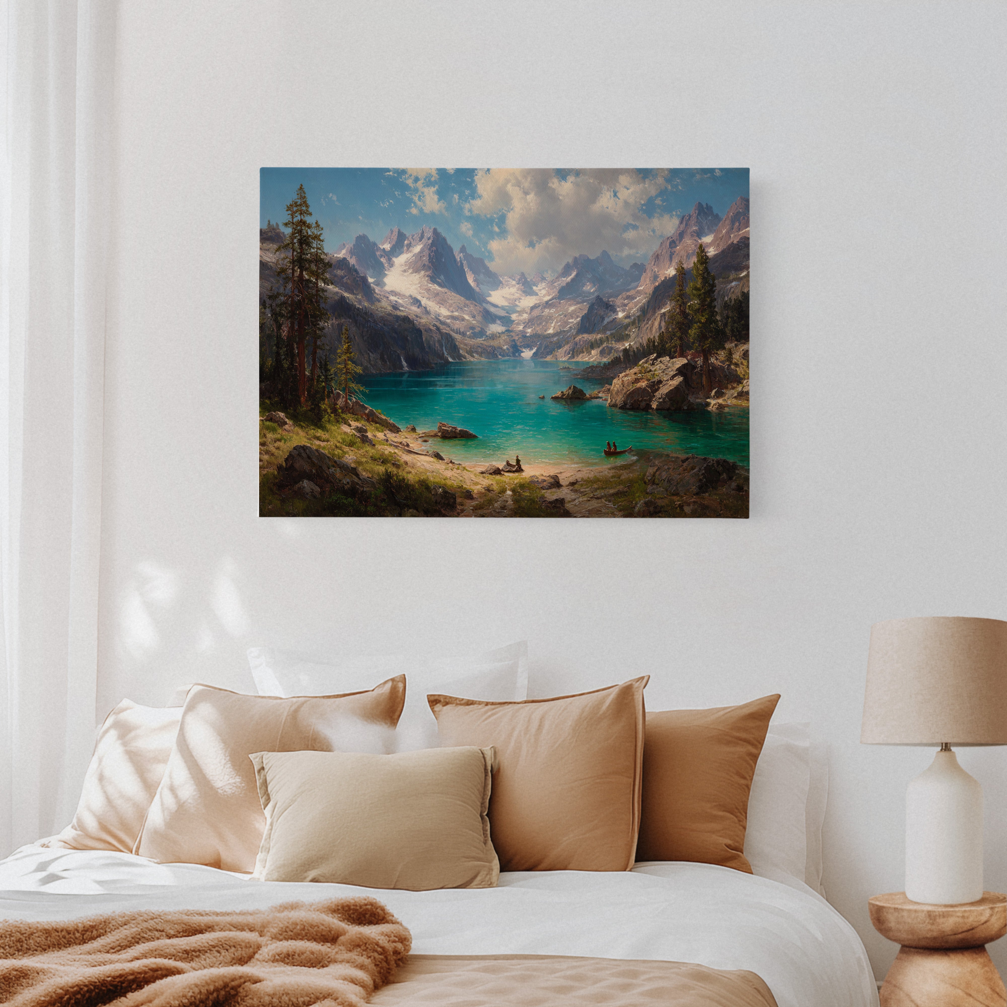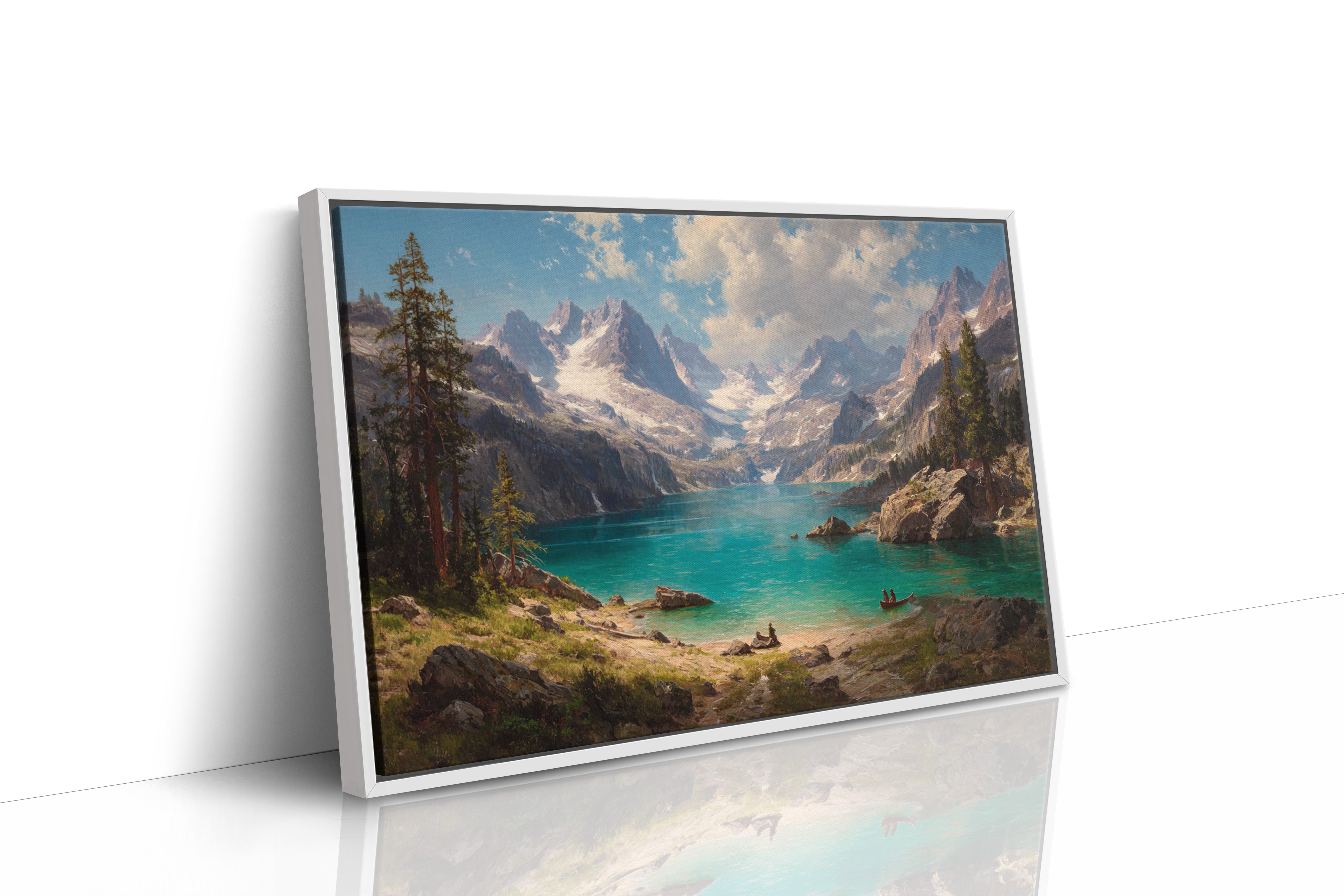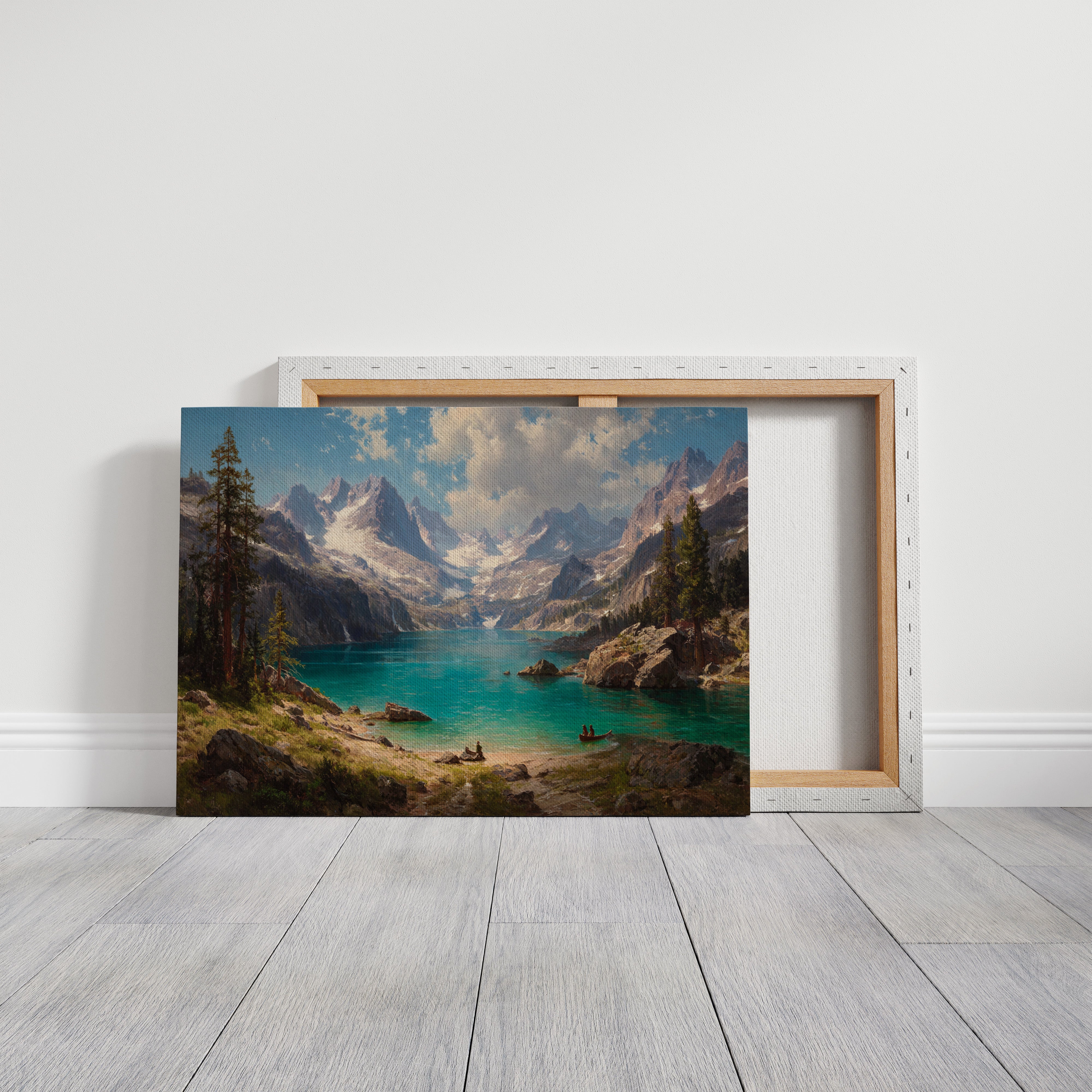 "Turquoise waters mirror the vastness of mountain peaks, creating a moment where time seems to pause in pure wonder. Jagged snow-capped summits pierce through billowing clouds, while ancient pines stand sentinel along rocky shores. The pristine alpine lake captures the raw majesty of wilderness, its crystal-clear waters inviting exploration by tiny boats that drift across its surface. Perfect for spaces seeking to capture the grandeur of untamed landscapes, this piece brings the transformative power of mountain solitude into any room.