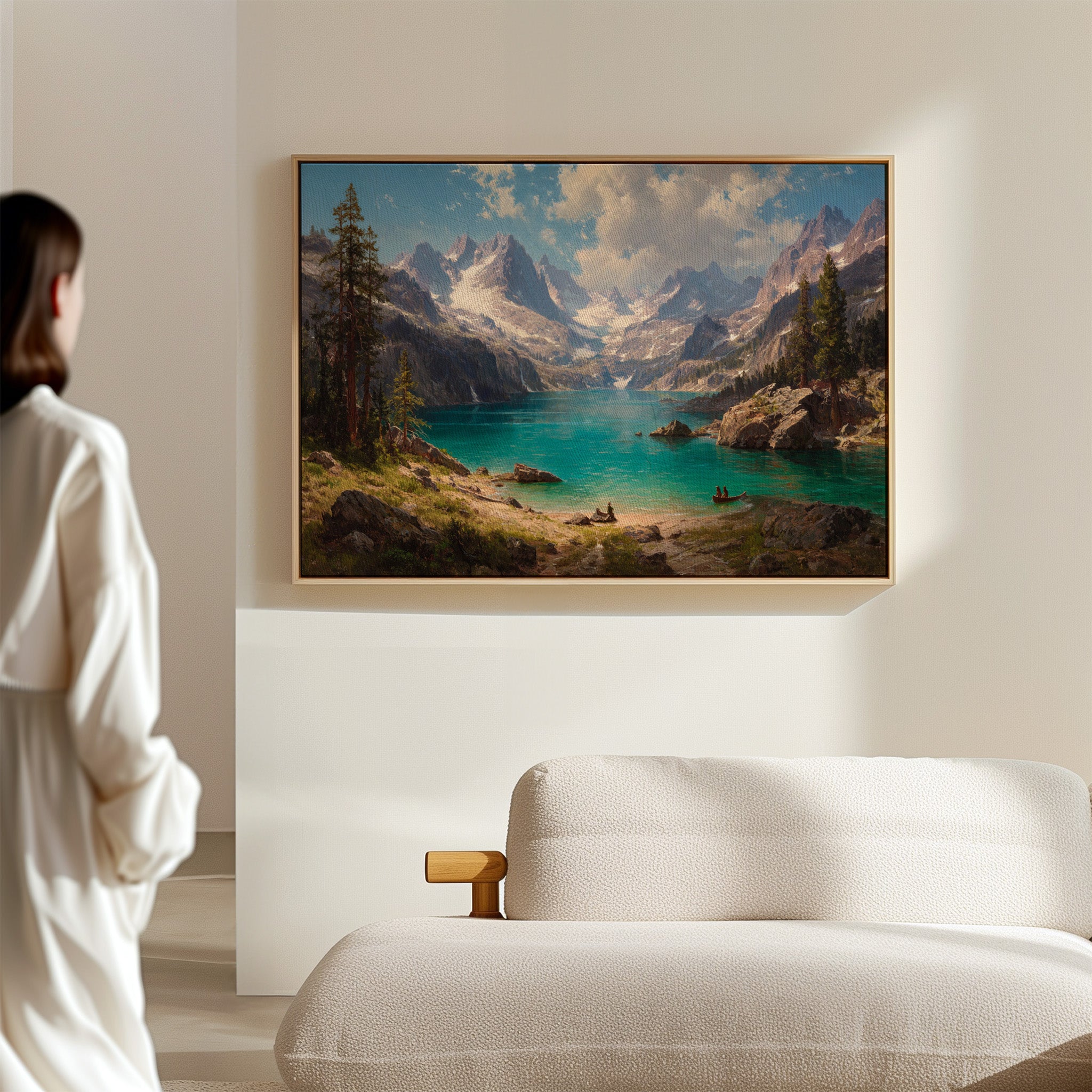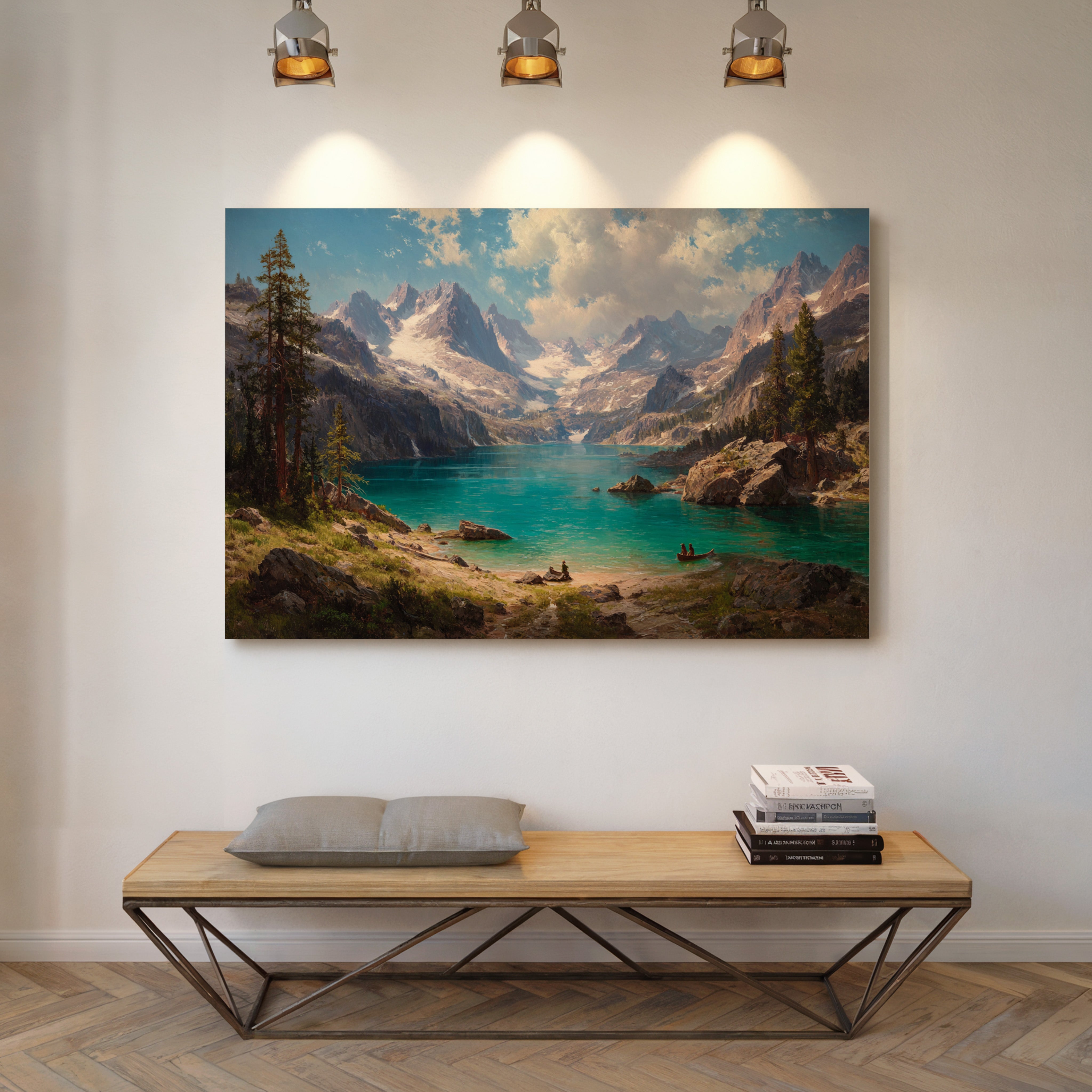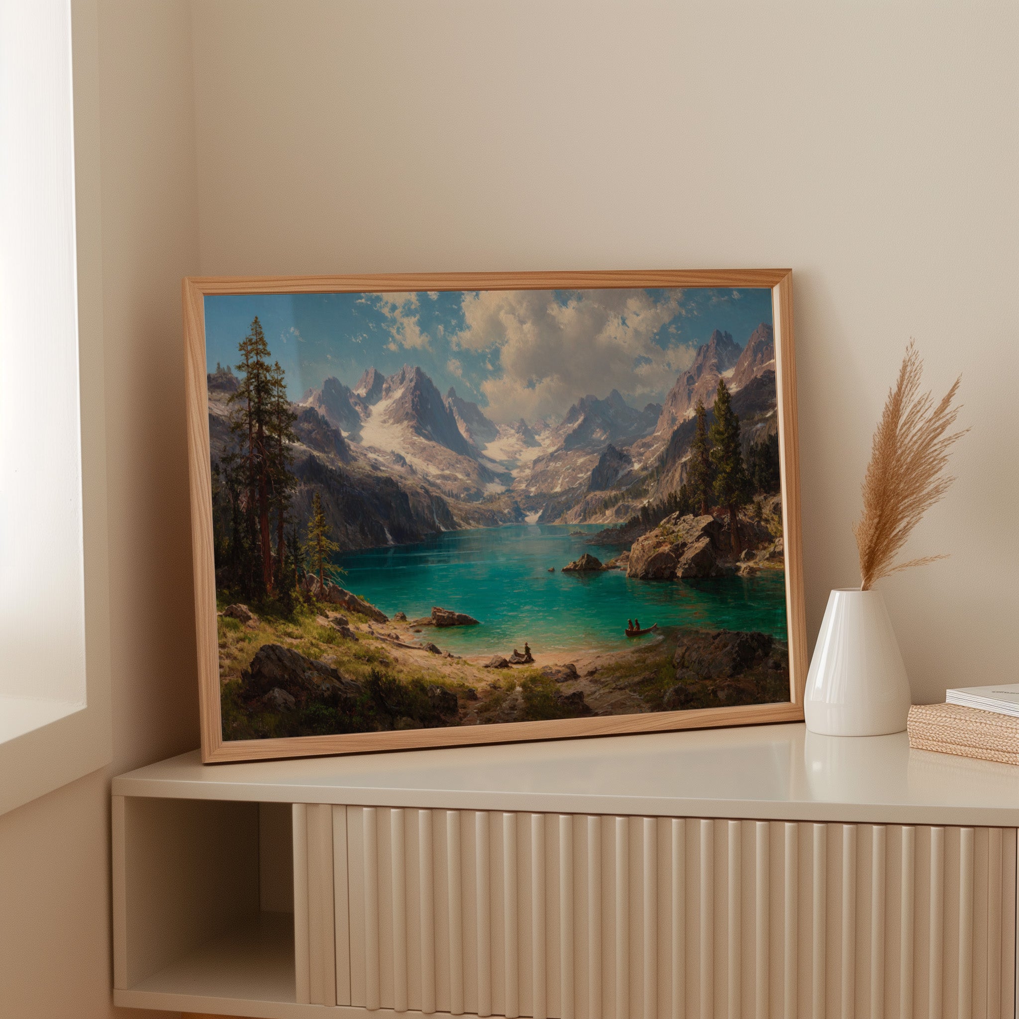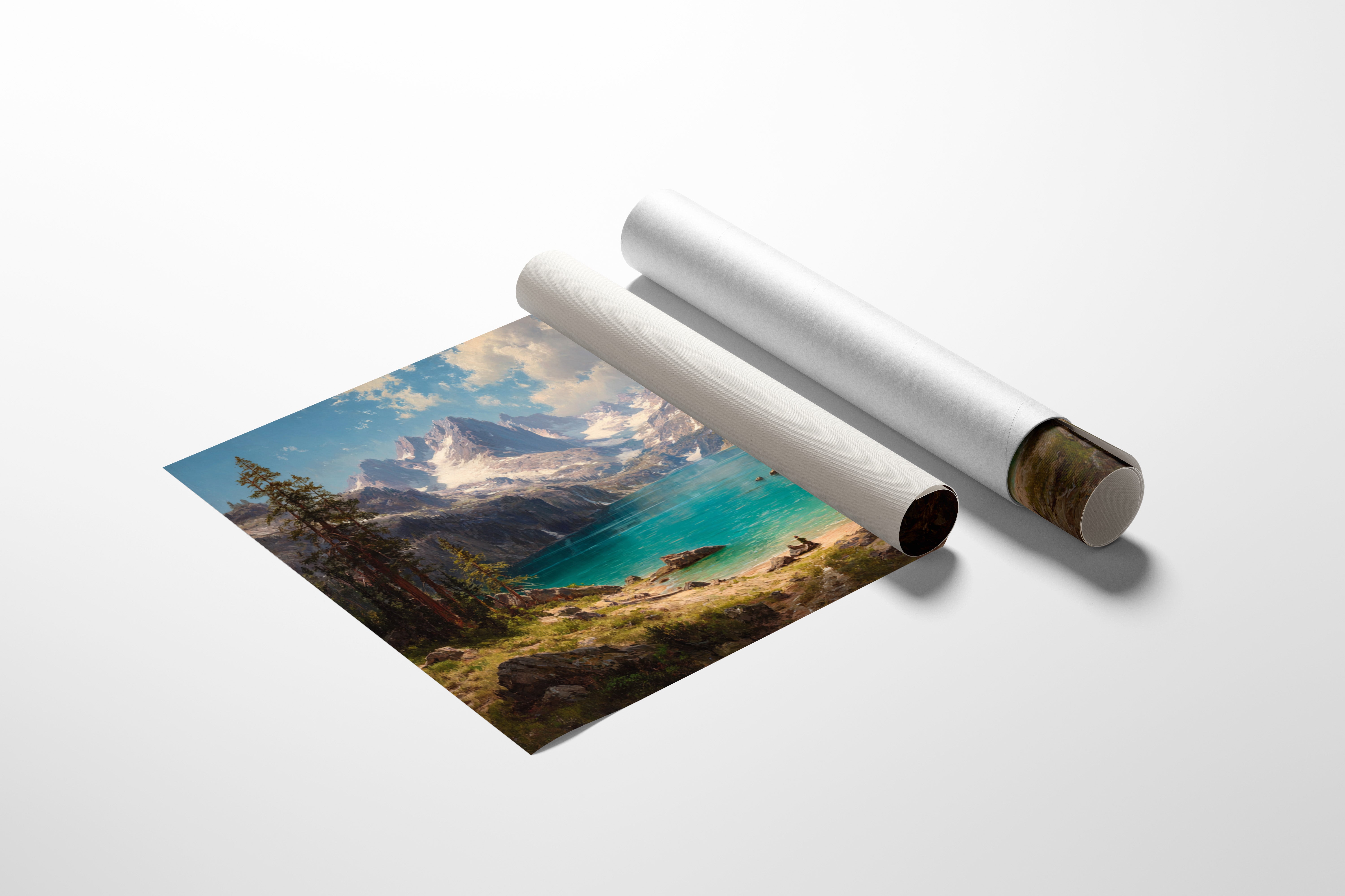 "Turquoise waters mirror the vastness of mountain peaks, creating a moment where time seems to pause in pure wonder. Jagged snow-capped summits pierce through billowing clouds, while ancient pines stand sentinel along rocky shores. The pristine alpine lake captures the raw majesty of wilderness, its crystal-clear waters inviting exploration by tiny boats that drift across its surface. Perfect for spaces seeking to capture the grandeur of untamed landscapes, this piece brings the transformative power of mountain solitude into any room.
