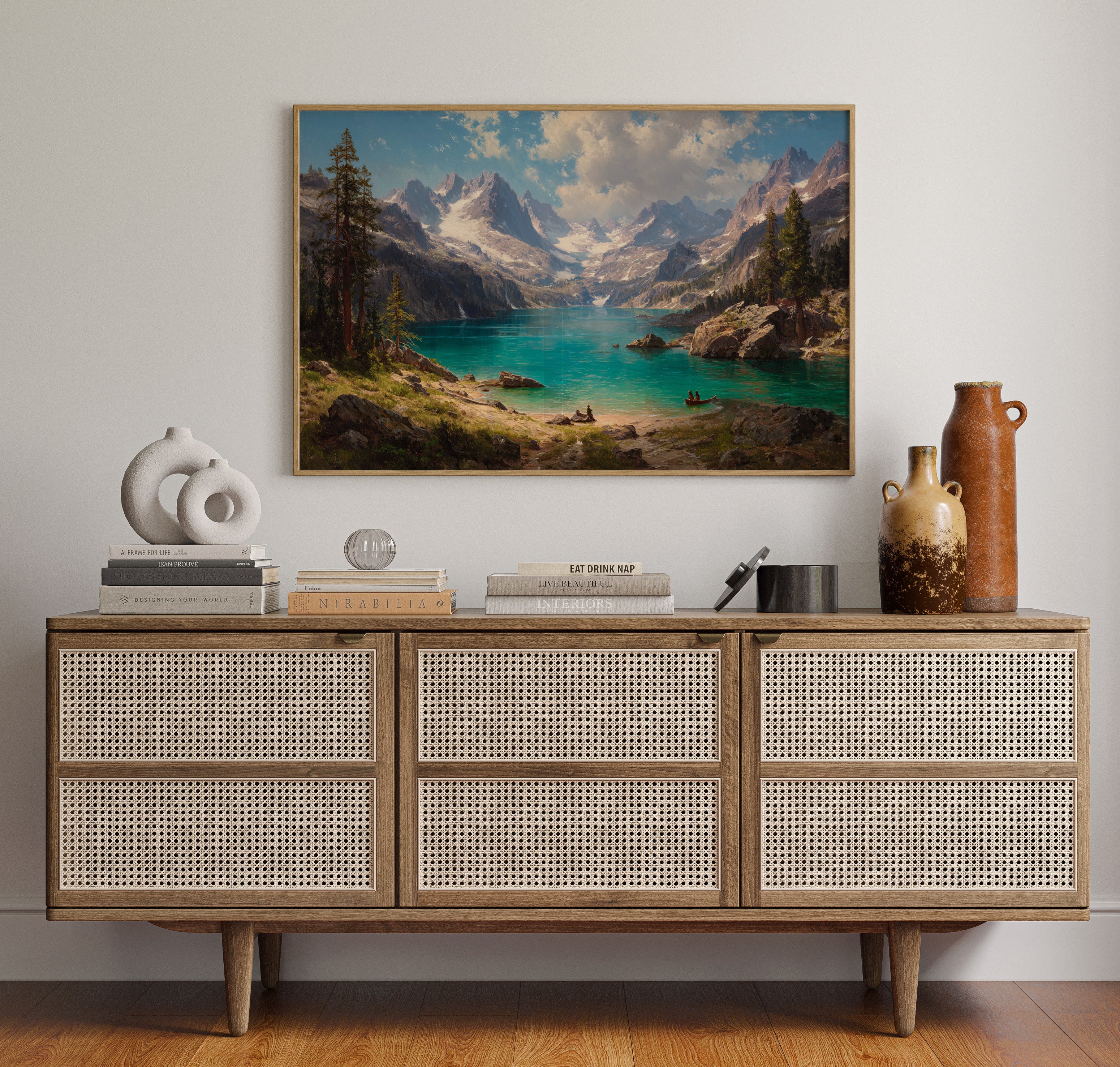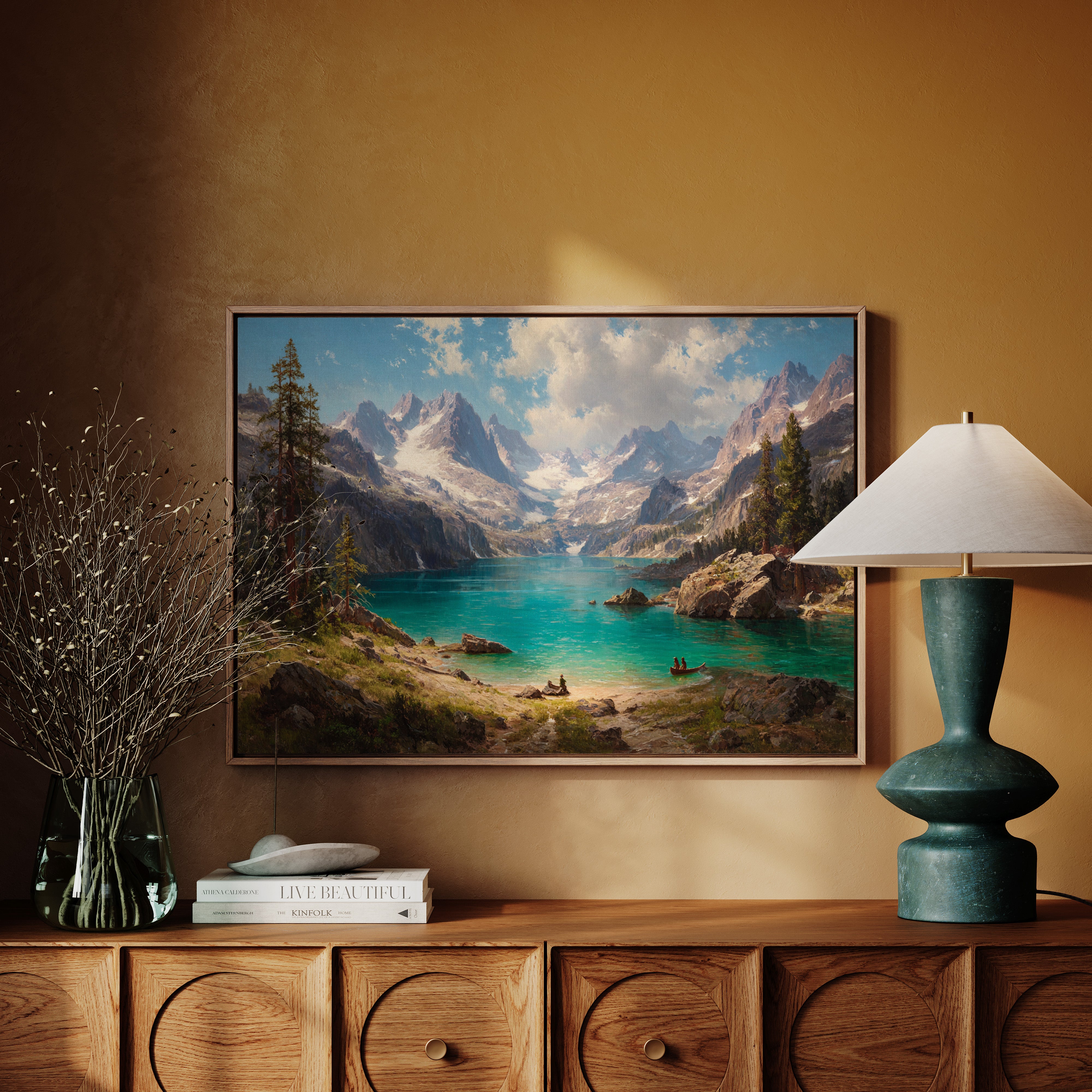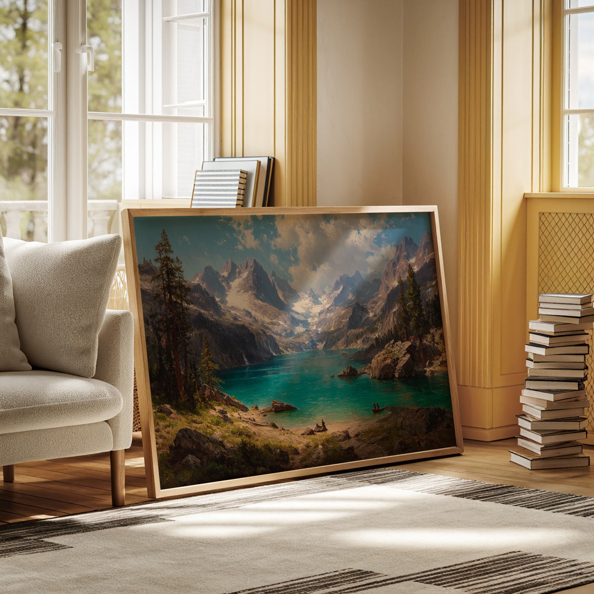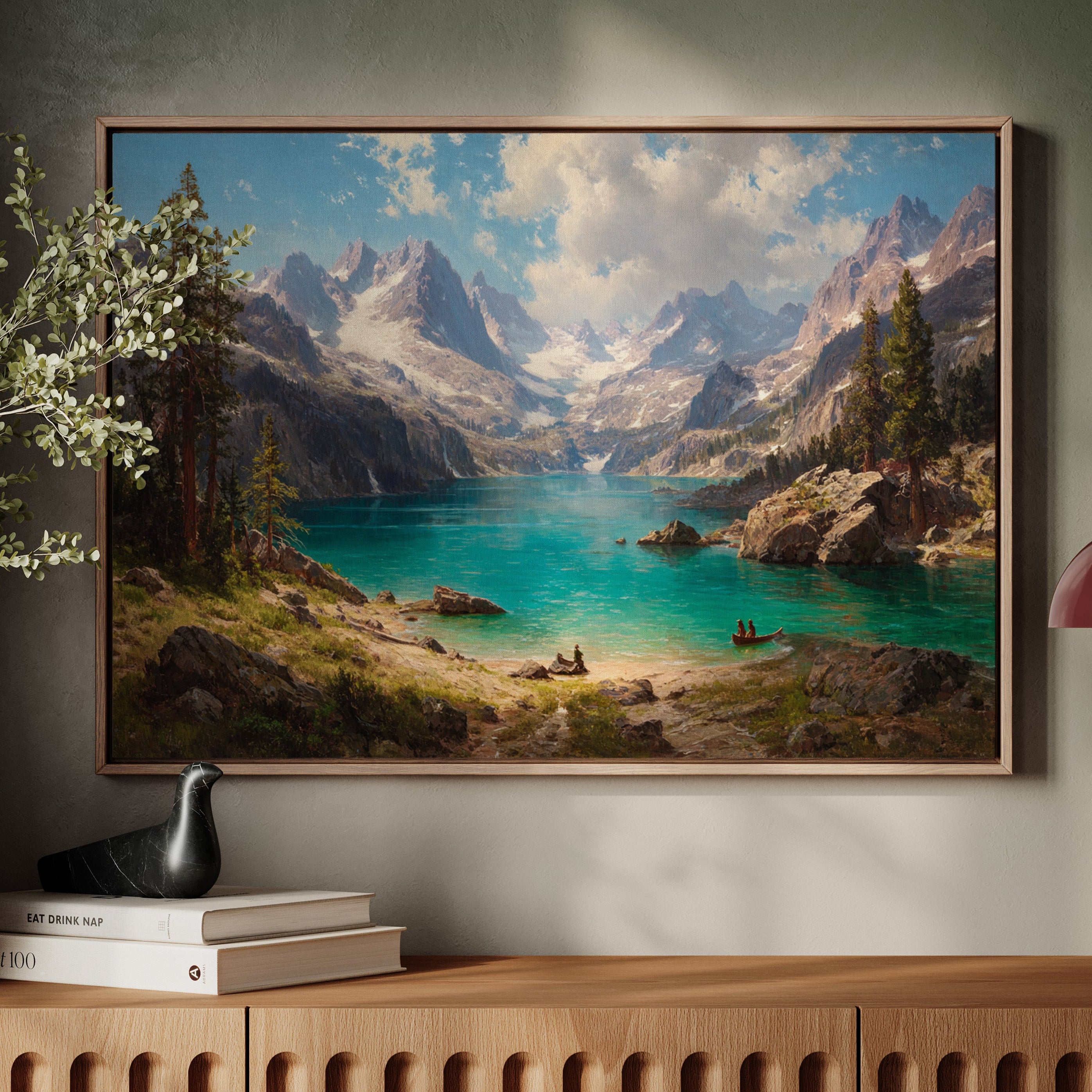 "Turquoise waters mirror the vastness of mountain peaks, creating a moment where time seems to pause in pure wonder. Jagged snow-capped summits pierce through billowing clouds, while ancient pines stand sentinel along rocky shores. The pristine alpine lake captures the raw majesty of wilderness, its crystal-clear waters inviting exploration by tiny boats that drift across its surface. Perfect for spaces seeking to capture the grandeur of untamed landscapes, this piece brings the transformative power of mountain solitude into any room.