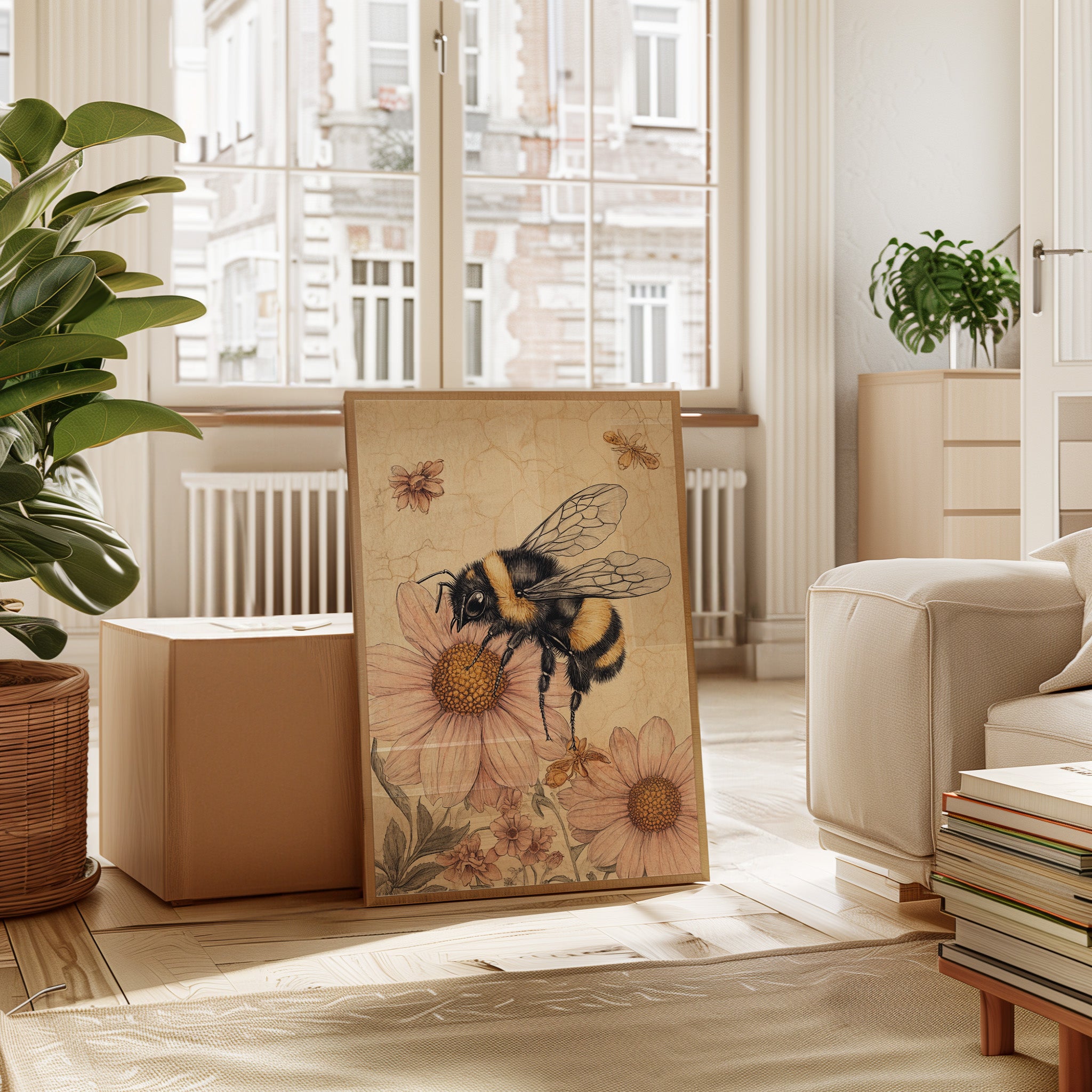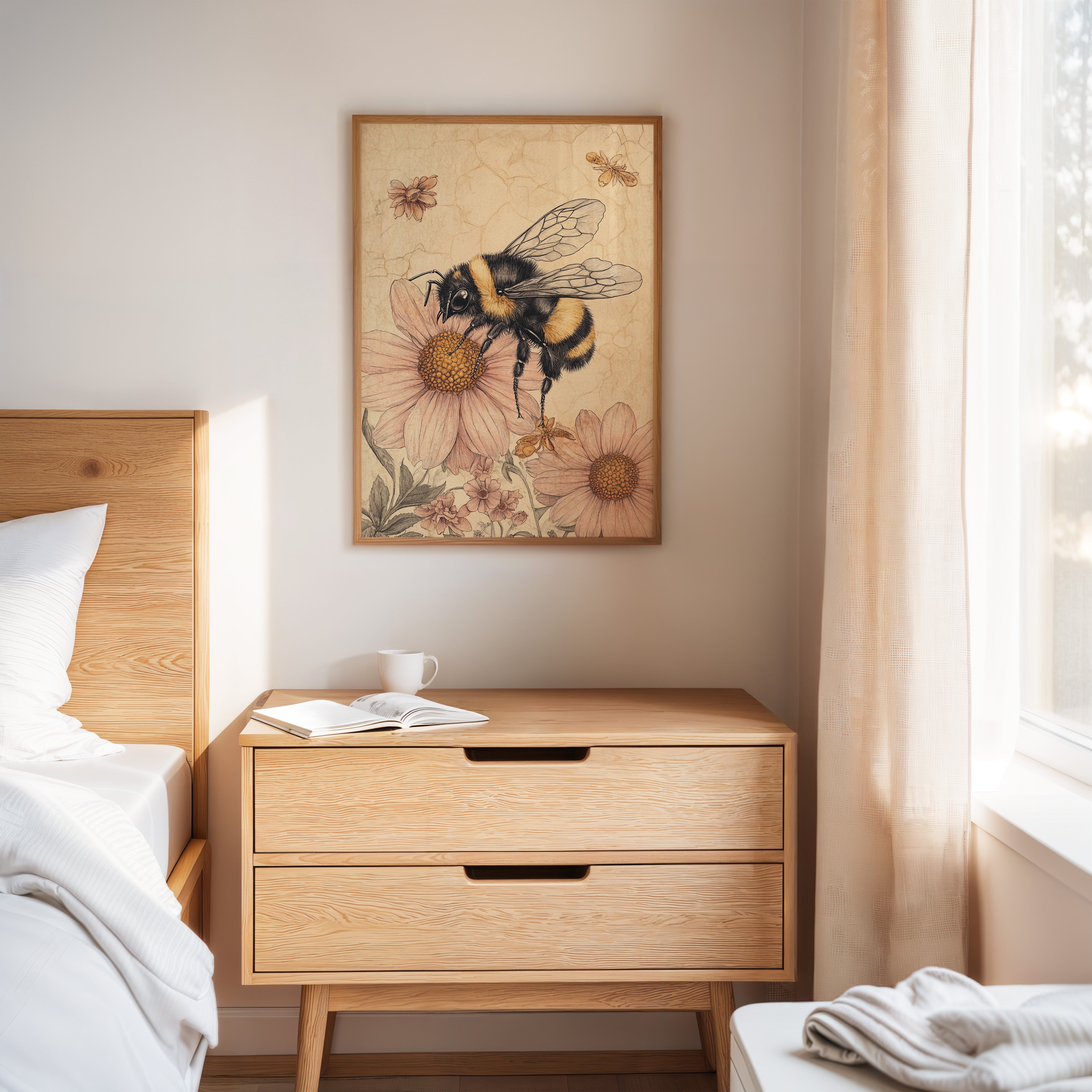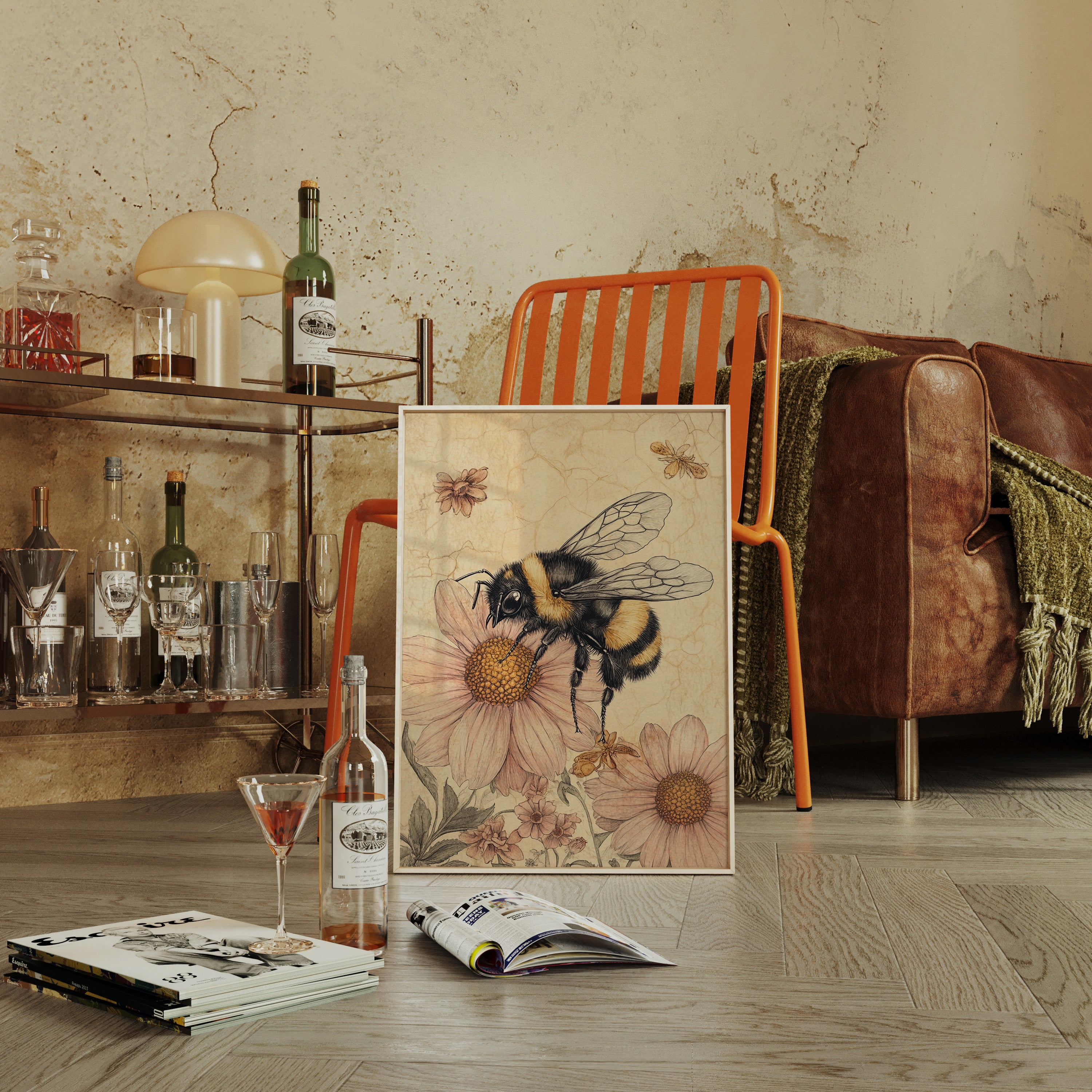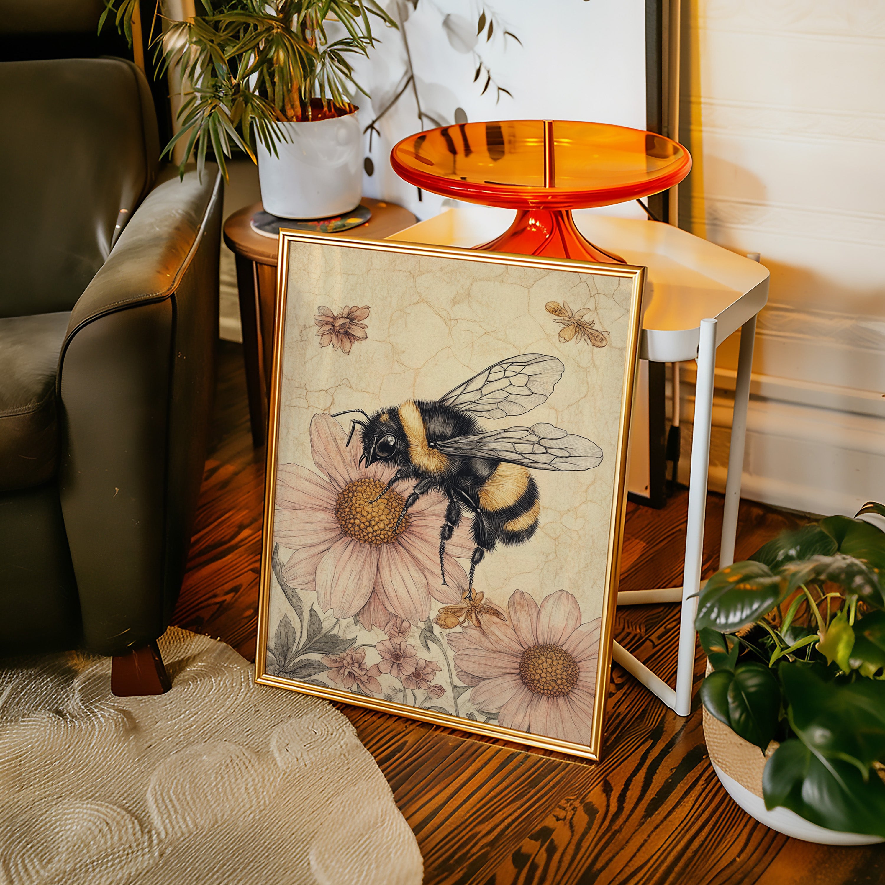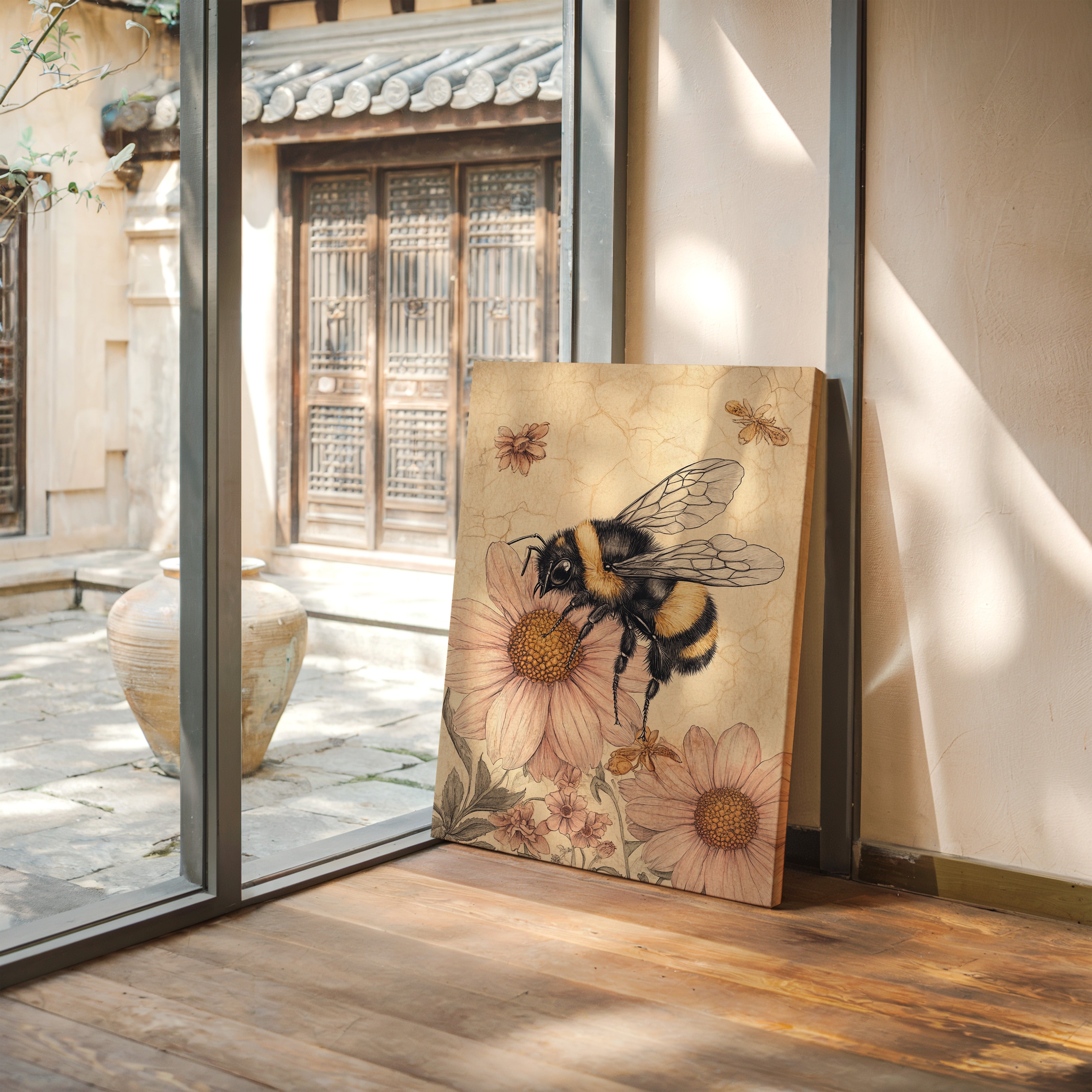 Capture the enchanting dance of nature with 'Amber Buzz Reverie,' where a vibrant bee finds solace amidst delicate blossoms. This piece imbues your space with a warm, rustic charm, perfect for those who cherish the cozy embrace of vintage aesthetics. The intricate details and earthy tones evoke a sense of nostalgia, creating a serene sanctuary in any room. Ideal for lovers of eclectic and cottagecore vibes, this artwork is a timeless addition to your collection.