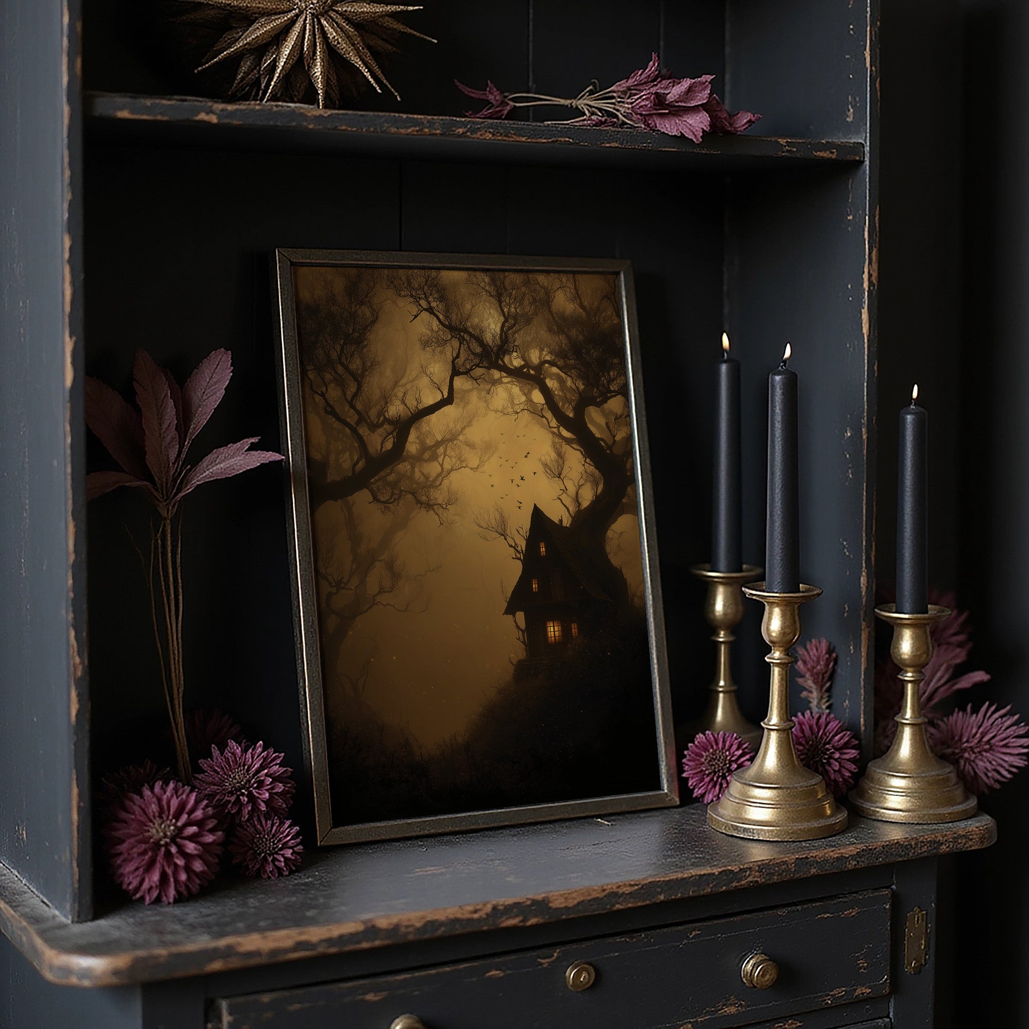 Mist hovers between twisted branches as twilight bathes the scene in haunting amber hues. A solitary cottage stands defiant against encroaching darkness, its windows glowing with mysterious warmth while gnarled trees reach overhead like ancient guardians. The atmospheric fog blurs boundaries between earth and sky, creating a dreamlike landscape where time seems suspended in eternal autumn twilight. This evocative piece brings dramatic contrast to minimalist spaces, creating an intriguing focal point in contemporary living rooms or adding mysterious depth to hallway galleries.