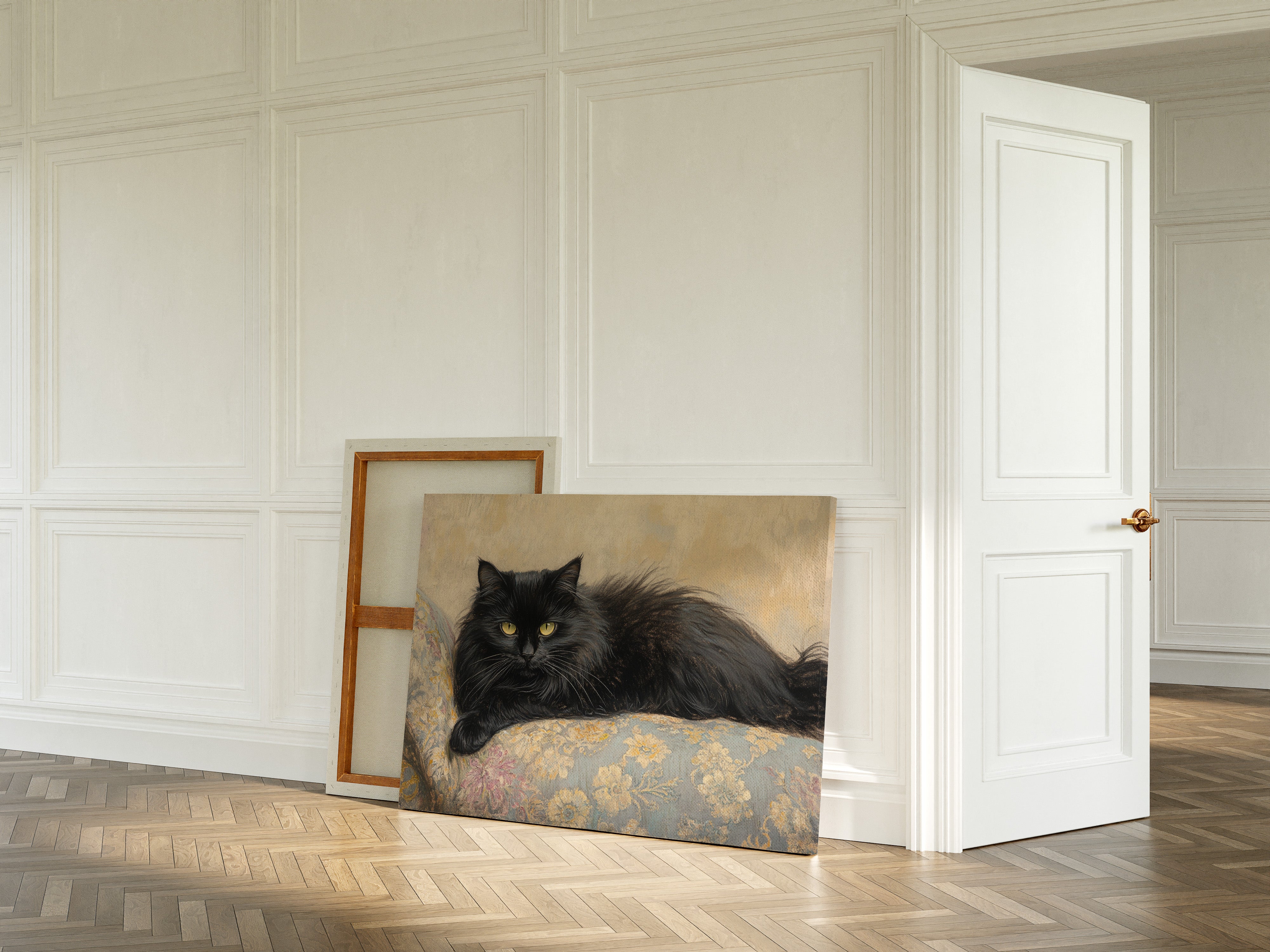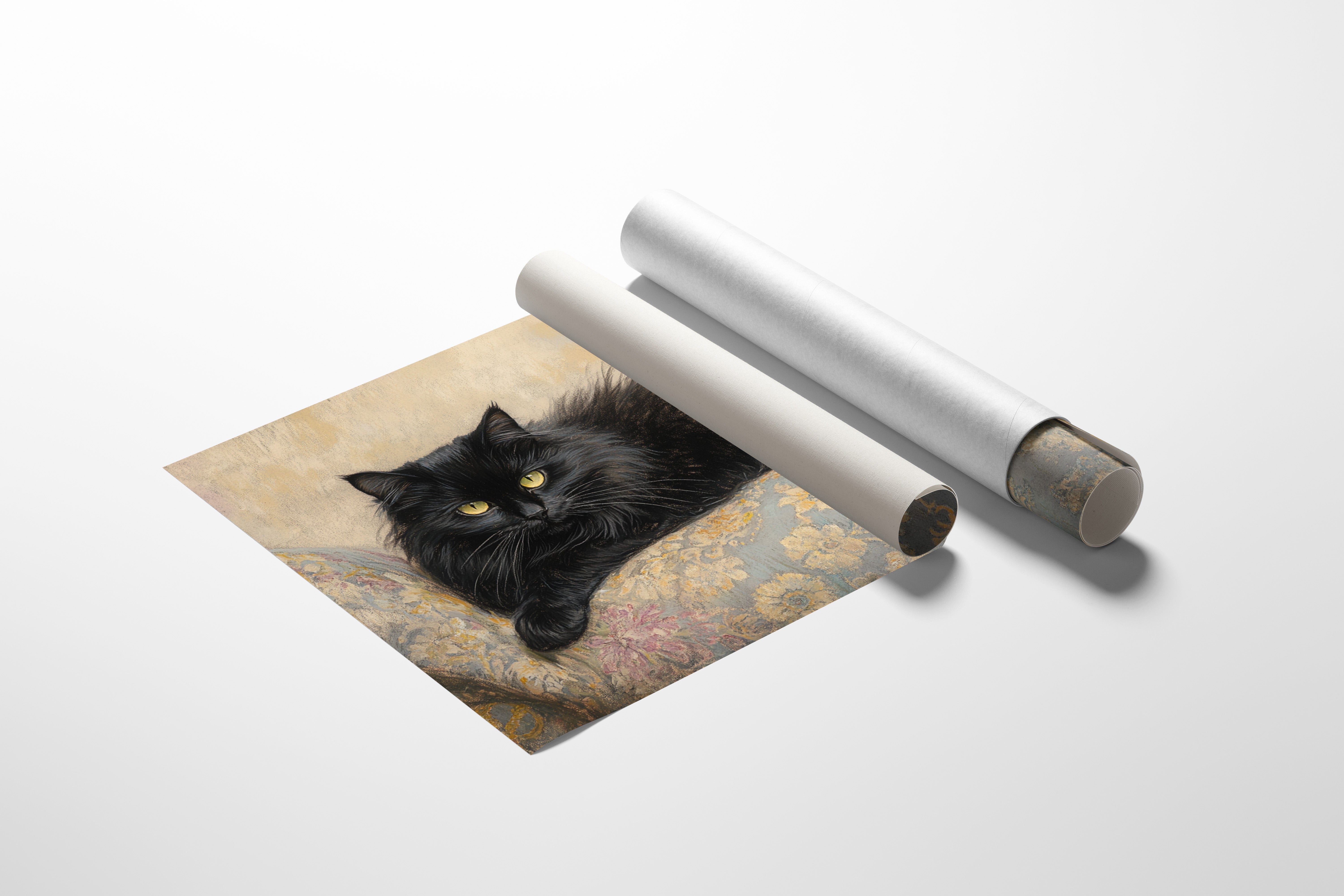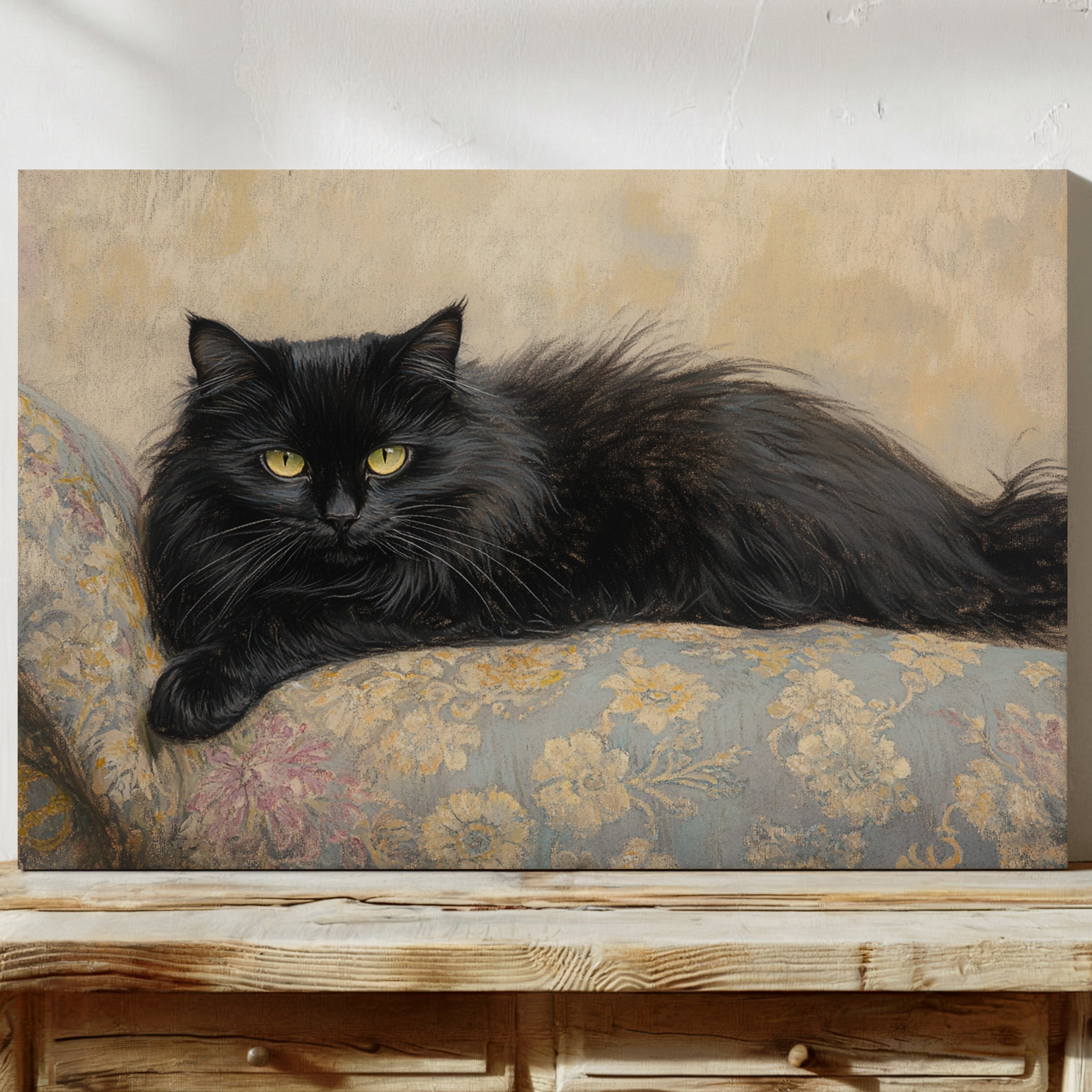 Golden eyes pierce through ebony fur, commanding attention against a backdrop of faded elegance. This regal black cat lounges with casual grace on a weathered floral settee, its long fur creating a striking contrast against the soft blue and gold damask pattern beneath. The textural interplay between the cat's silky coat and the vintage upholstery tells a story of refined domesticity, where old-world charm meets feline majesty. Perfect for adding a touch of sophisticated whimsy to a reading nook, bedroom, or any space where classic elegance meets contemporary style.