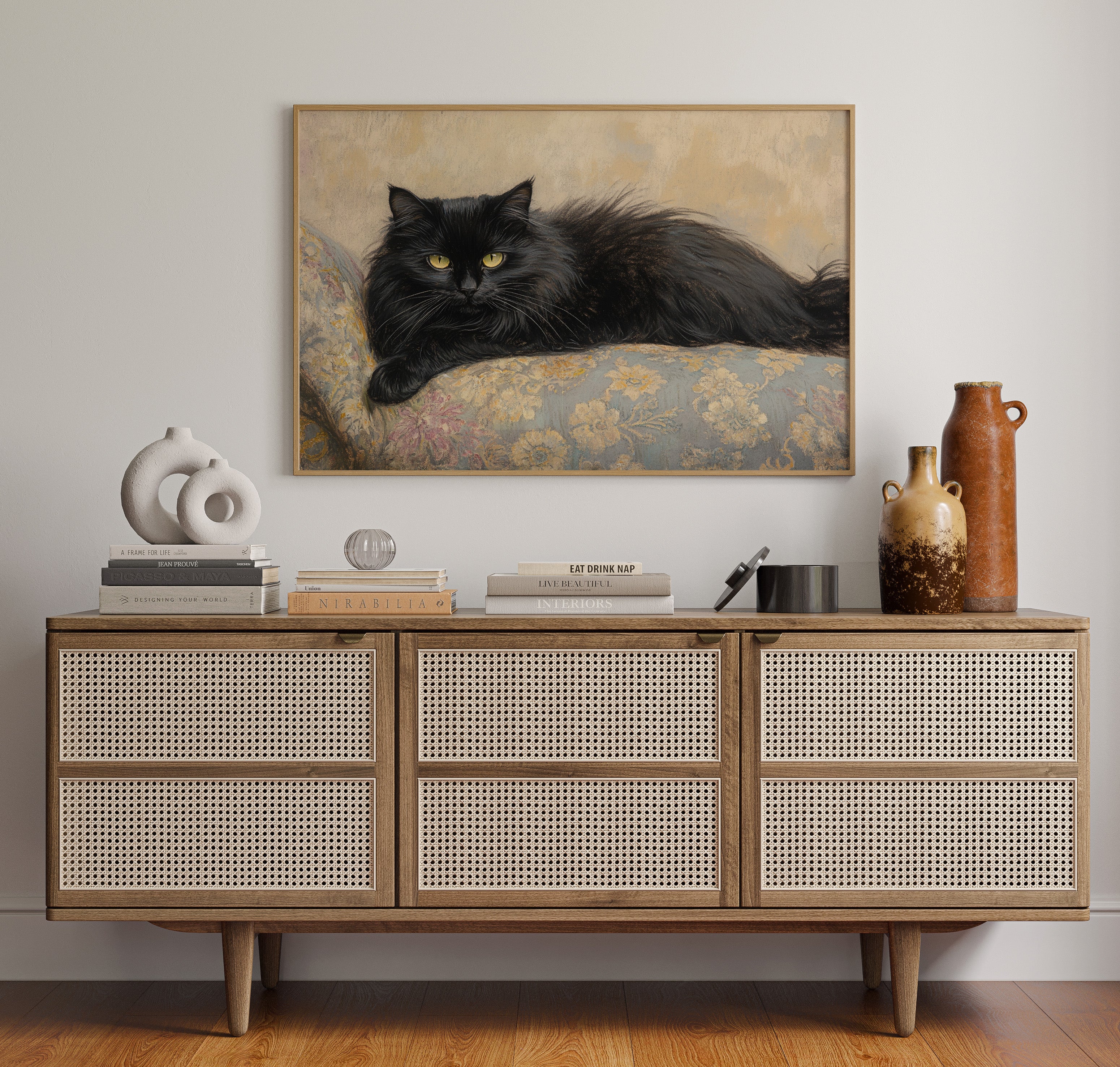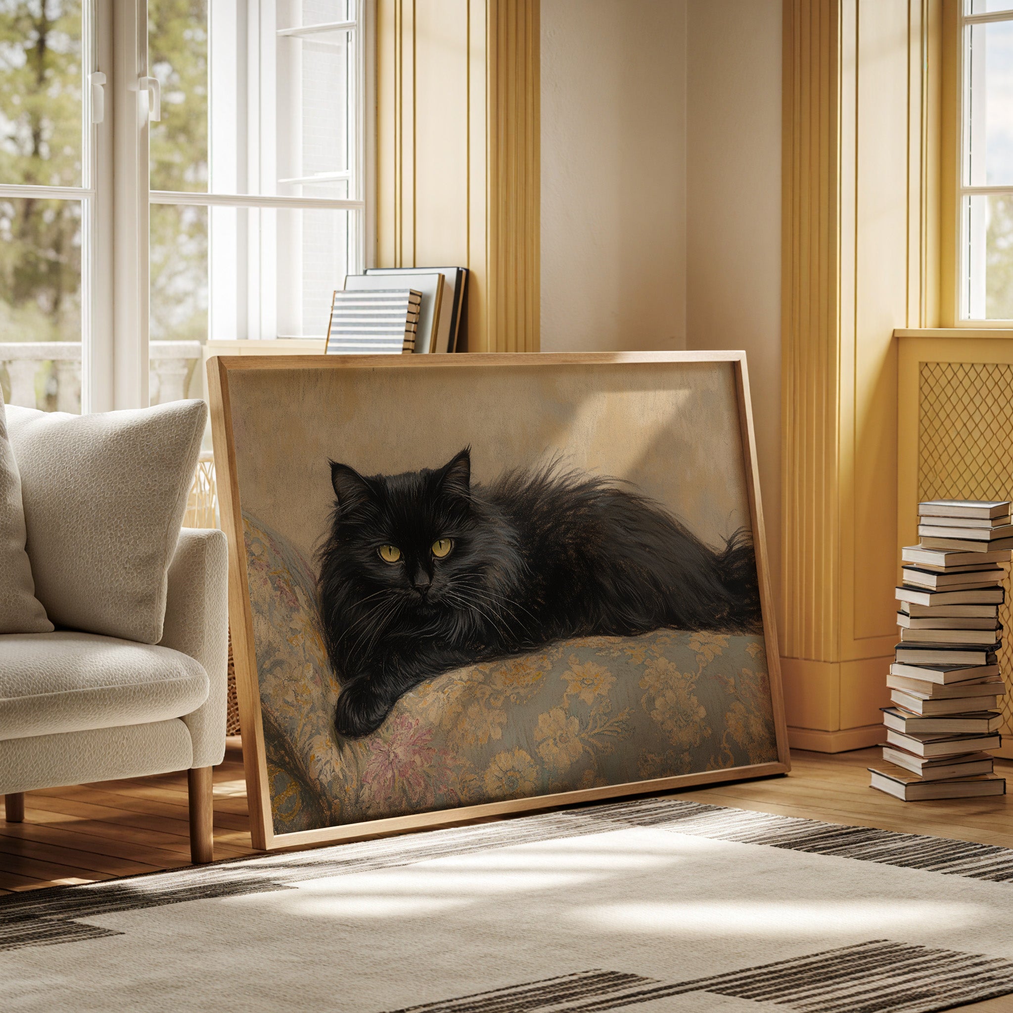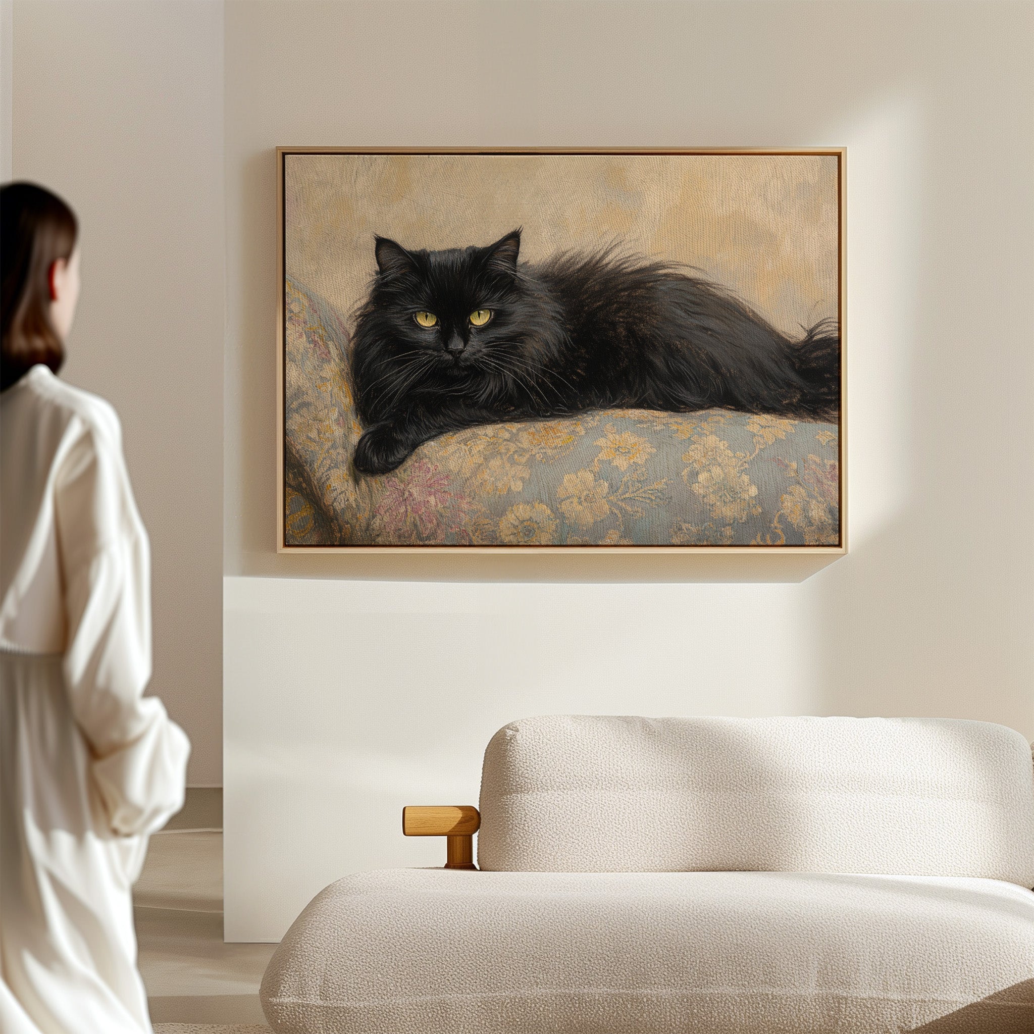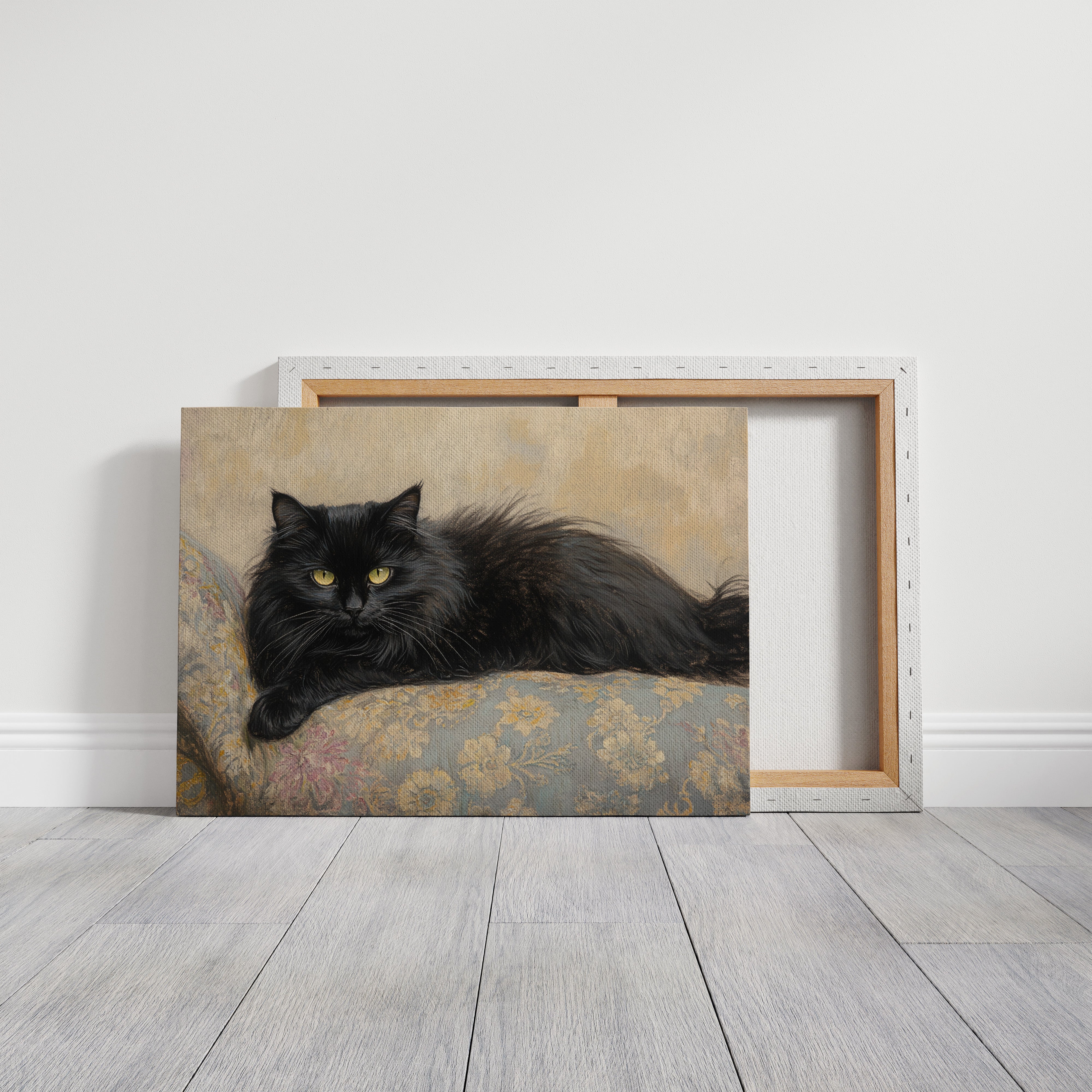 Golden eyes pierce through ebony fur, commanding attention against a backdrop of faded elegance. This regal black cat lounges with casual grace on a weathered floral settee, its long fur creating a striking contrast against the soft blue and gold damask pattern beneath. The textural interplay between the cat's silky coat and the vintage upholstery tells a story of refined domesticity, where old-world charm meets feline majesty. Perfect for adding a touch of sophisticated whimsy to a reading nook, bedroom, or any space where classic elegance meets contemporary style.