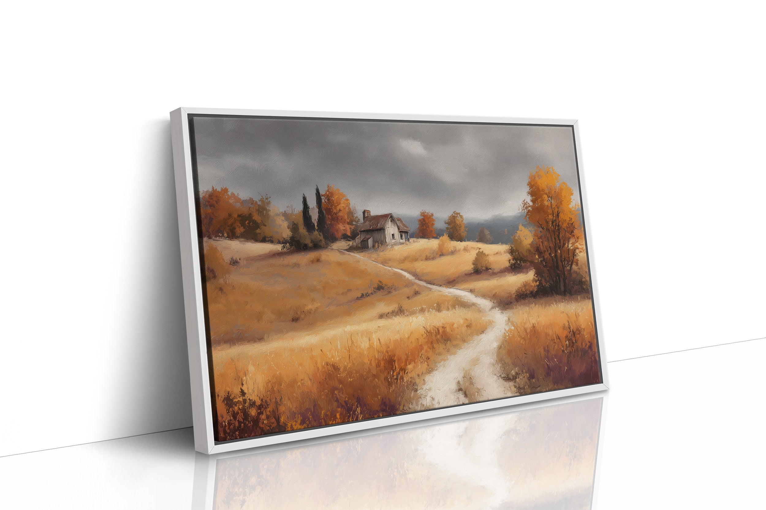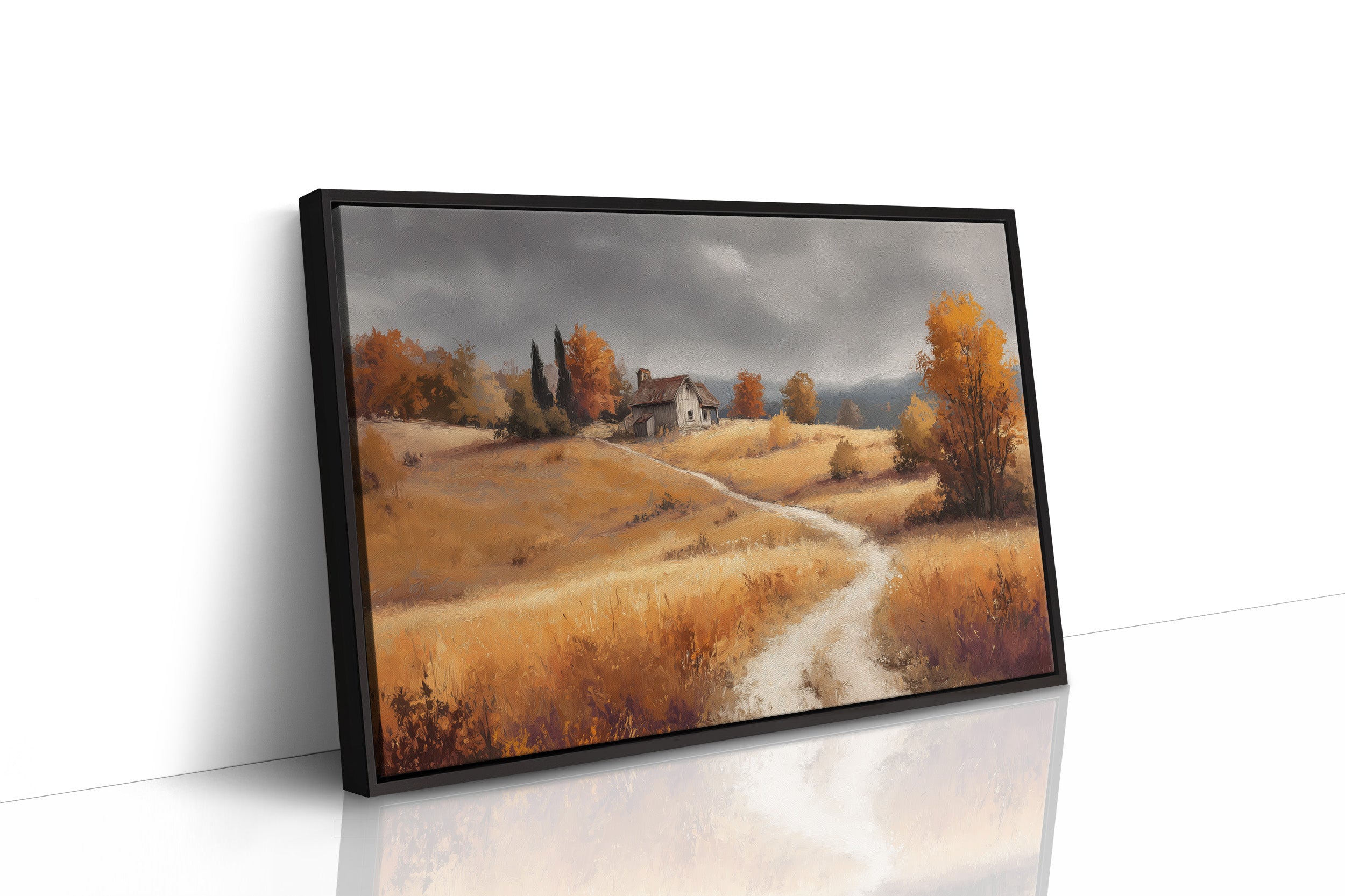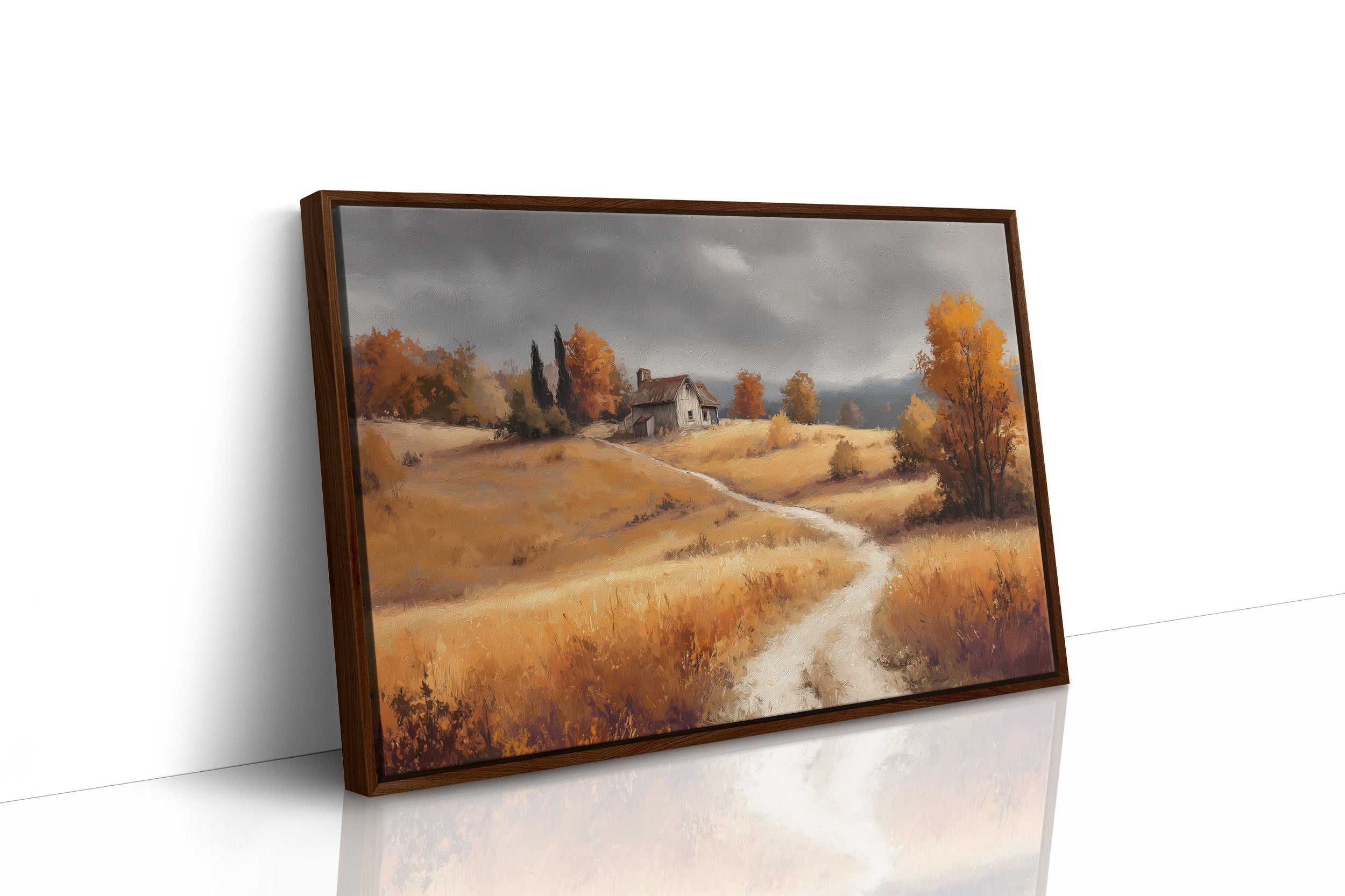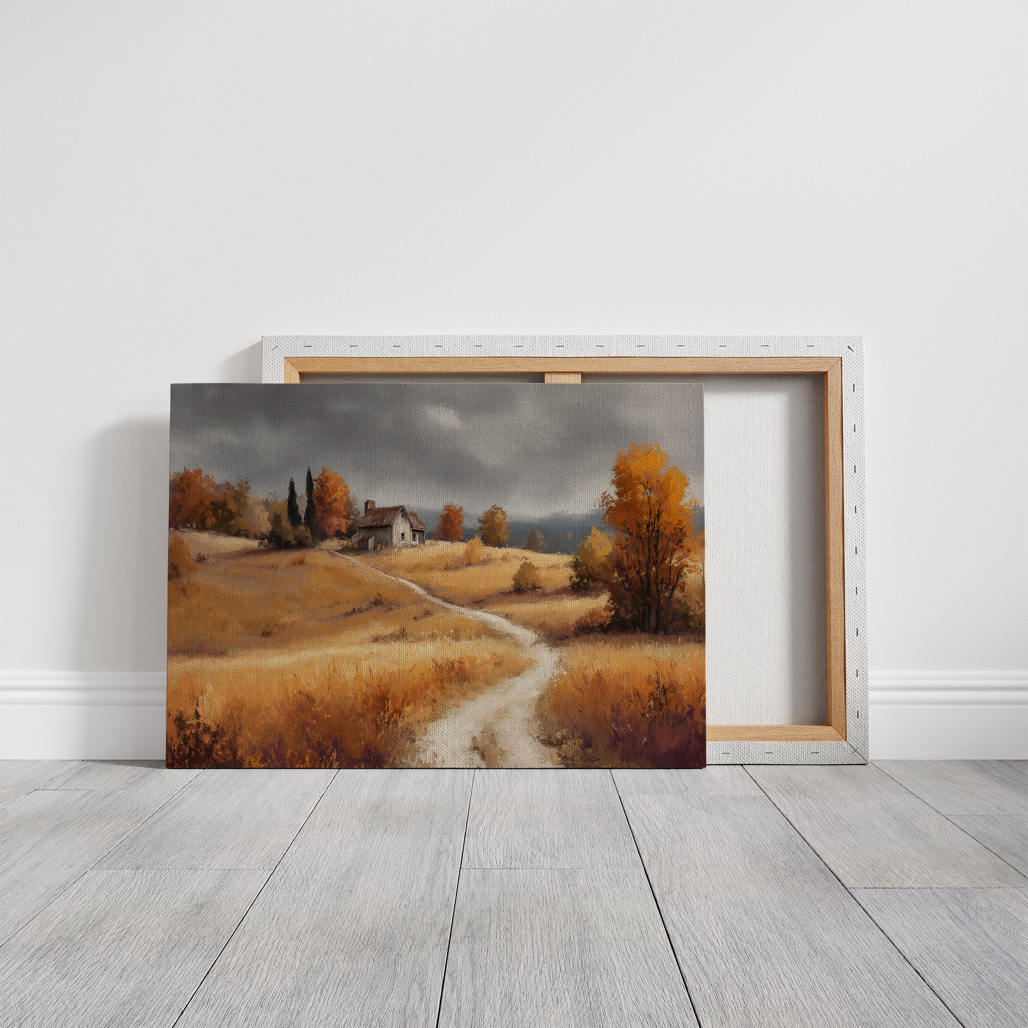 A winding path cuts through golden meadows, inviting wanderers to follow its gentle curve toward a distant farmhouse. Autumn has painted the landscape in warm amber hues, with fiery orange trees standing sentinel against a moody, cloud-laden sky. The brushstrokes capture the textural richness of tall grasses swaying in an unseen breeze, creating a nostalgic portrait of rural tranquility. This contemplative scene would bring a sense of pastoral serenity to a reading nook, study, or any space where quiet reflection is cherished.