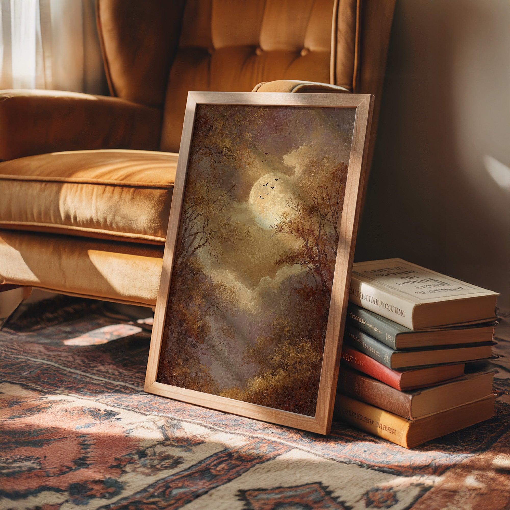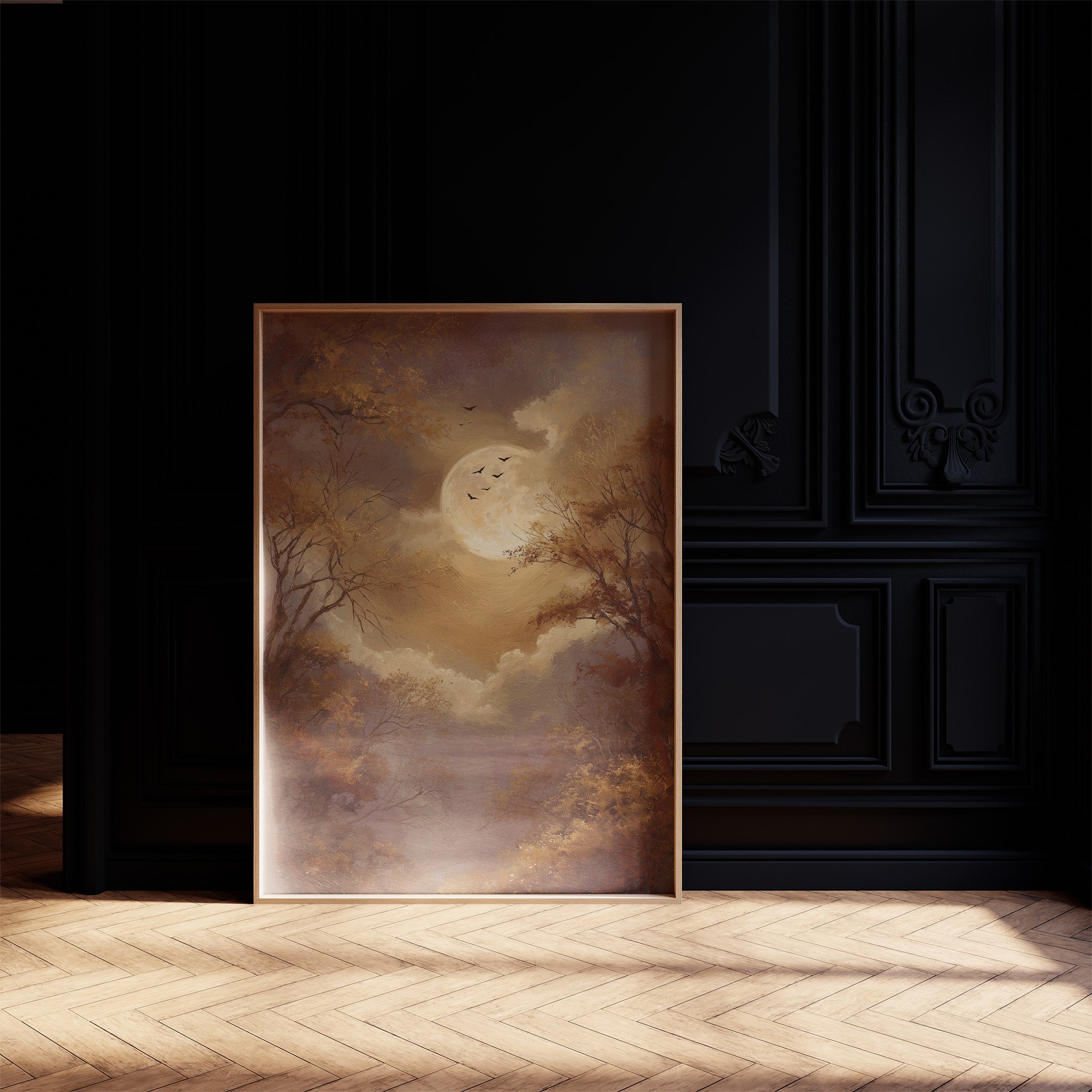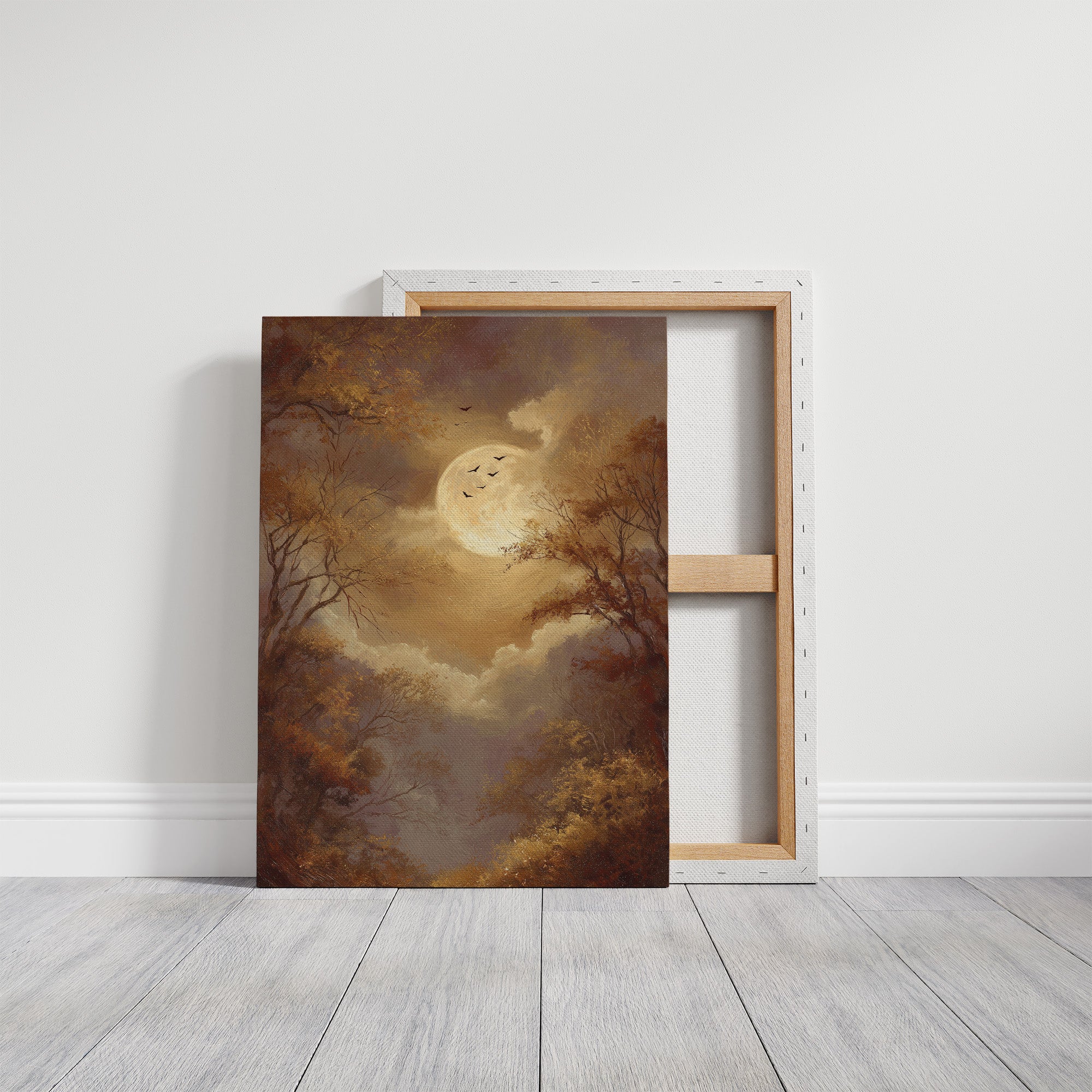 The golden glow of an autumn moon bathes the landscape in nostalgic warmth, inviting contemplation. Bare branches reach toward the luminous orb like outstretched fingers, while birds drift across the sepia sky, free in their silent migration. The muted palette of amber, bronze, and dusky purple creates a dreamlike atmosphere where time seems suspended between seasons.