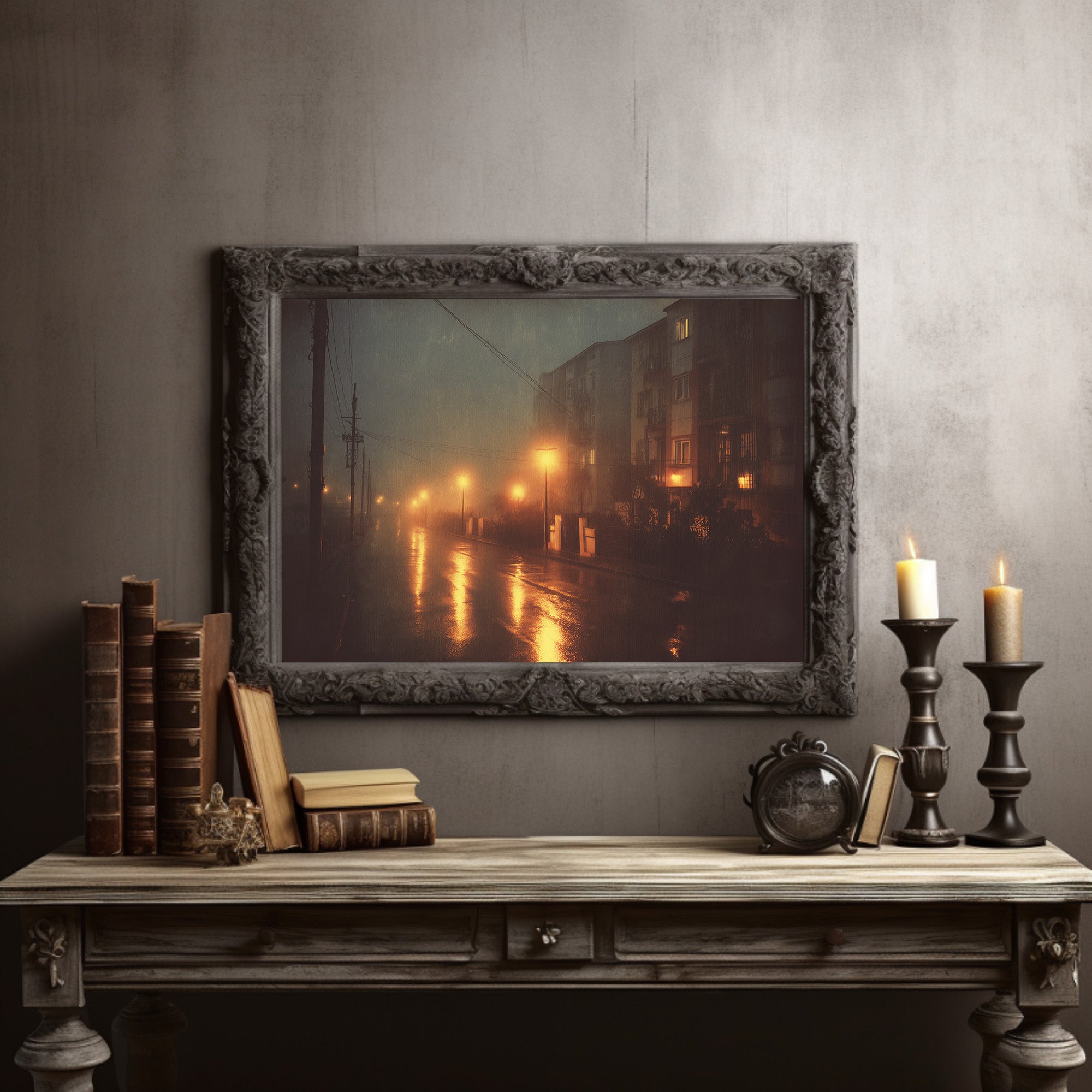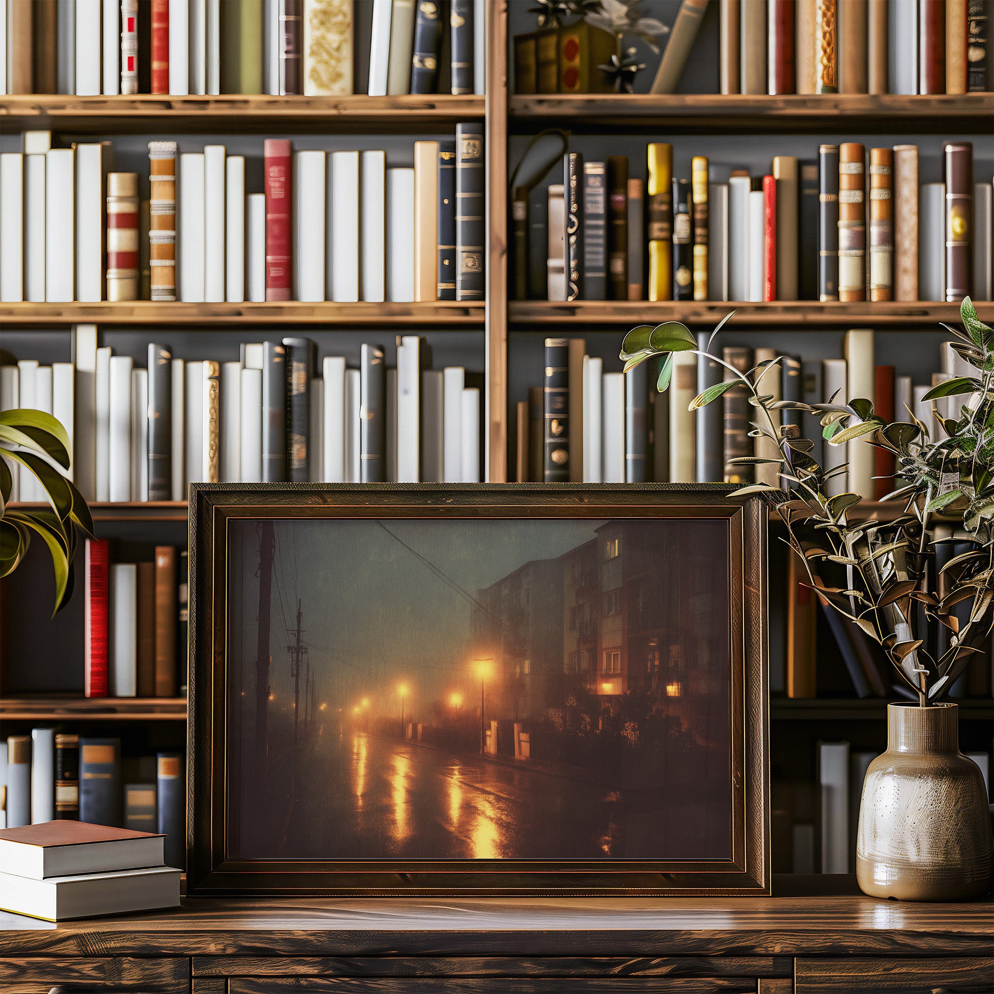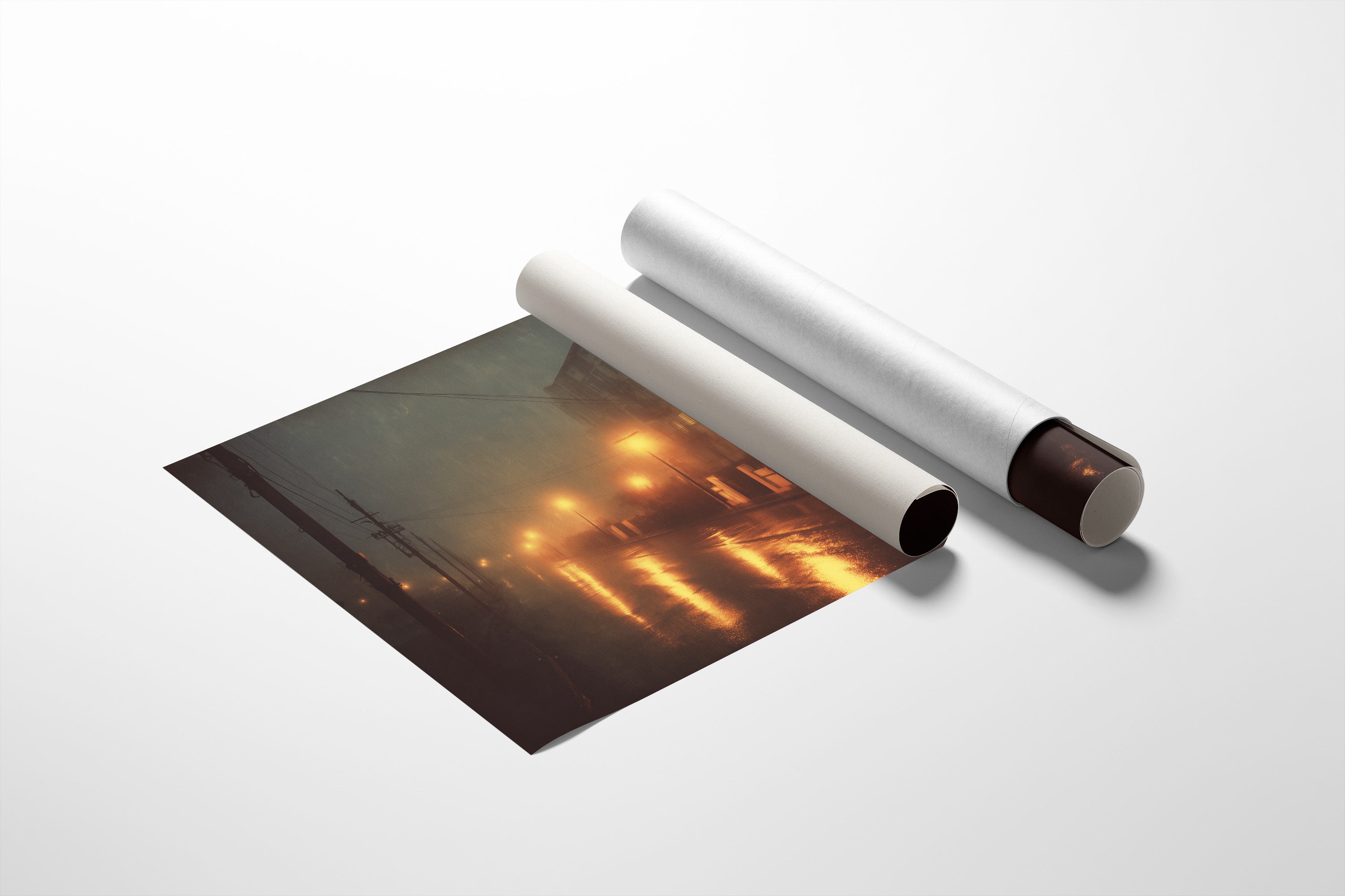 A moment suspended in time where rain-slicked streets reflect the golden glow of streetlamps through evening fog. The amber lights create luminous pools across the wet pavement, transforming an ordinary night into something hauntingly beautiful. Buildings stand sentinel in the mist, their windows offering warm squares of light against the darkness, while telephone poles create a rhythmic procession into the distance. This evocative scene would bring contemplative warmth to a study or reading nook, inviting quiet reflection on rainy evenings at home.
