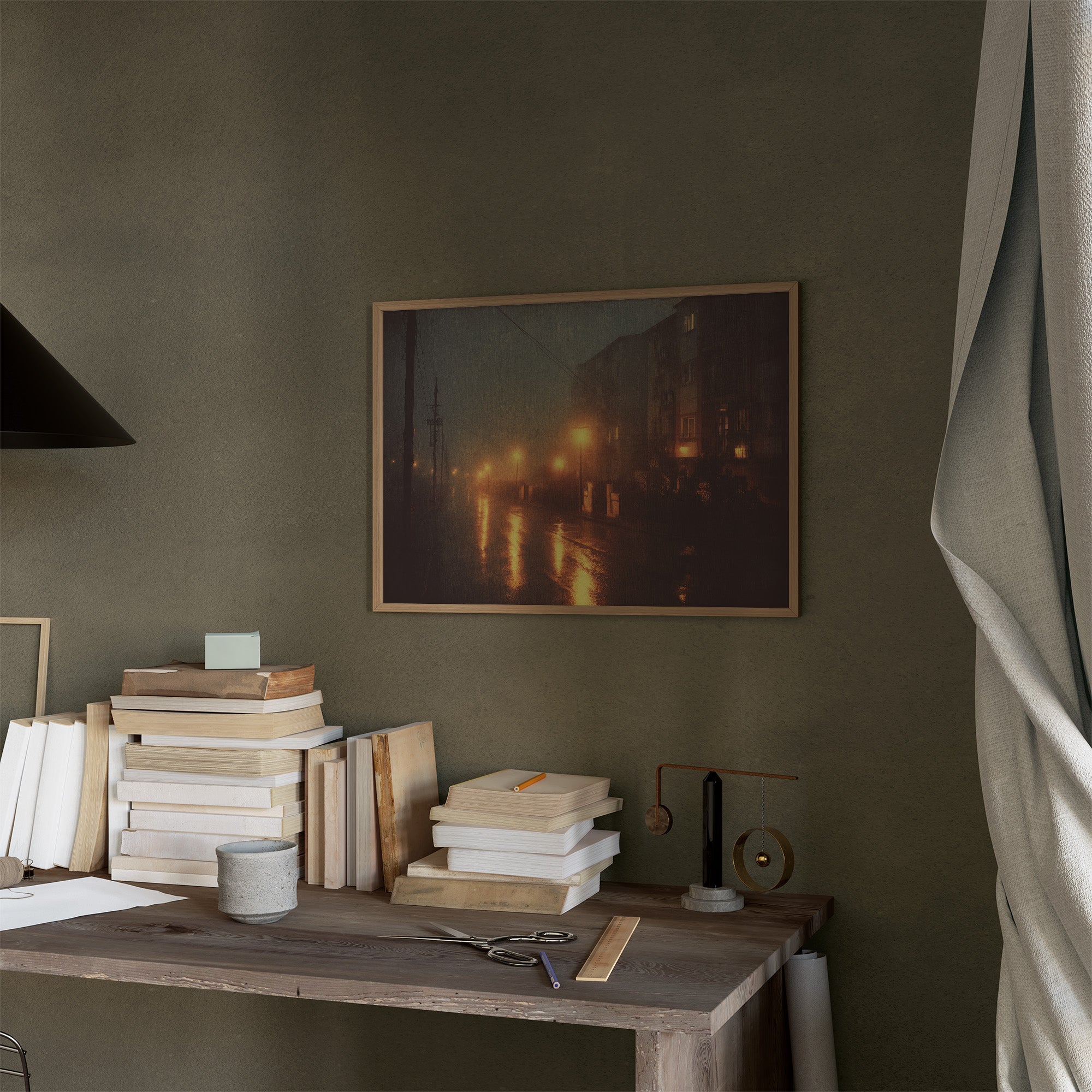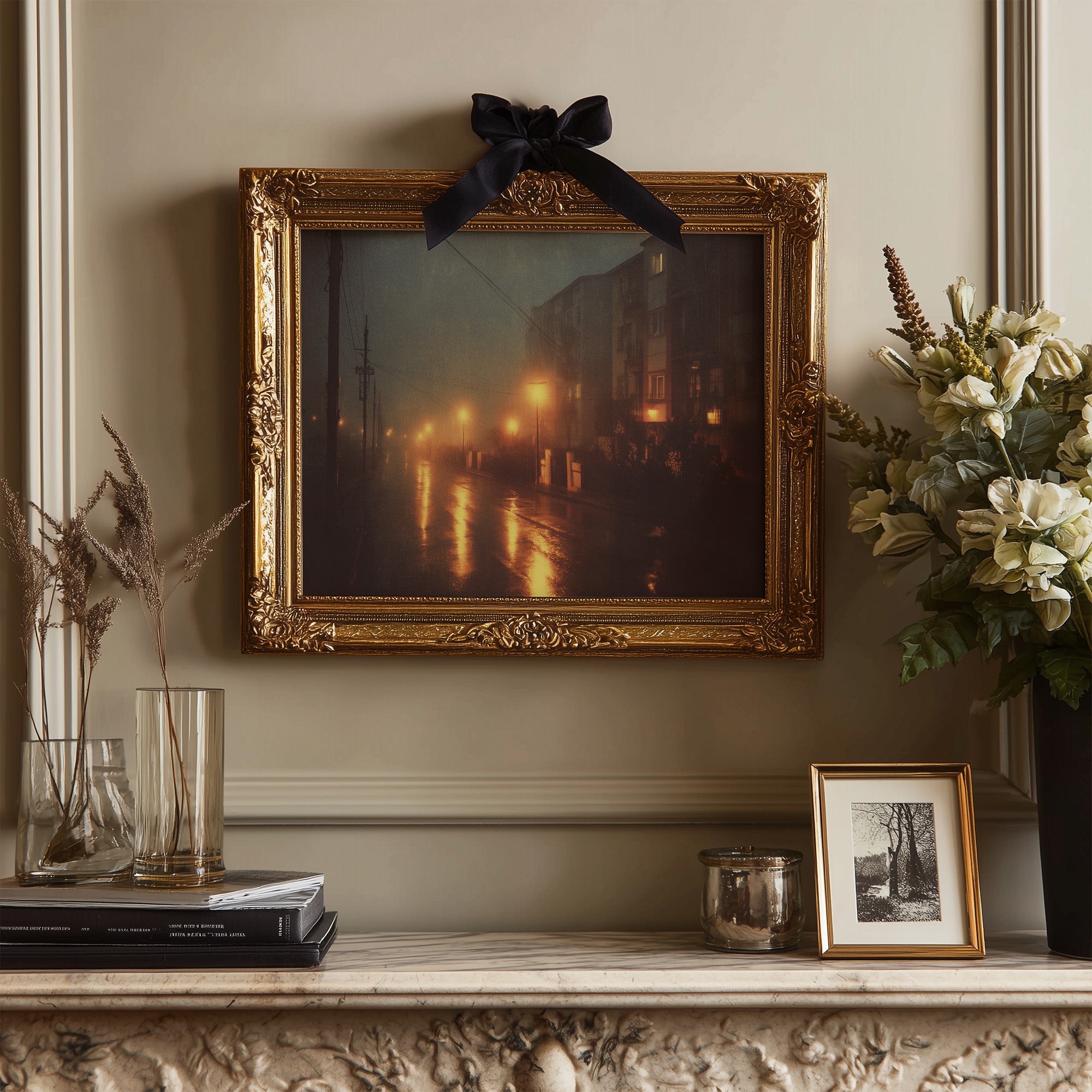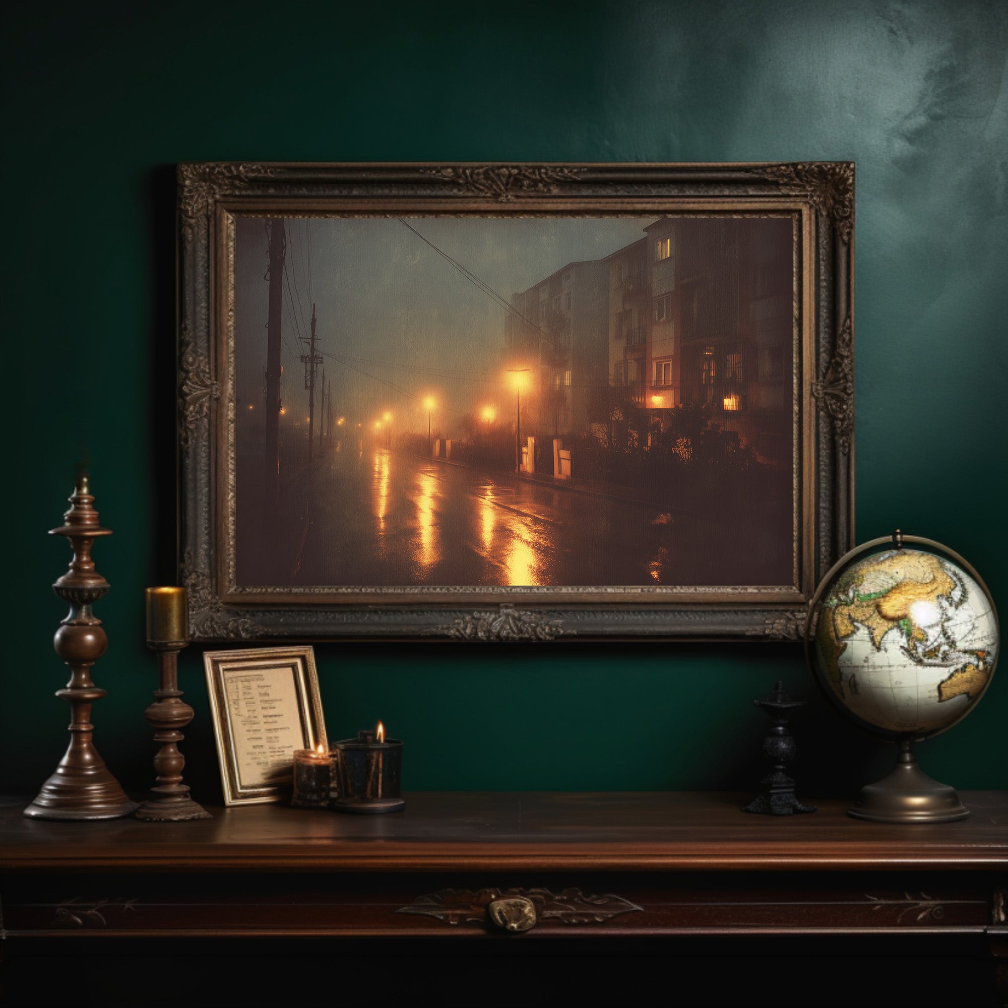 A moment suspended in time where rain-slicked streets reflect the golden glow of streetlamps through evening fog. The amber lights create luminous pools across the wet pavement, transforming an ordinary night into something hauntingly beautiful. Buildings stand sentinel in the mist, their windows offering warm squares of light against the darkness, while telephone poles create a rhythmic procession into the distance. This evocative scene would bring contemplative warmth to a study or reading nook, inviting quiet reflection on rainy evenings at home.