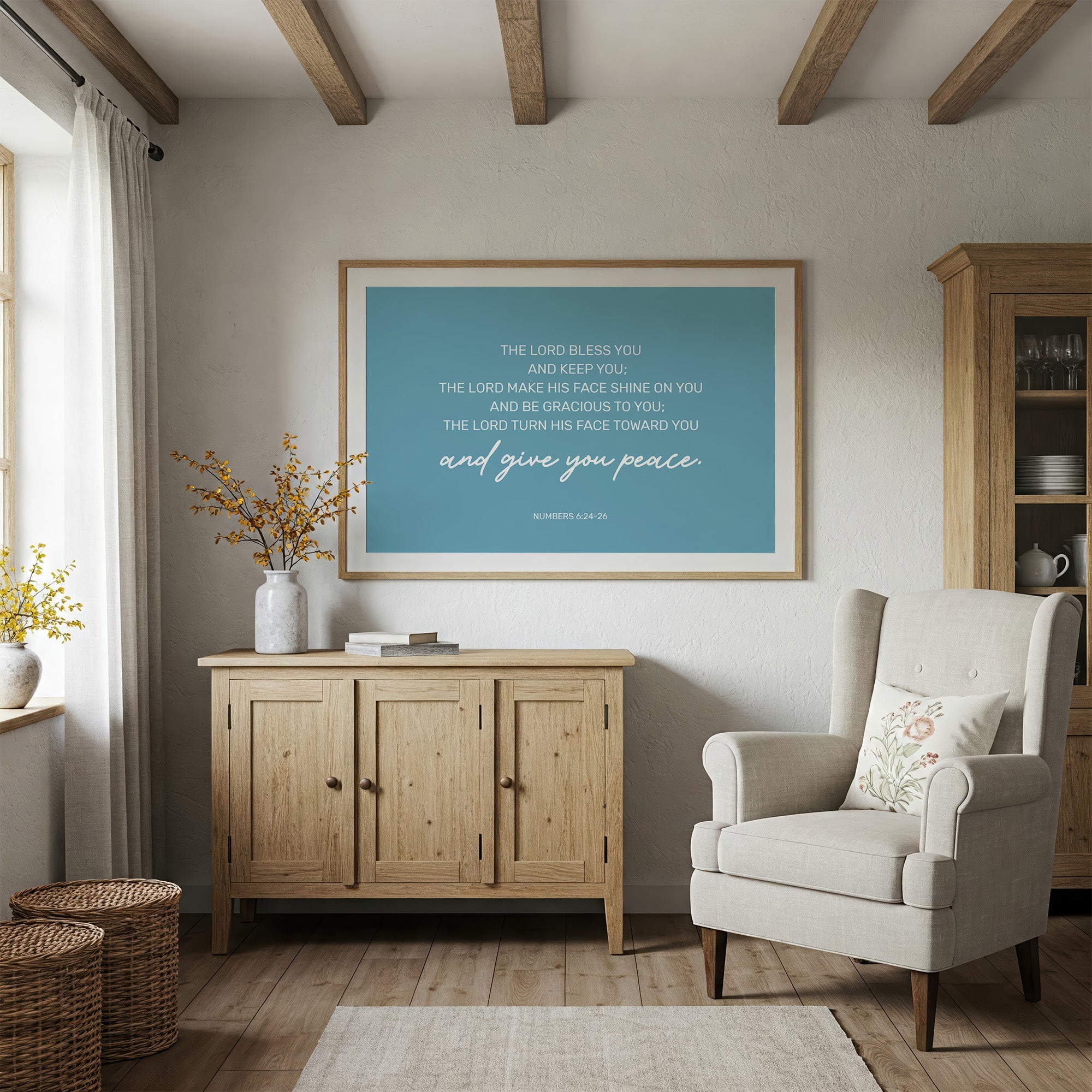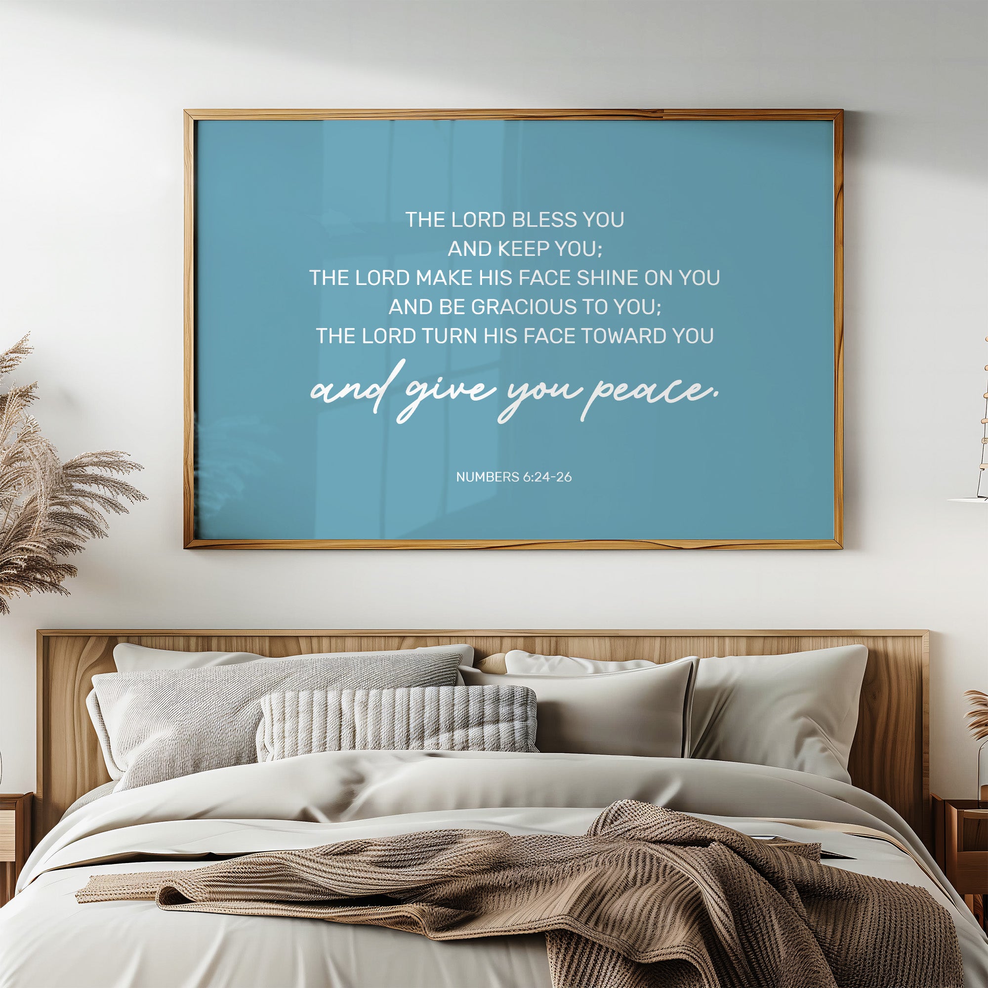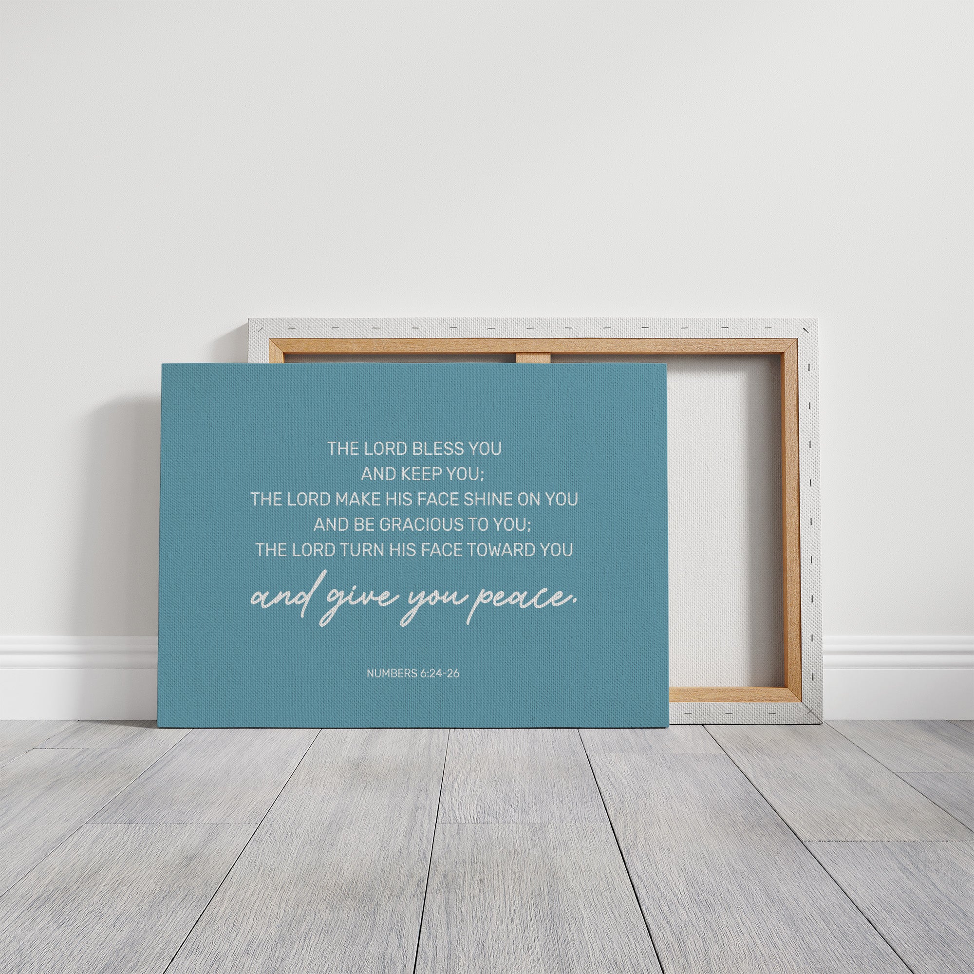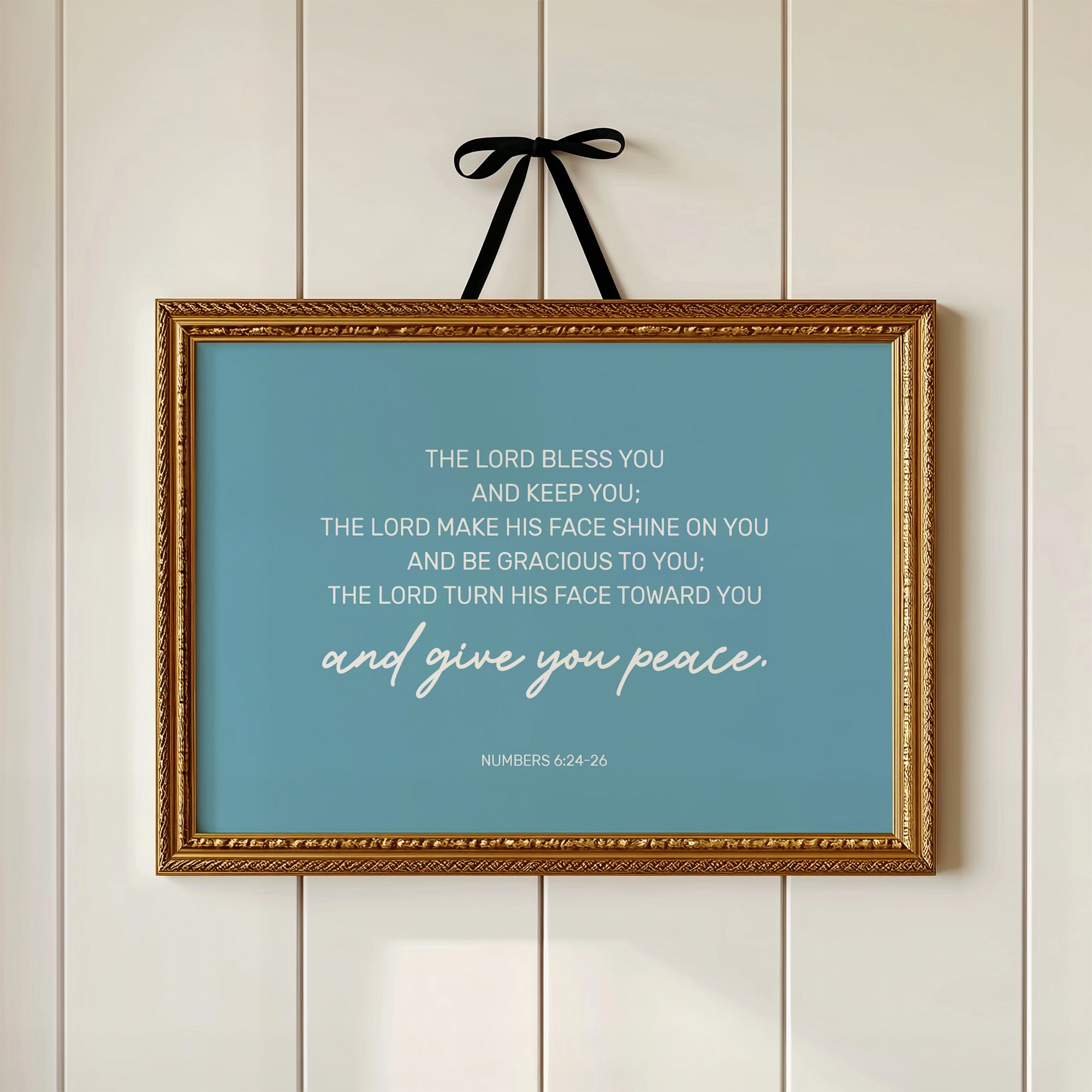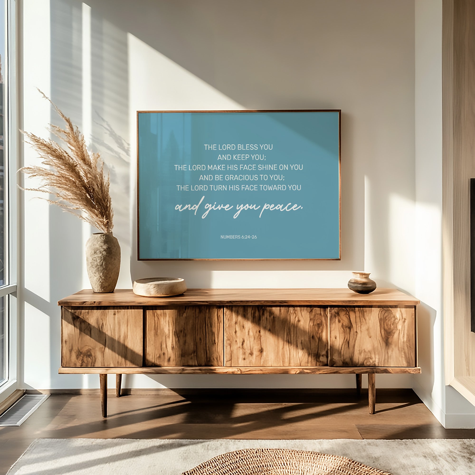 The sacred words float like gentle waves across a serene teal backdrop, offering comfort in their timeless promise. White typography creates a beautiful contrastbold proclamations of divine care paired with the flowing script of "and give you peace" that seems to dance across the canvas. This modern rendering of the Aaronic blessing from Numbers 6:24-26 transforms biblical wisdom into a visual meditation on grace and tranquility.
