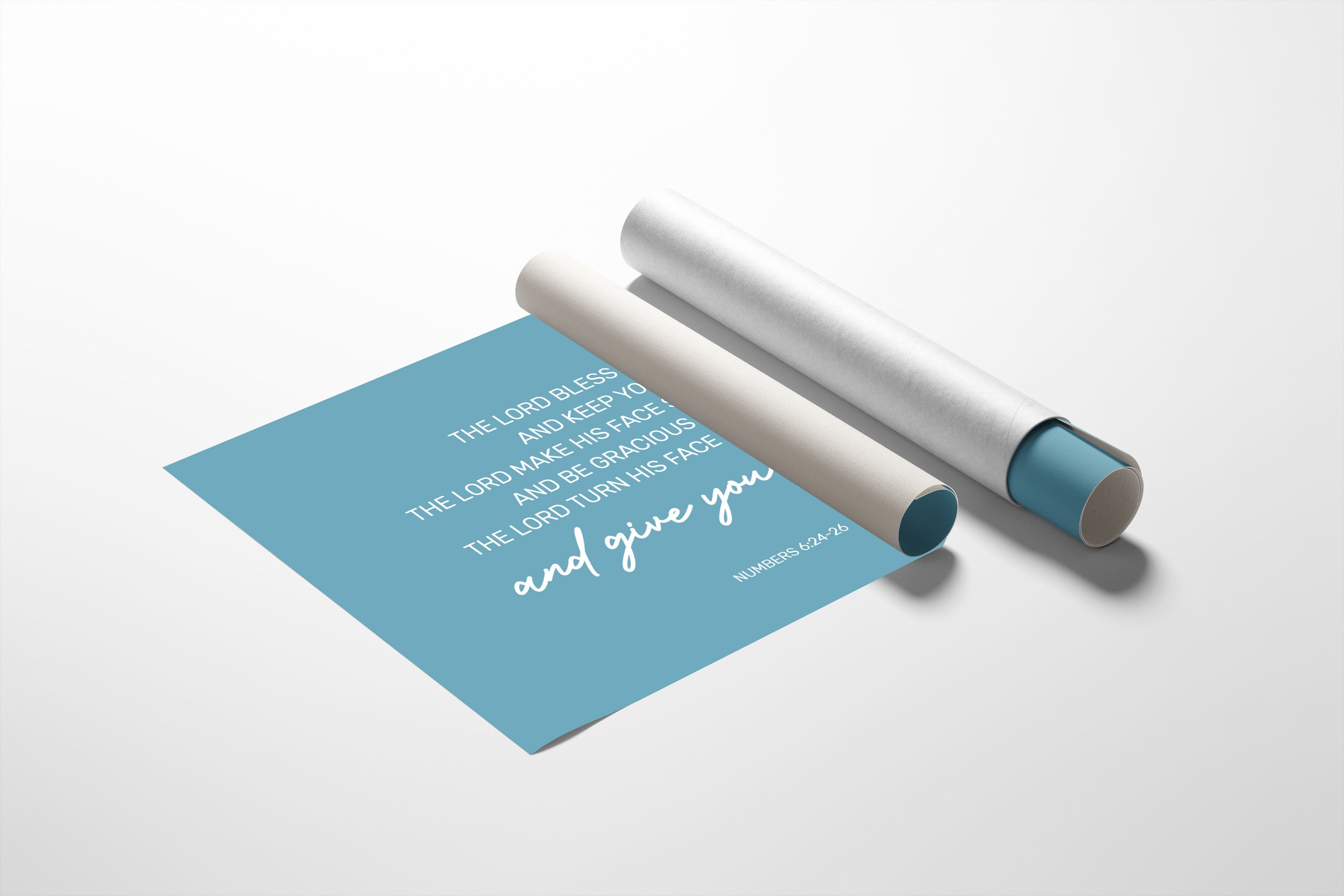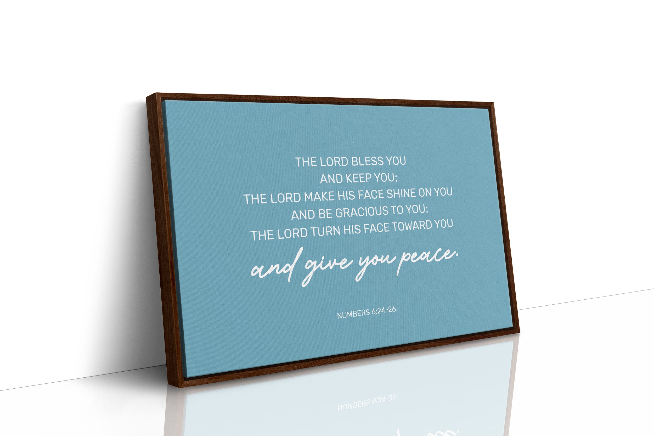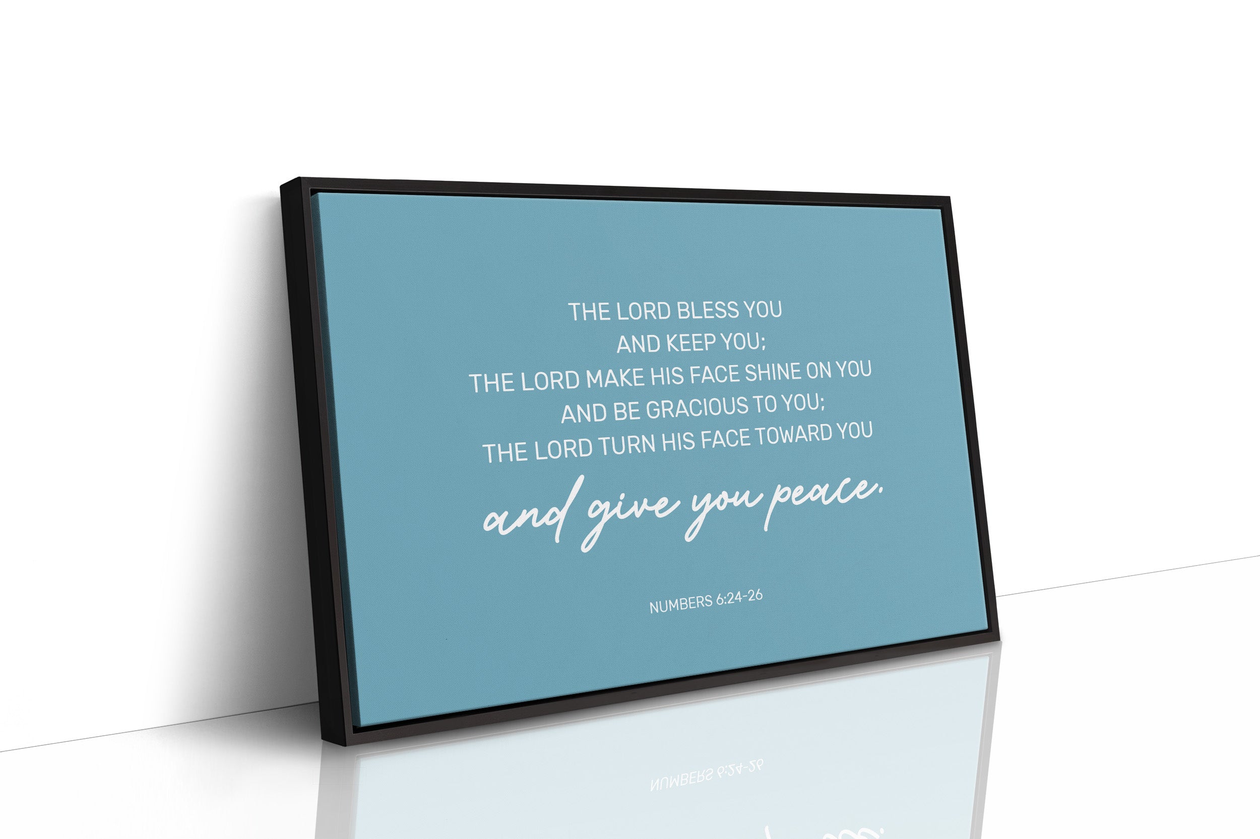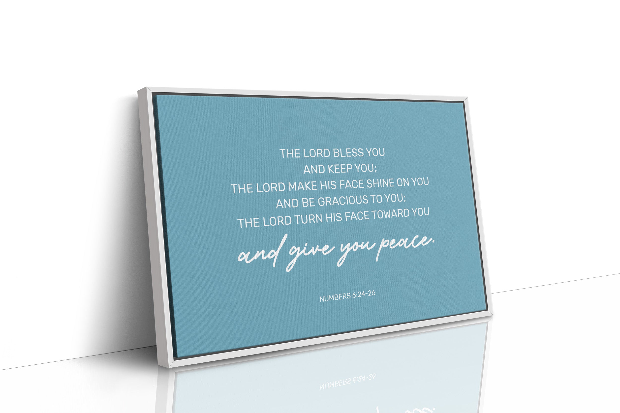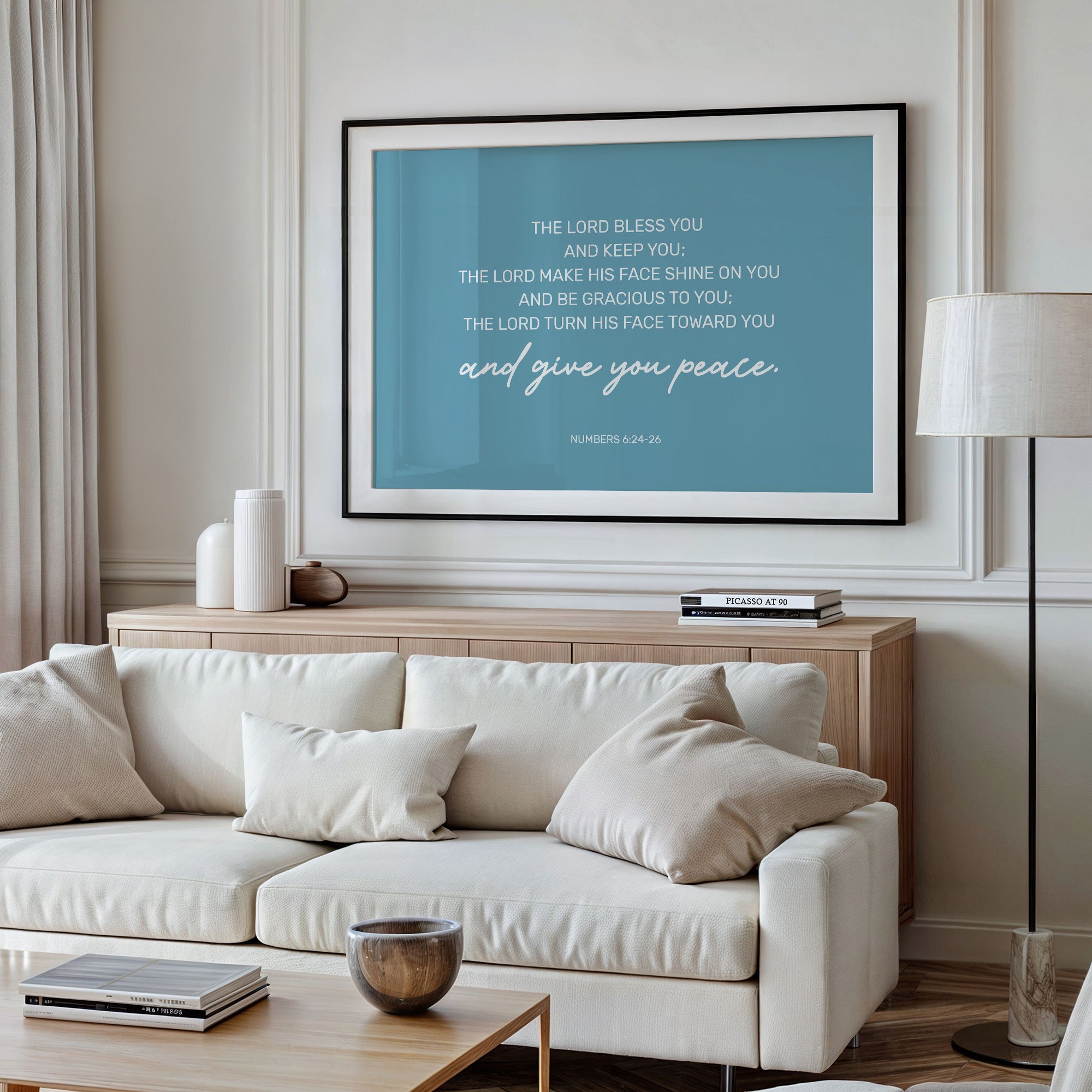 The sacred words float like gentle waves across a serene teal backdrop, offering comfort in their timeless promise. White typography creates a beautiful contrastbold proclamations of divine care paired with the flowing script of "and give you peace" that seems to dance across the canvas. This modern rendering of the Aaronic blessing from Numbers 6:24-26 transforms biblical wisdom into a visual meditation on grace and tranquility.