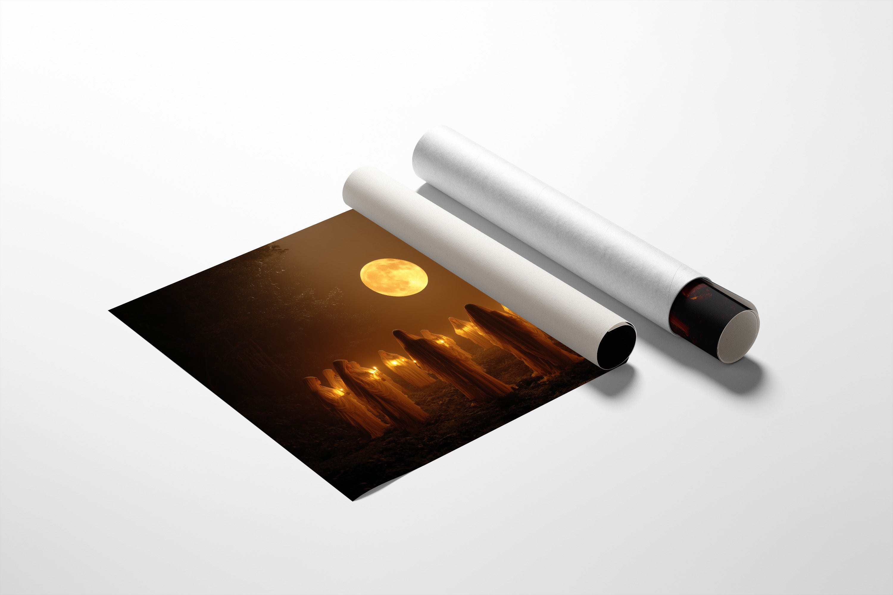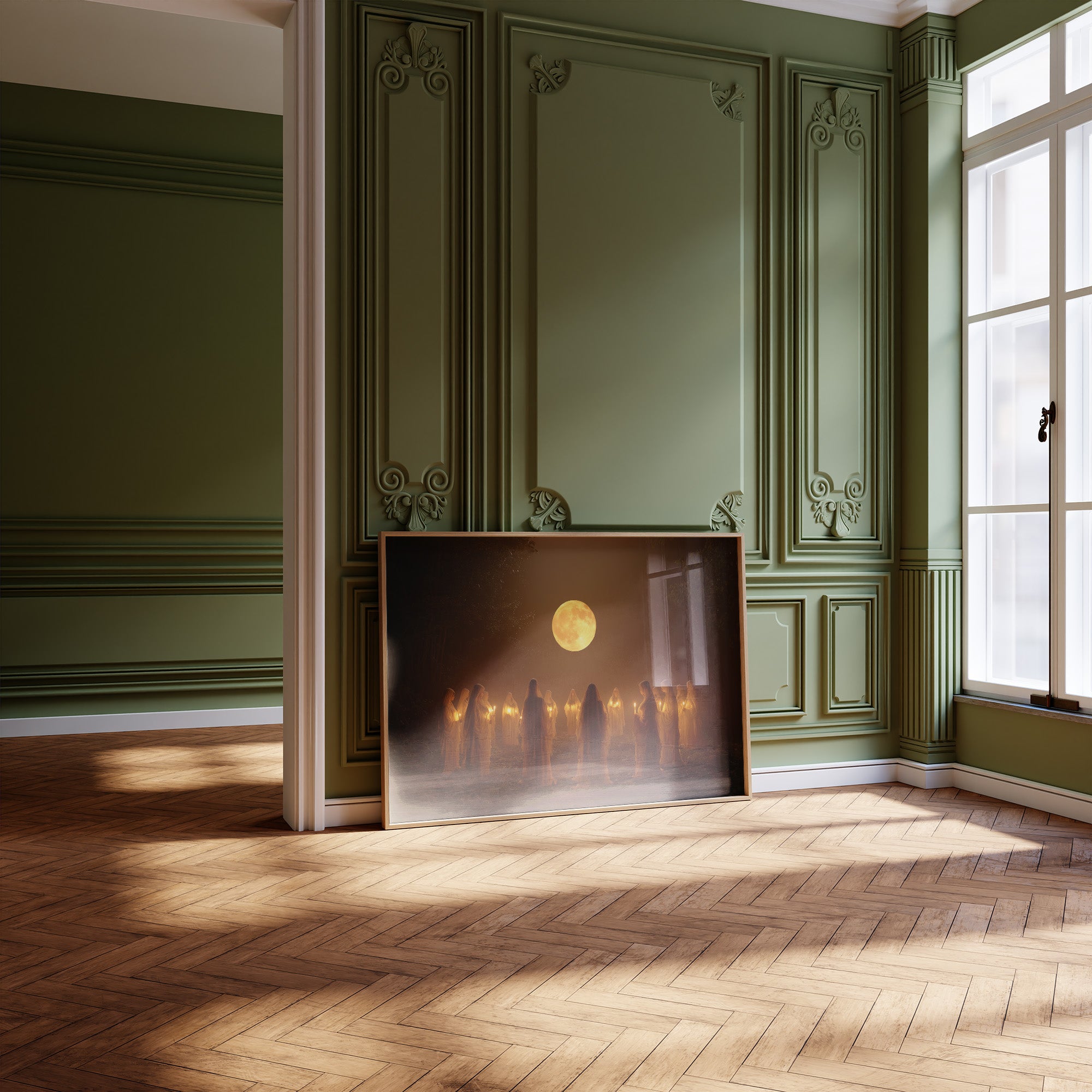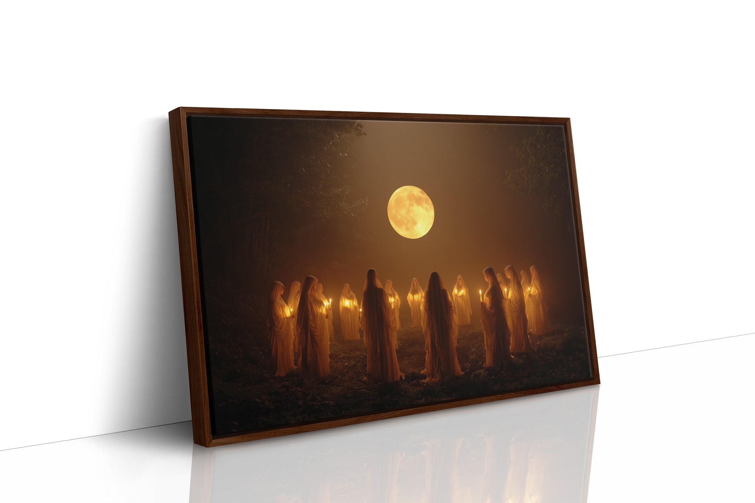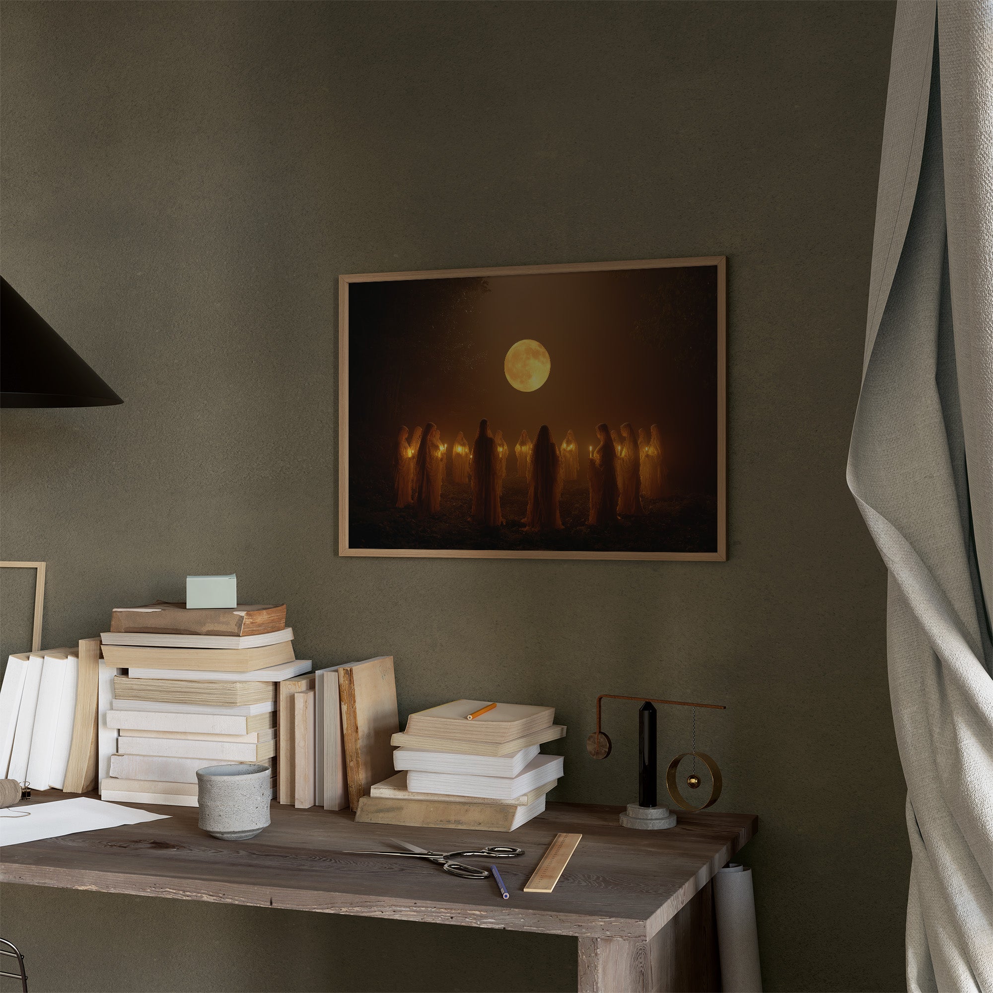 Robed figures stand transfixed in a sacred gathering, their silhouettes illuminated by the golden glow of a perfect full moon. The mysterious assembly creates a powerful contrast against the dark landscape, each figure holding light that seems to both protect and connect them in their ritual. Displayed prominently against a backdrop of literary knowledge, this evocative piece bridges the mystical and intellectual worlds. Perfect for a contemplative study, reading nook, or as a conversation-starting focal point in a modern living space.