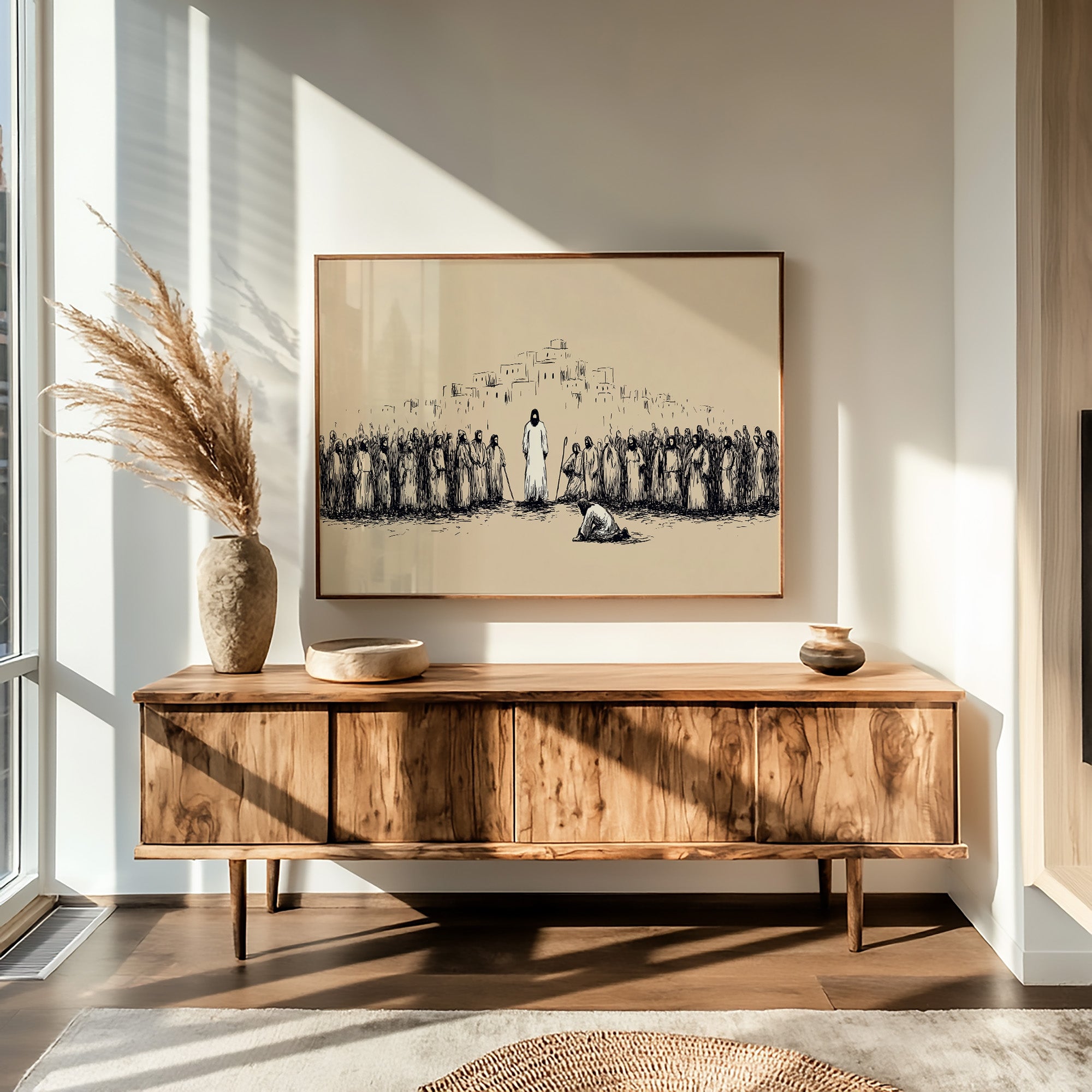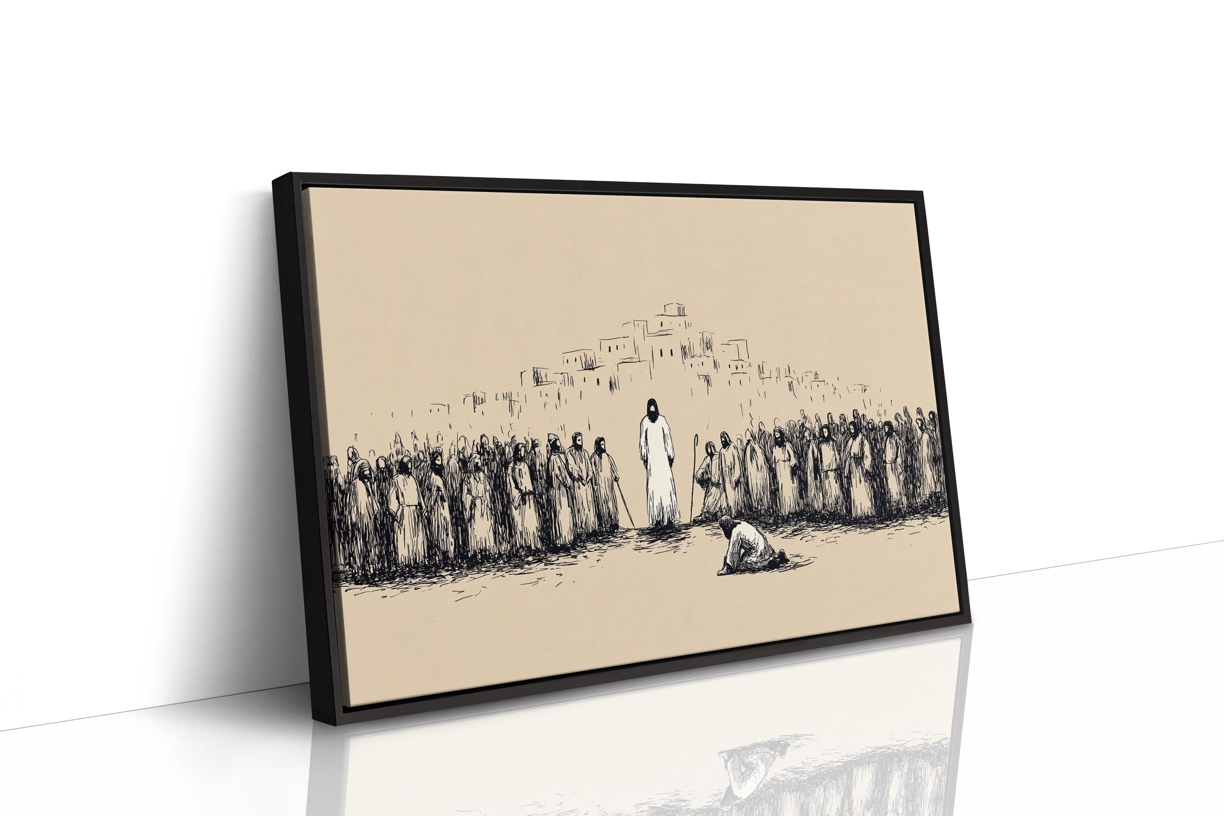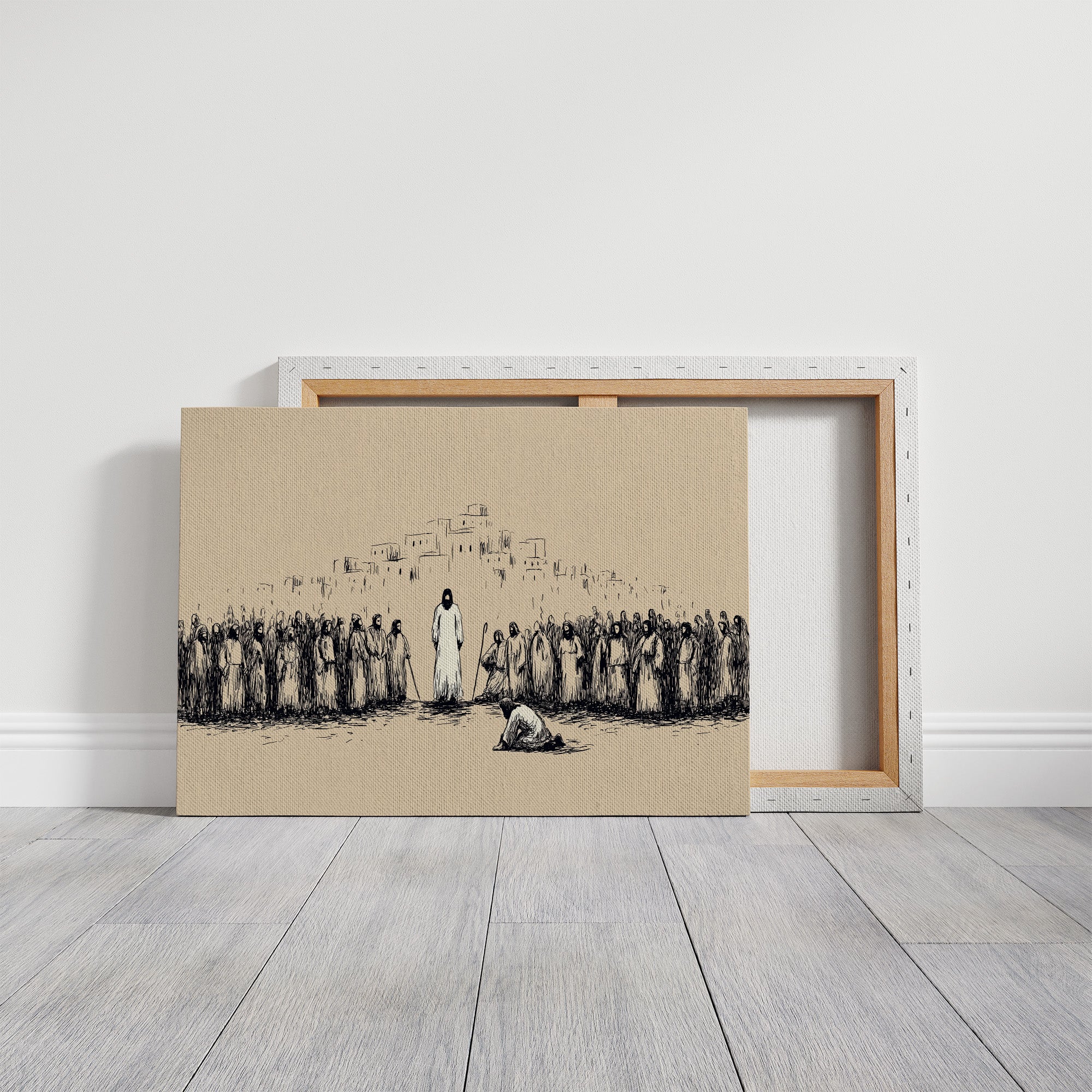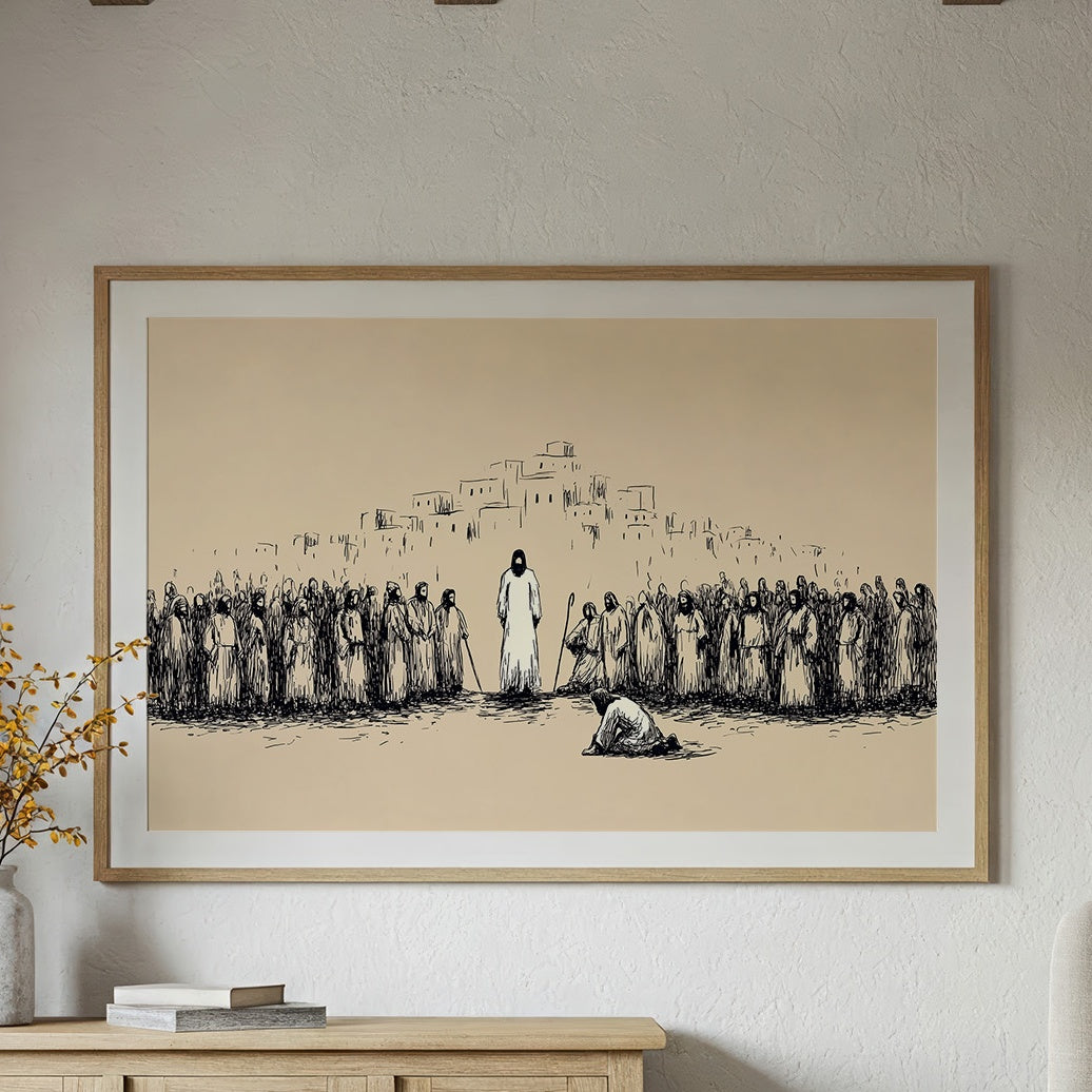 Silence falls across the dusty plain as a moment of profound reverence unfolds. Simple ink lines capture the weight of the gathering, where robed figures stand witness to an act of devotion before the central figure. The minimalist sketch style creates tension between the sparse beige background and bold black strokes, evoking the timeless quality of sacred texts and spiritual narratives. This contemplative piece brings a sense of historical depth and spiritual reflection to a study, meditation space, or any room where quiet contemplation is valued.