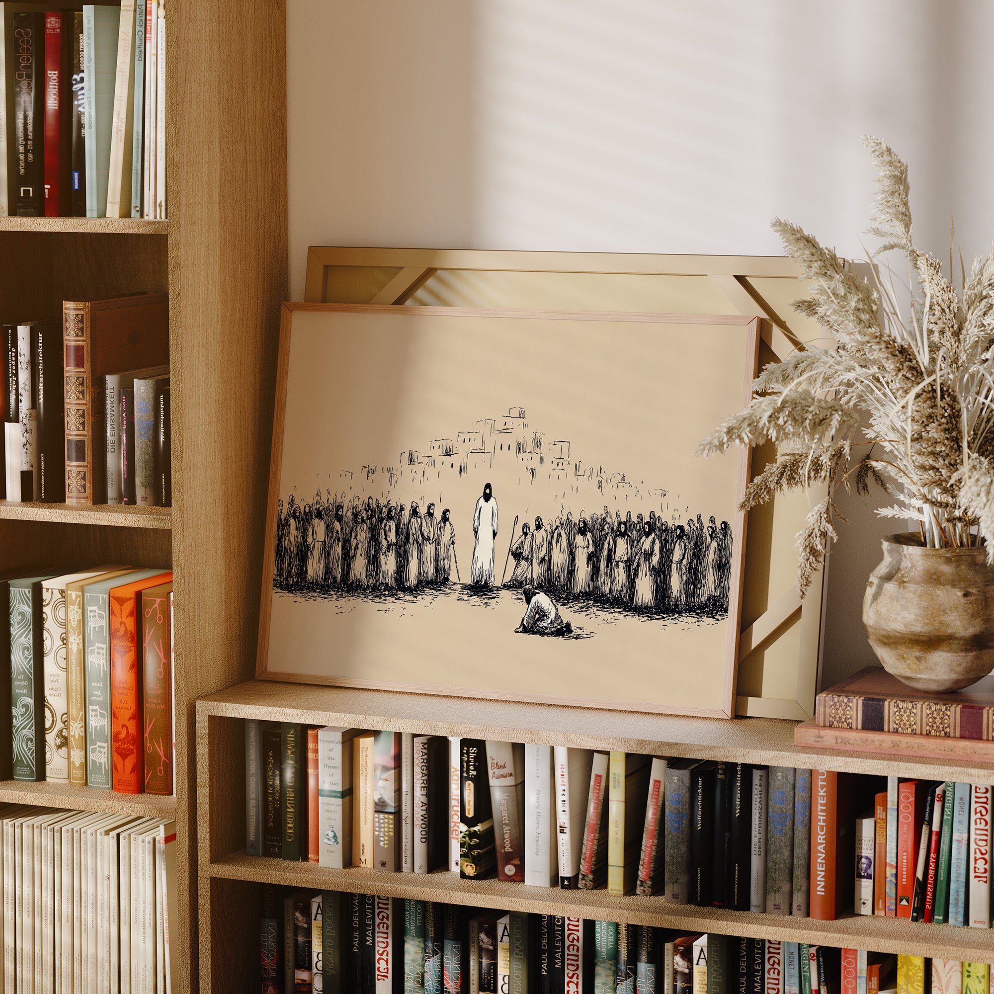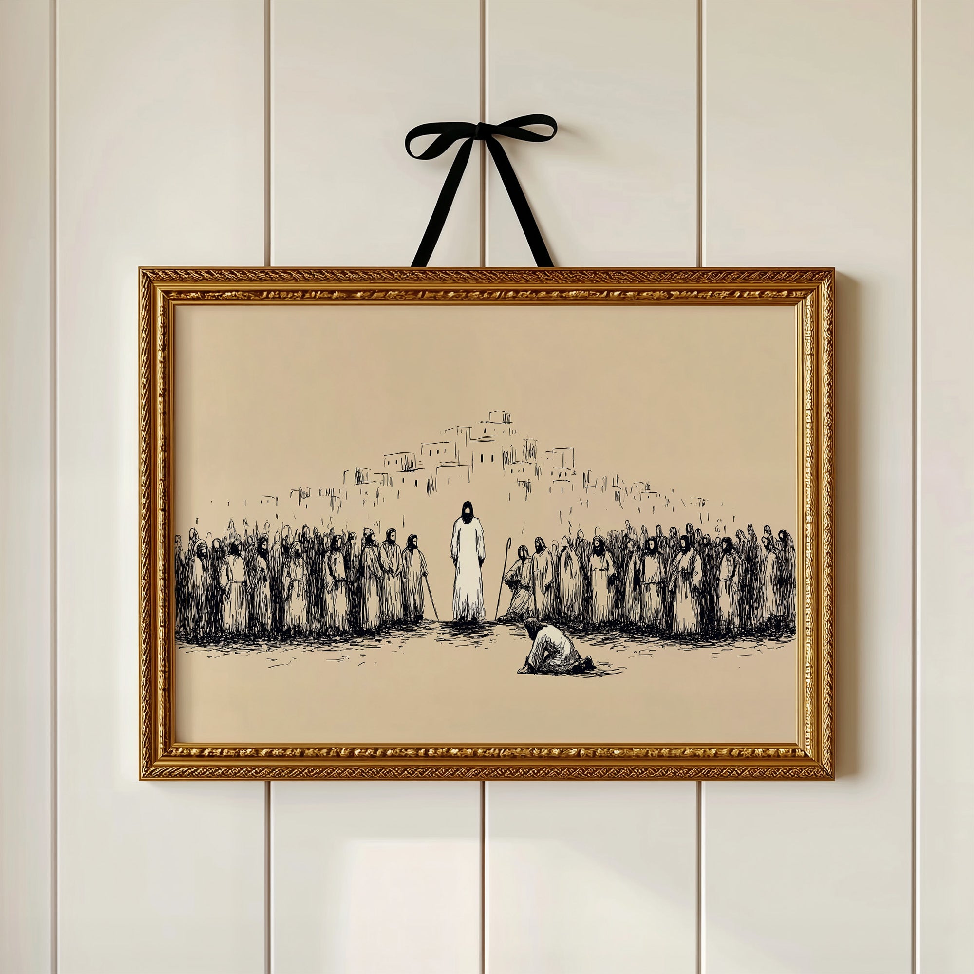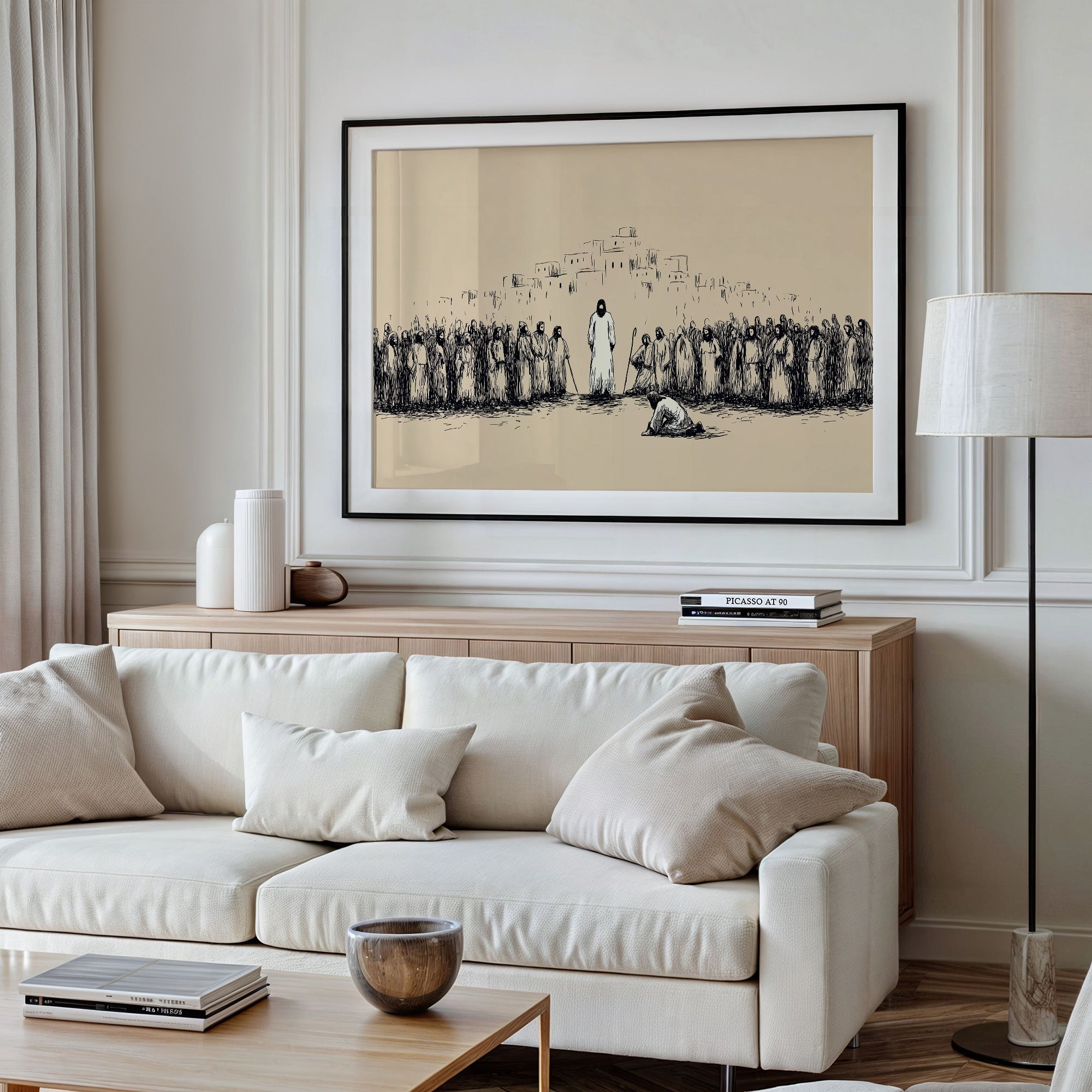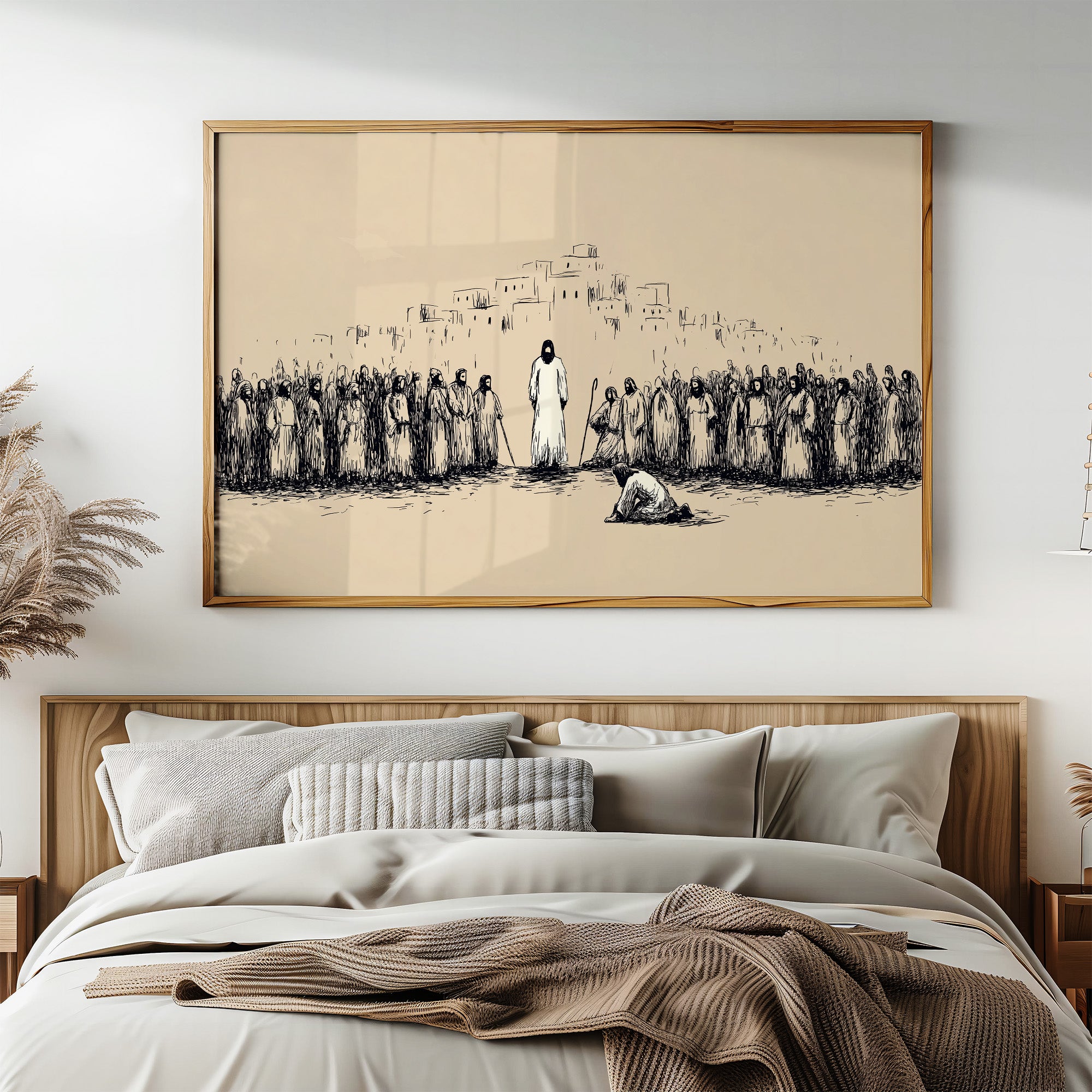 Silence falls across the dusty plain as a moment of profound reverence unfolds. Simple ink lines capture the weight of the gathering, where robed figures stand witness to an act of devotion before the central figure. The minimalist sketch style creates tension between the sparse beige background and bold black strokes, evoking the timeless quality of sacred texts and spiritual narratives. This contemplative piece brings a sense of historical depth and spiritual reflection to a study, meditation space, or any room where quiet contemplation is valued.