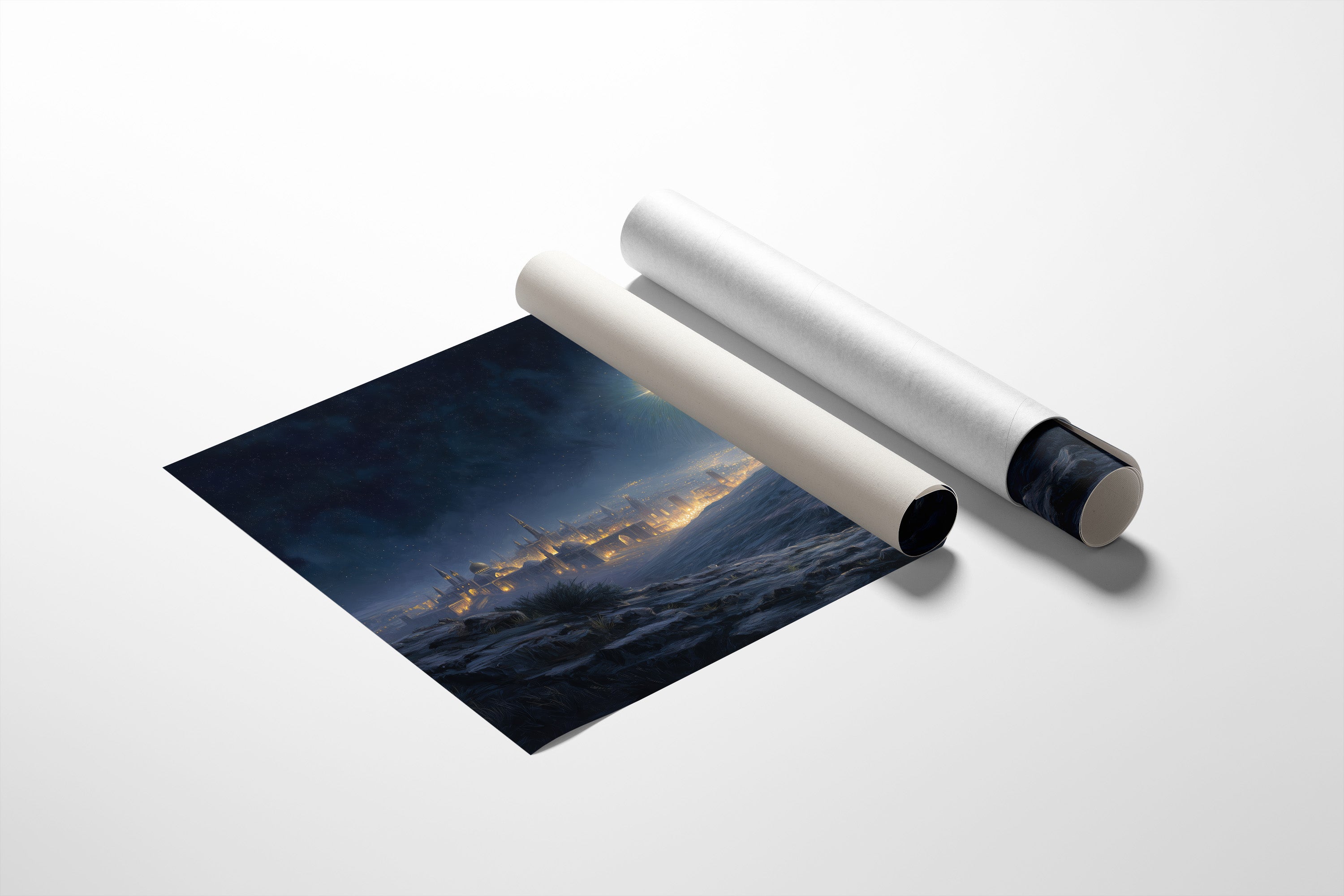 A brilliant celestial beacon pierces the deep indigo night, casting golden light over a sleeping medieval city. The rugged terrain unfolds in mysterious shadows while distant spires and towers gleam with warm candlelight beneath the cosmic display. This ethereal scene captures the precise moment when heaven and earth seem to touch, creating a bridge between the celestial and terrestrial worlds. The perfect balance of darkness and radiance transforms an ordinary cityscape into a realm of wonder and possibility. This captivating piece brings a sense of magic and contemplation to any space, particularly suited for a study or meditation room where its mysterious beauty can inspire deep reflection.