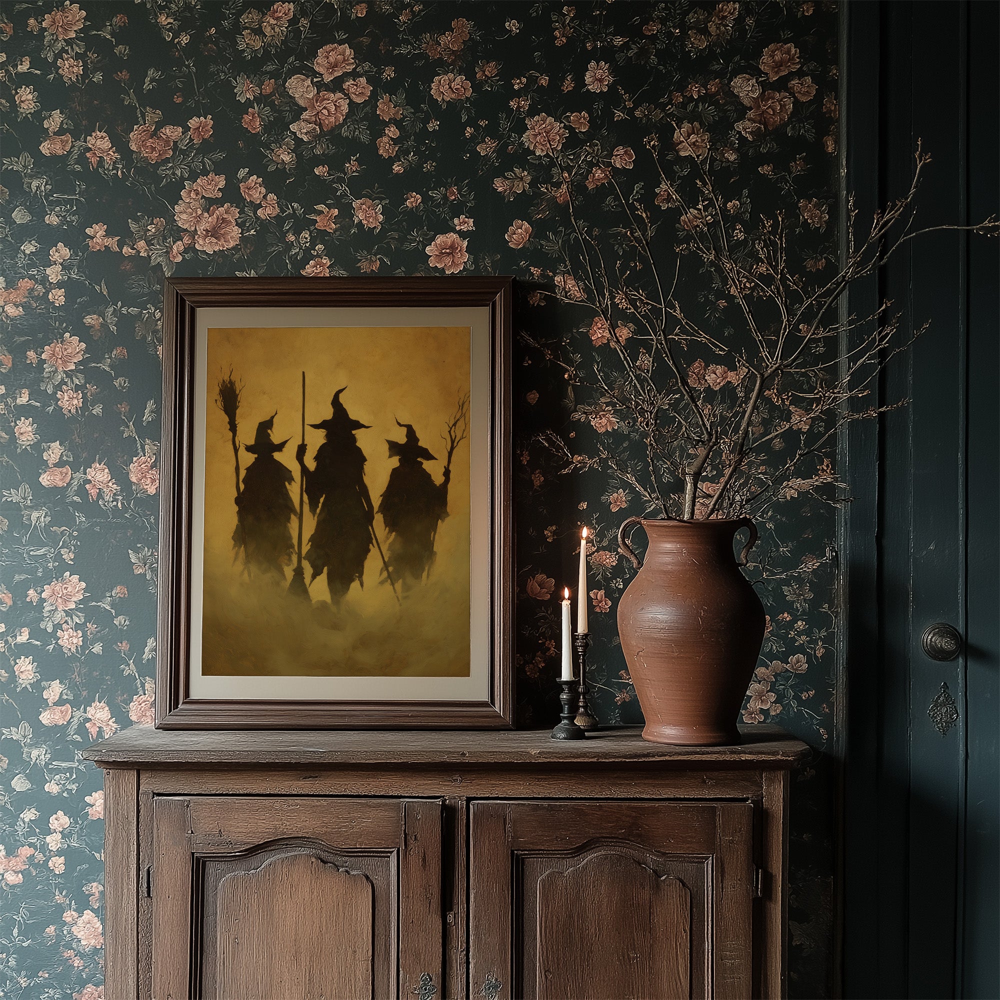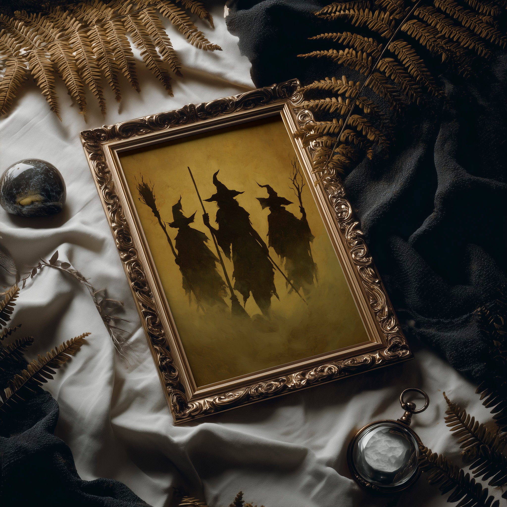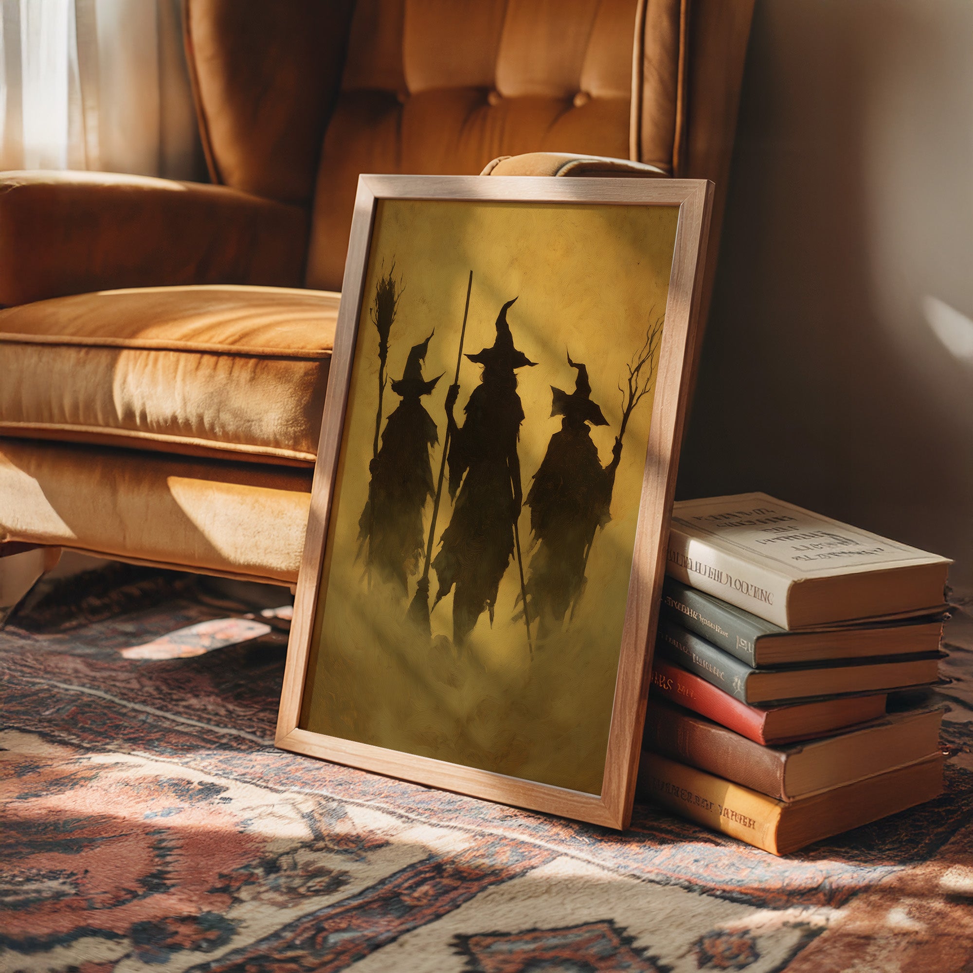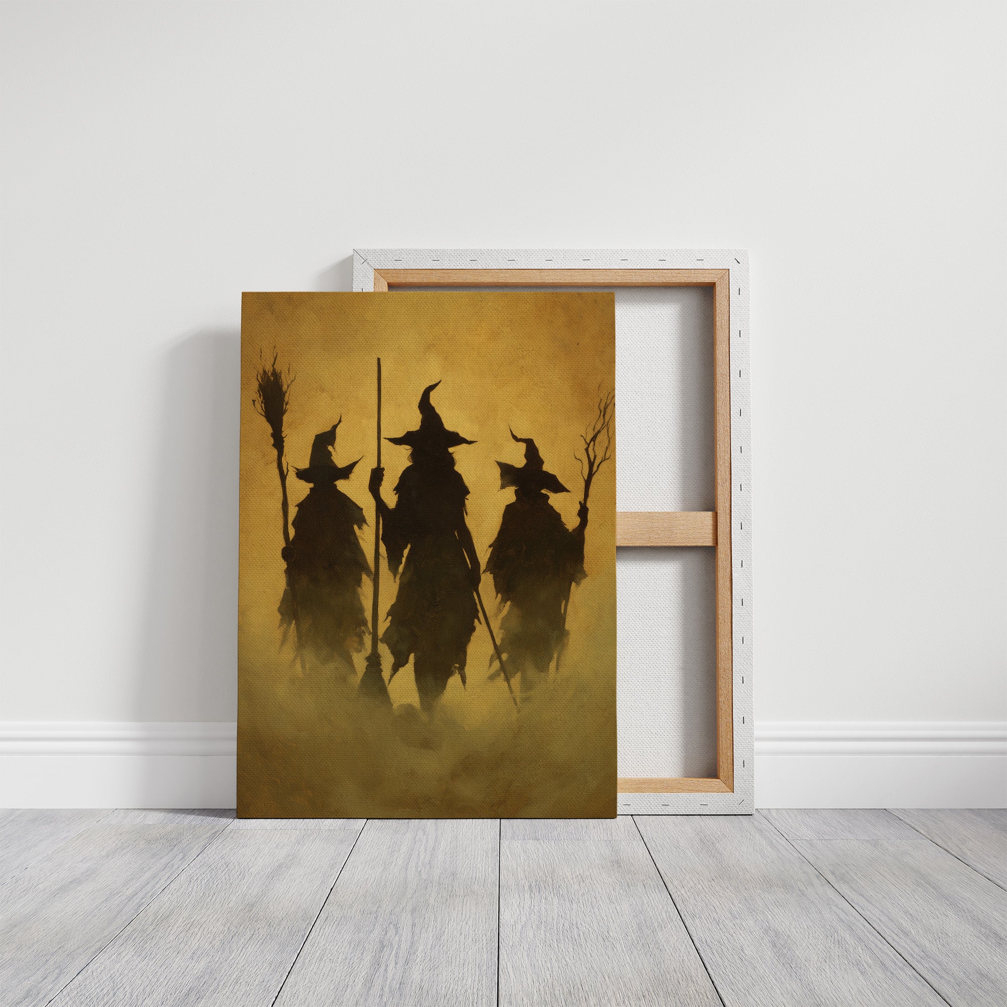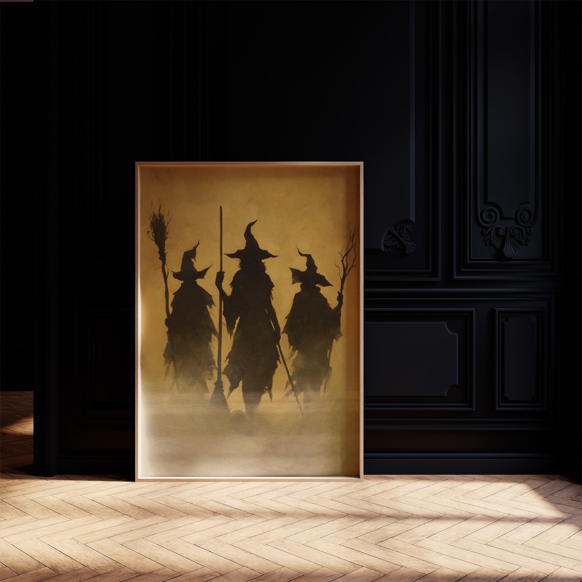 Silhouettes emerge from golden fog, their pointed hats and staffs cutting dramatic figures against the amber backdrop. Three mysterious witches stride forward in perfect formation, their forms blending with the misty landscape in a dance of shadow and light. The sepia tones create a timeless quality, as if this moment has been captured from folklore passed down through generations.