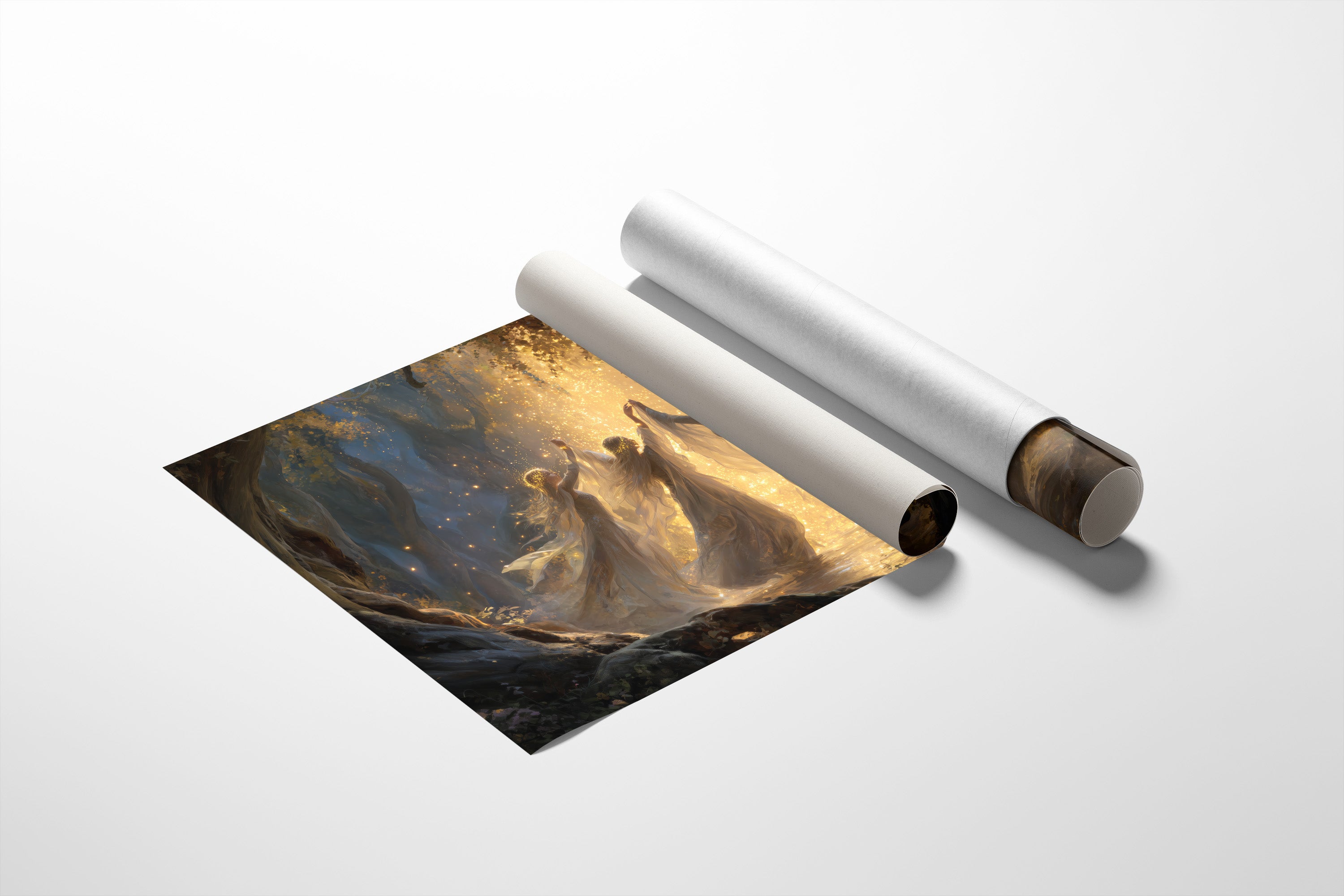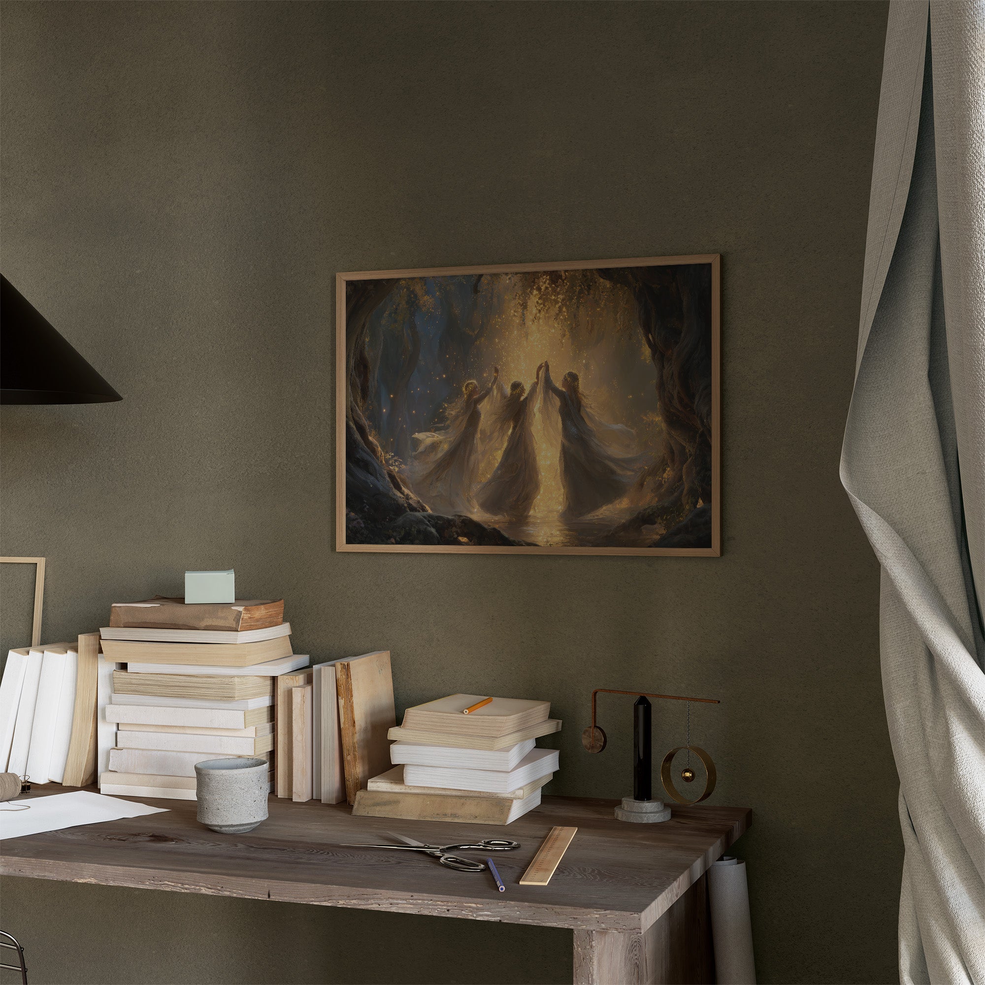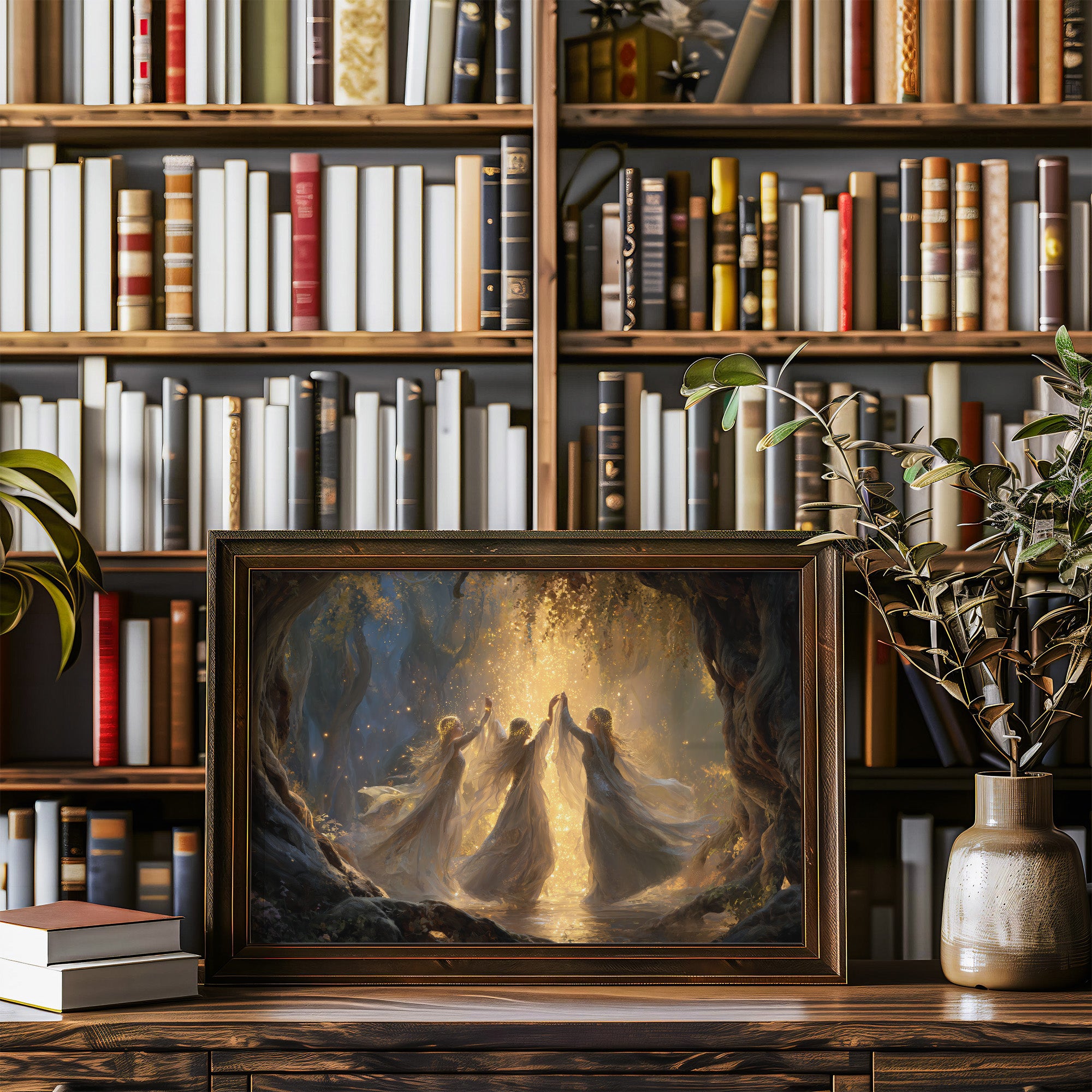 Time stands still as ethereal figures move in perfect harmony, bathed in warm golden radiance against the darkness. Their flowing forms create a sacred circle, caught in a moment of celestial celebration where light itself seems to dance between their outstretched fingers. The rich blues and amber tones create a mystical atmosphere, as if witnessing a ritual from another realm. This piece brings contemplative tranquility to a study, reading nook, or meditation space where stories and imagination flourish.