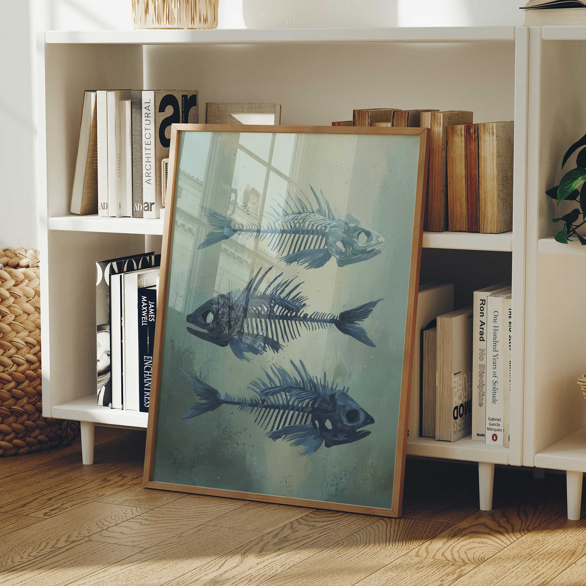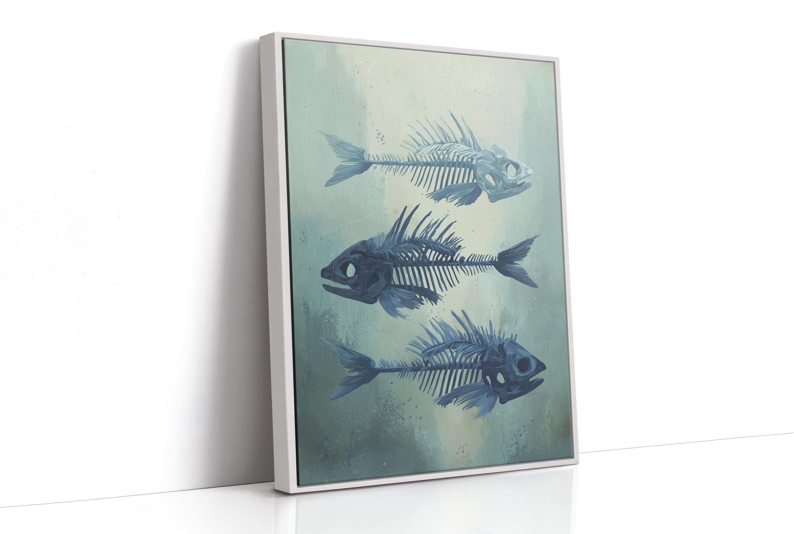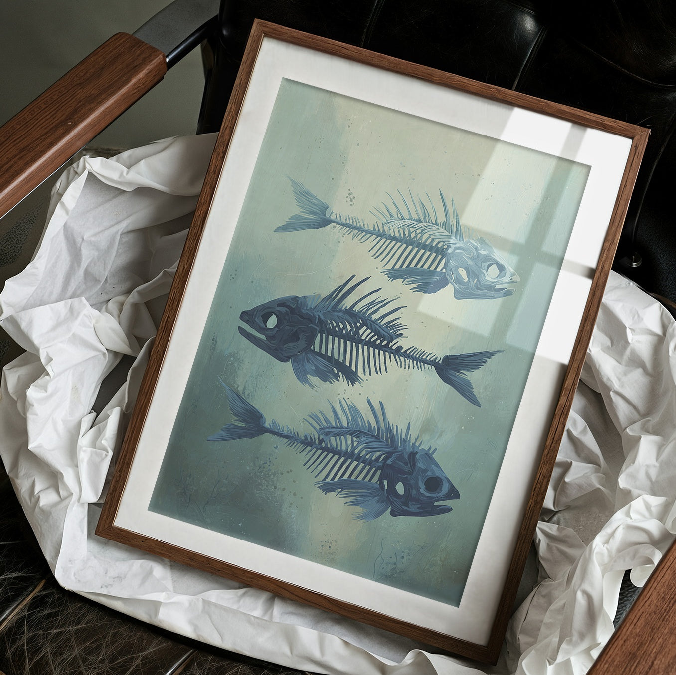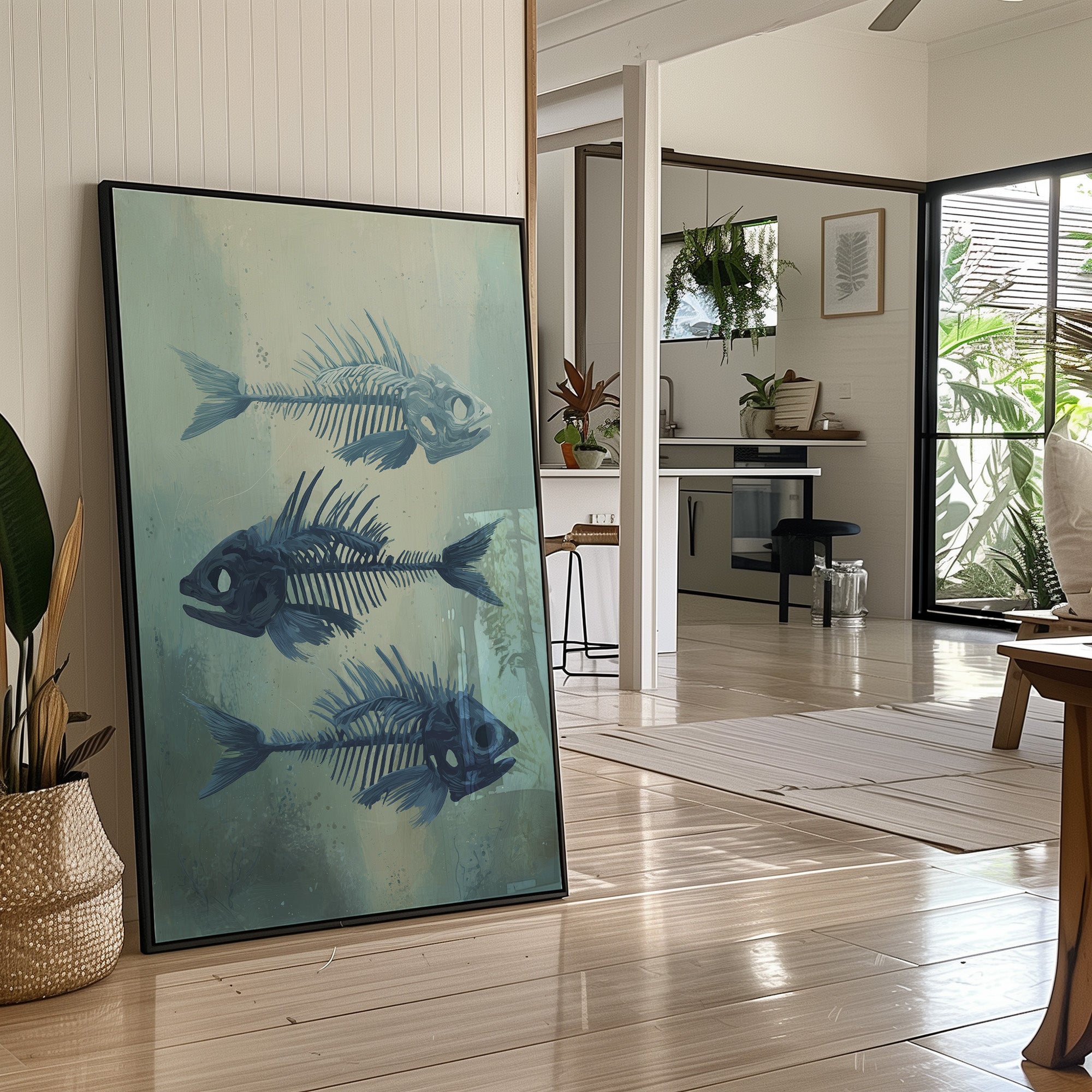 Morning light catches the ethereal blue skeletons suspended in sea-green stillness, creating a moment frozen between science and art. The three fish fossils float against their misty backdrop like ghosts from prehistoric oceans, their spines and fins rendered with delicate precision against the weathered aqua canvas. This contemplative piece brings an intellectual elegance to a sophisticated living space, perfectly complementing the mid-century modern furniture and natural textures surrounding it.