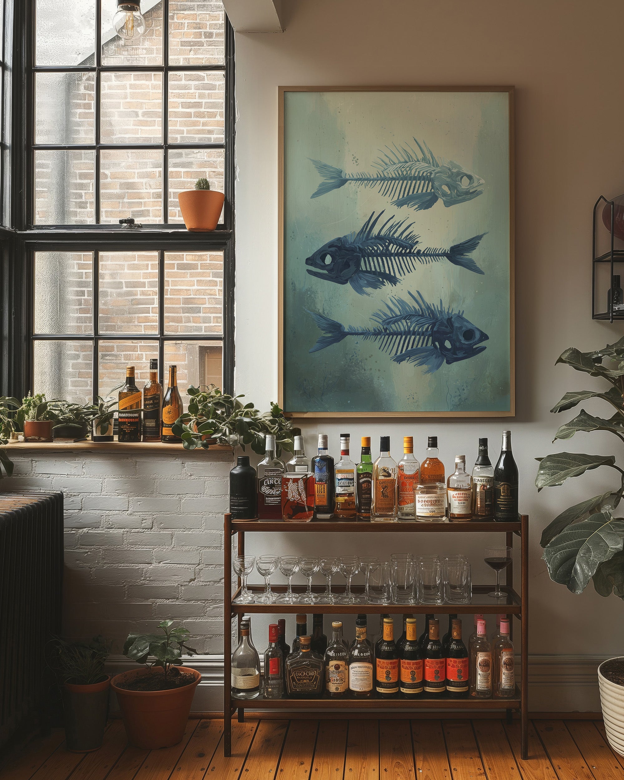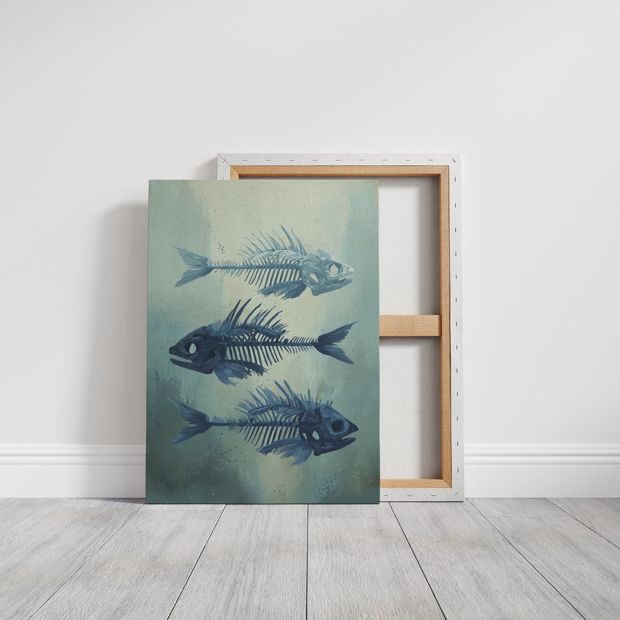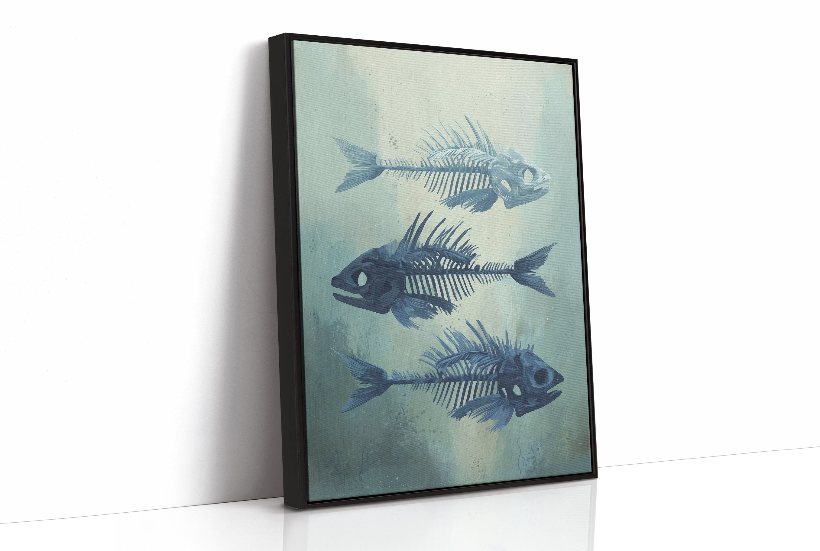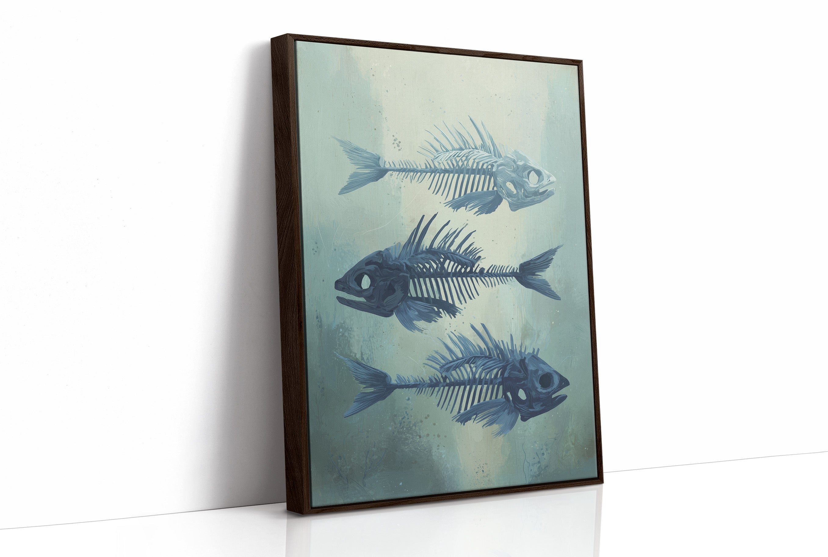 Morning light catches the ethereal blue skeletons suspended in sea-green stillness, creating a moment frozen between science and art. The three fish fossils float against their misty backdrop like ghosts from prehistoric oceans, their spines and fins rendered with delicate precision against the weathered aqua canvas. This contemplative piece brings an intellectual elegance to a sophisticated living space, perfectly complementing the mid-century modern furniture and natural textures surrounding it.