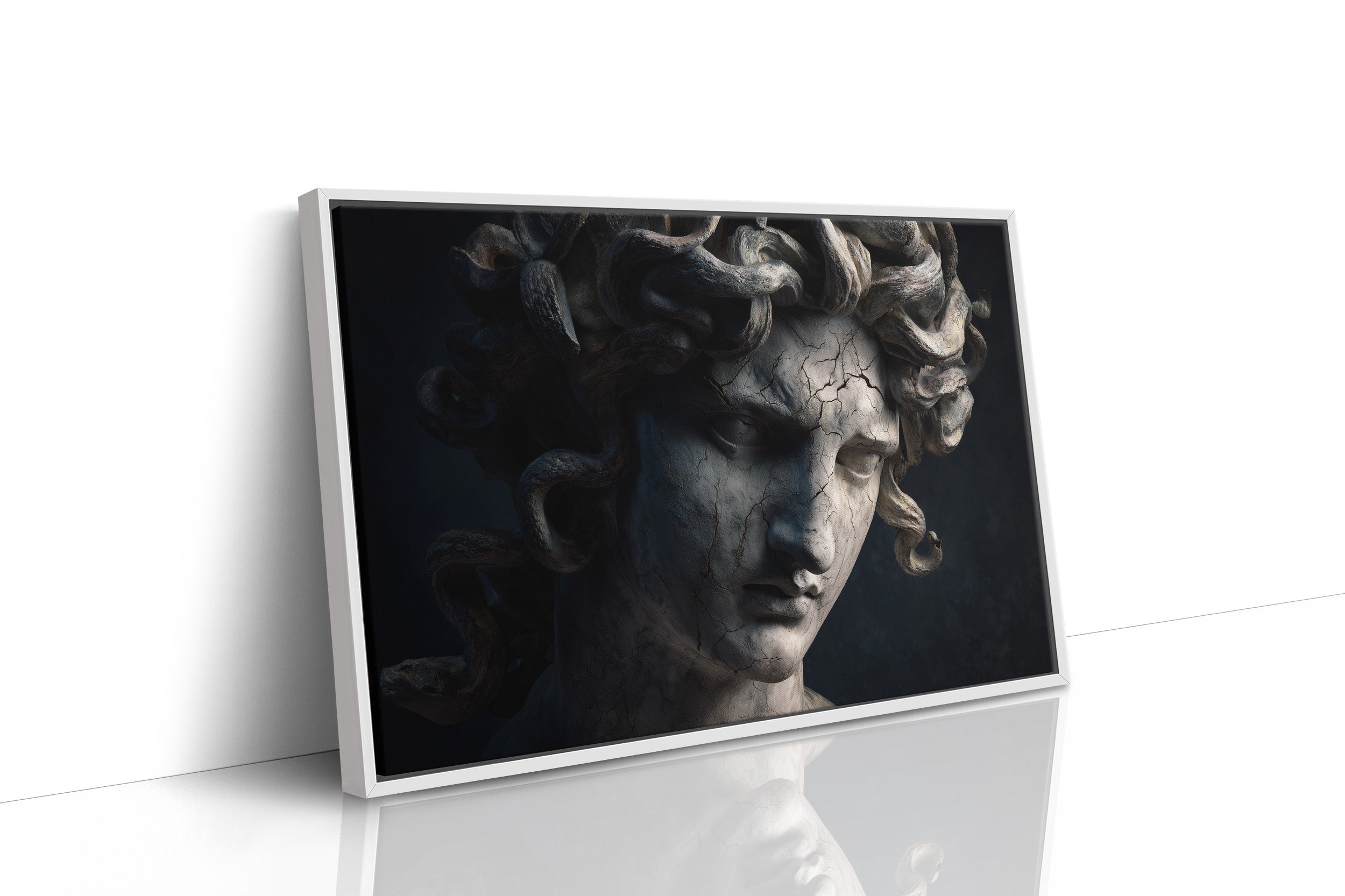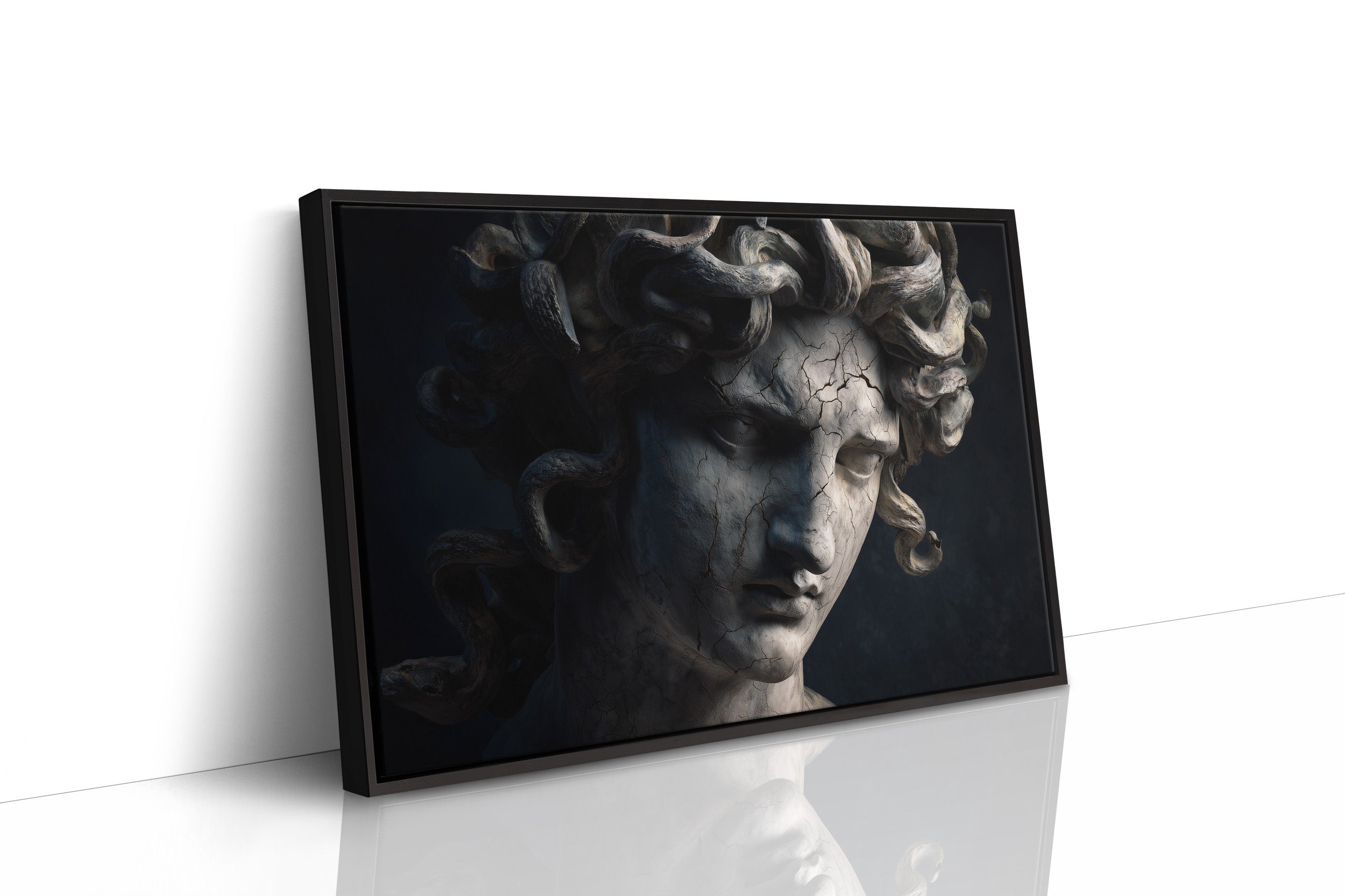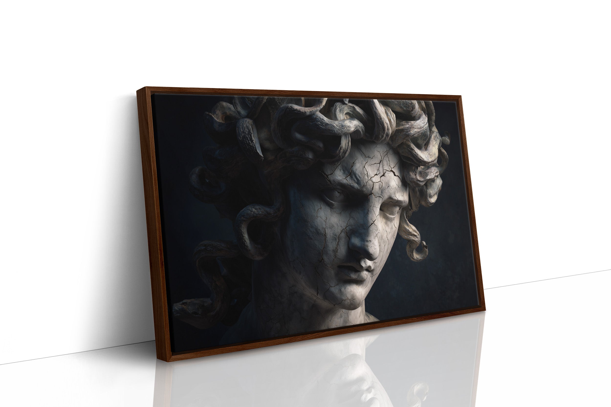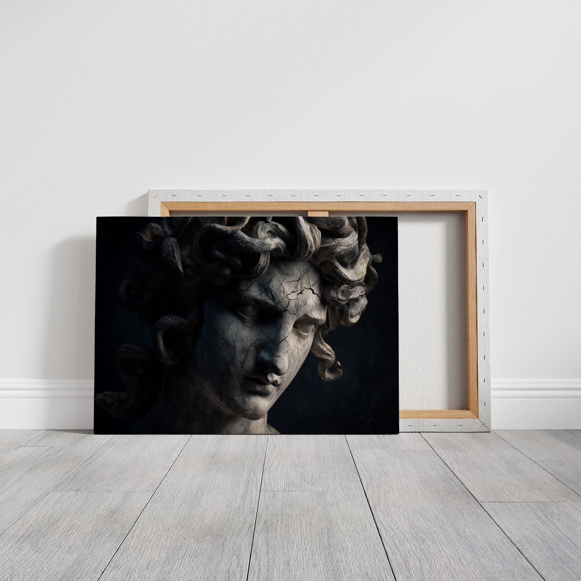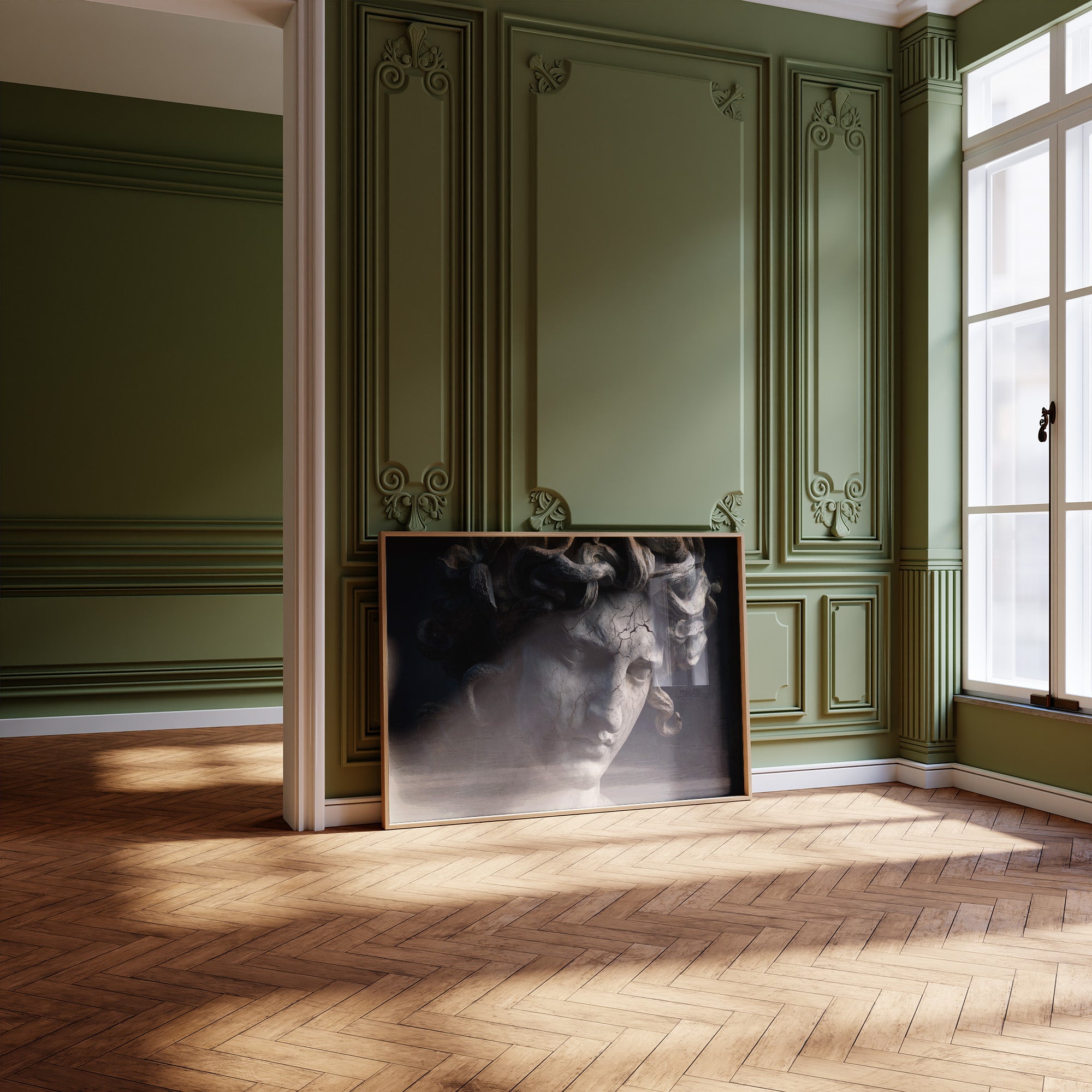 Stillness settles between leather-bound volumes and weathered pages, where a classical sculpture portrait commands quiet reverence. The cracked marble visage, with its flowing curls and downcast expression, tells stories older than the books surrounding it. Dark shadows play across the textured stone, highlighting every fissure and curve against the warm wooden shelves lined with literary treasures. This striking contrast piece brings sophistication to a home library, study, or reading nook where intellectual pursuits meet artistic appreciation.