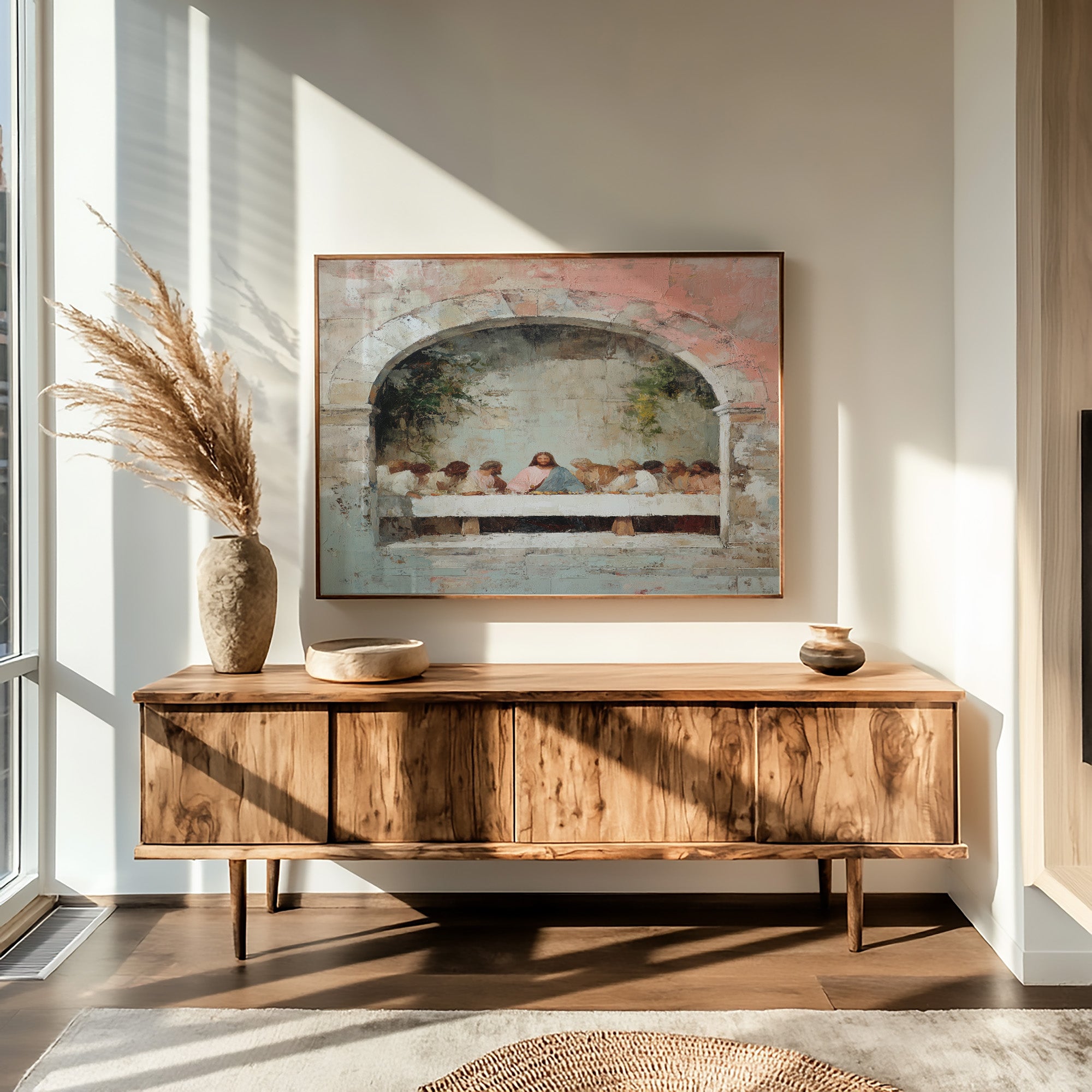 Soft light bathes a delicate reproduction of the Last Supper, its muted pinks and blues creating a tranquil focal point among well-loved books. The painting's weathered arch frames the sacred moment with gentle reverence, while dried pampas grass in an earthen vessel adds organic texture to this thoughtful vignette. This contemplative piece brings spiritual depth to a home library, offering both artistic beauty and meaningful reflection in a reading nook or study.
