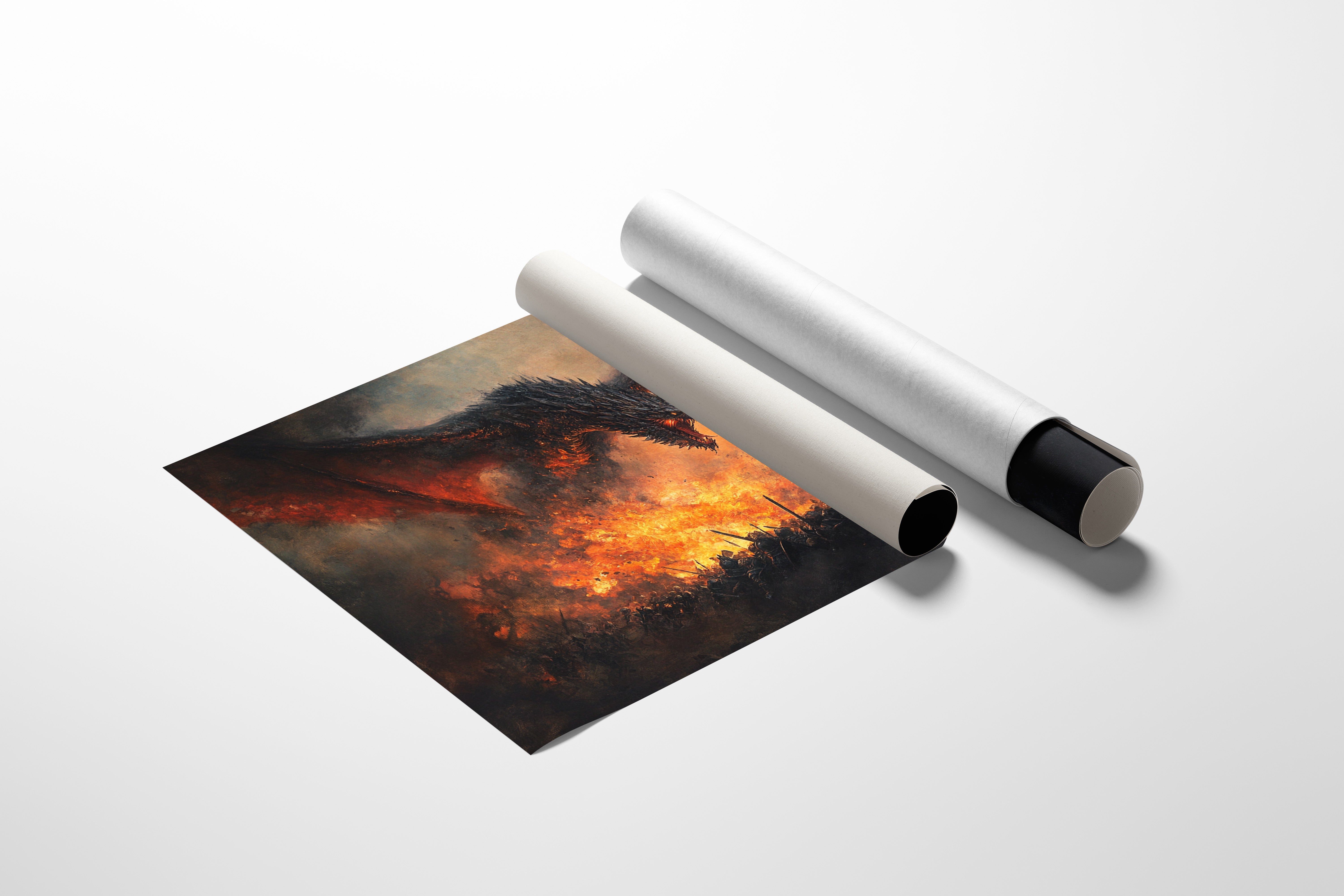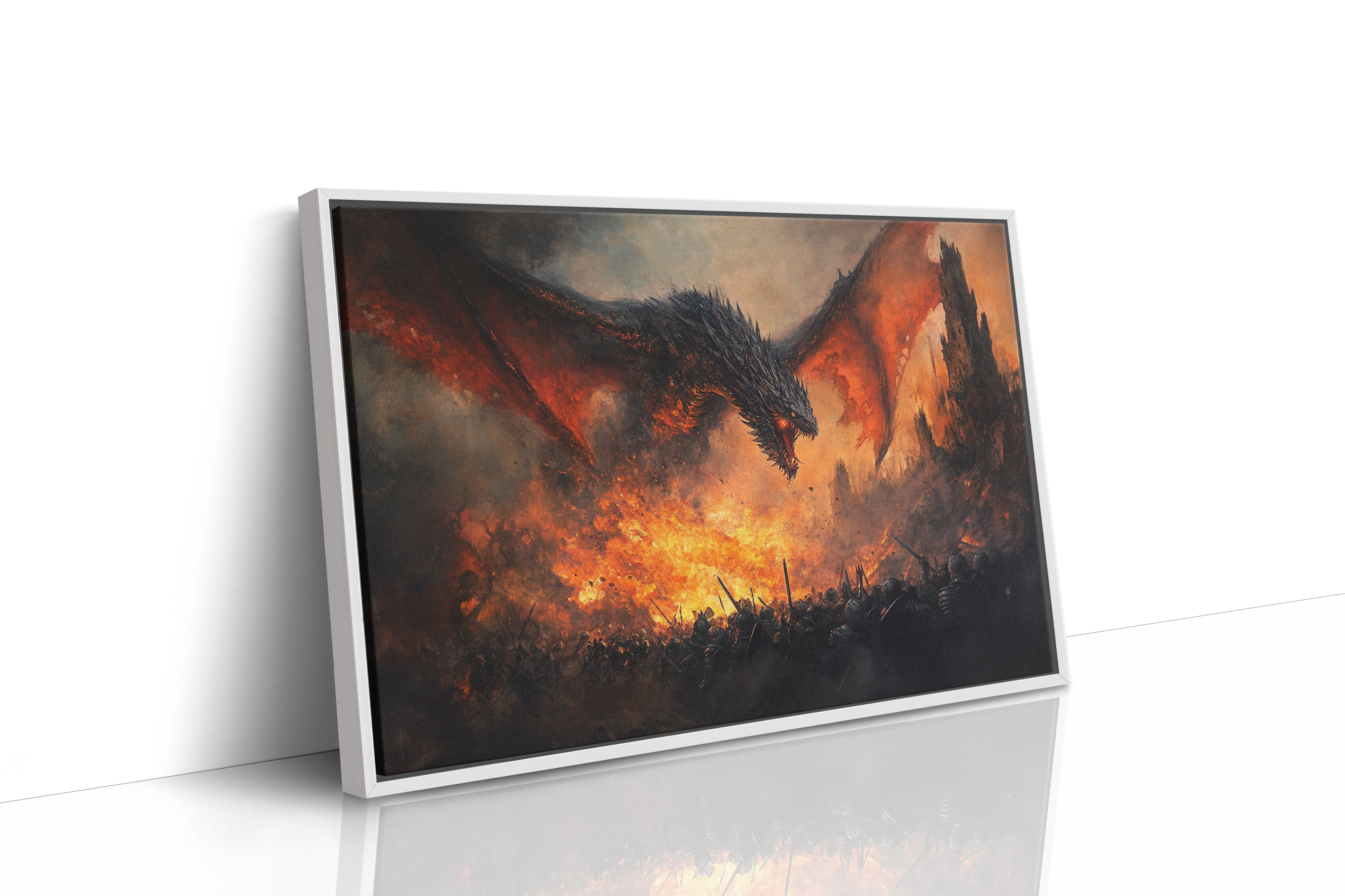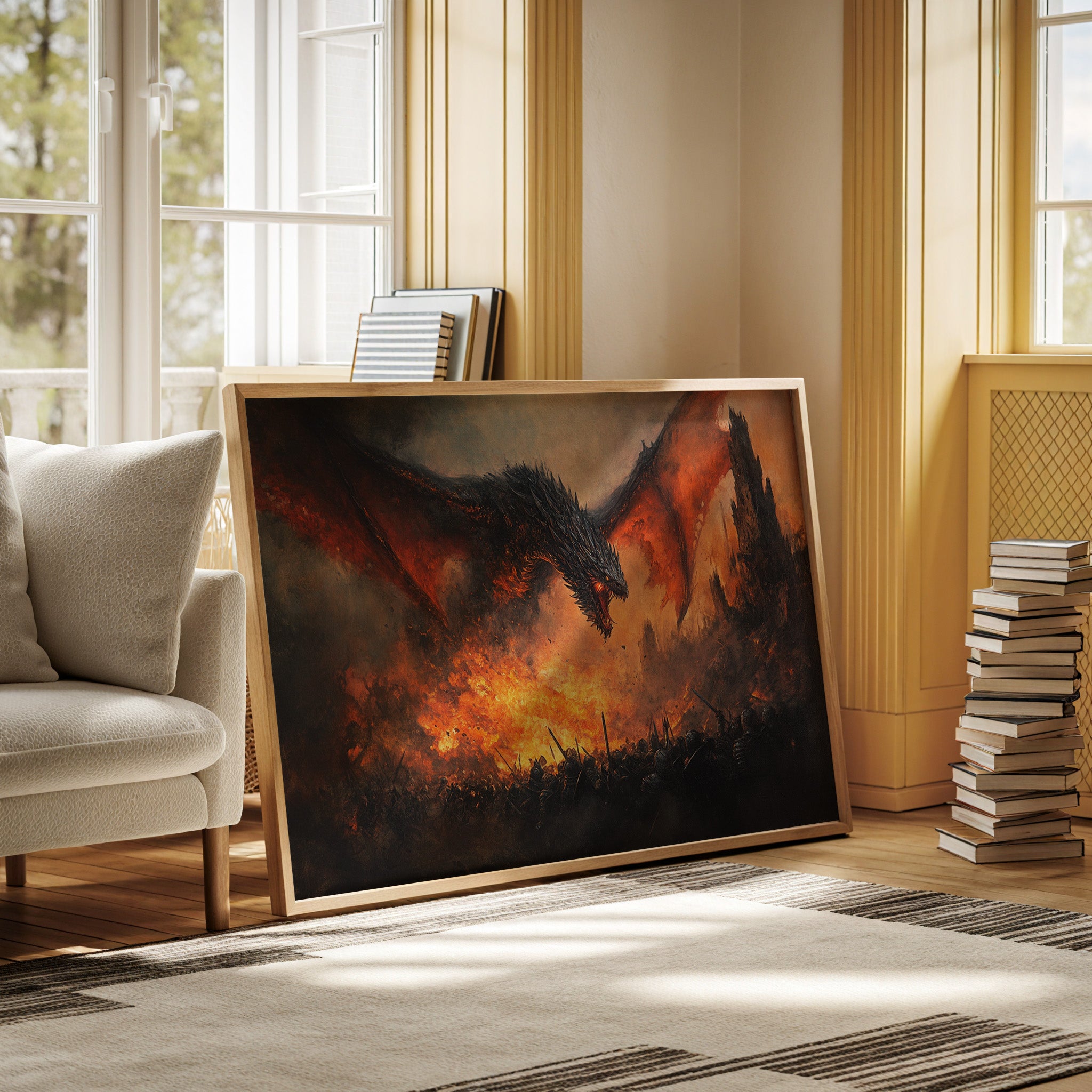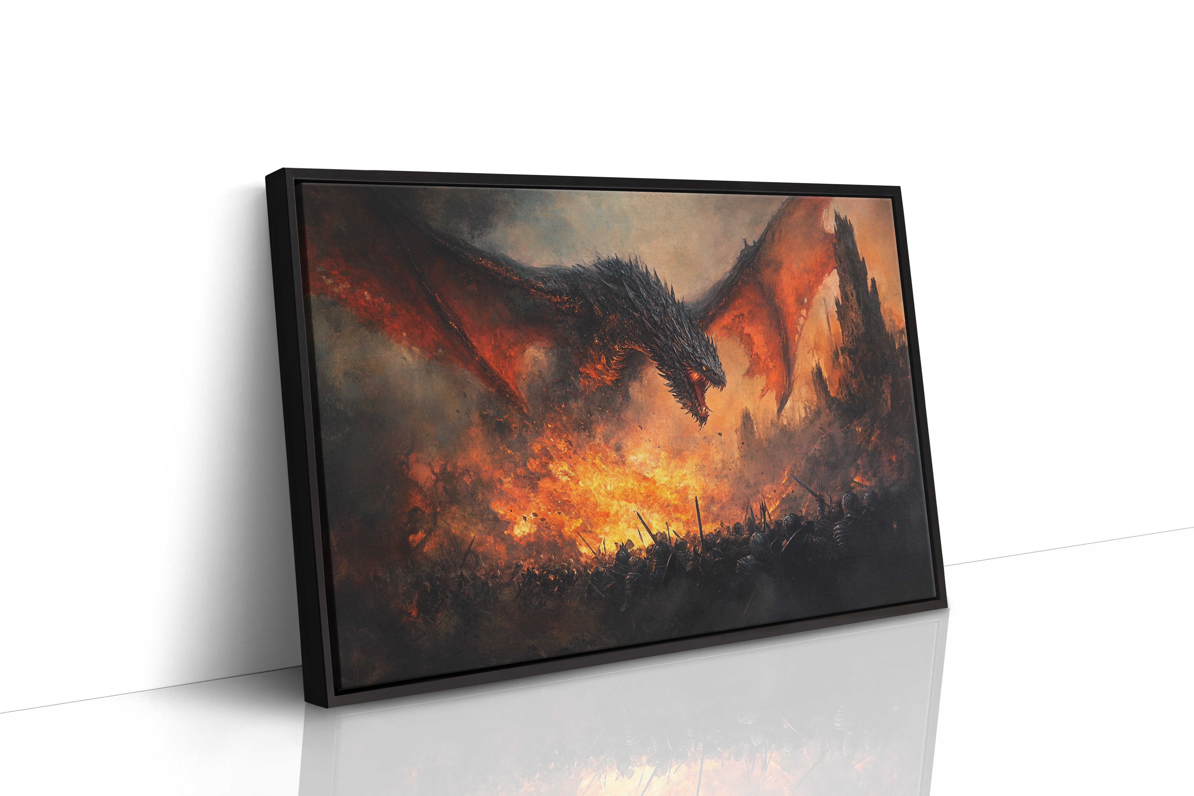 Flames dance against a smoke-filled sky as a mighty dragon descends upon an army below. The scene pulses with dramatic tension, painted in rich oranges and deep obsidian blacks that create an apocalyptic atmosphere. Through masterful brushwork, the artist captures the chaos of battle meeting supernatural force - armor glinting against firelight, wings spread across twilight clouds, and the raw power of dragonfire illuminating the battlefield. This piece commands attention as a focal point, ideal for a game room, study, or any space where bold, dramatic artwork can make a powerful statement.