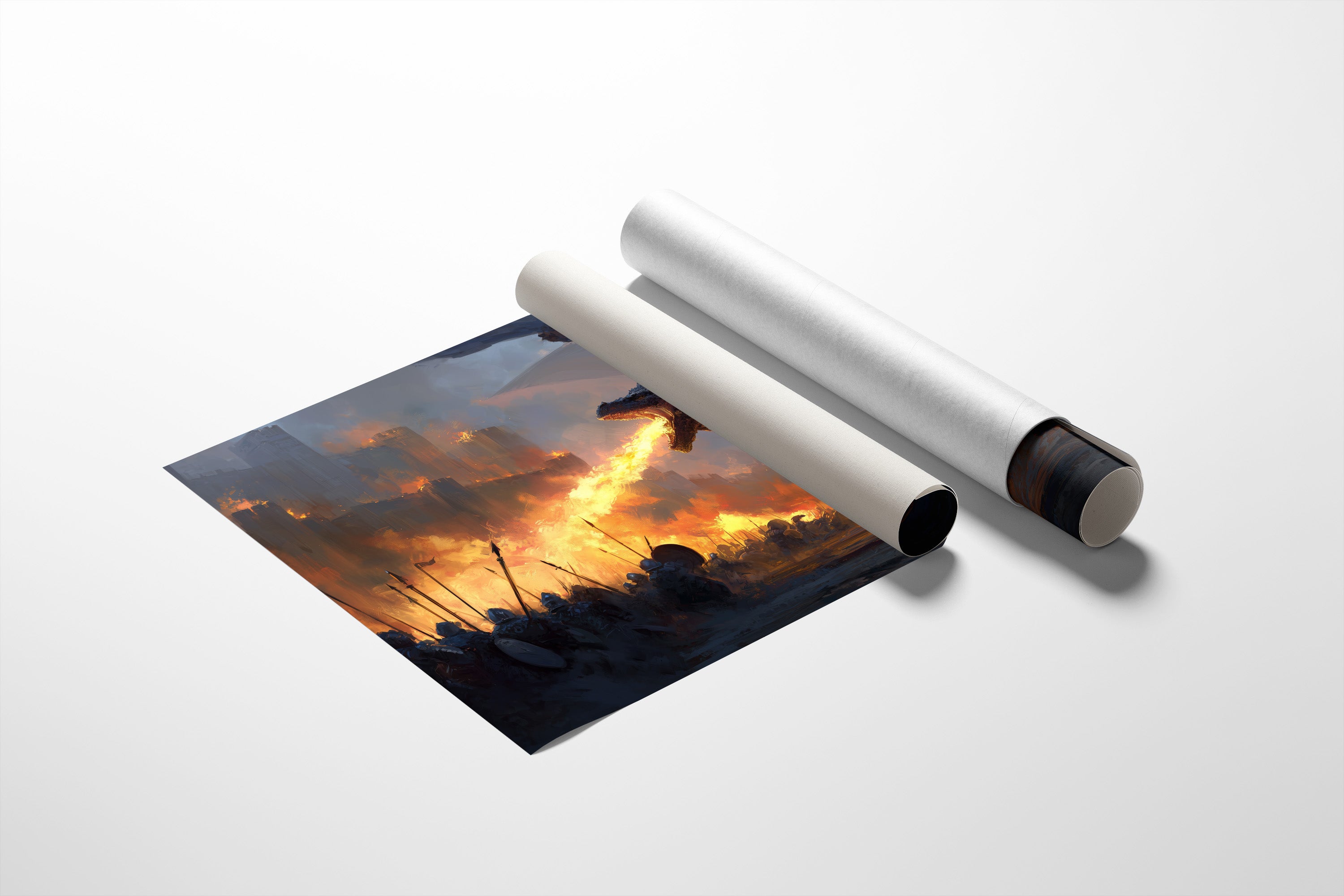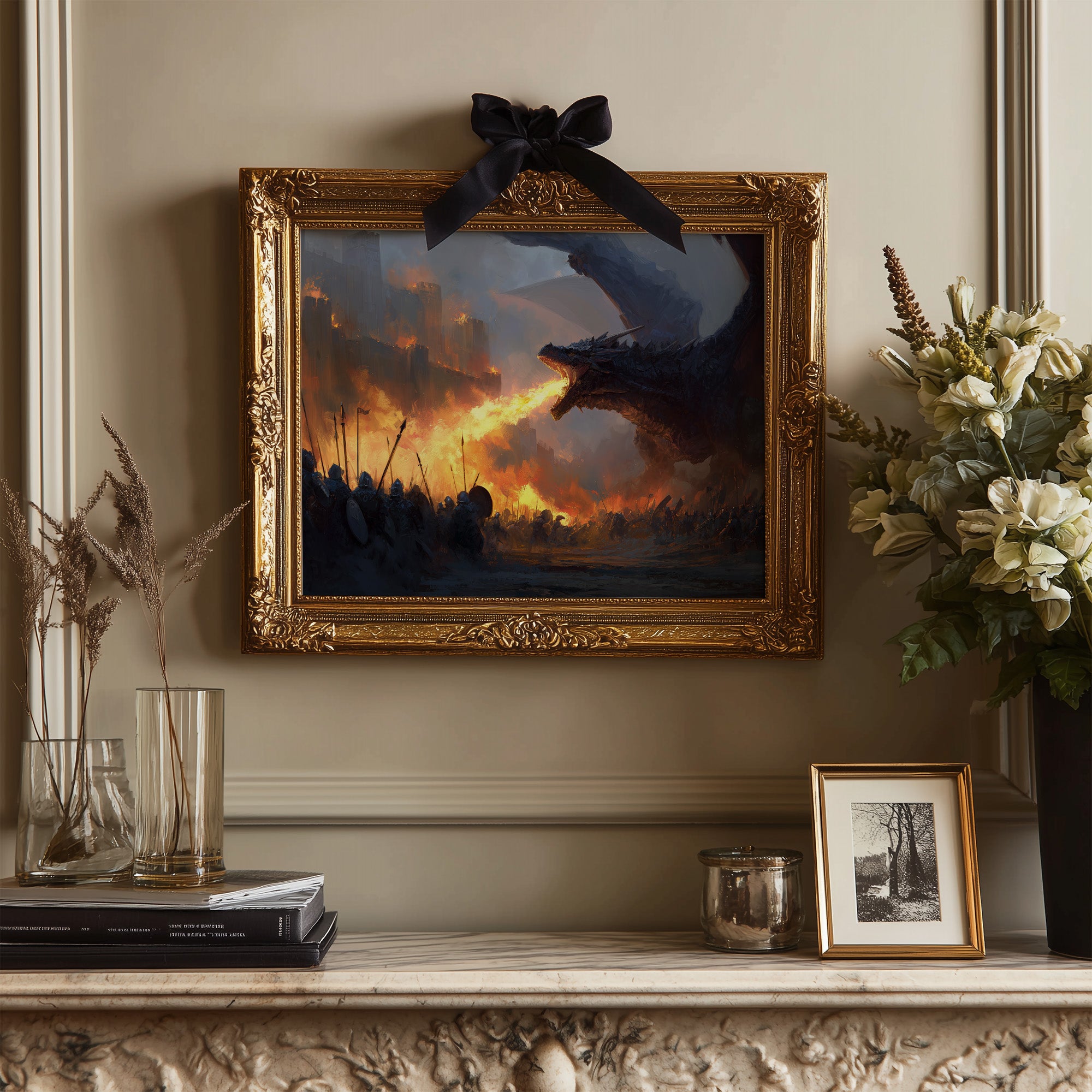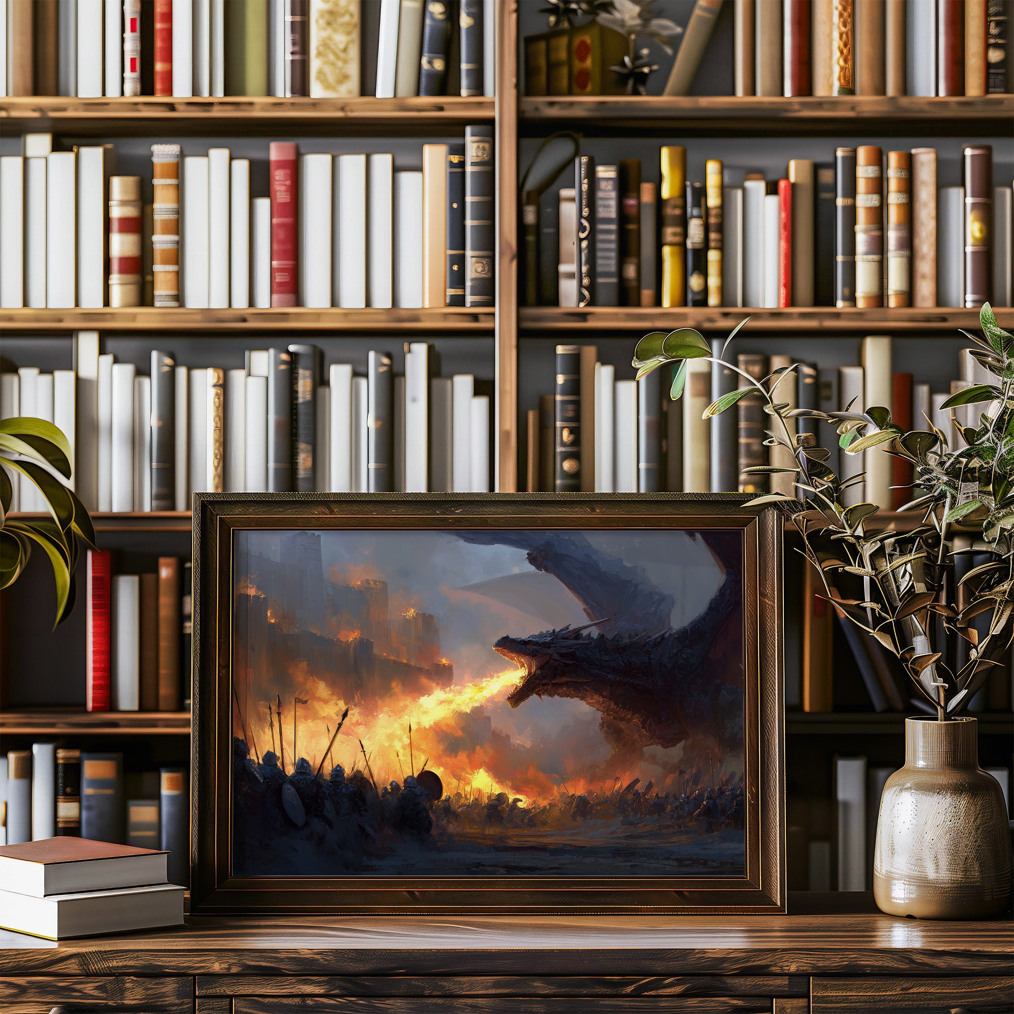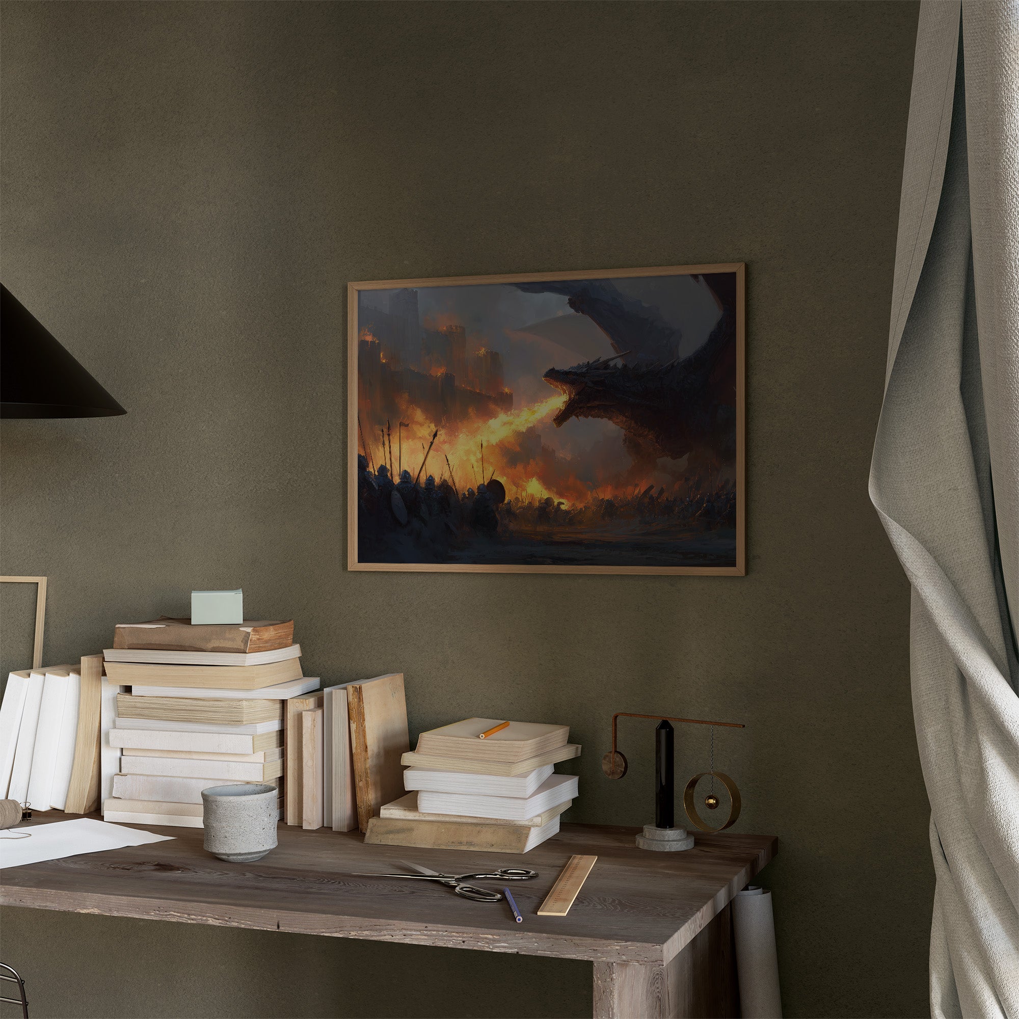 Fire and fury collide in this breathtaking moment where legend meets battlefield. A majestic dragon unleashes molten breath across a sea of warriors, their spears and shields silhouetted against the inferno. The painting captures that pivotal threshold between courage and catastrophe, where amber light bathes the chaos in an almost reverent glow. This dramatic scene feels simultaneously mythical and visceral, with smoke-hazed mountains framing the confrontation. Perfect for a home office or reading nook where imagination reigns, this piece invites contemplation of epic tales and timeless struggles.