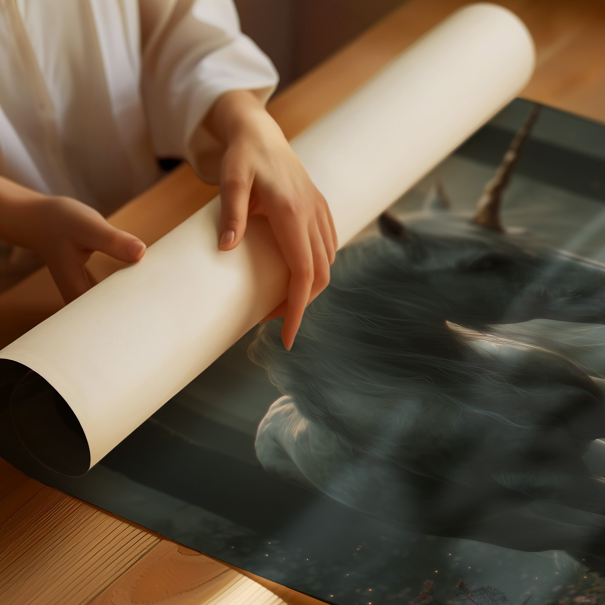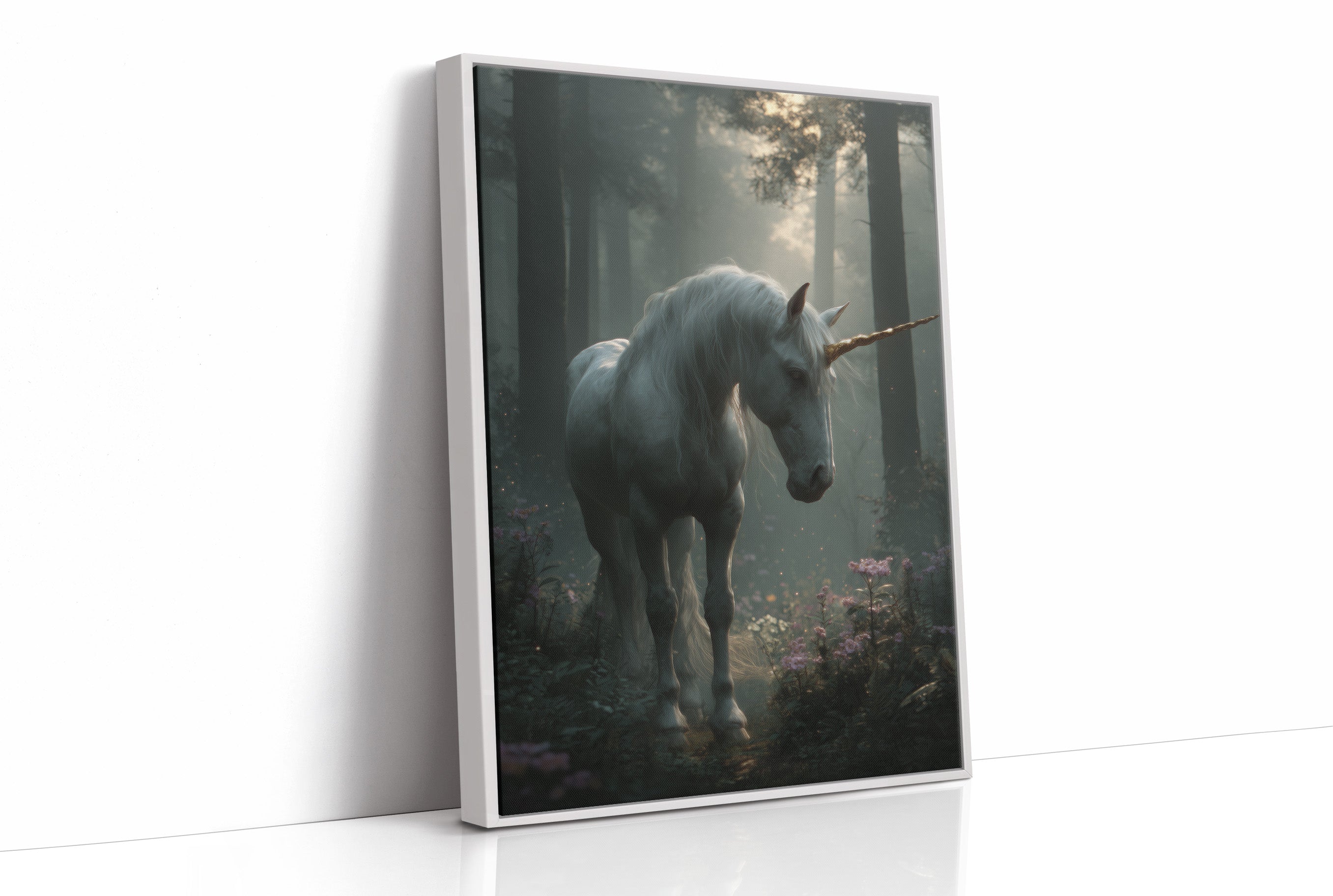 Mist curls around delicate hooves as a luminous unicorn pauses in the depths of an enchanted forest. The ethereal white creature stands proud against a backdrop of towering trees and filtered sunlight, its golden horn catching the hazy morning rays. Wildflowers bloom in soft pinks along the forest floor, creating a dreamlike sanctuary where mythology breathes among ancient trunks and verdant shadows. This captivating piece brings a touch of fantasy and wonder to contemporary interiors, perfect for spaces where imagination and elegant design converge.