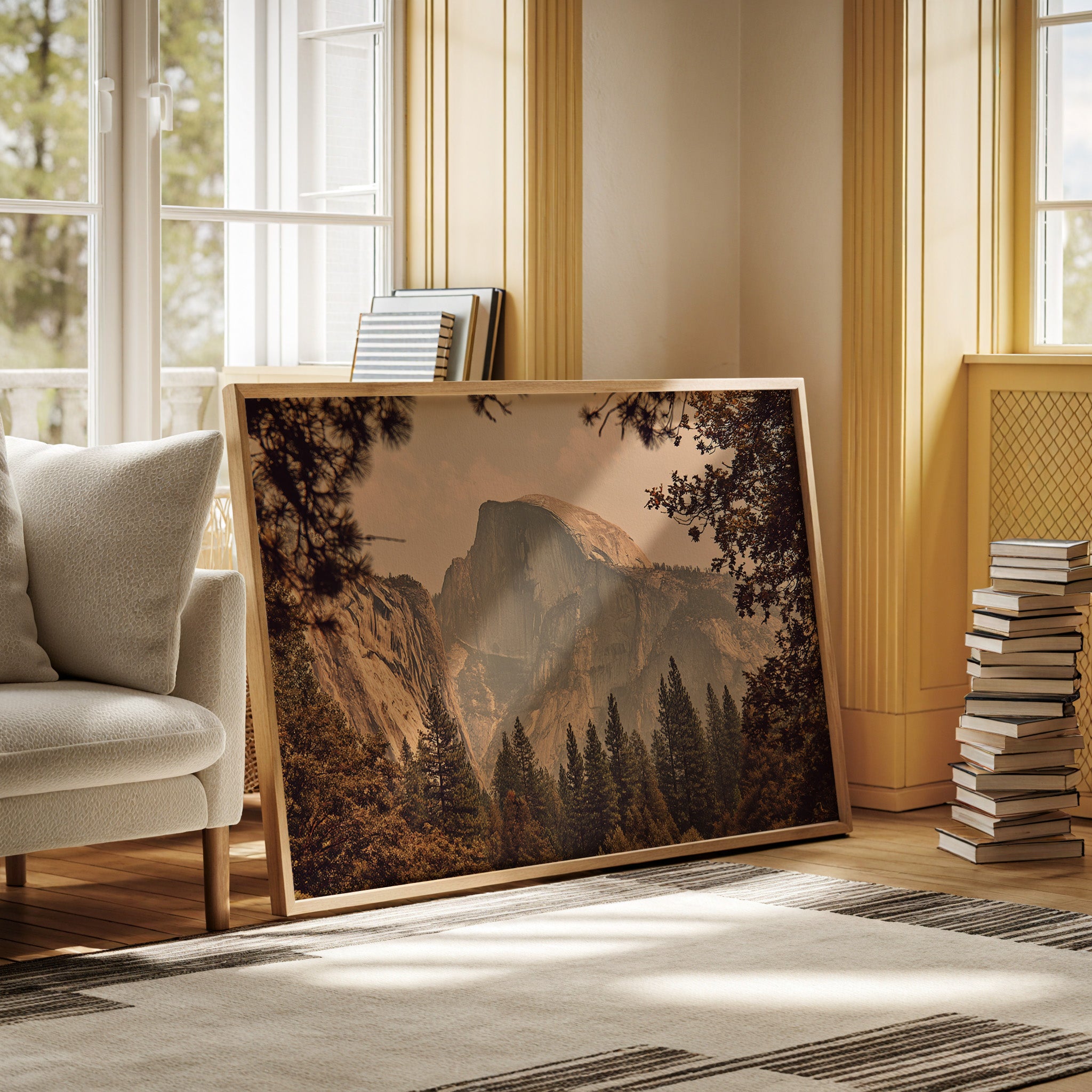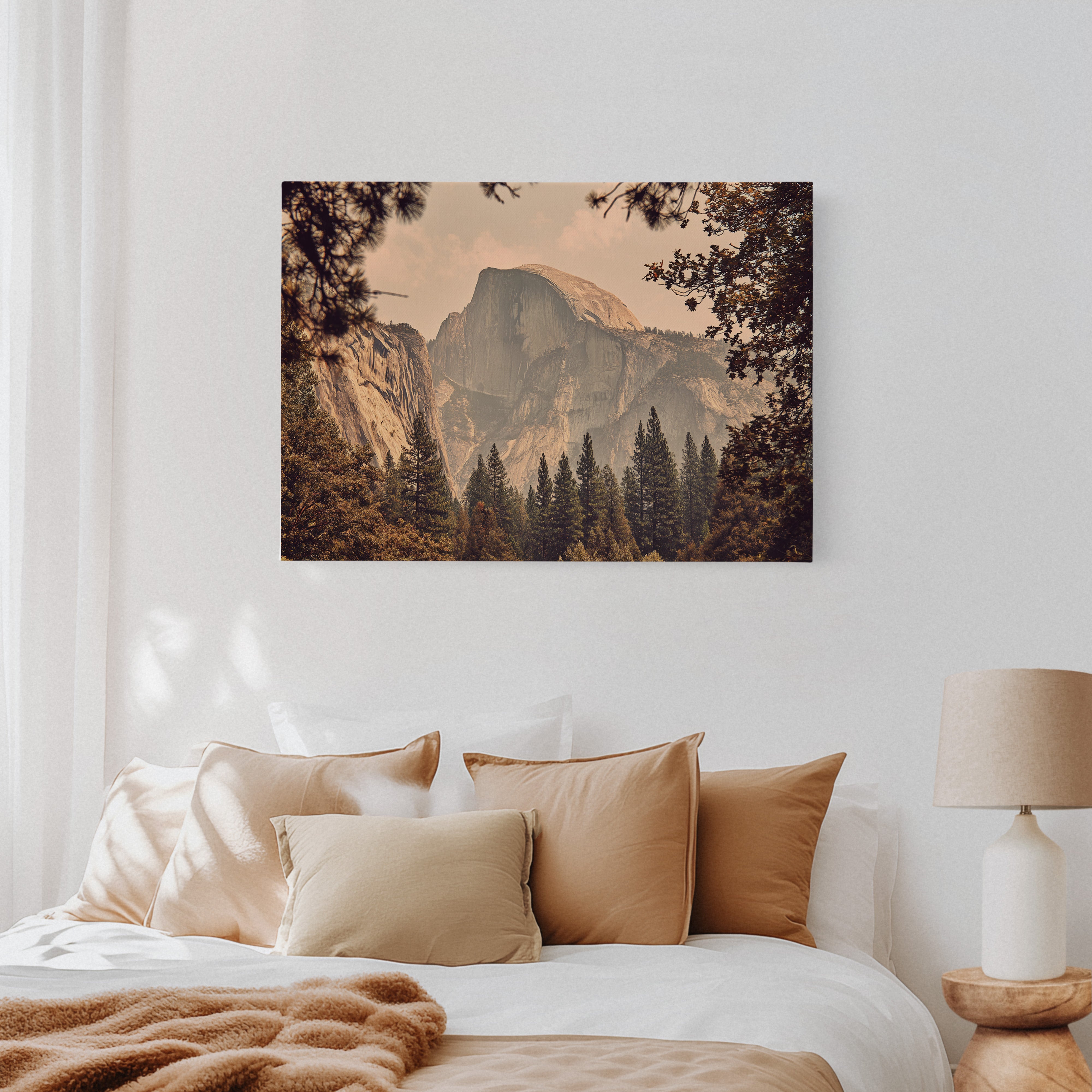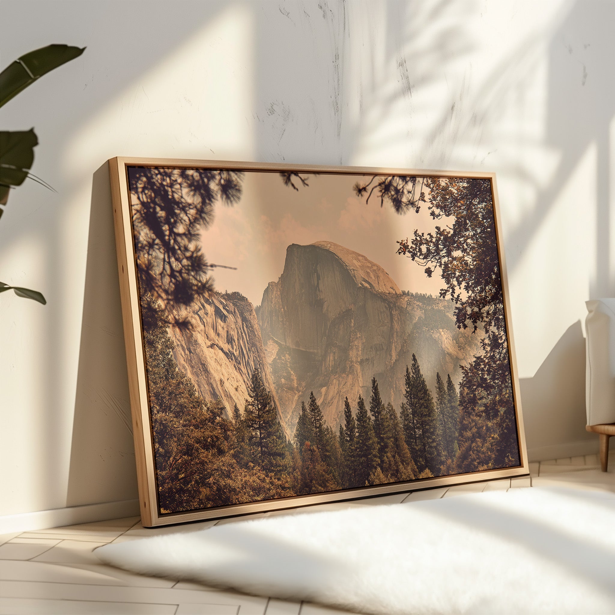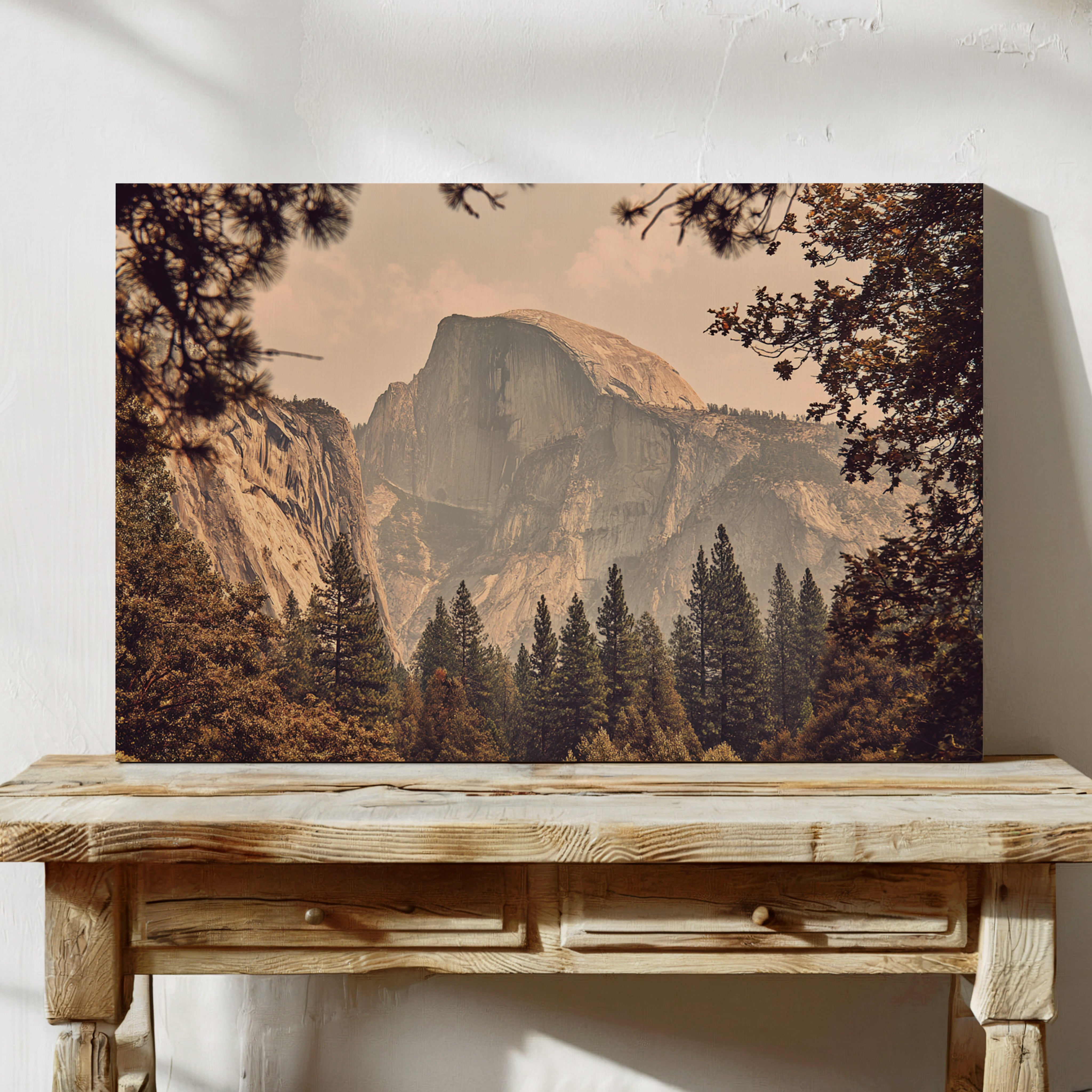 Dawn's first light bathes the towering face of Half Dome in honey-warm hues, creating an almost ethereal glow against the morning sky. The massive granite monolith rises majestically above Yosemite Valley, its weathered surface telling stories of geological epochs past. Pine sentinels stand in silent reverence along the foreground, their dark silhouettes framing nature's cathedral in a perfect composition of scale and wonder. This piece brings the timeless grandeur of America's most iconic national parks into intimate spaces, offering a daily reminder of nature's monumental beauty.