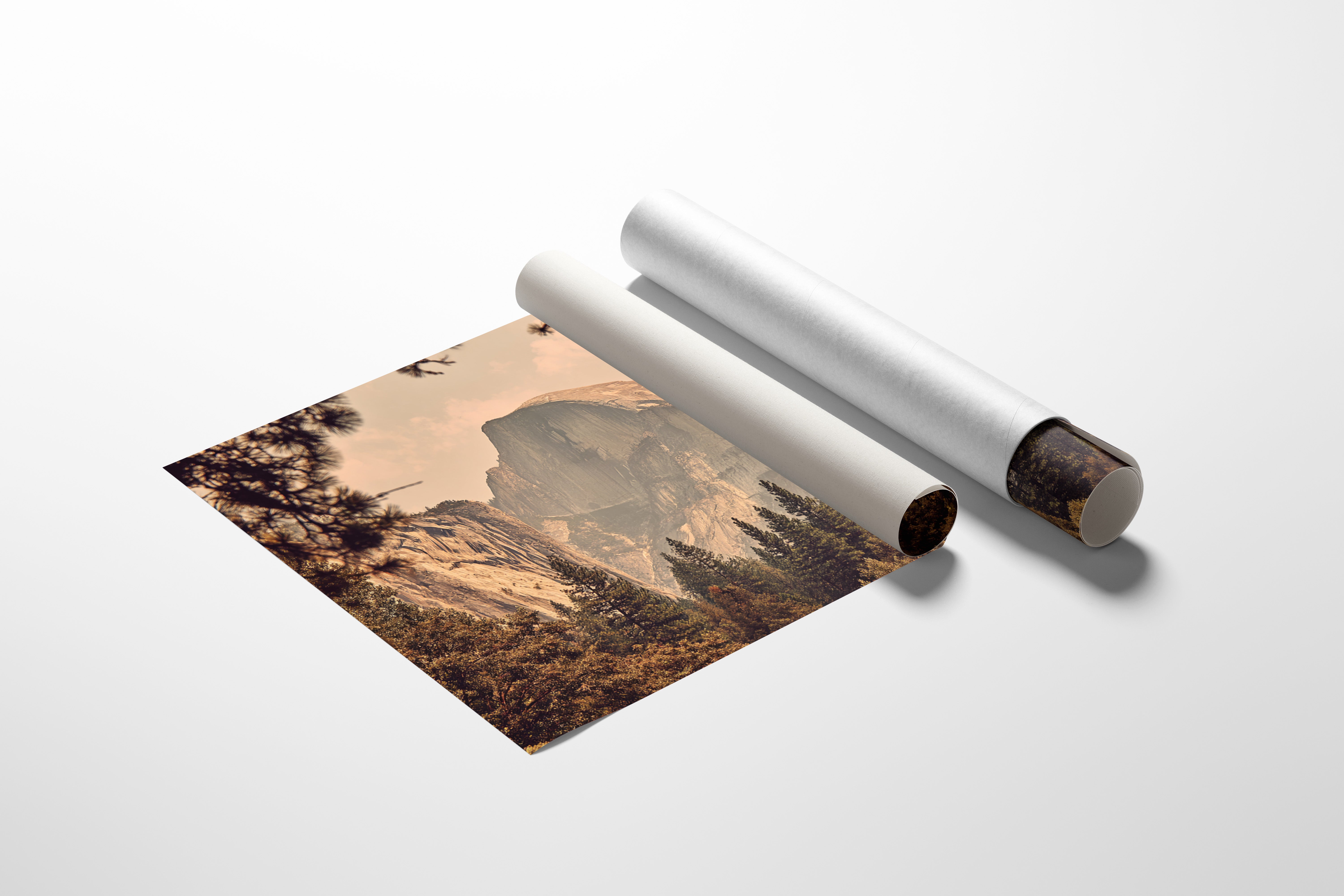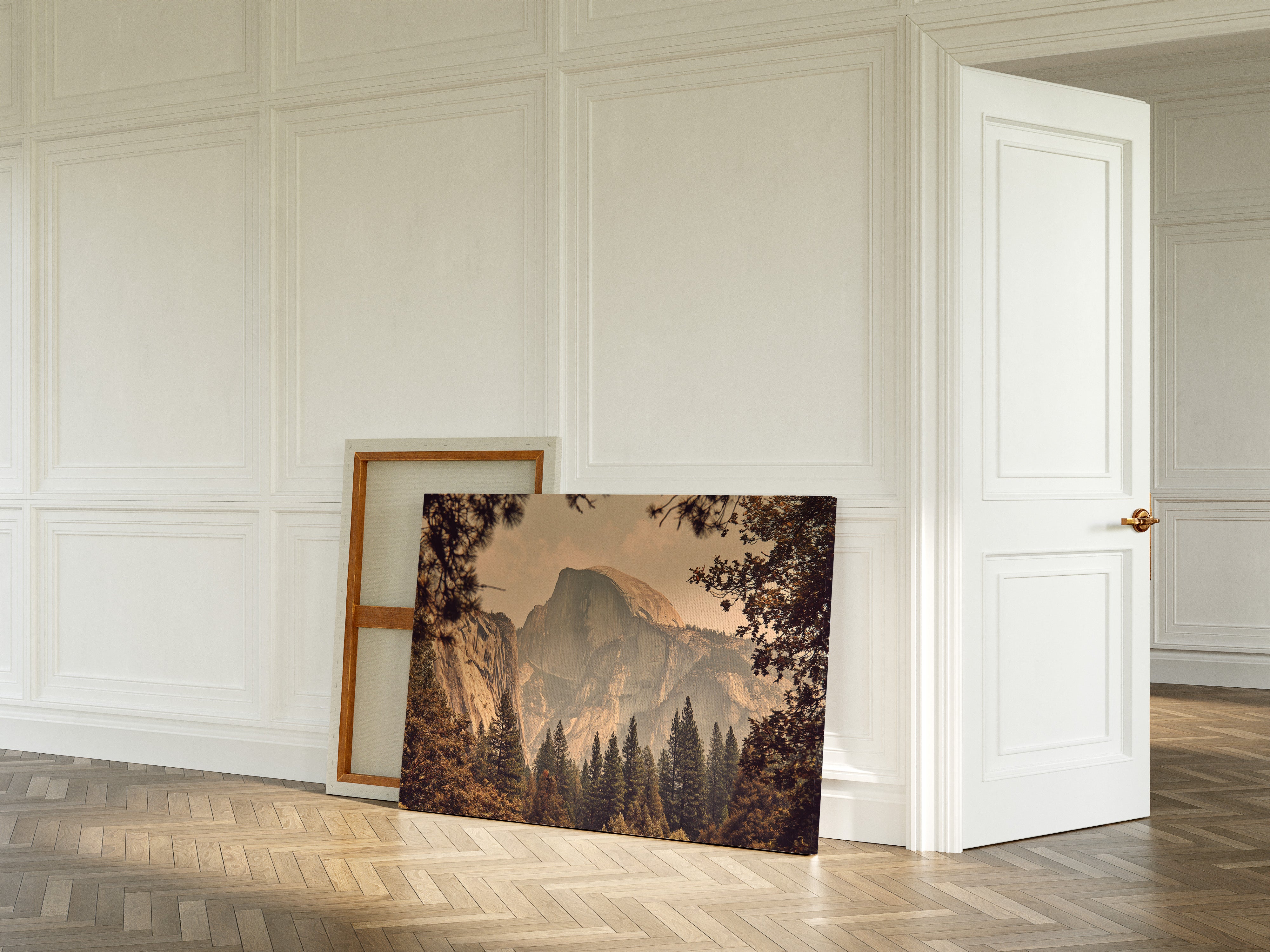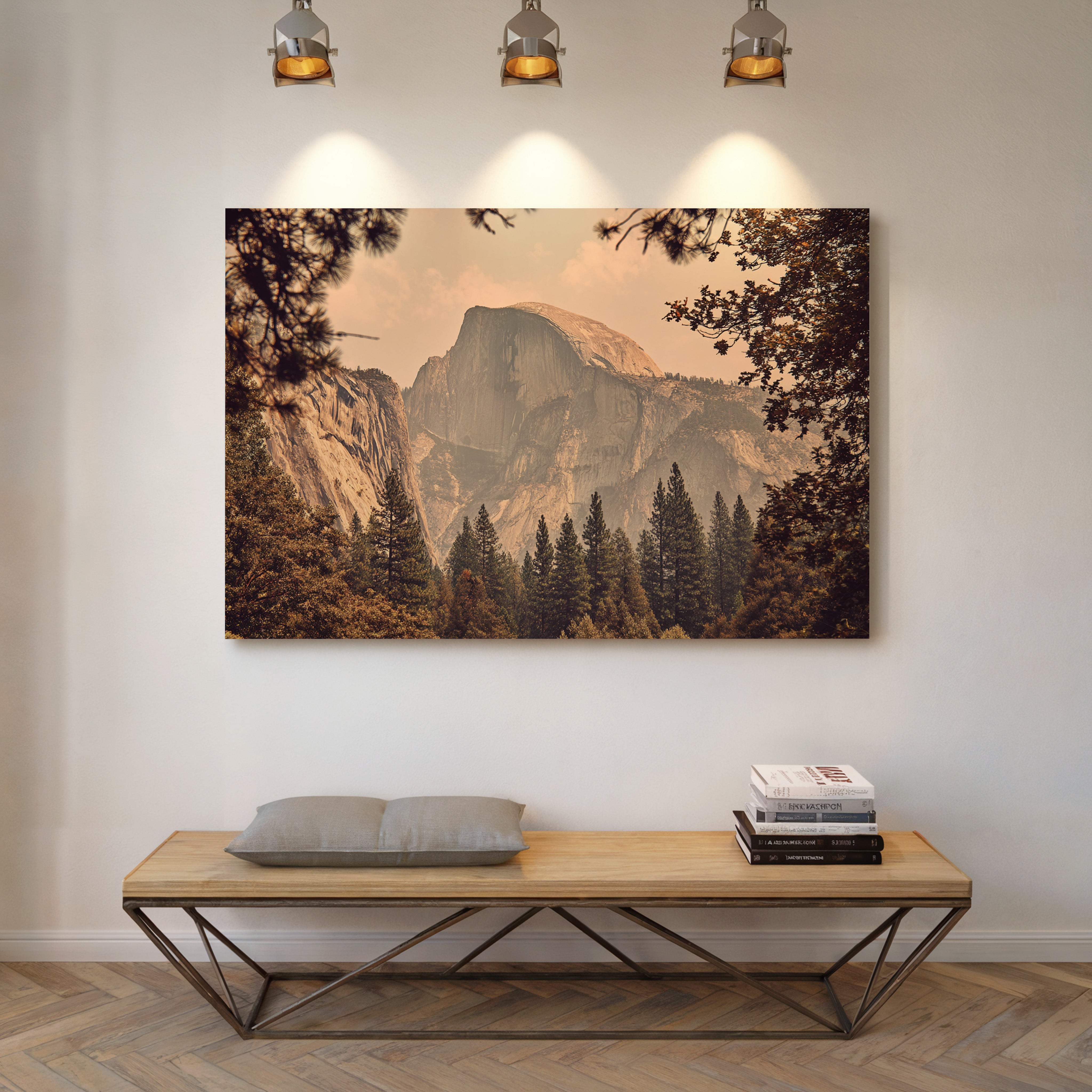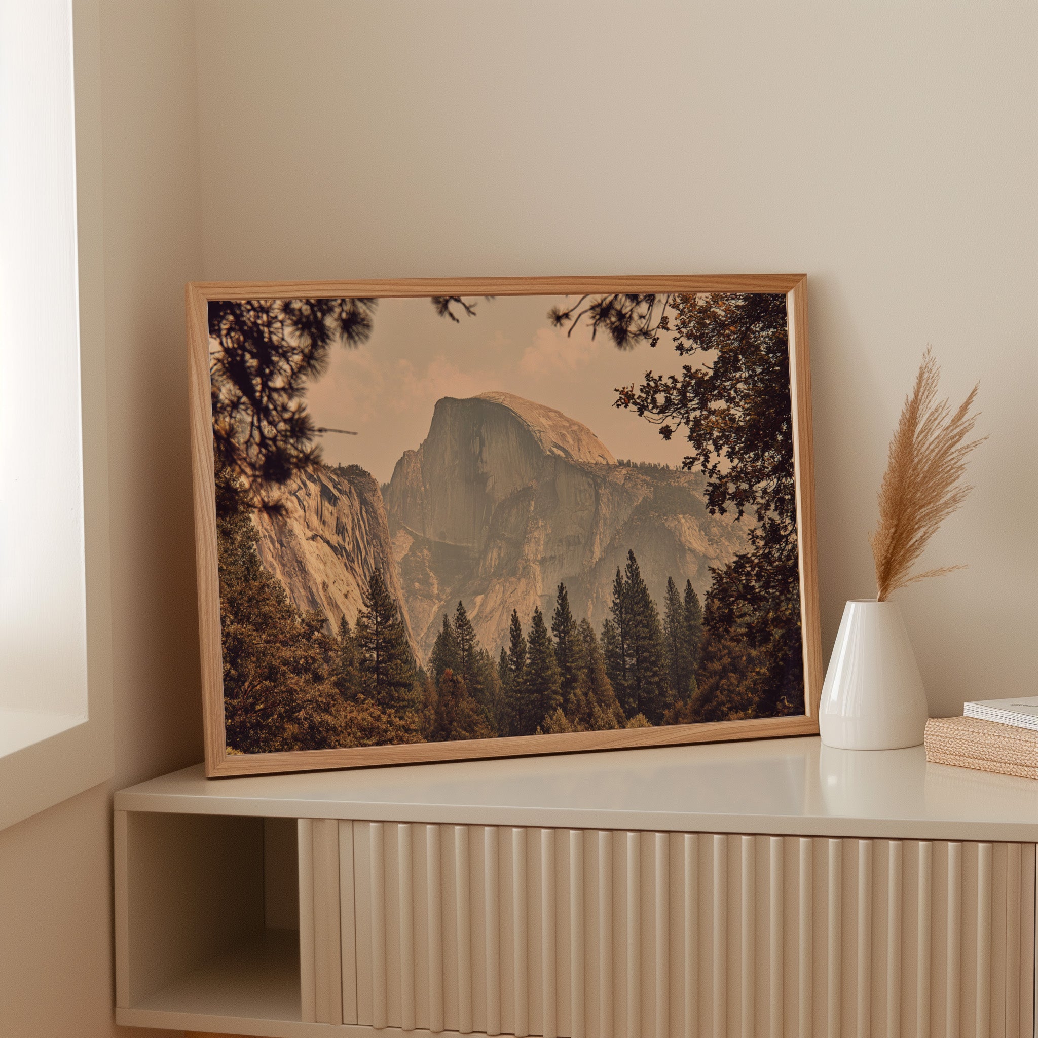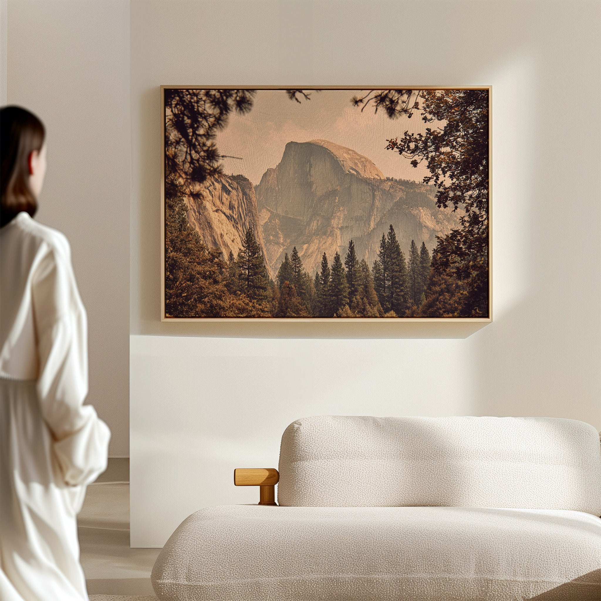 Dawn's first light bathes the towering face of Half Dome in honey-warm hues, creating an almost ethereal glow against the morning sky. The massive granite monolith rises majestically above Yosemite Valley, its weathered surface telling stories of geological epochs past. Pine sentinels stand in silent reverence along the foreground, their dark silhouettes framing nature's cathedral in a perfect composition of scale and wonder. This piece brings the timeless grandeur of America's most iconic national parks into intimate spaces, offering a daily reminder of nature's monumental beauty.