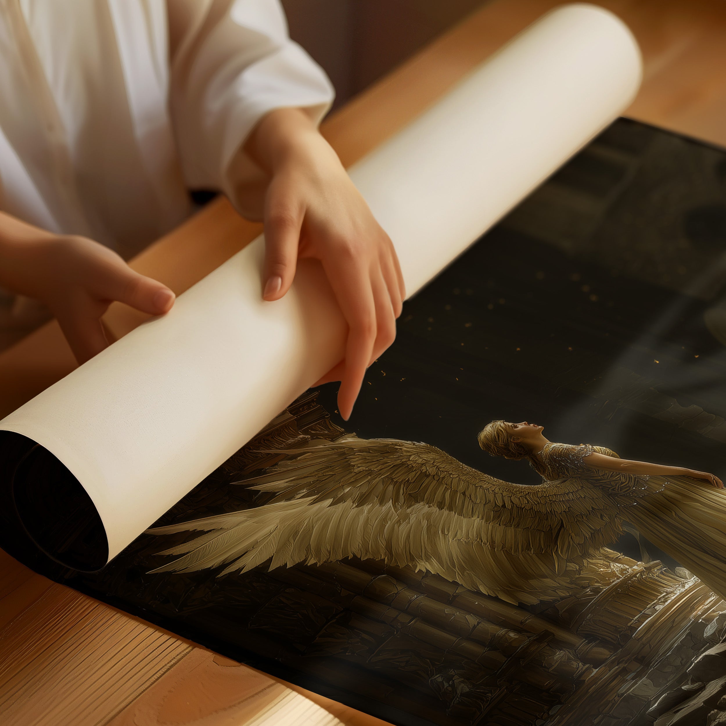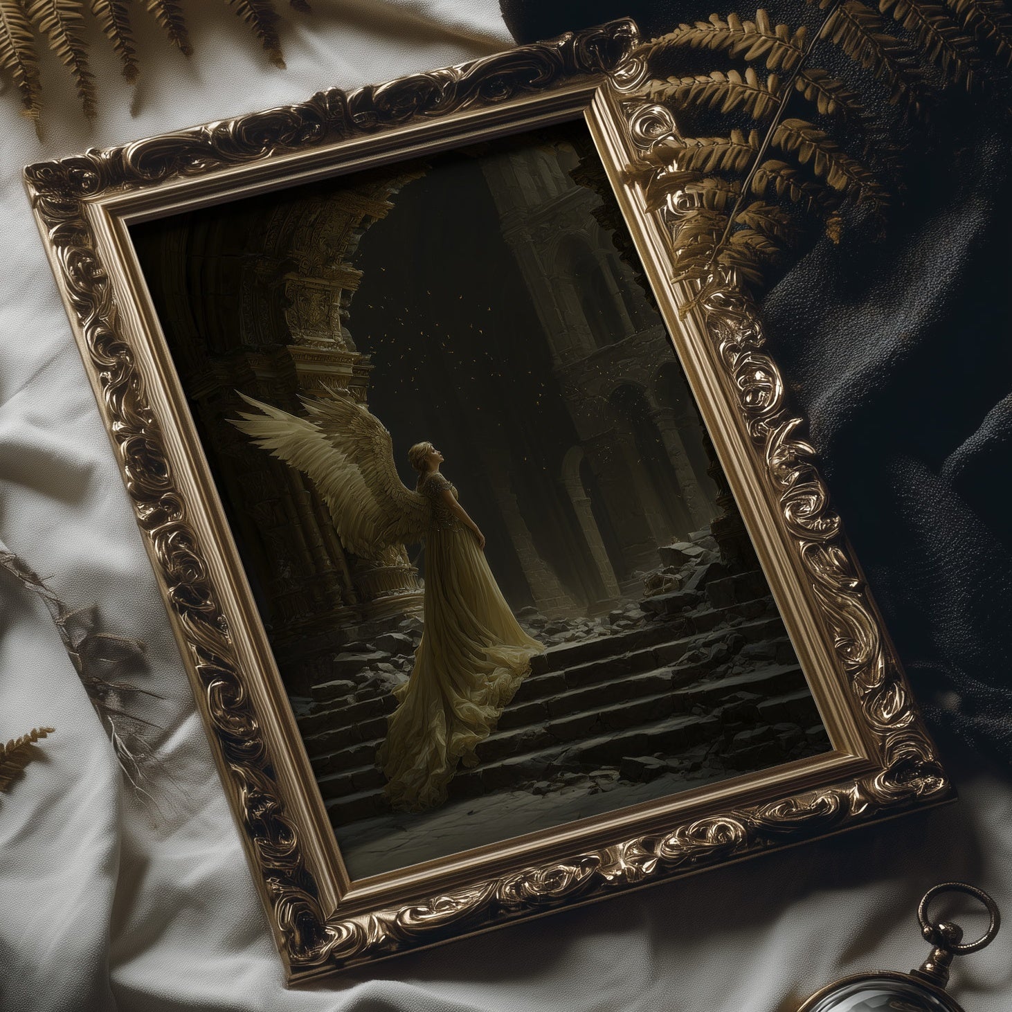 Golden light bathes the winged figure as she stands between worlds, poised at the threshold of forgotten ruins. Her flowing dress catches the same ethereal glow that illuminates her magnificent wings, creating a striking contrast against the darkness of crumbling stone archways. Stars peek through the distant opening, beckoning her forward into the unknown while the ancient architecture stands as silent witness to this moment of transcendence. This piece brings a touch of mystical elegance to studies, reading nooks, or spaces that invite contemplation and imagination.